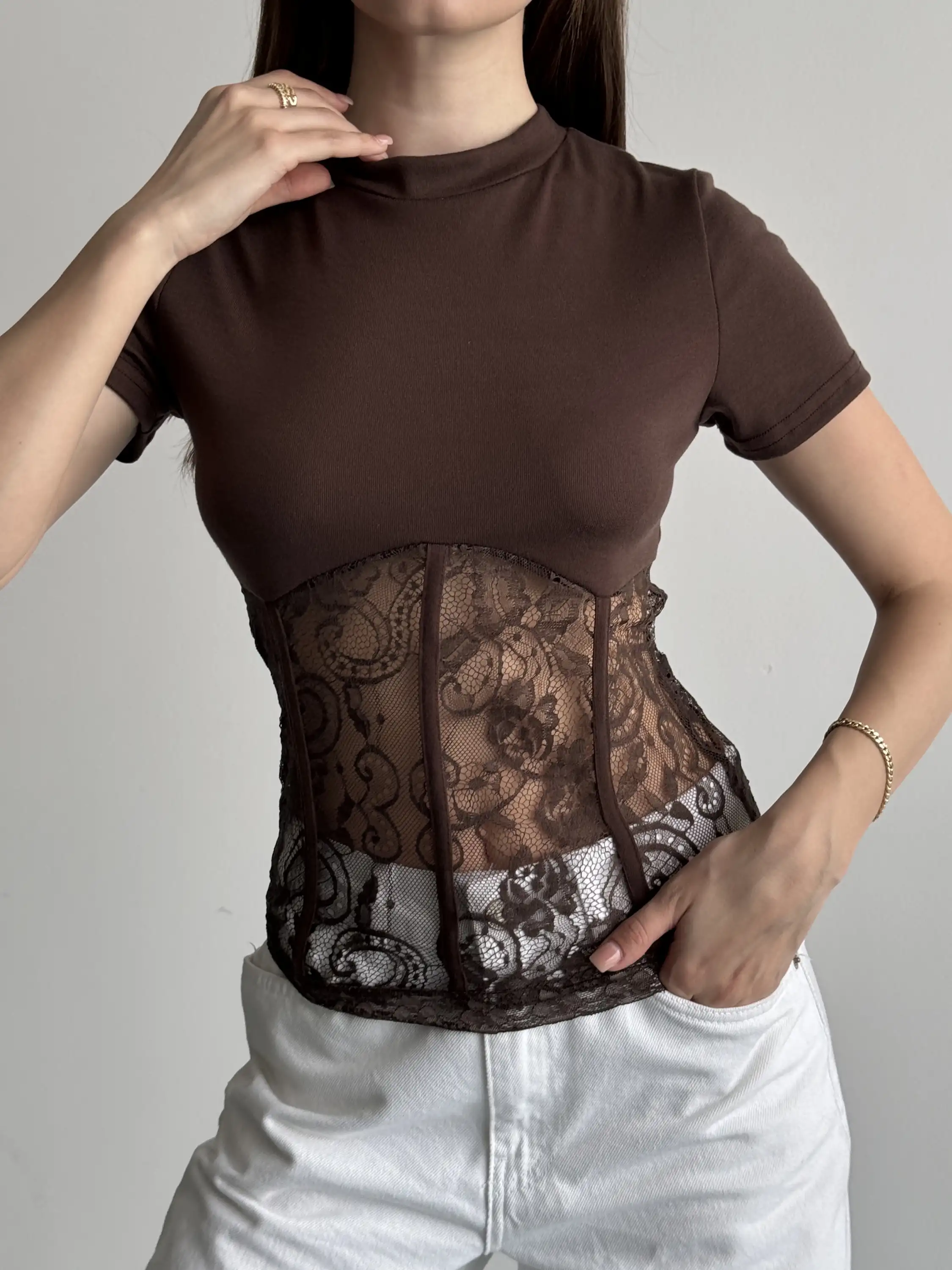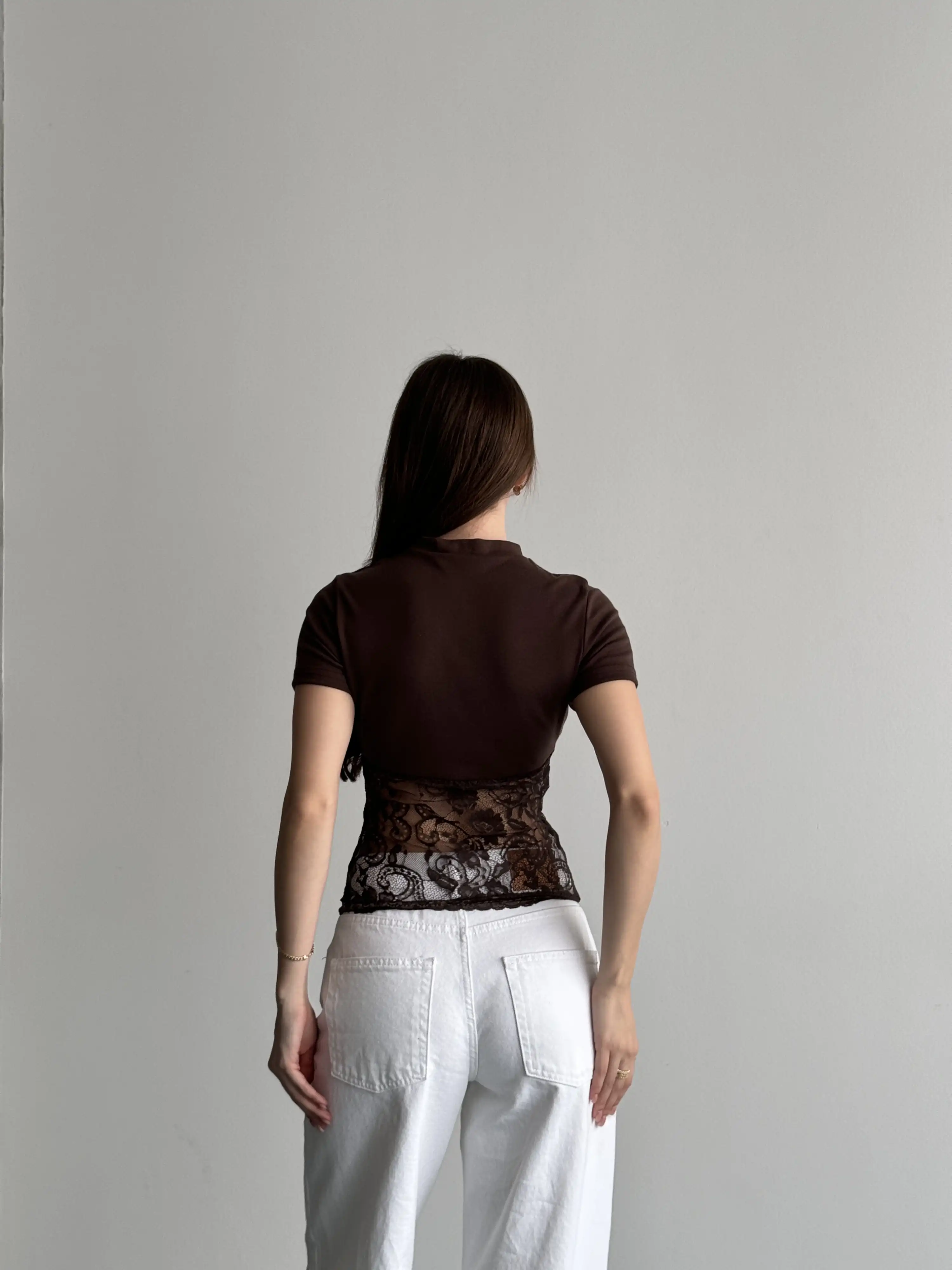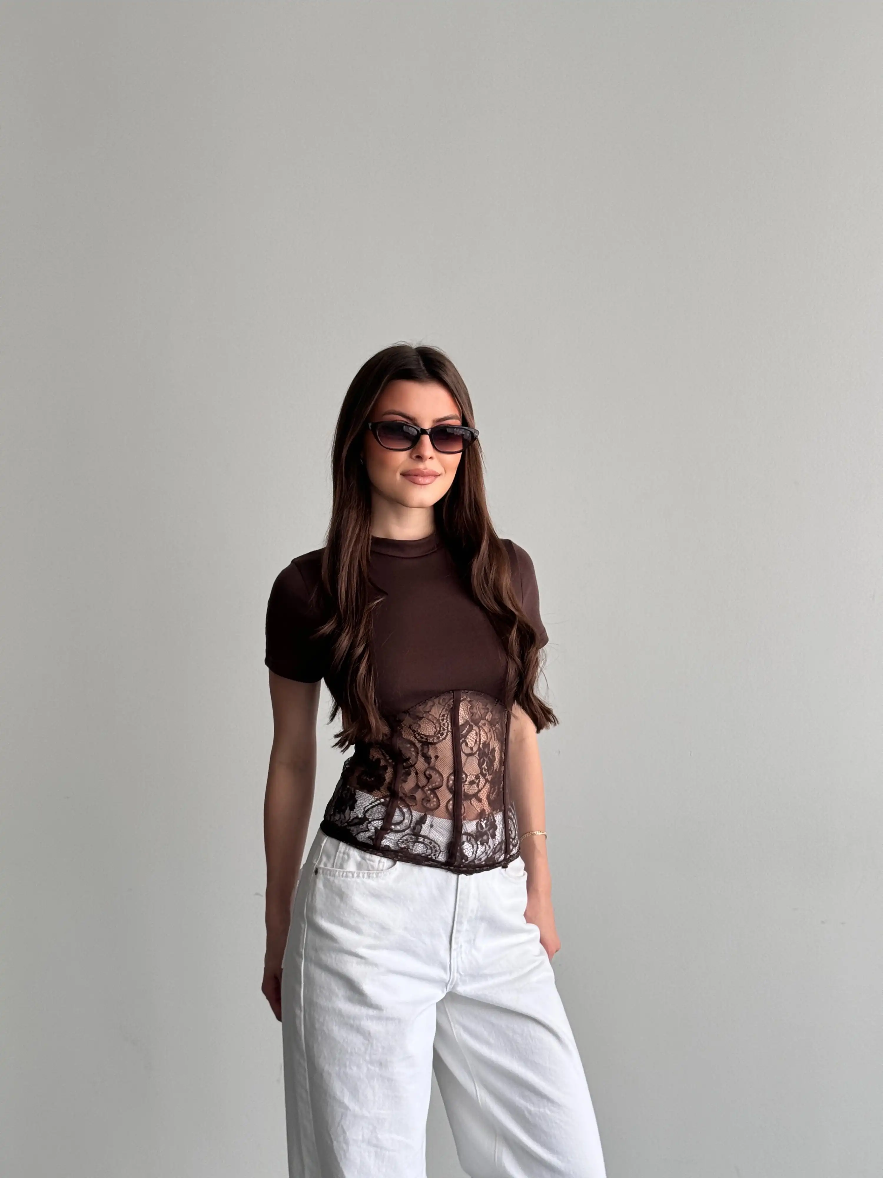 ALTI DANTEL DETAYLI KORSE GÖRÜNÜMLÜ BLUZ-KAHVE