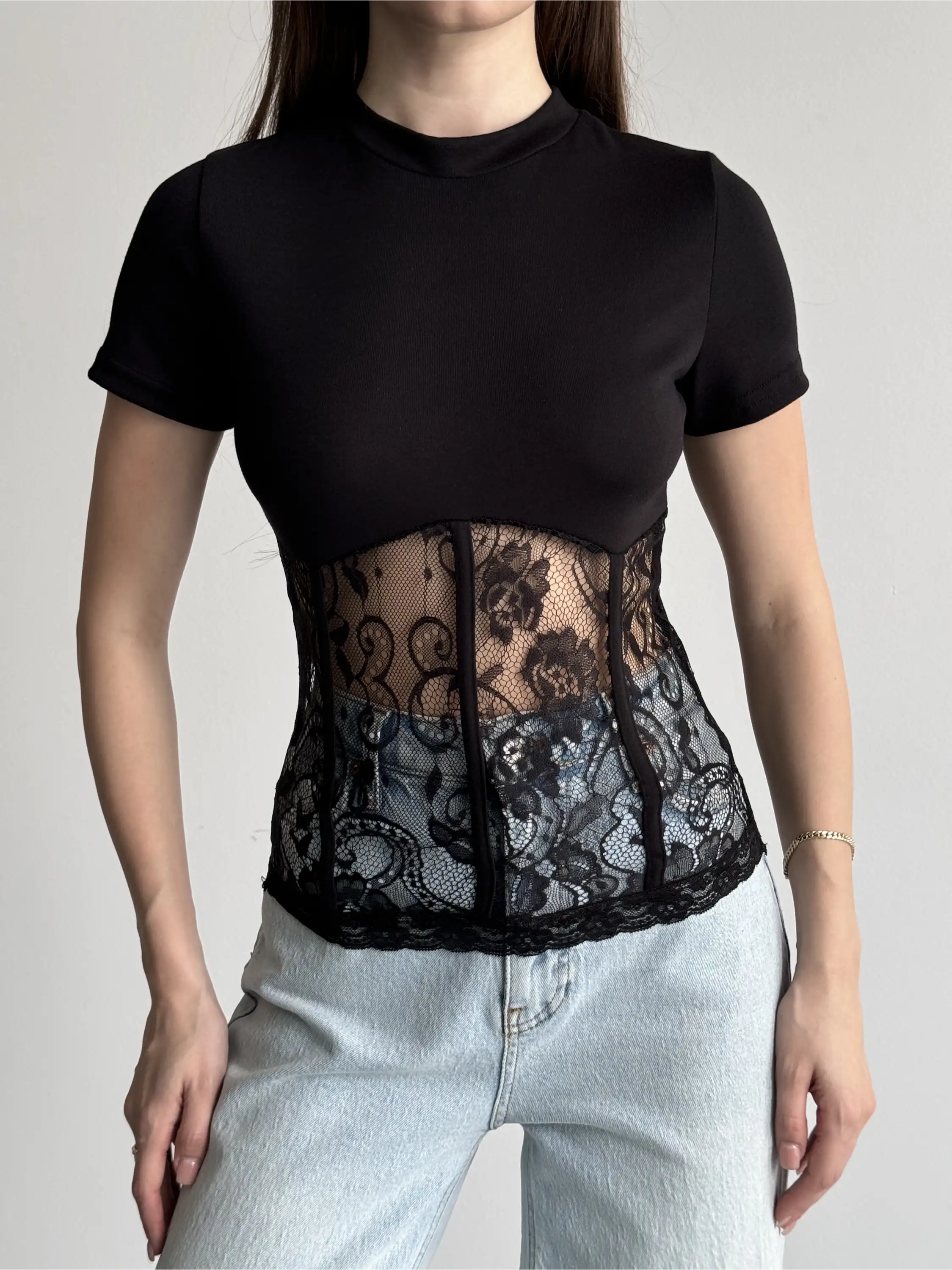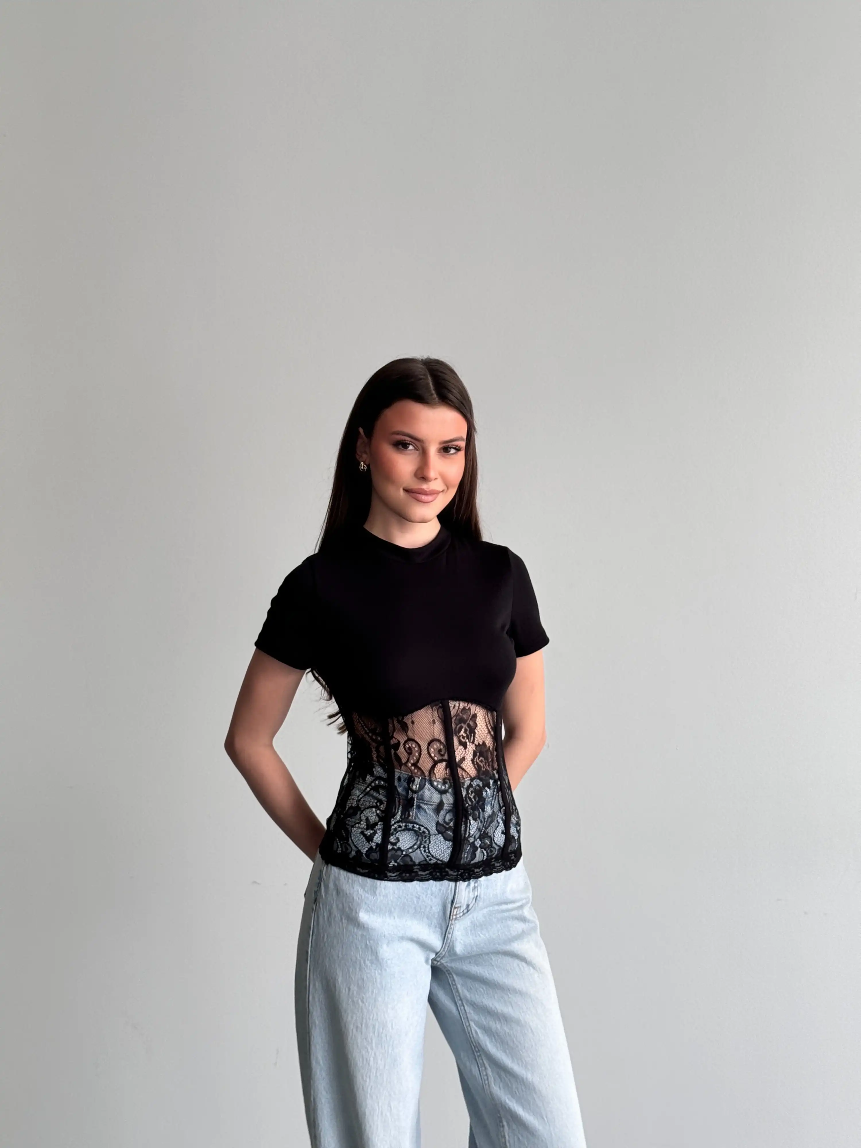 ALTI DANTEL DETAYLI KORSE GÖRÜNÜMLÜ BLUZ-SİYAH