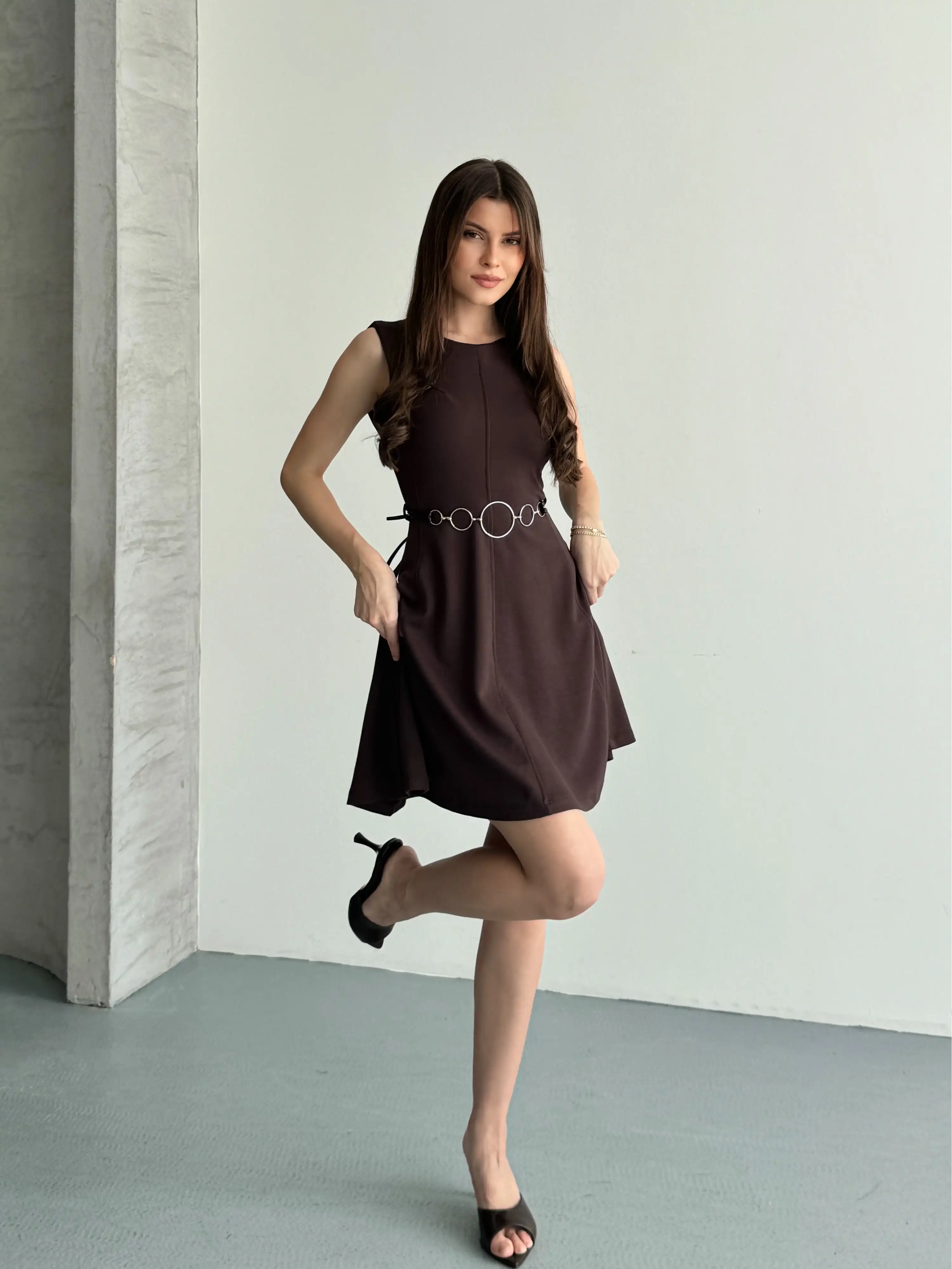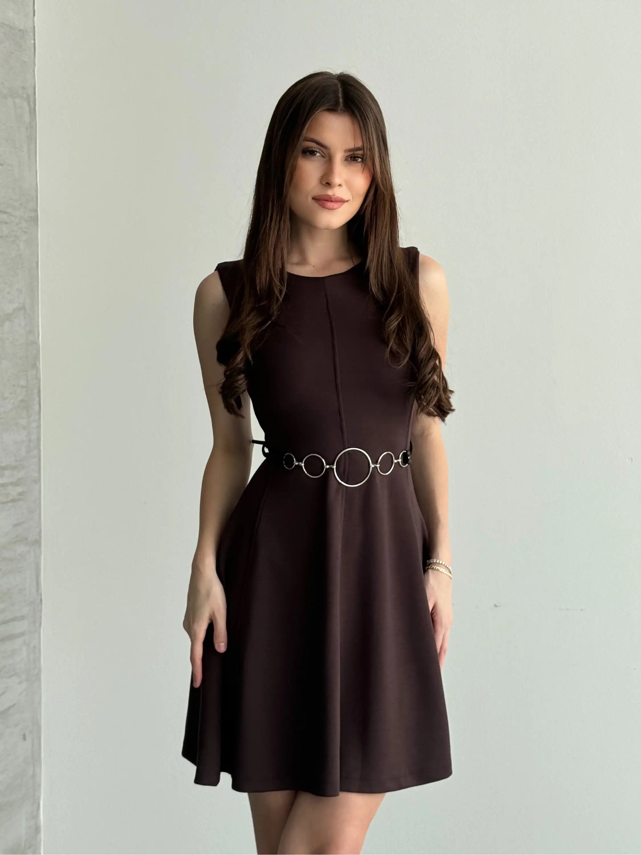 ALTI VOLANLI SIFIR KOL ELBİSE-KAHVE