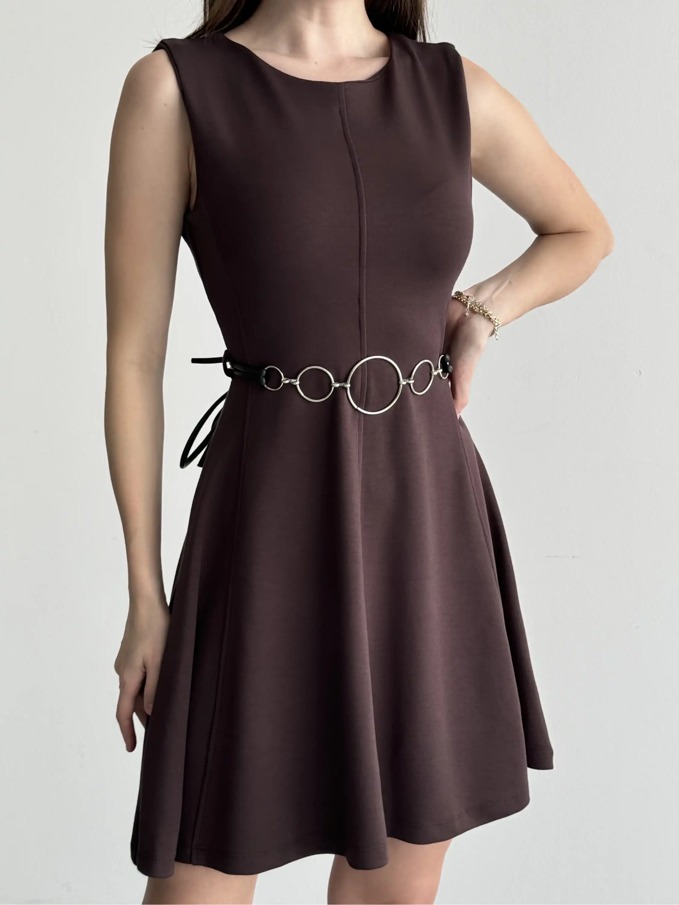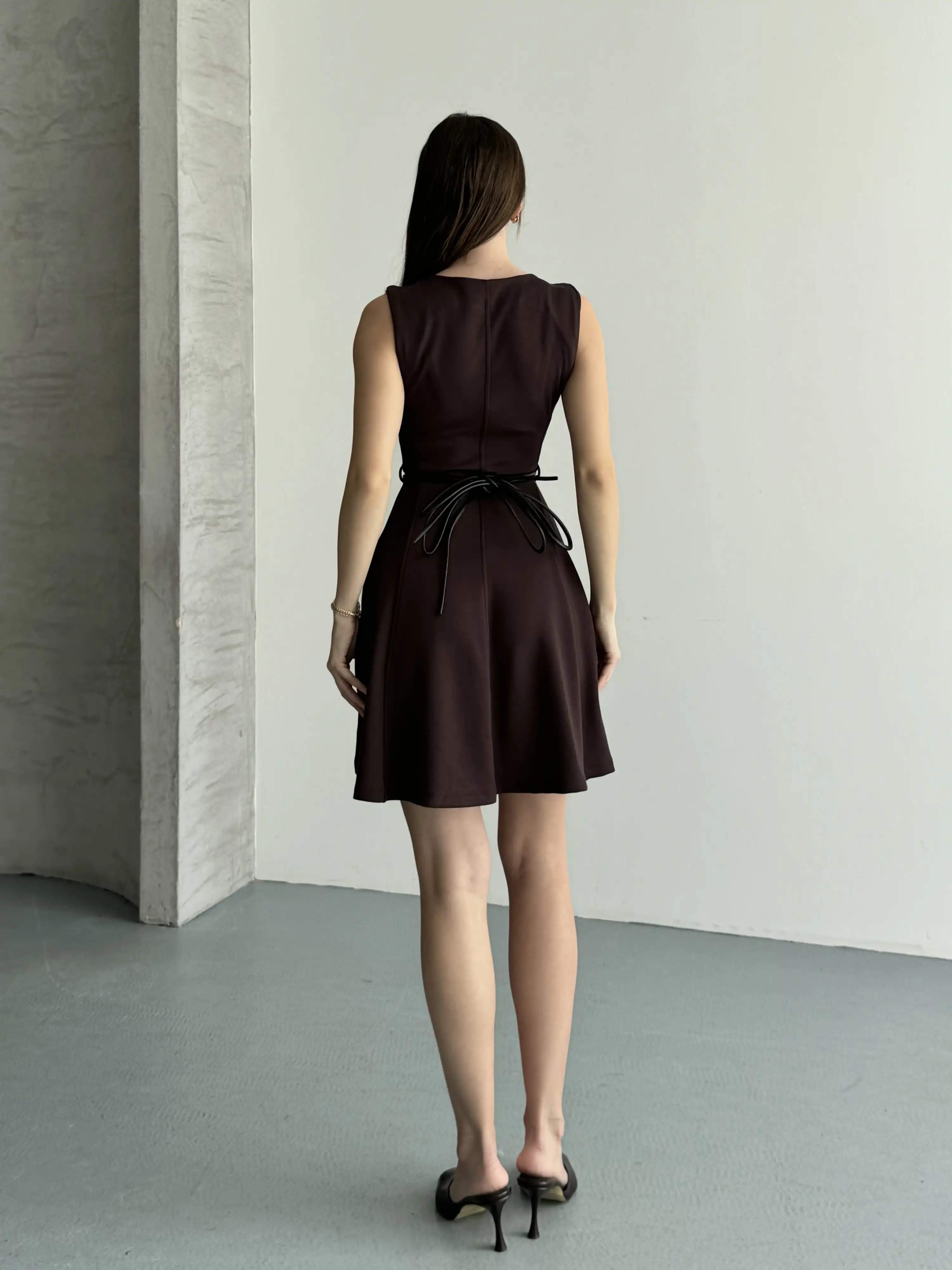 ASKILI MİNİ PUANTİYELİ ELBİSE-KAHVE