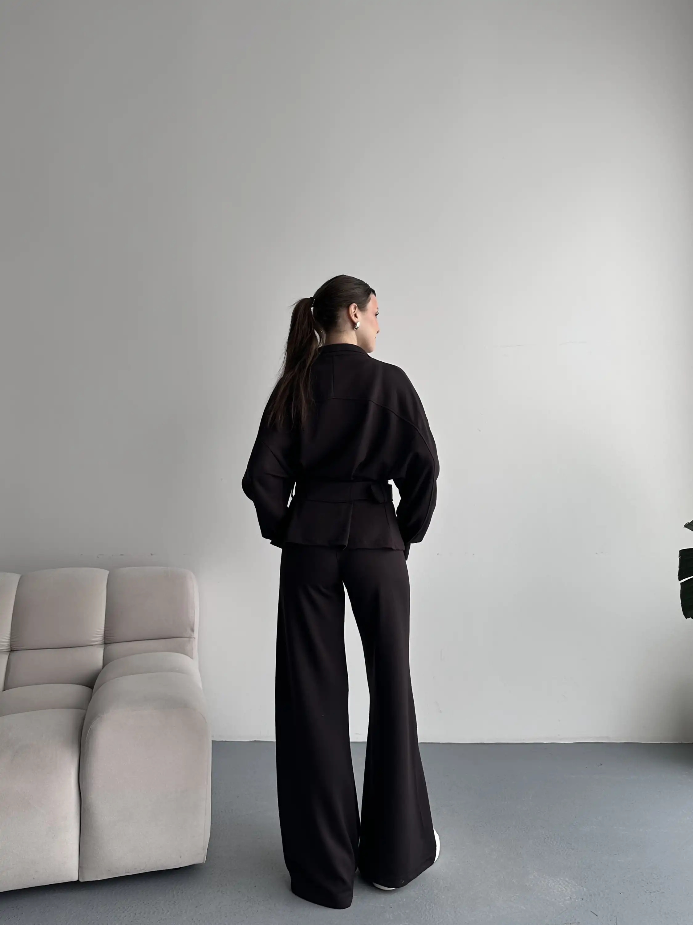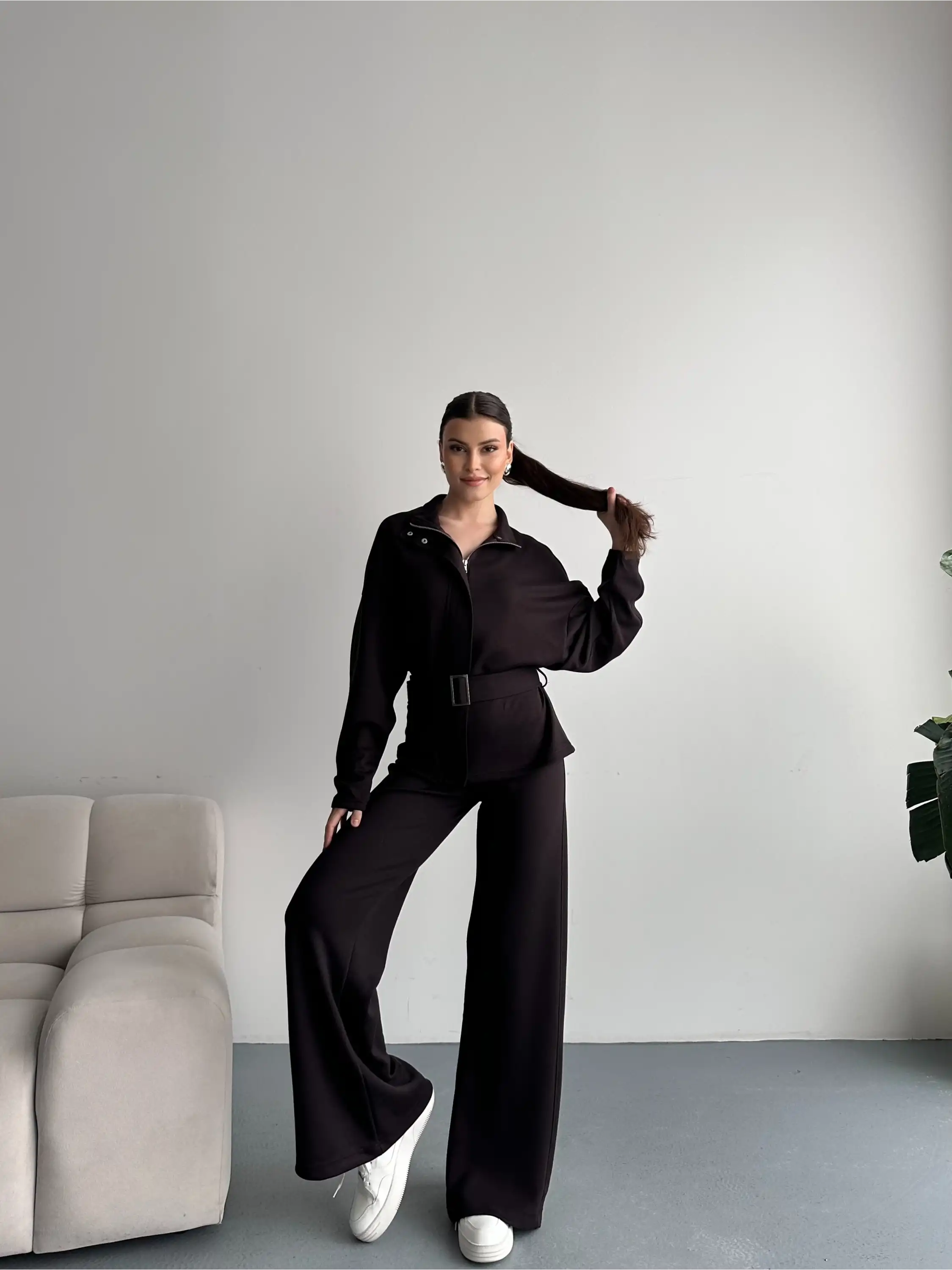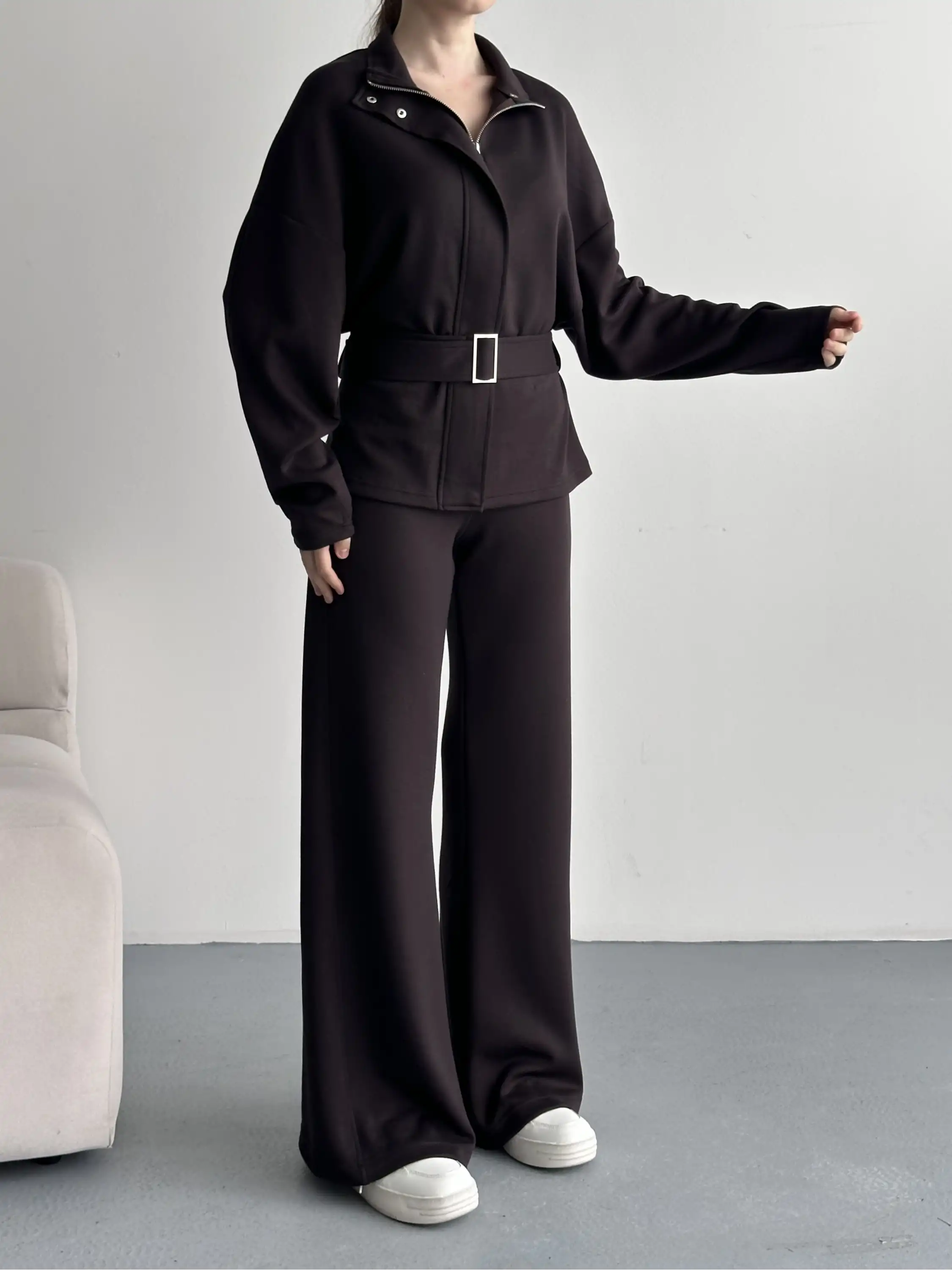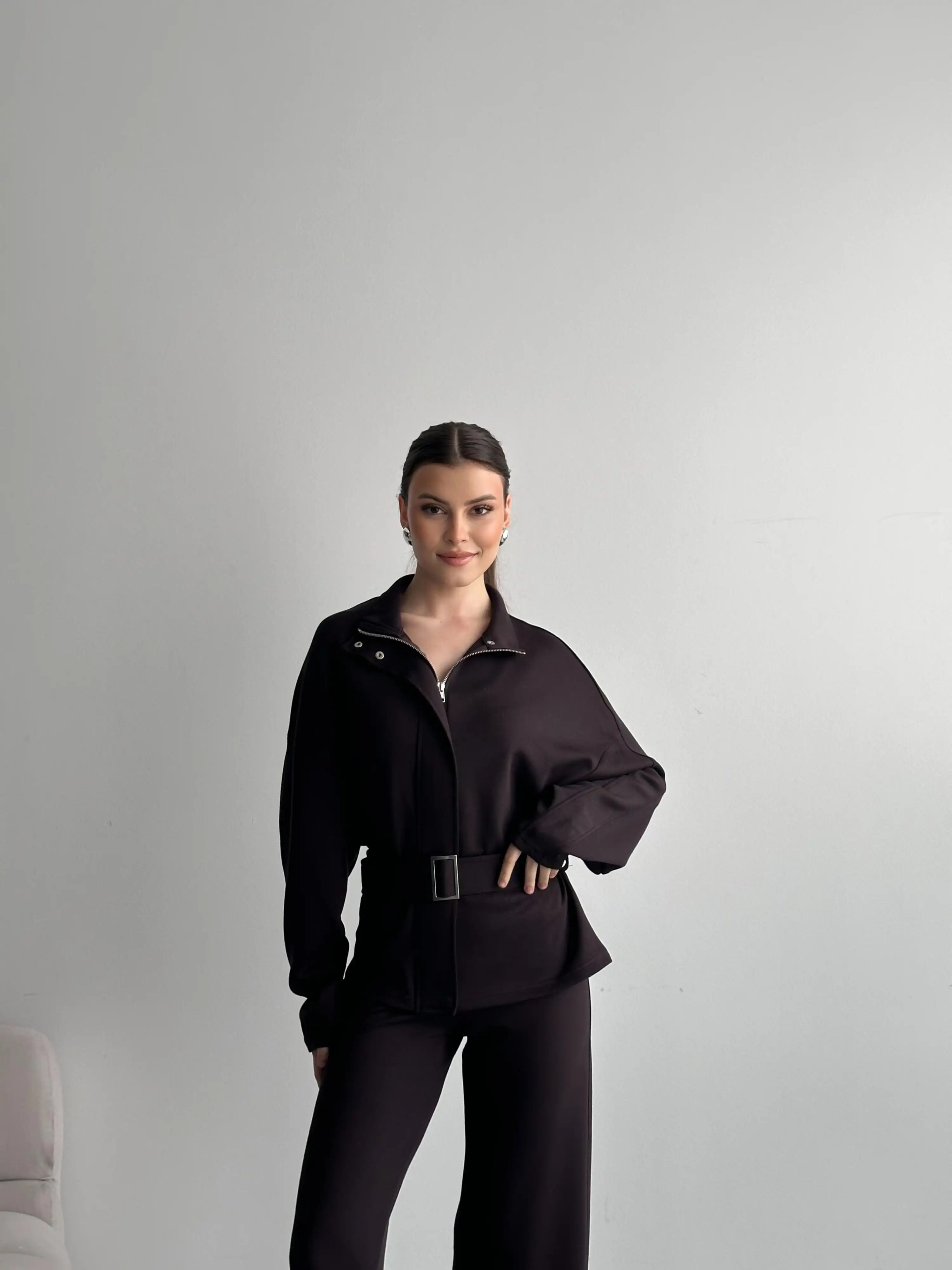 ASİL KEMER DETAYLI MODAL TAKIM-KAHVE