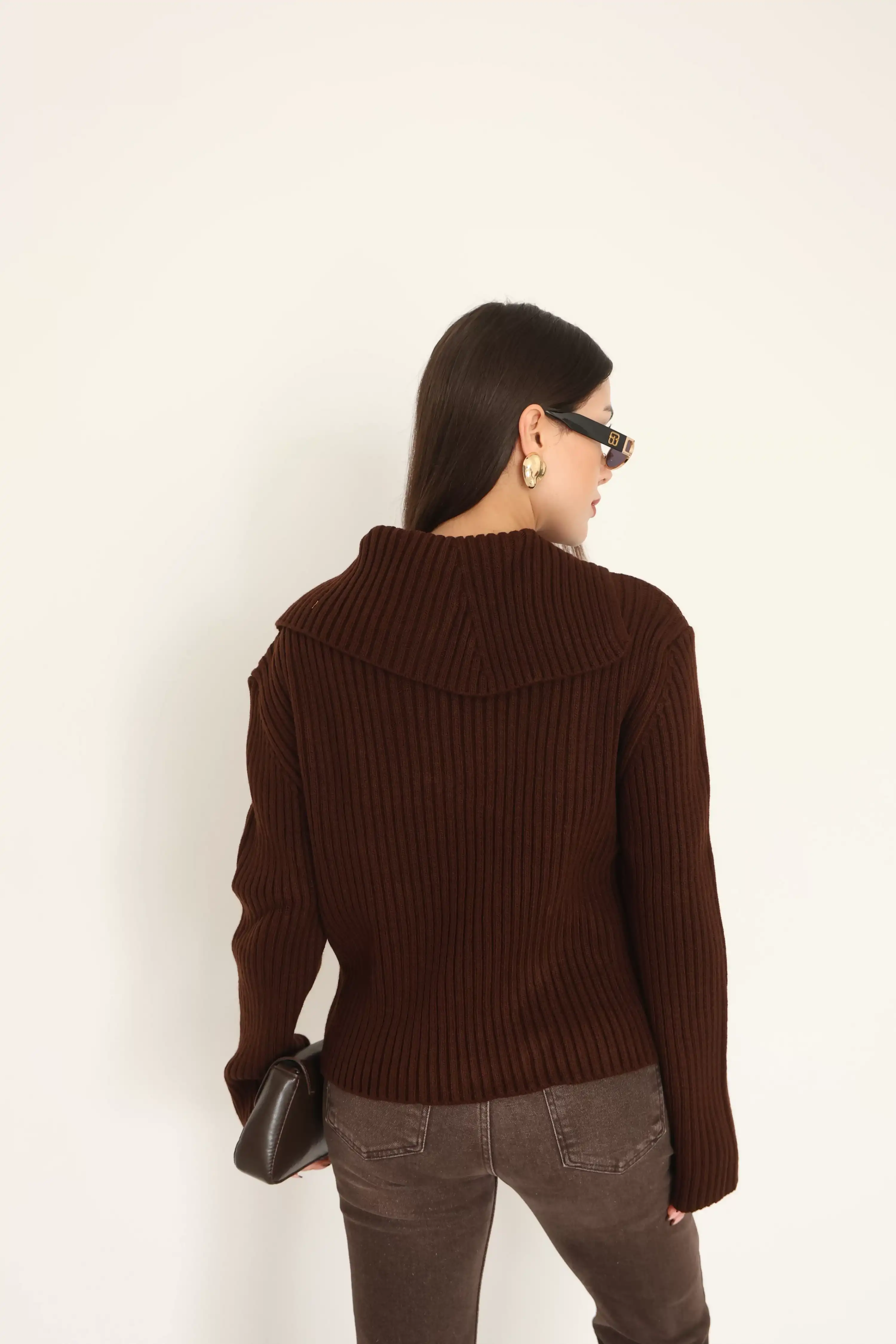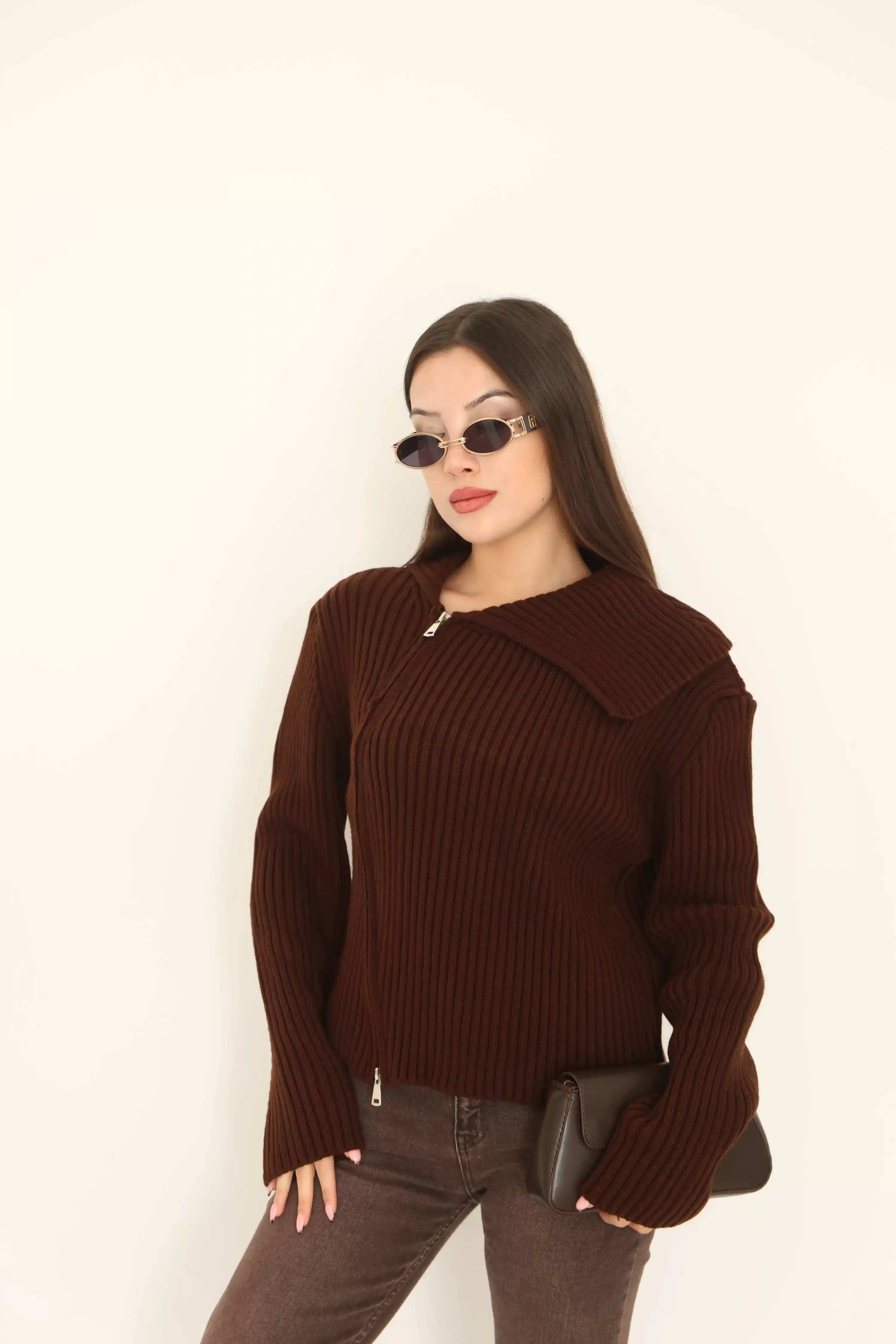 BALIKÇI YAKA FERMUARLI SELANİK HIRKA-KAHVE