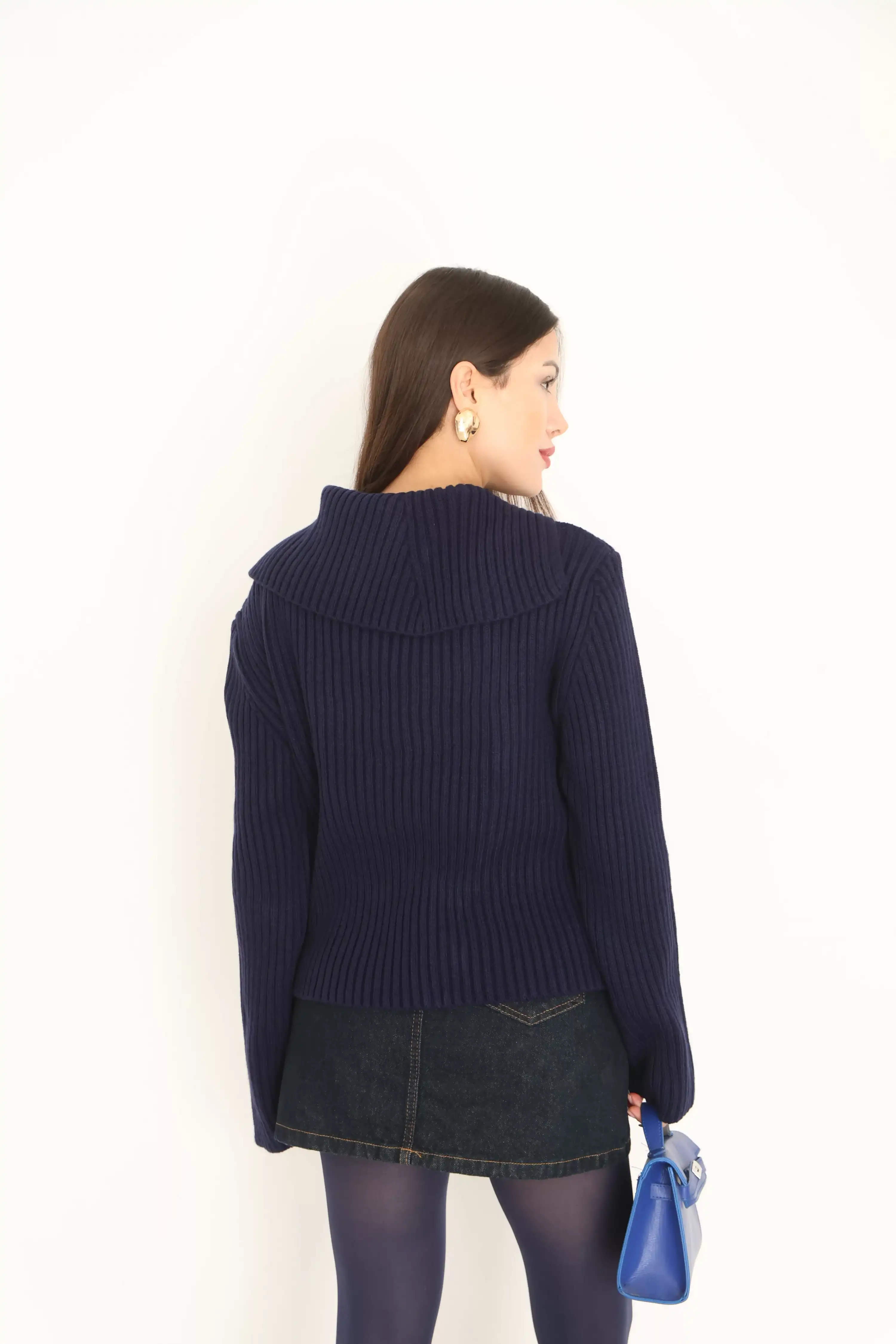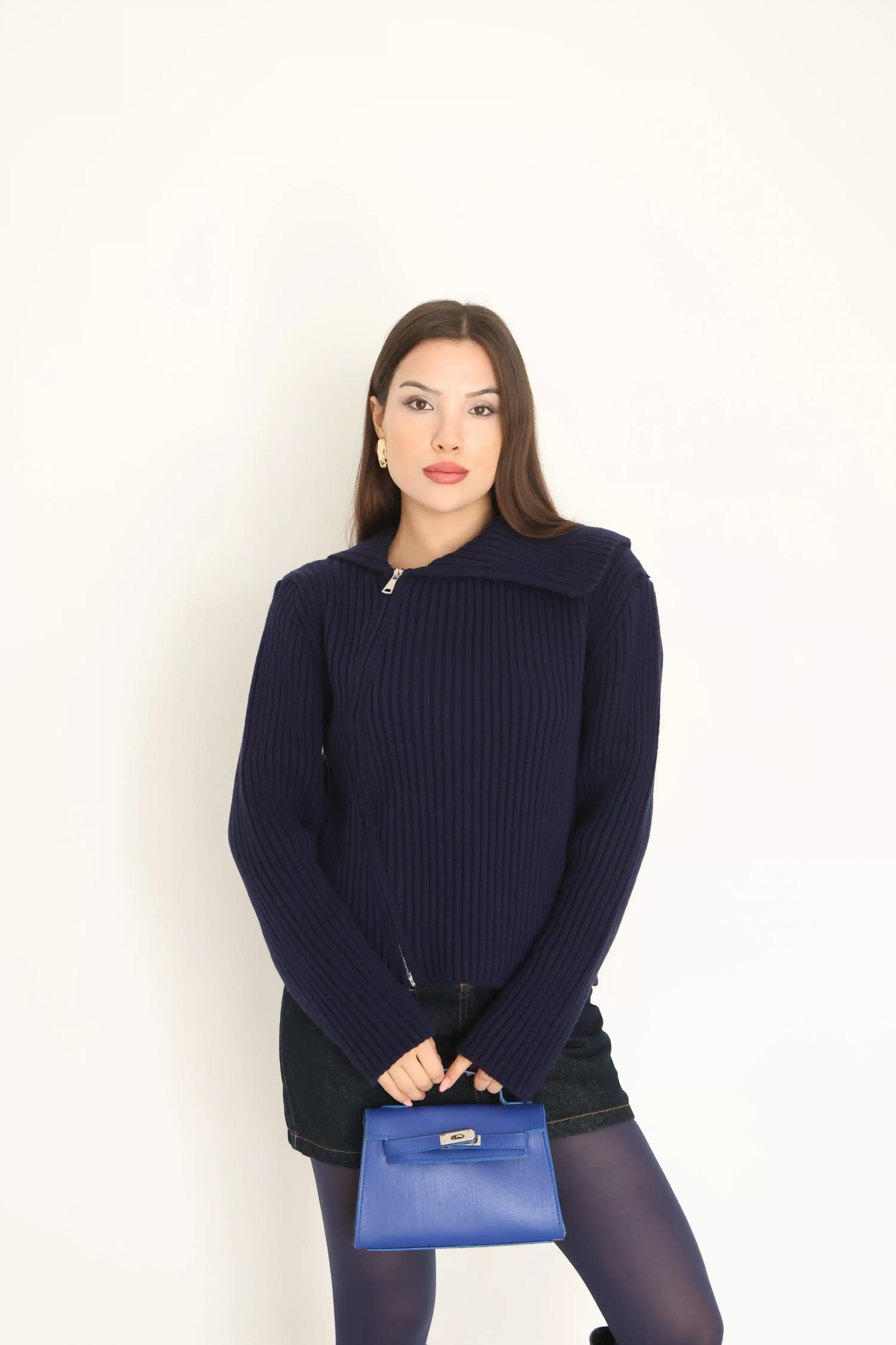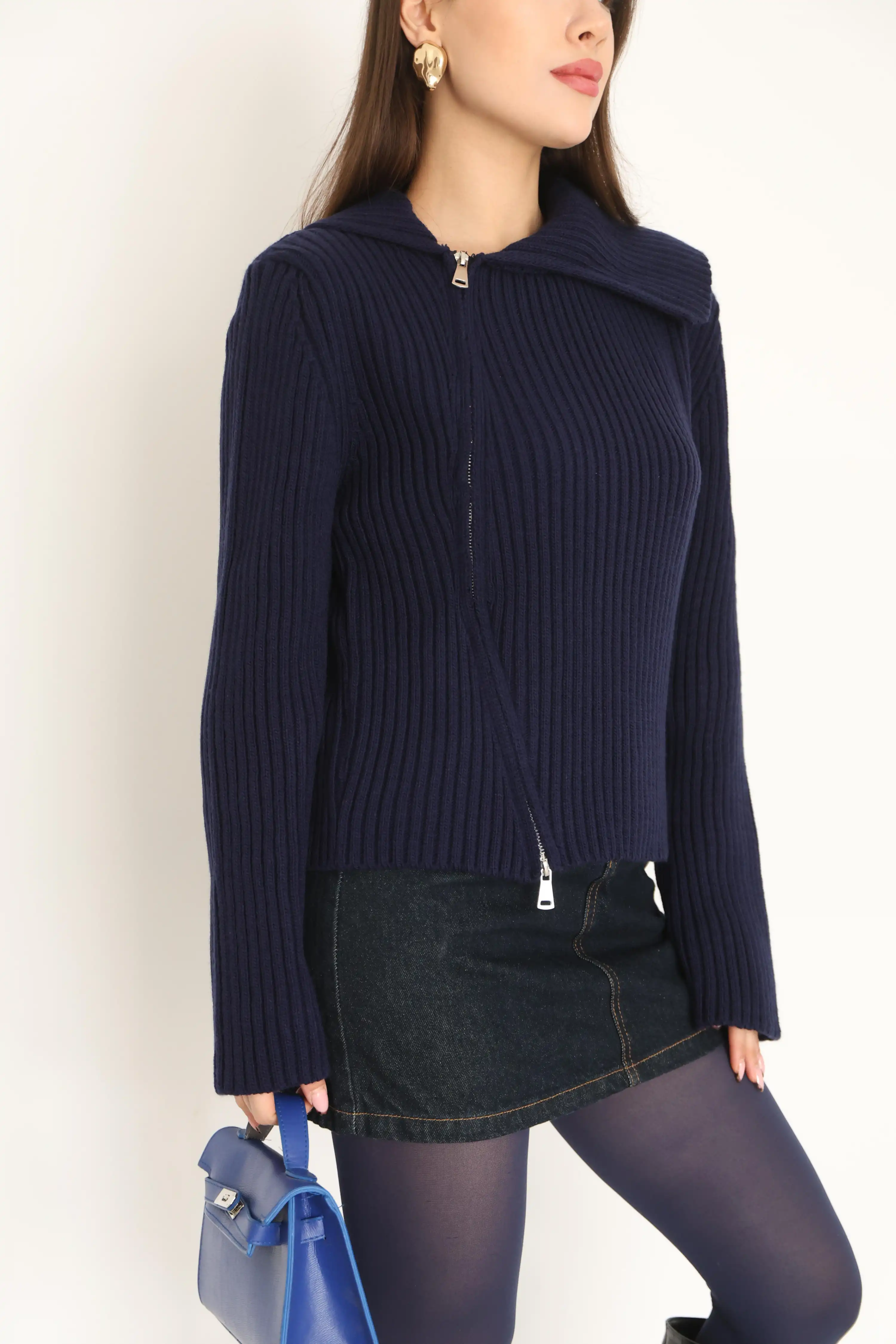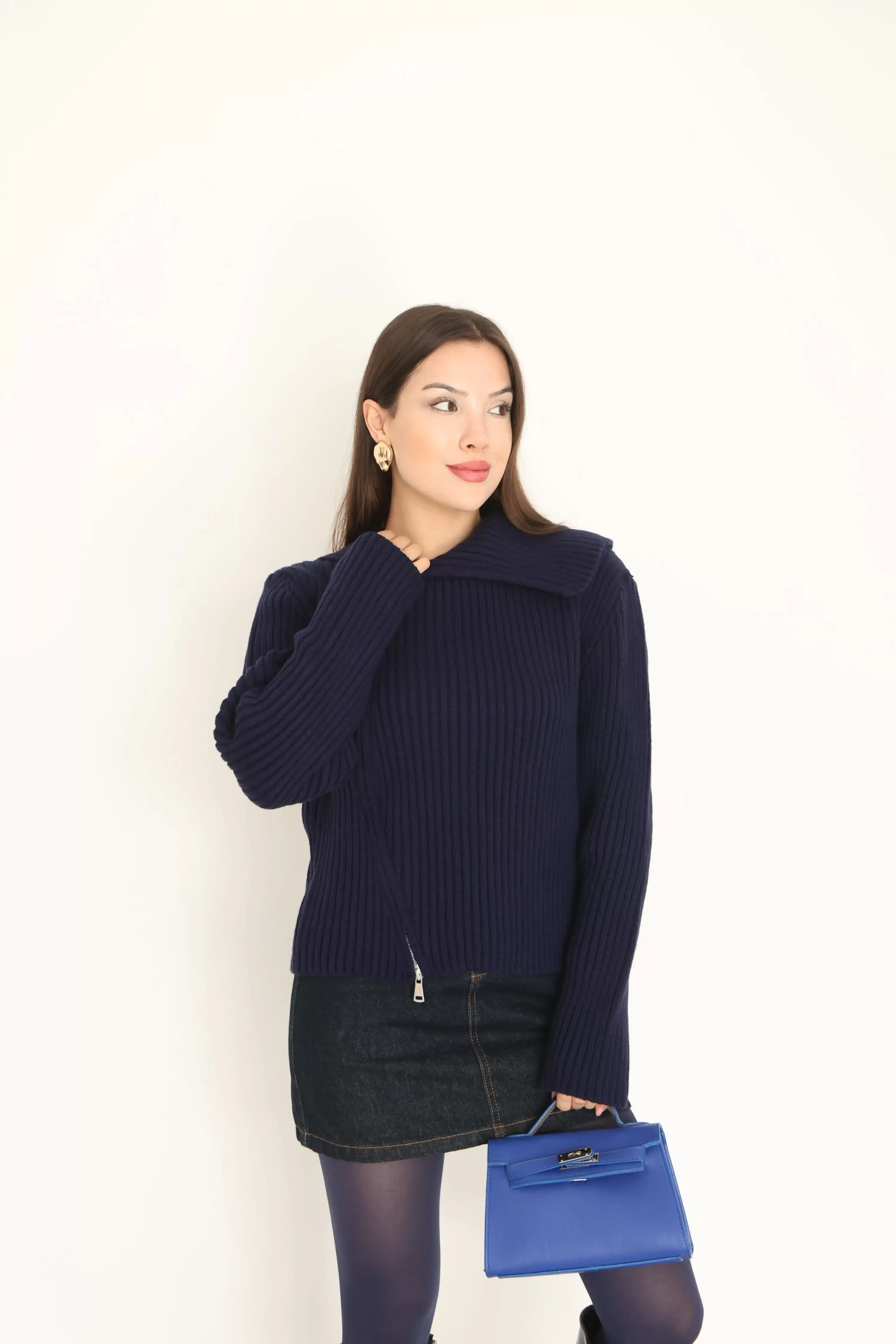 BALIKÇI YAKA FERMUARLI SELANİK HIRKA-LACİVERT