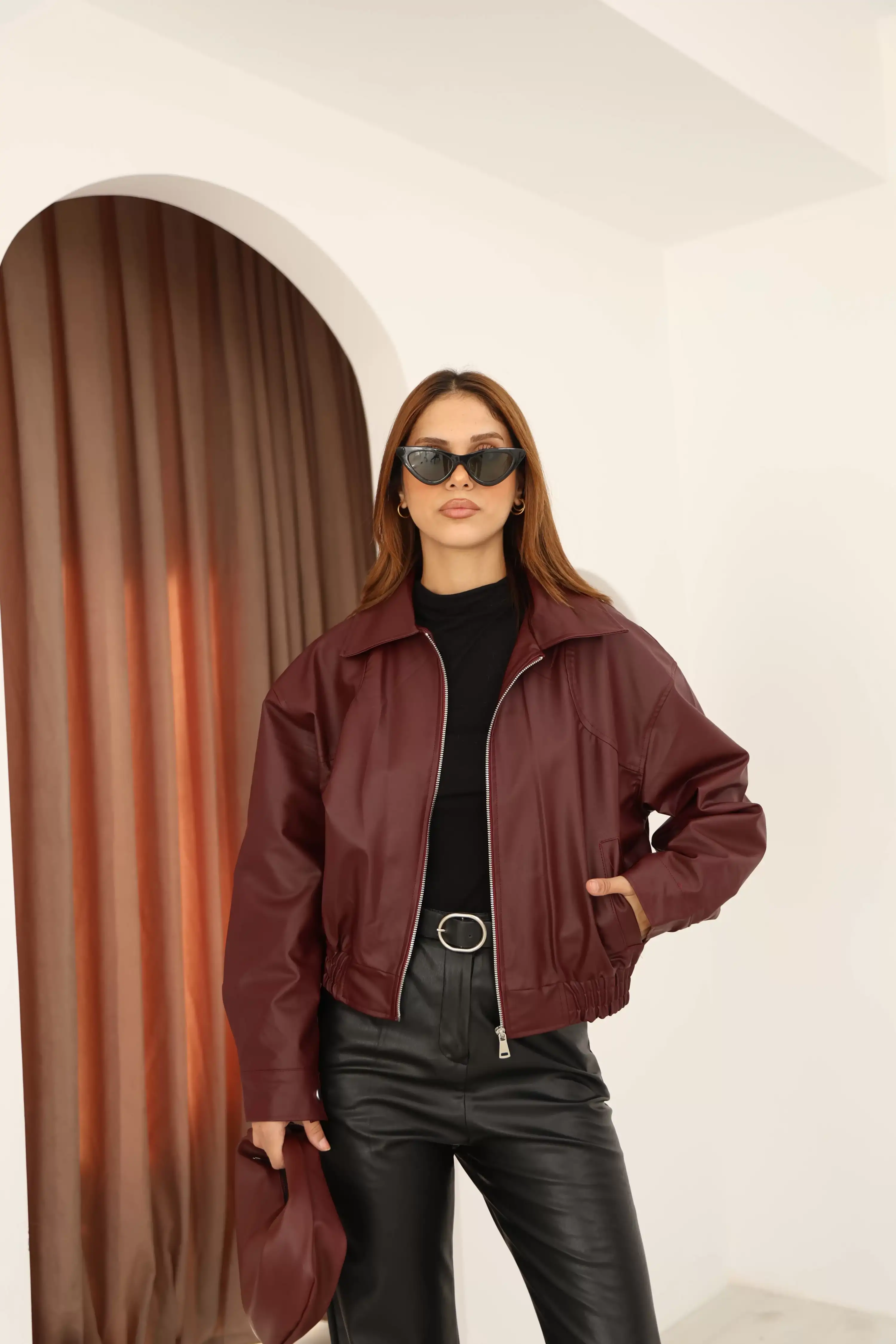 BEL LASTİKLİ ASTARLI DERİ CEKET-BORDO
