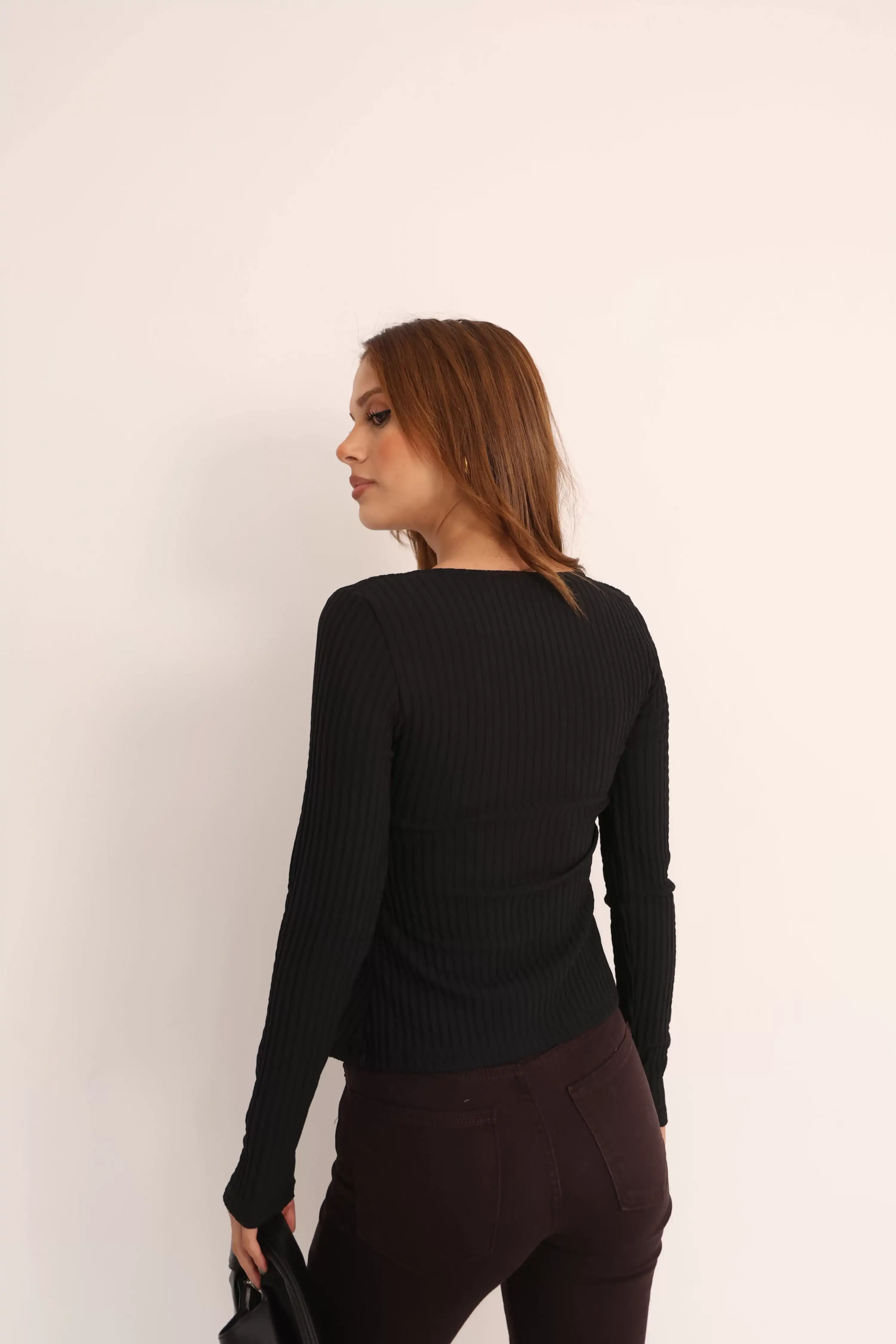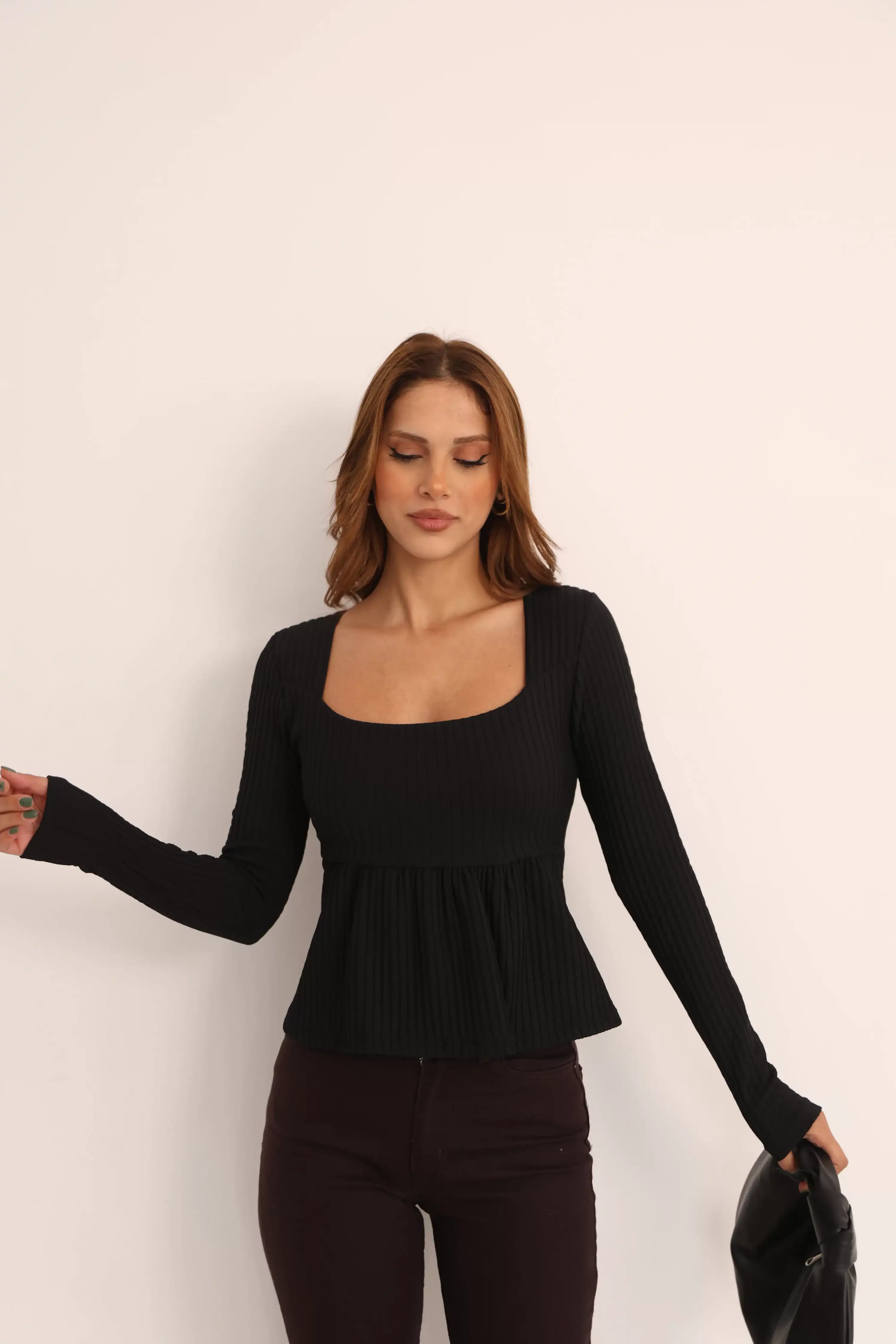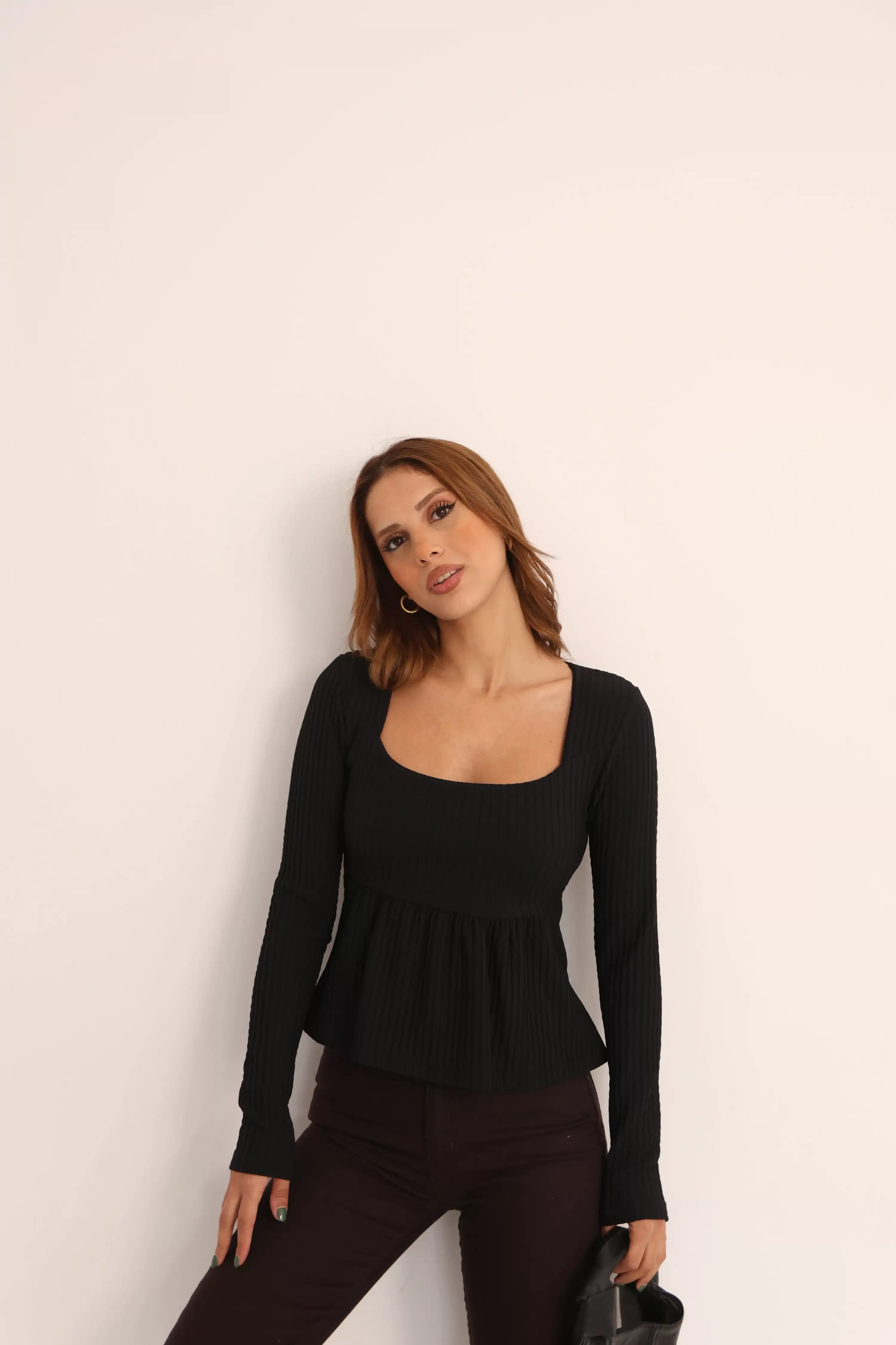 BEL PİLELİ KARE YAKA BLUZ-SİYAH