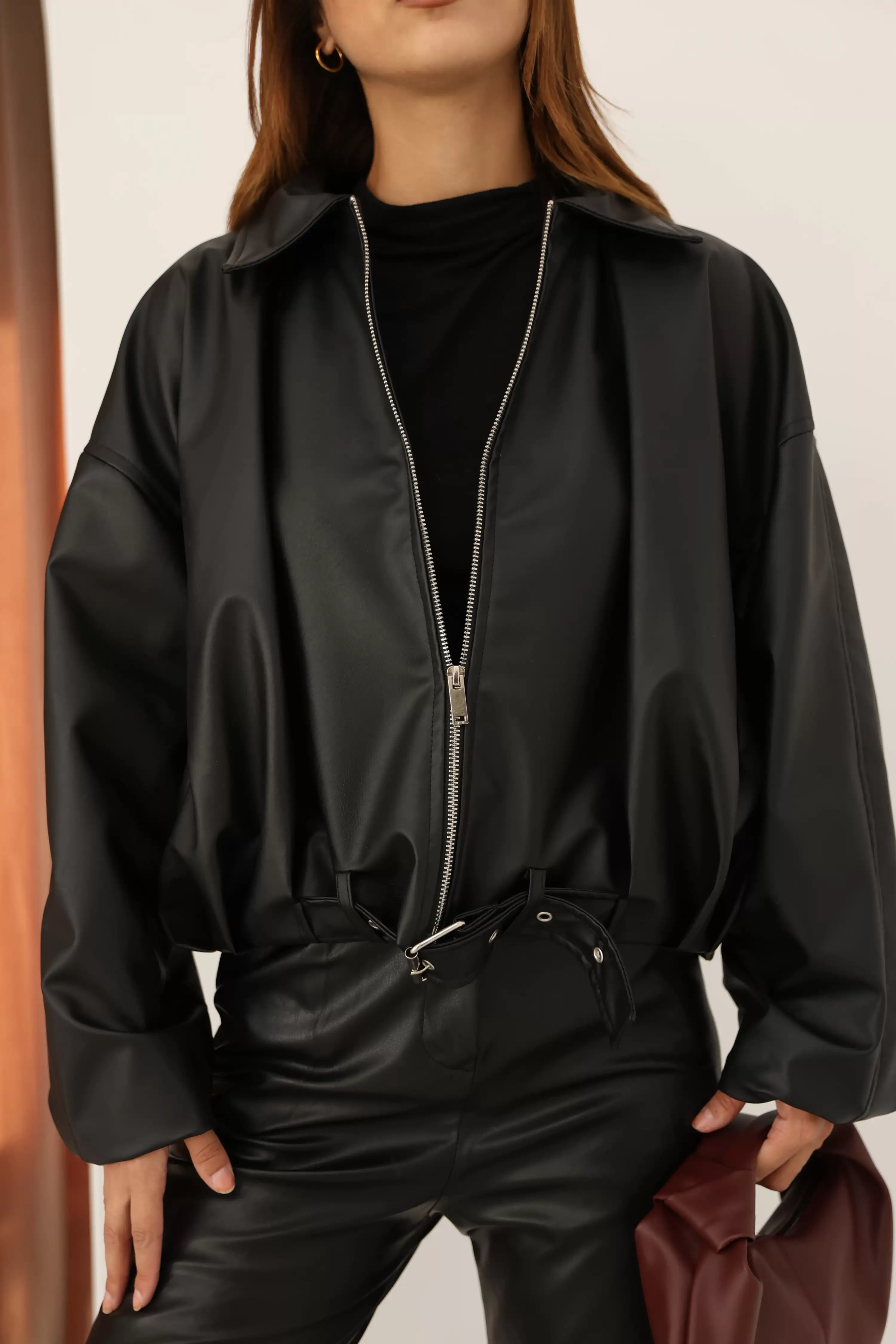 BELİ KEMER DETAYLI DERİ CEKET-SİYAH