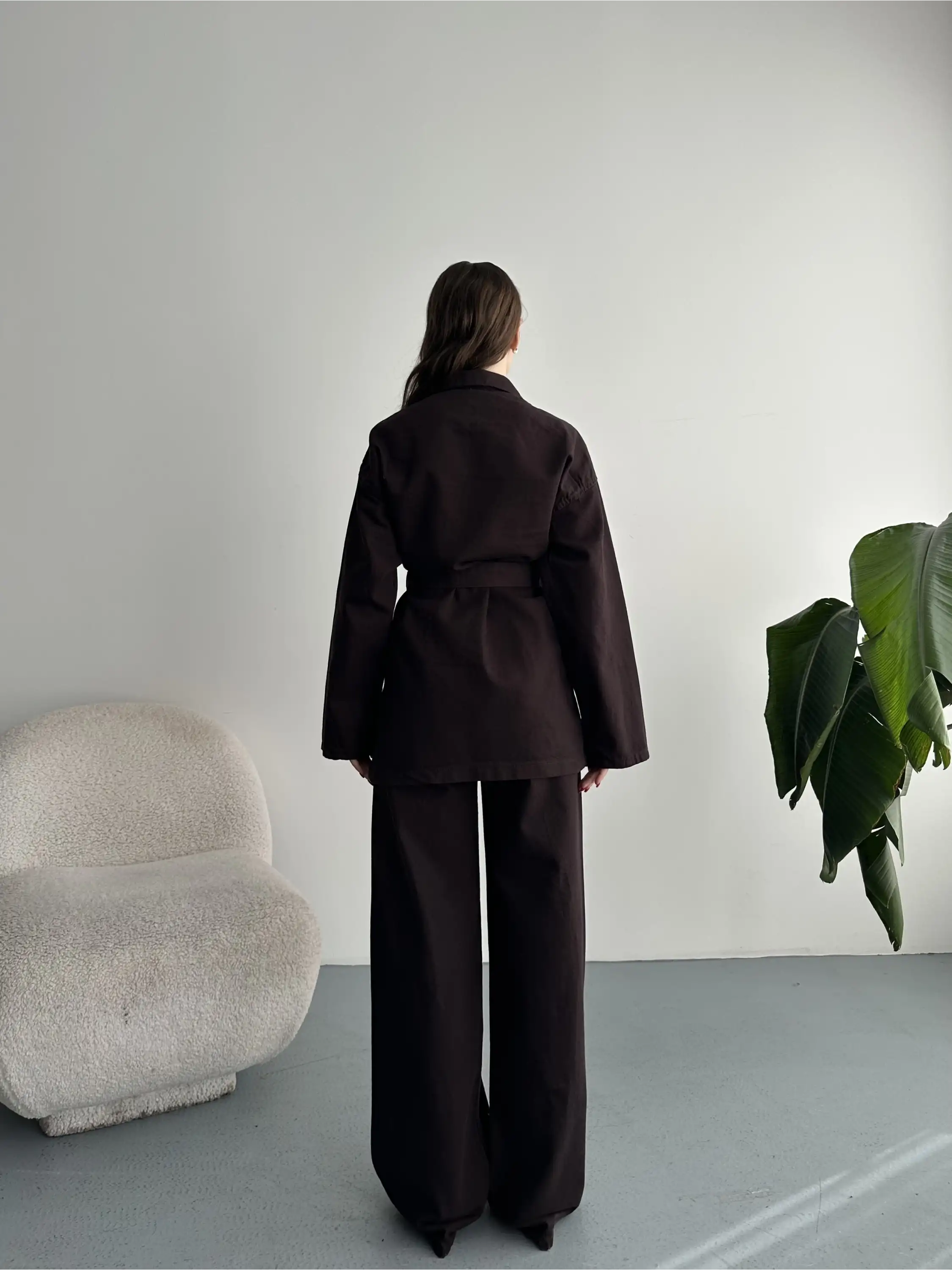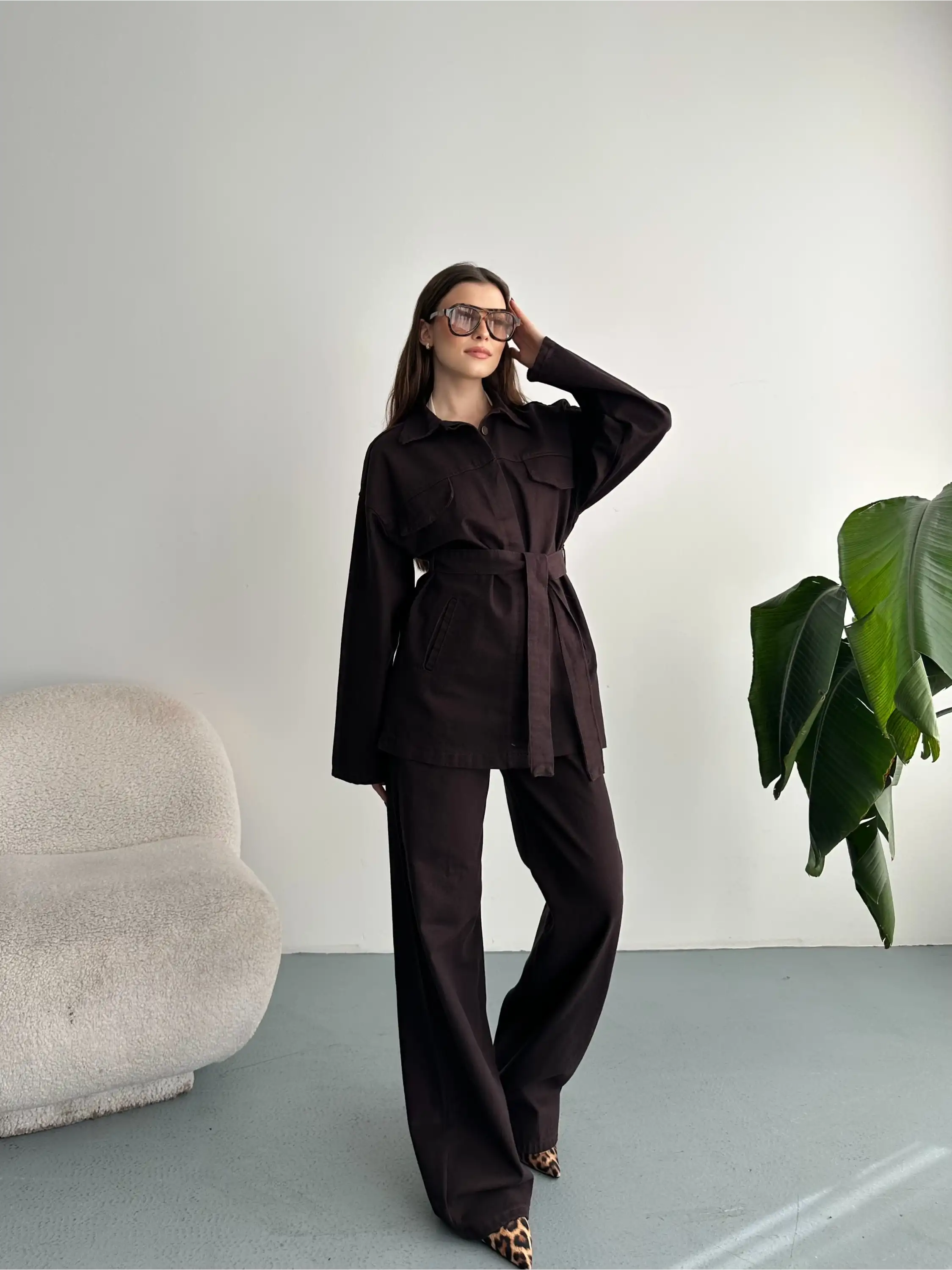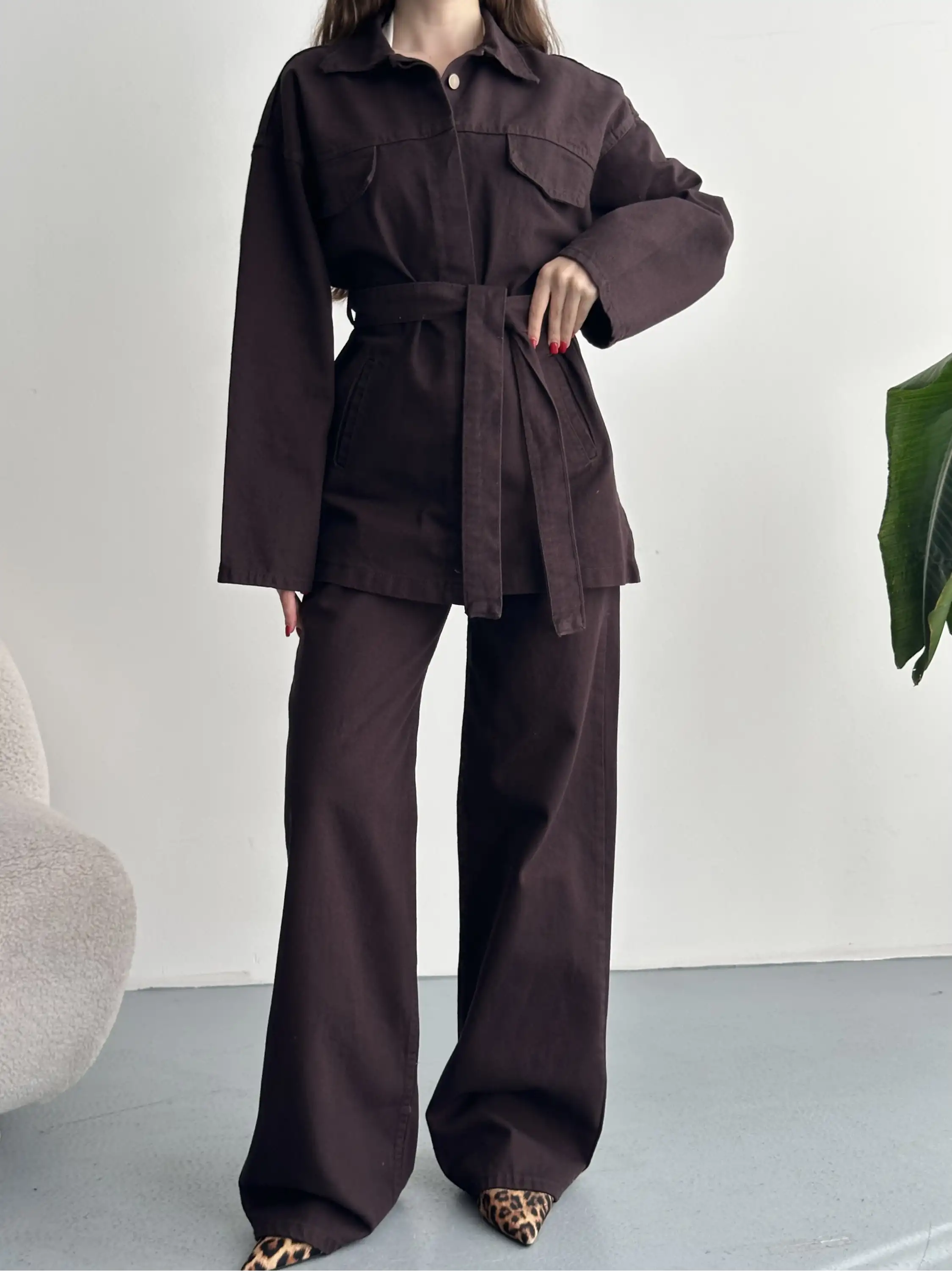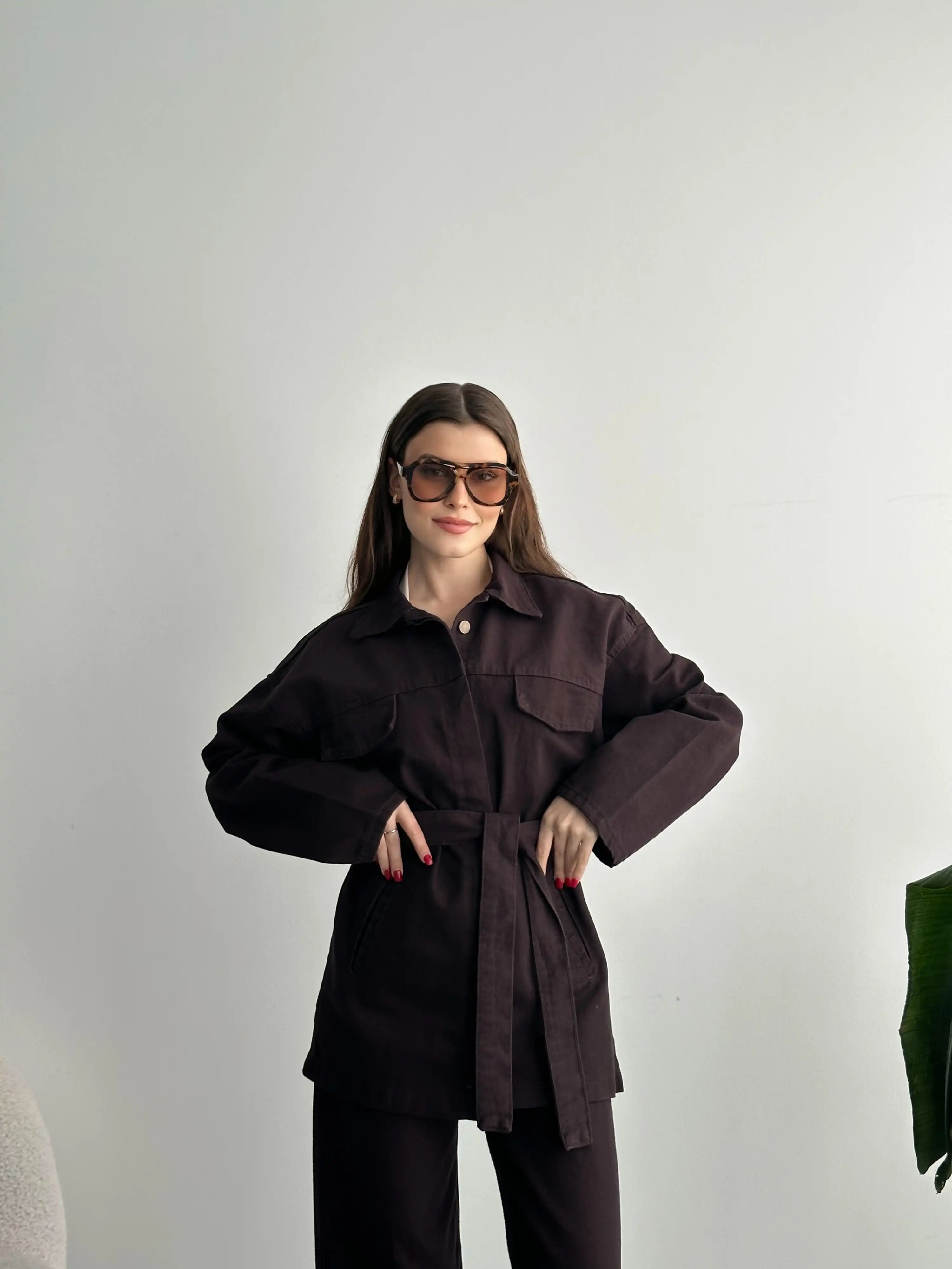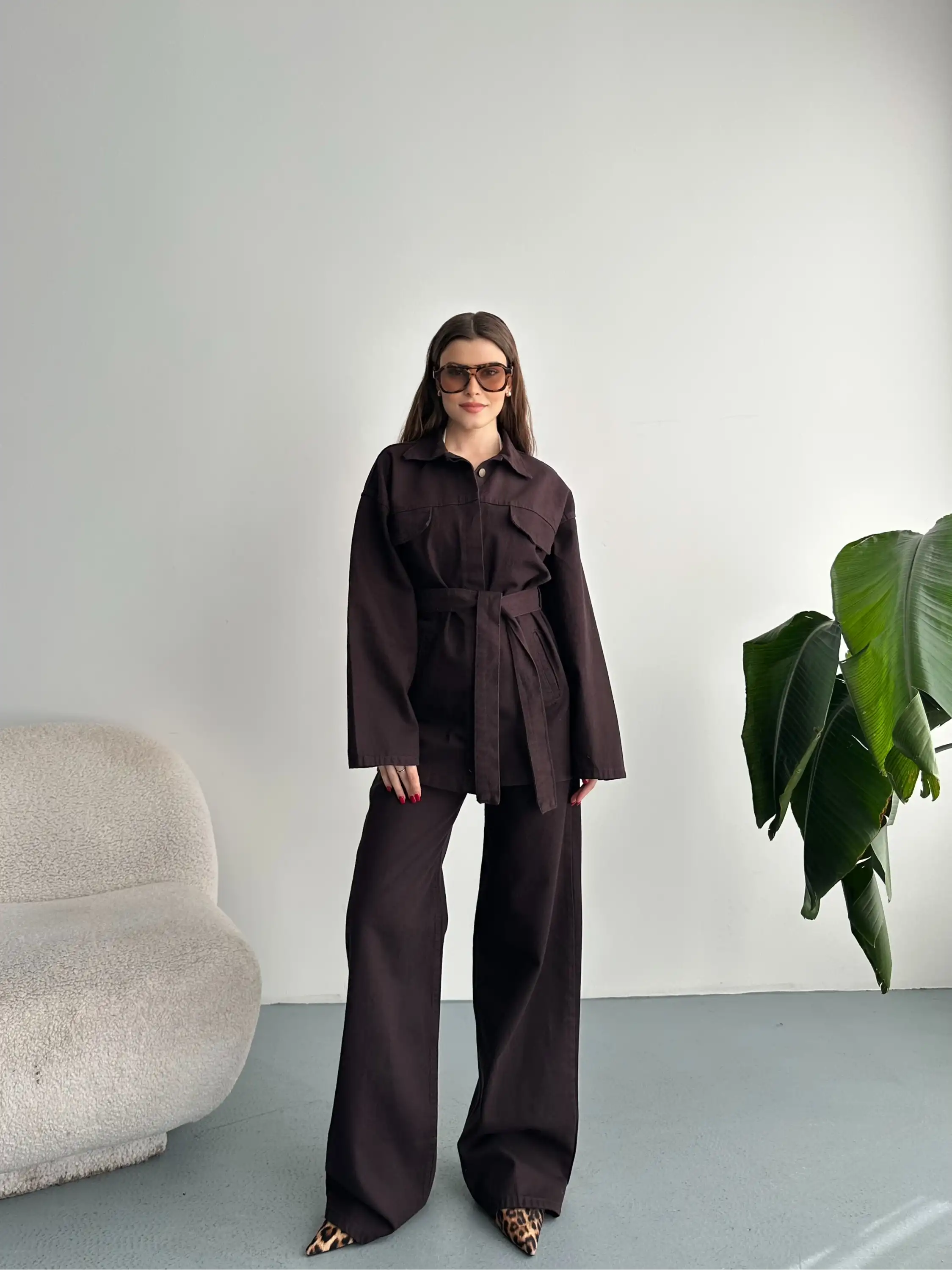 BELİ KUŞAKLI DENİM TAKIM-KAHVE