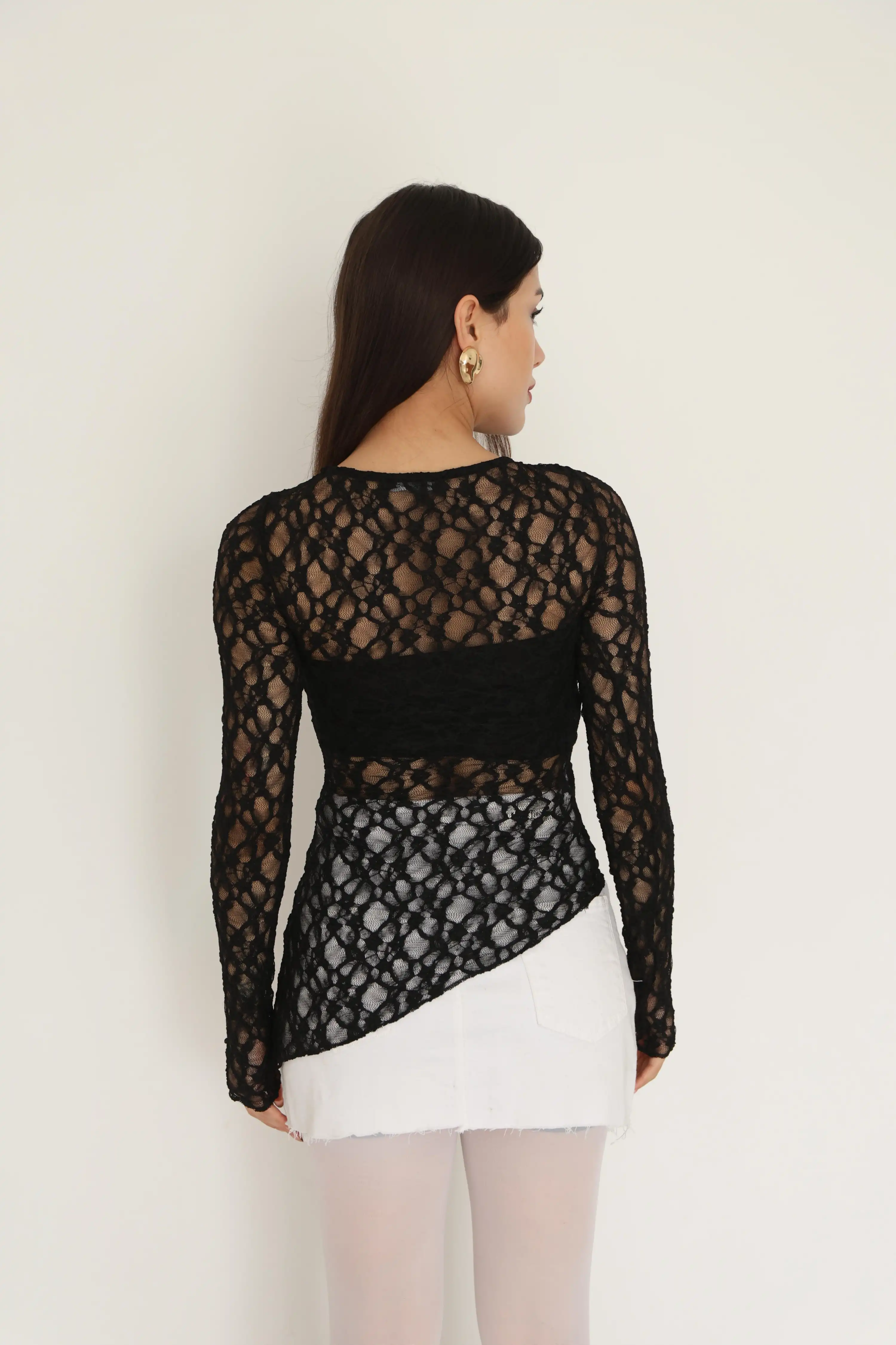 BİSİKLET YAKA DANTELLİ BLUZ-SİYAH