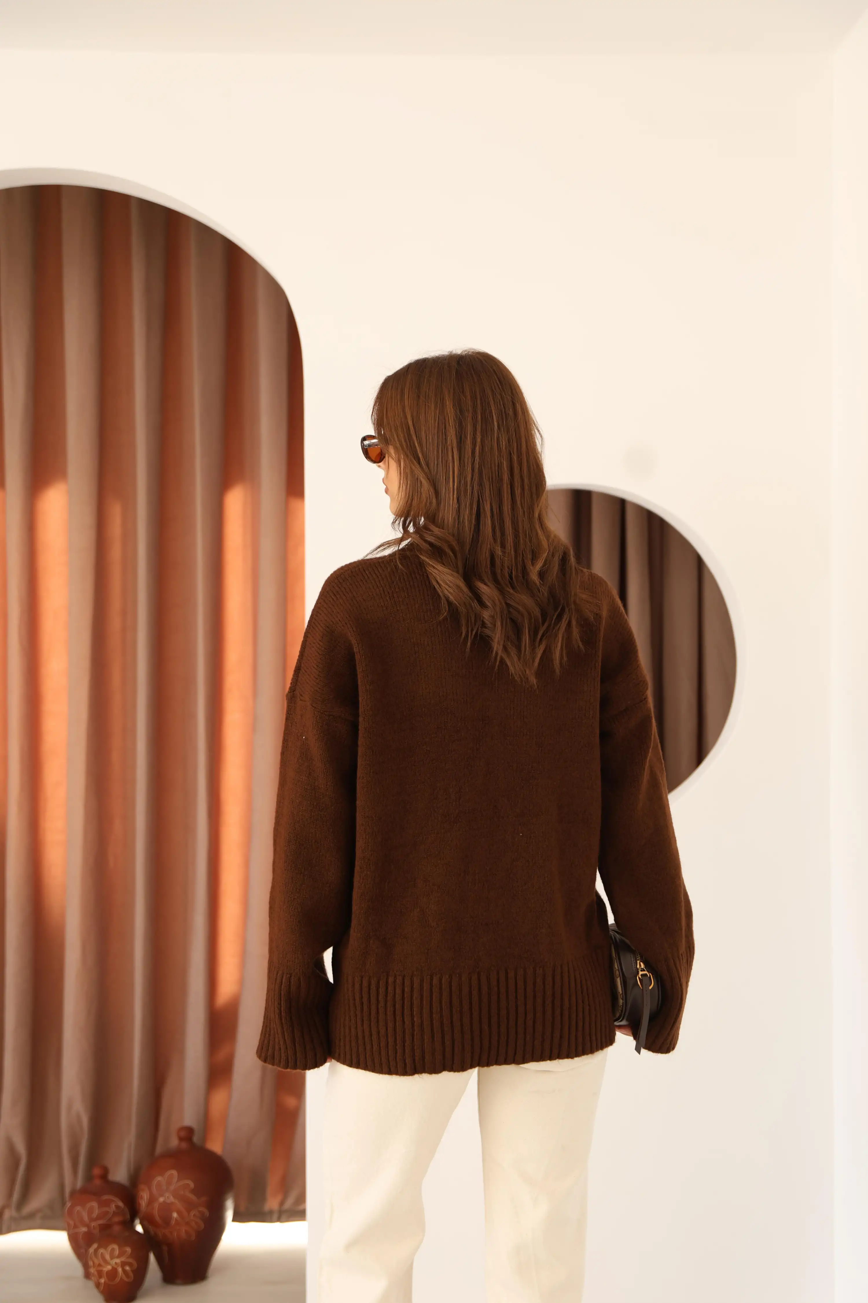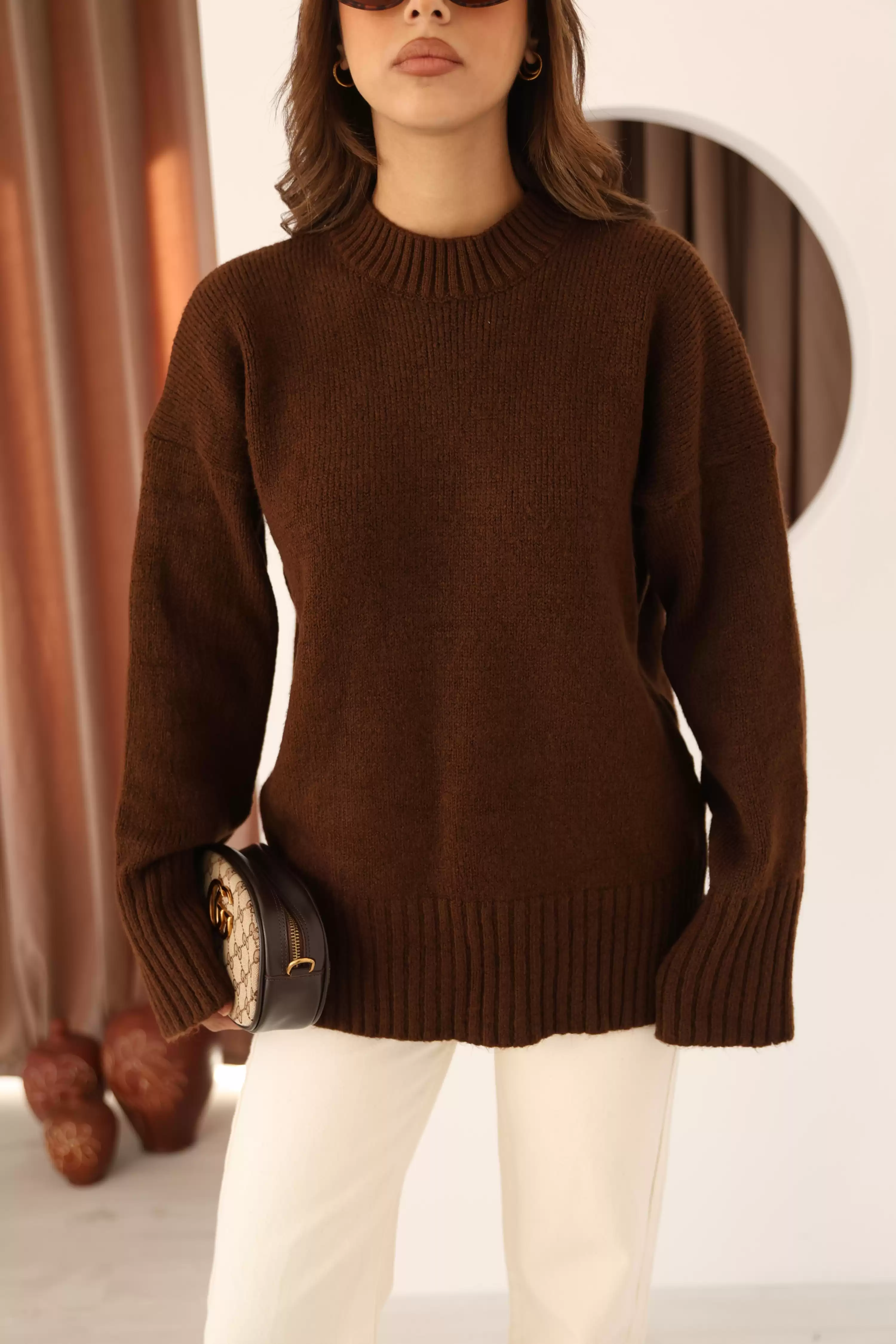 BİSİKLET YAKA OVERSİZE KAZAK-KAHVE