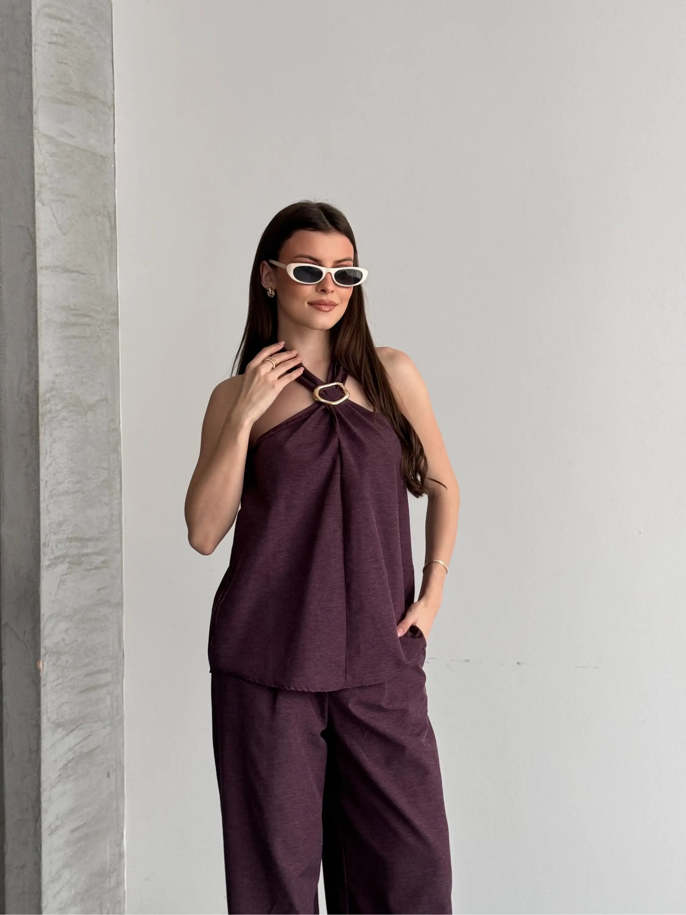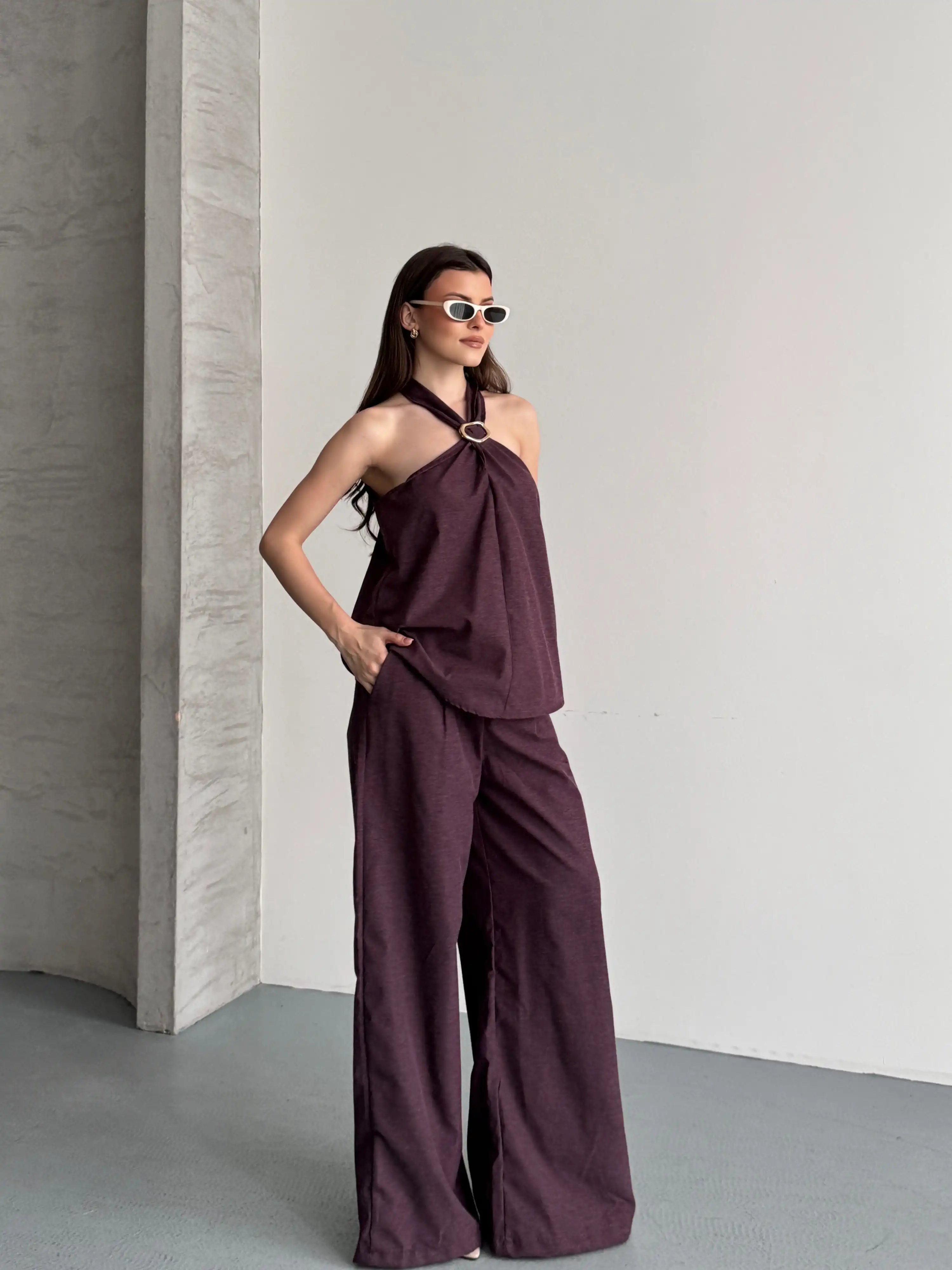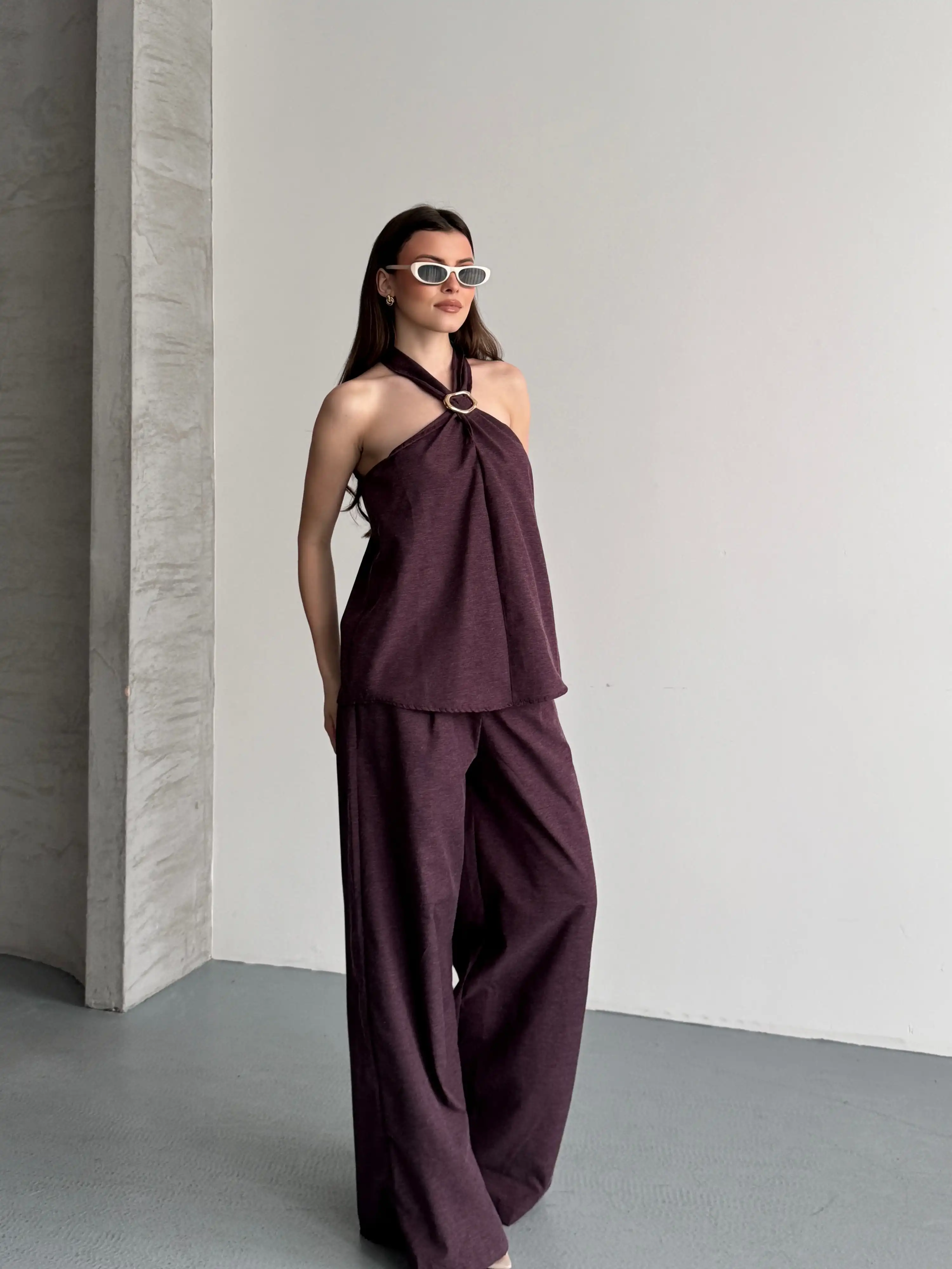 BOYUN GEÇİRMELİ GOLD AKSESUARLI PANTOLONLU TAKIM-KAHVE