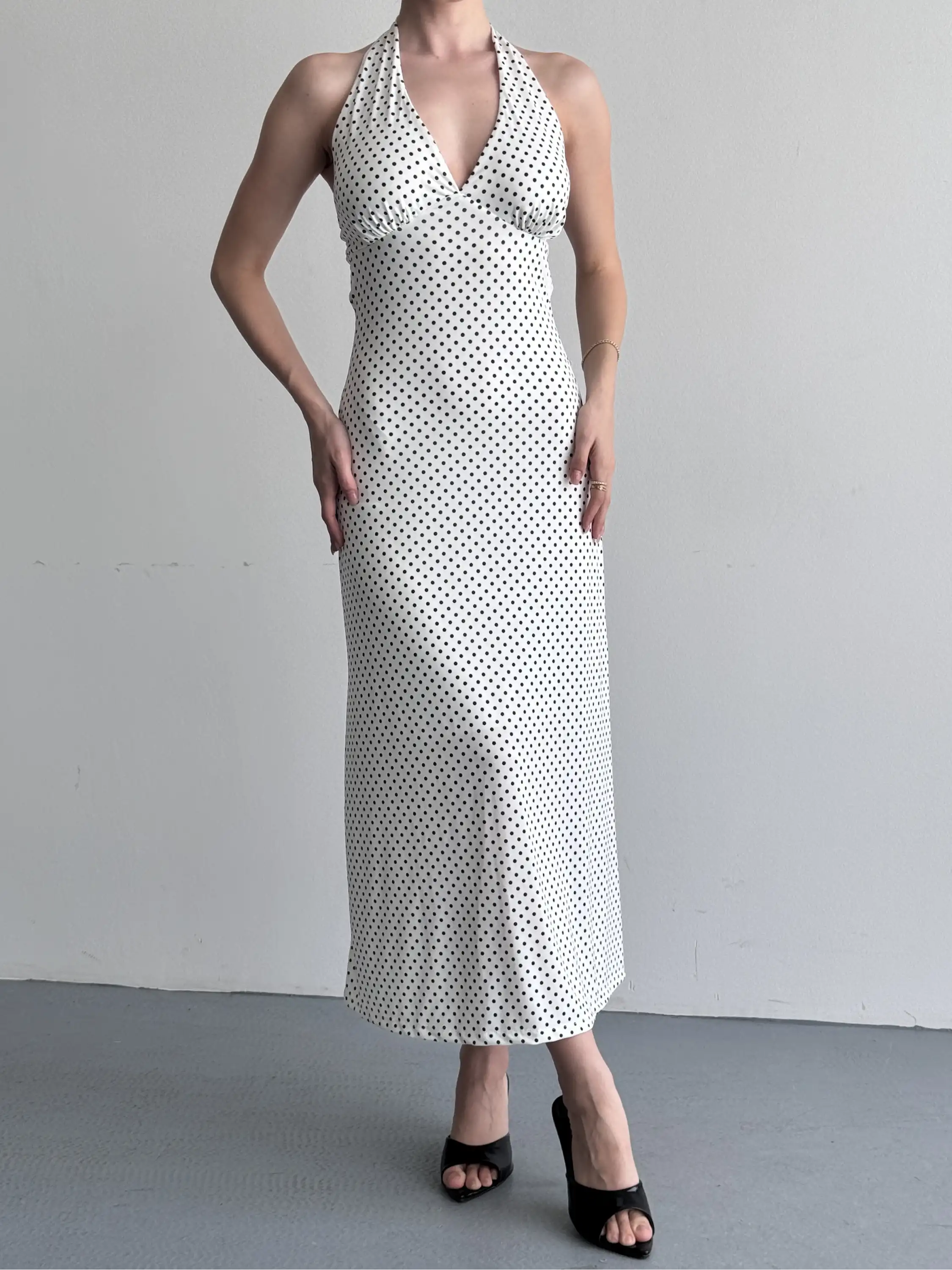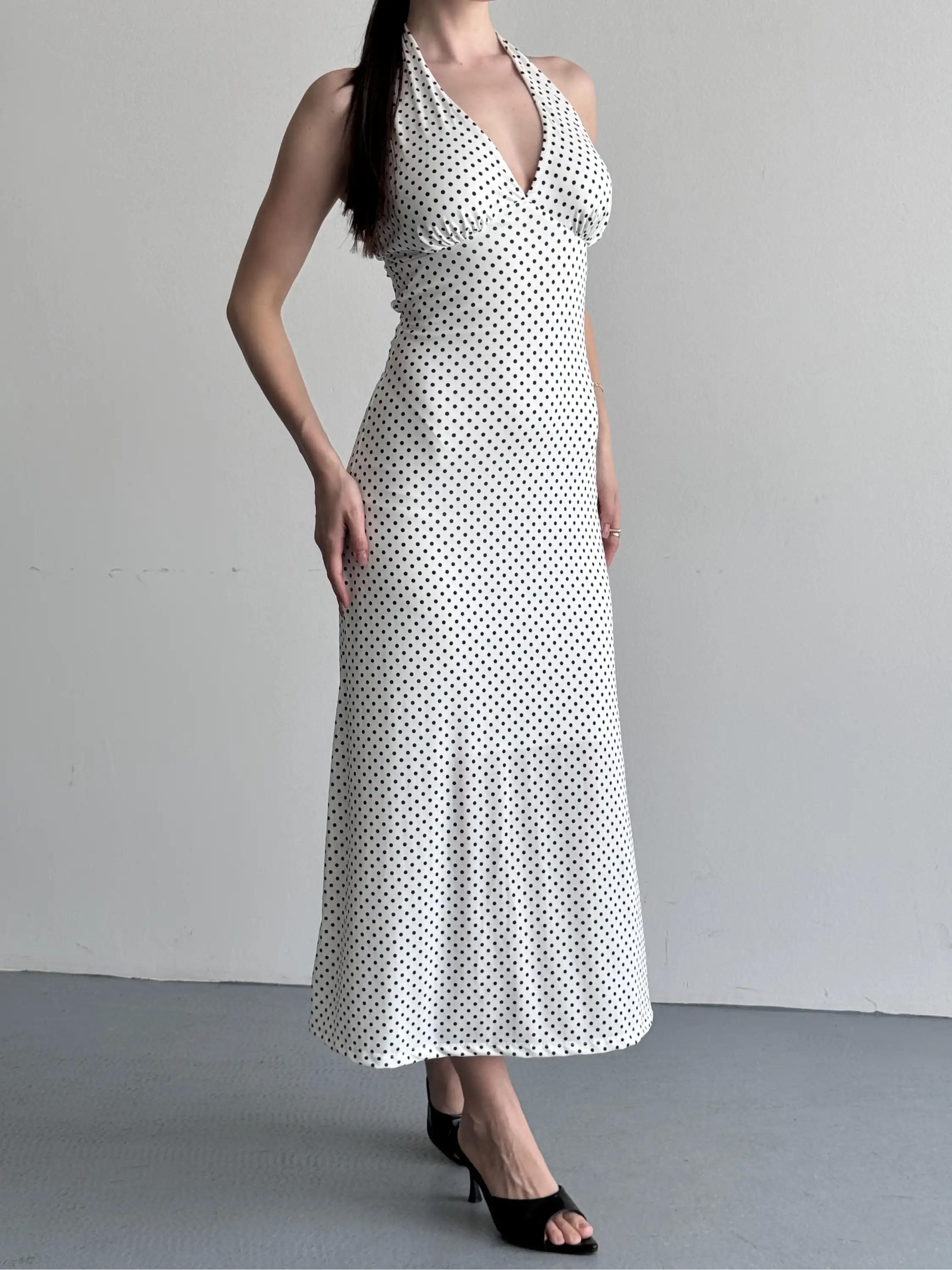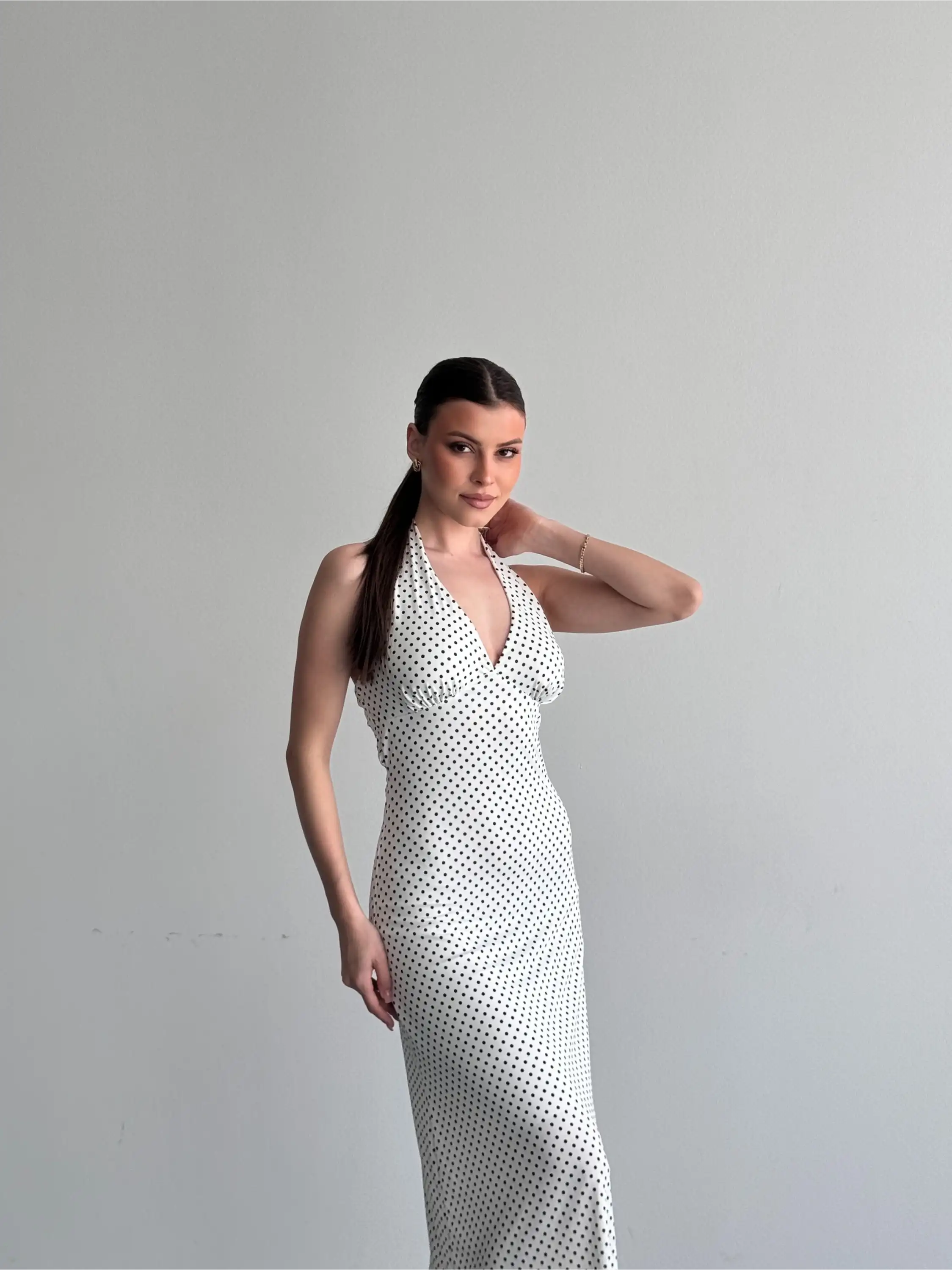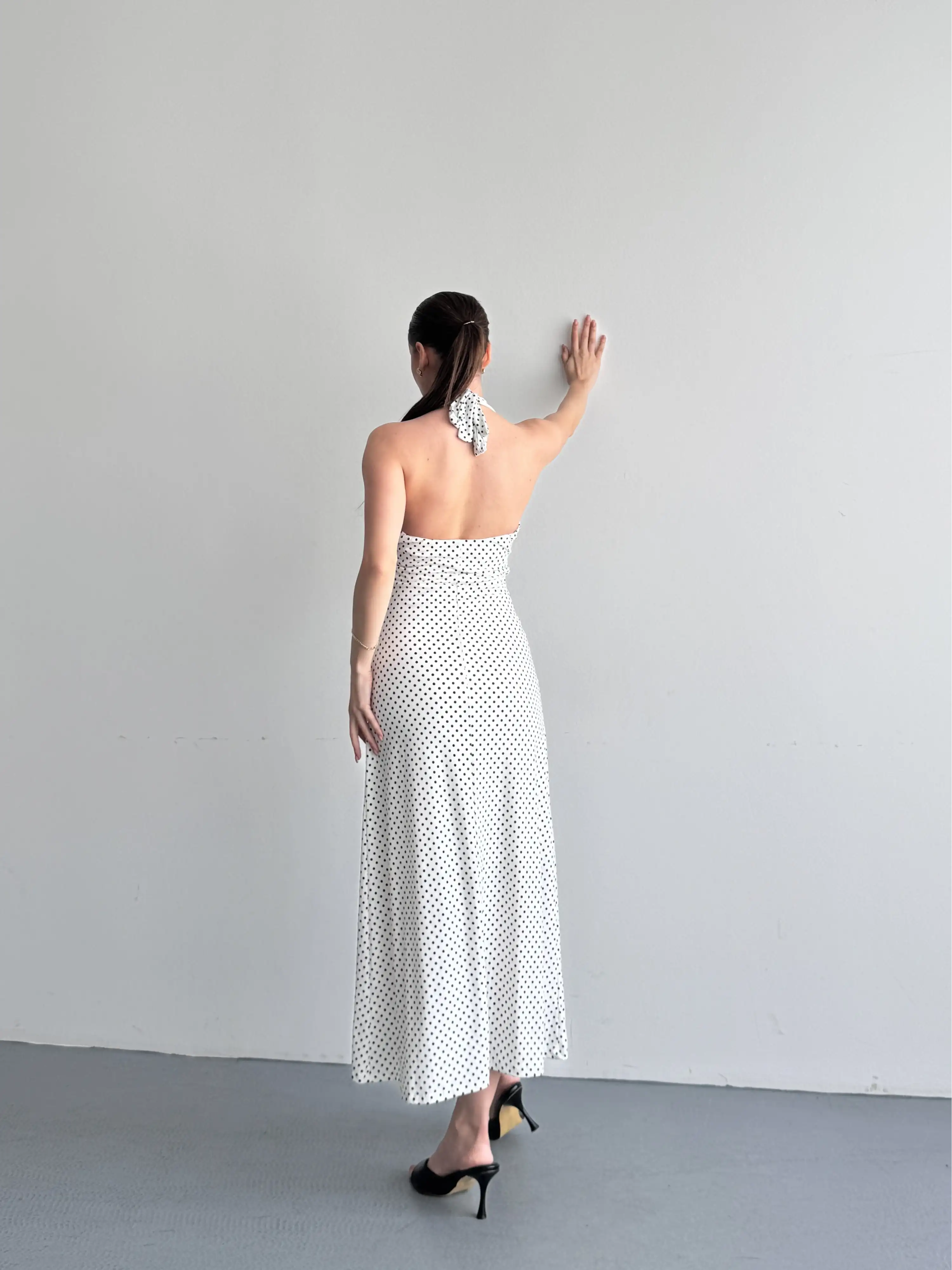 BOYUNDAN BAĞLAMALI PUANTİYELİ ELBİSE-BEYAZ