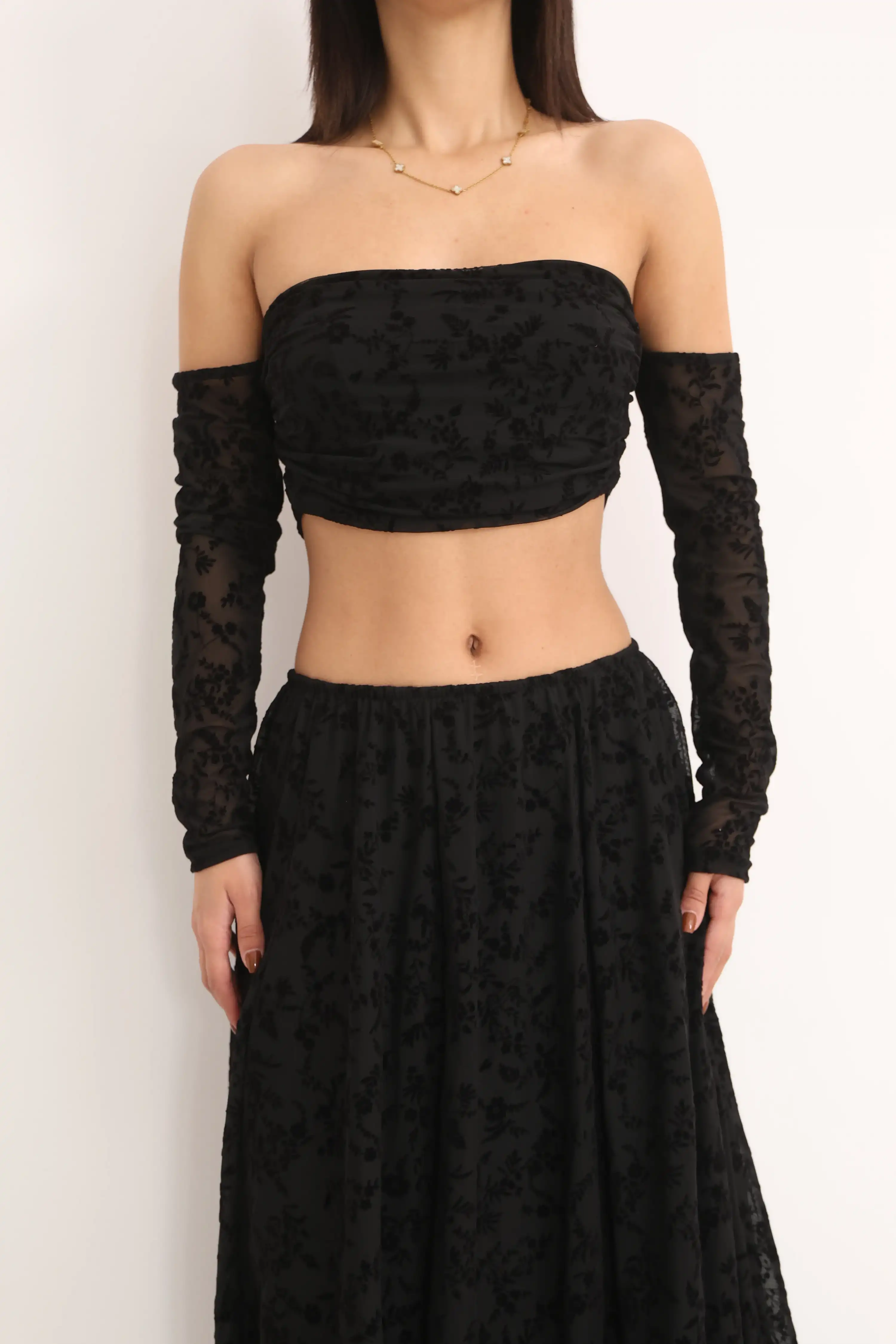 ÇİÇEK DESENLİ BÜZGÜLÜ BLUZ TAKIM-SİYAH