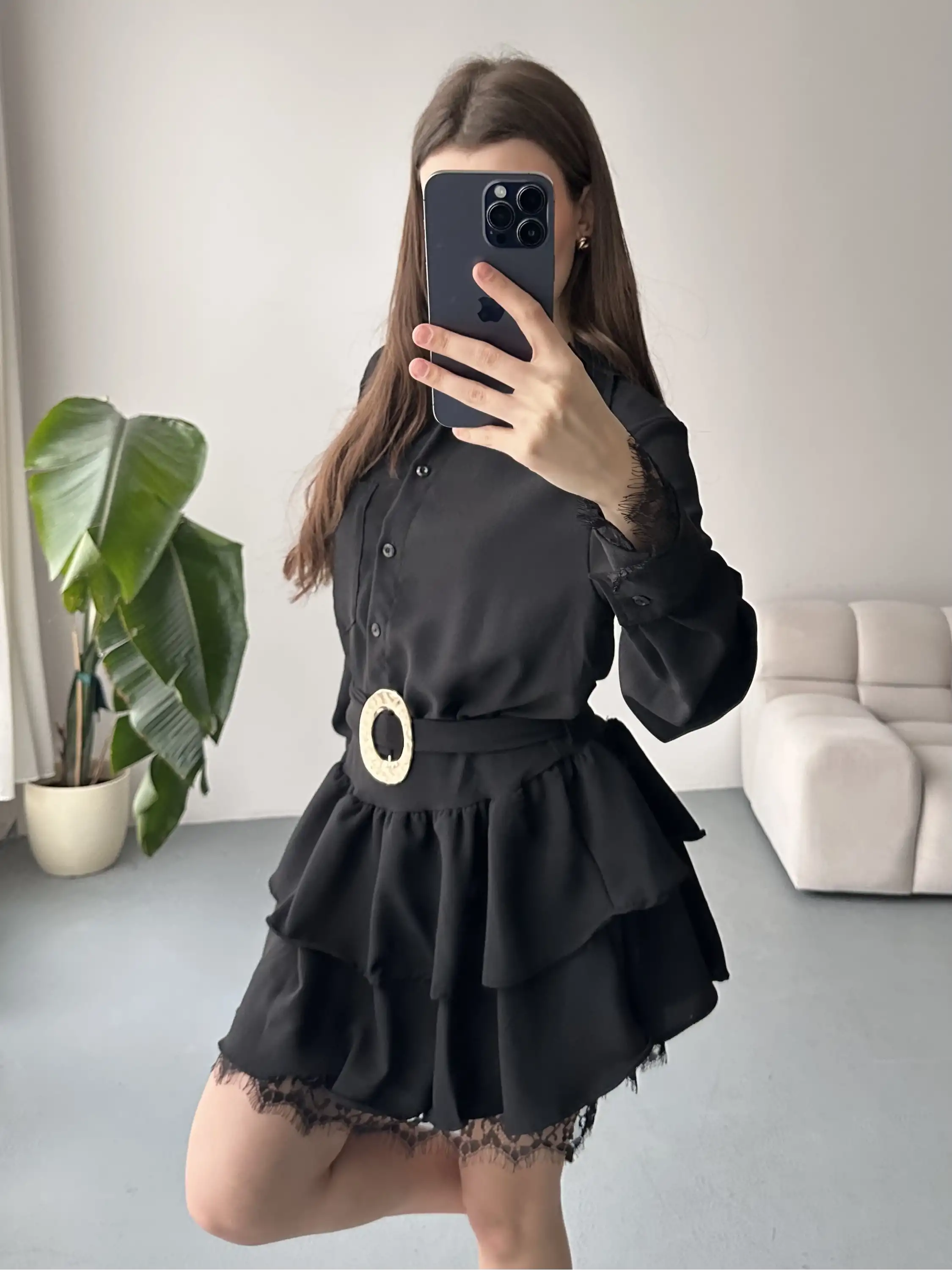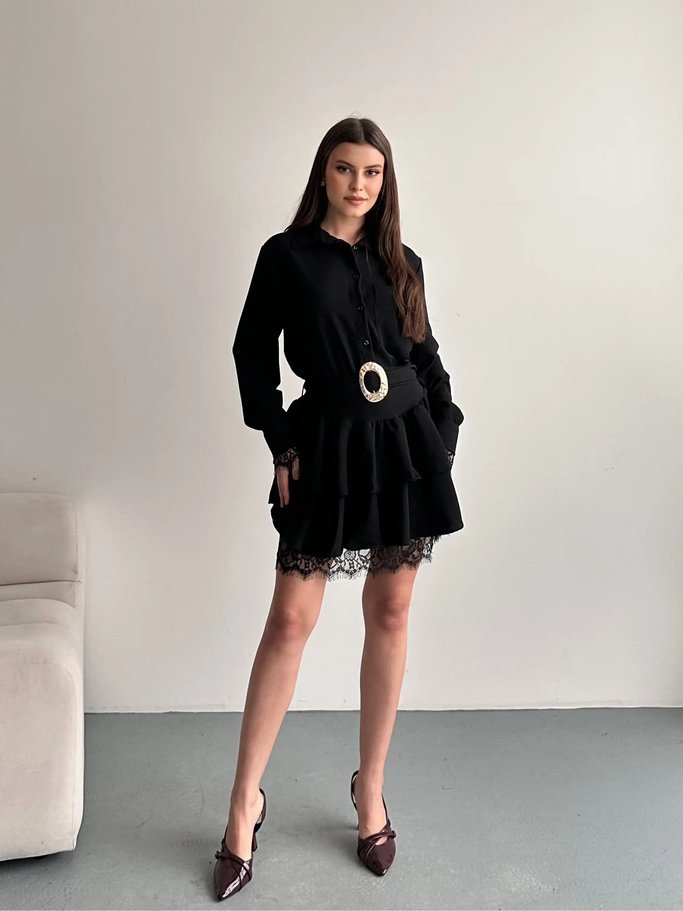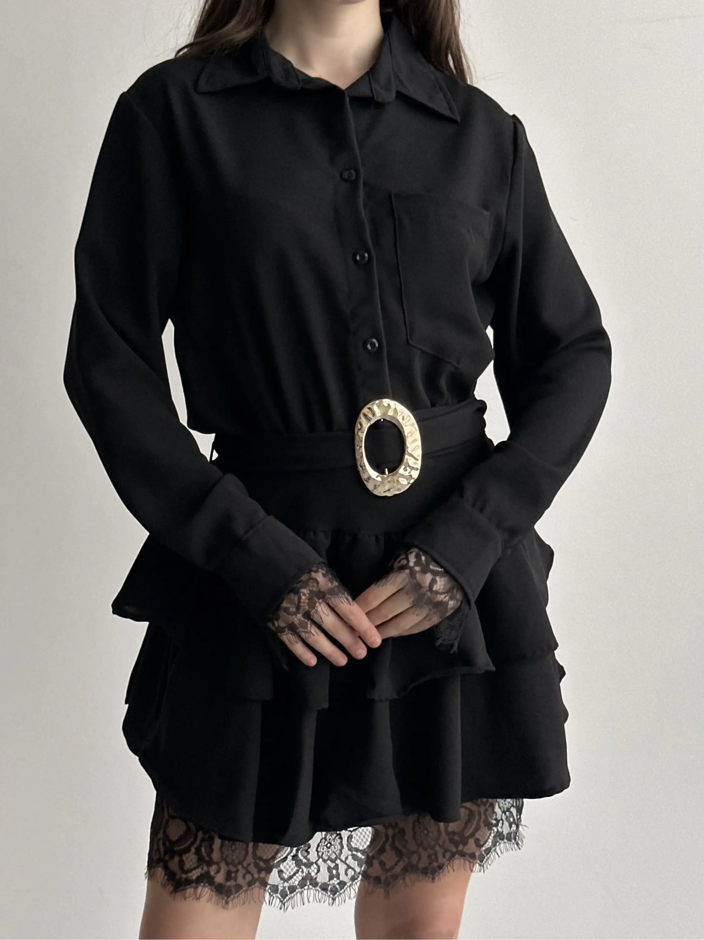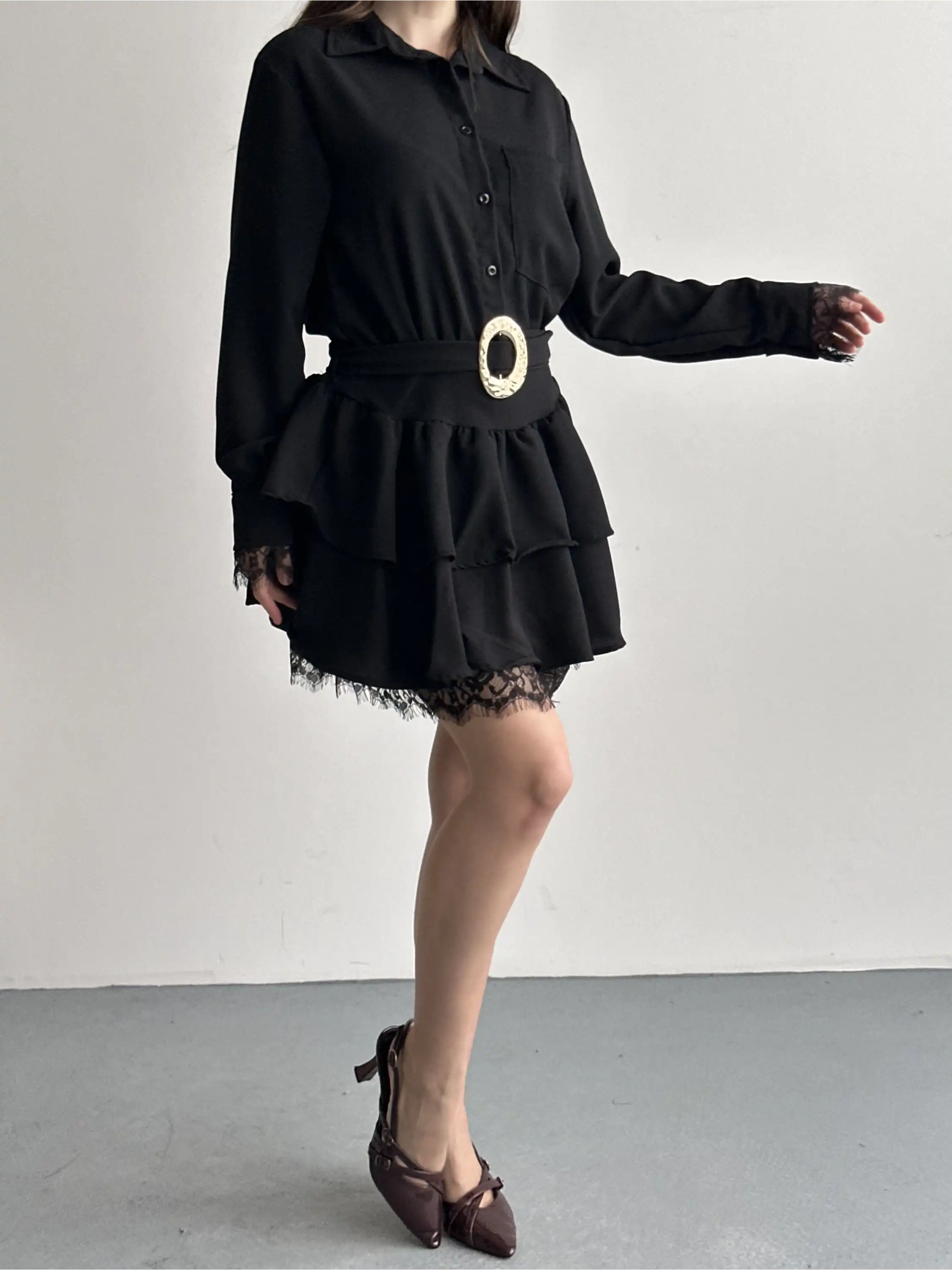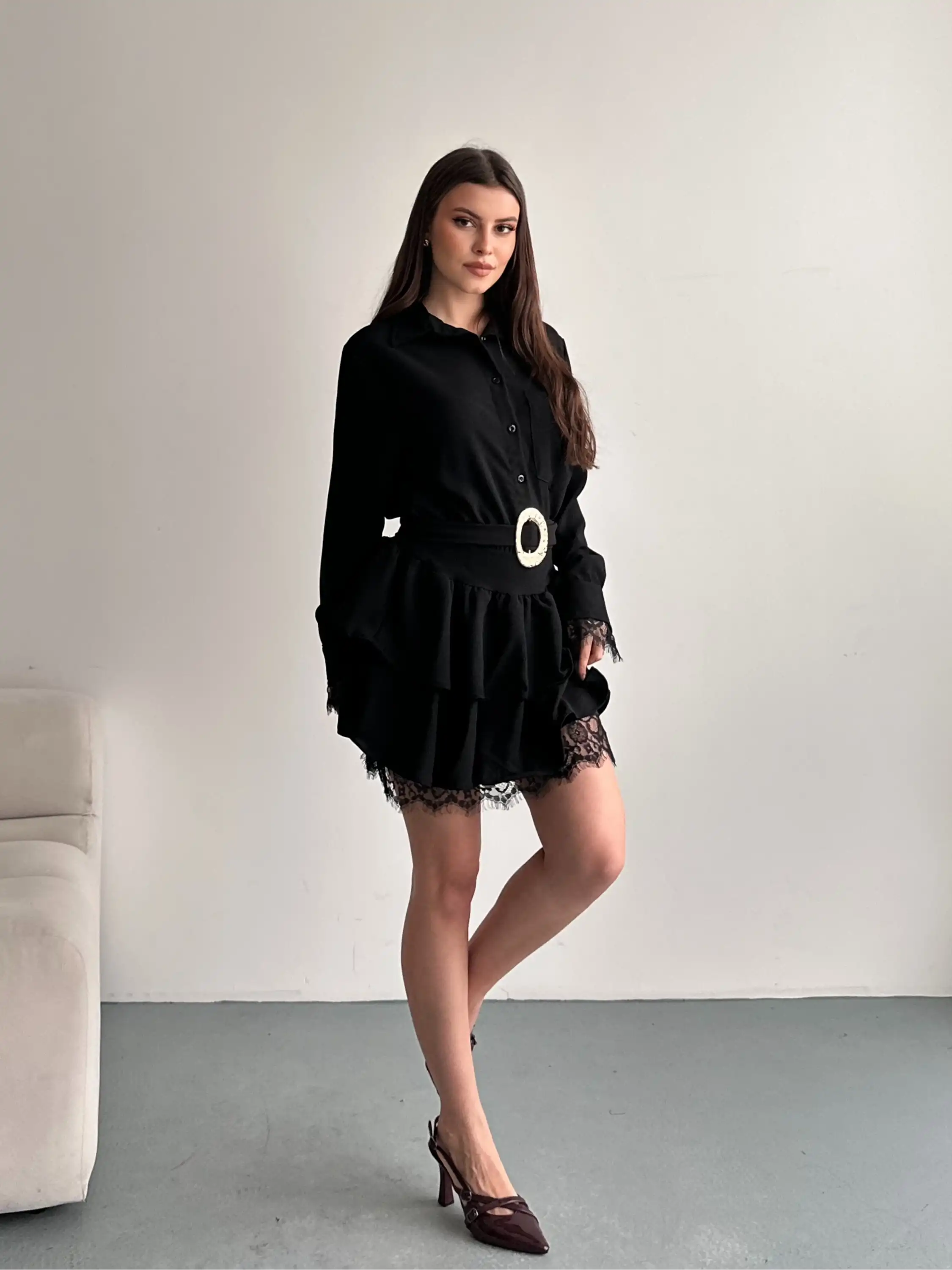 DANTEL DETAYLI KEMERLİ GÖMLEK YAKA ELBİSE-SİYAH