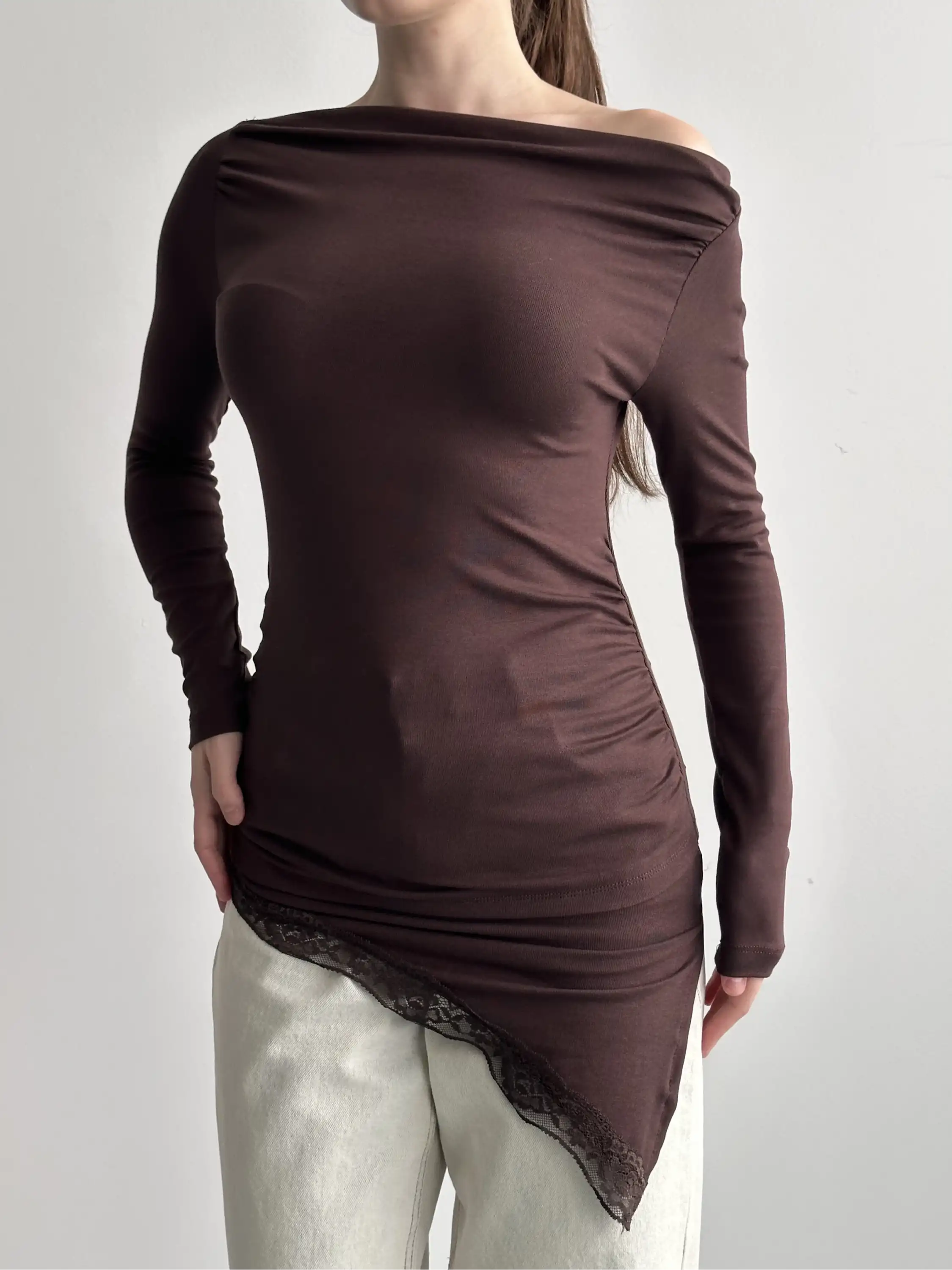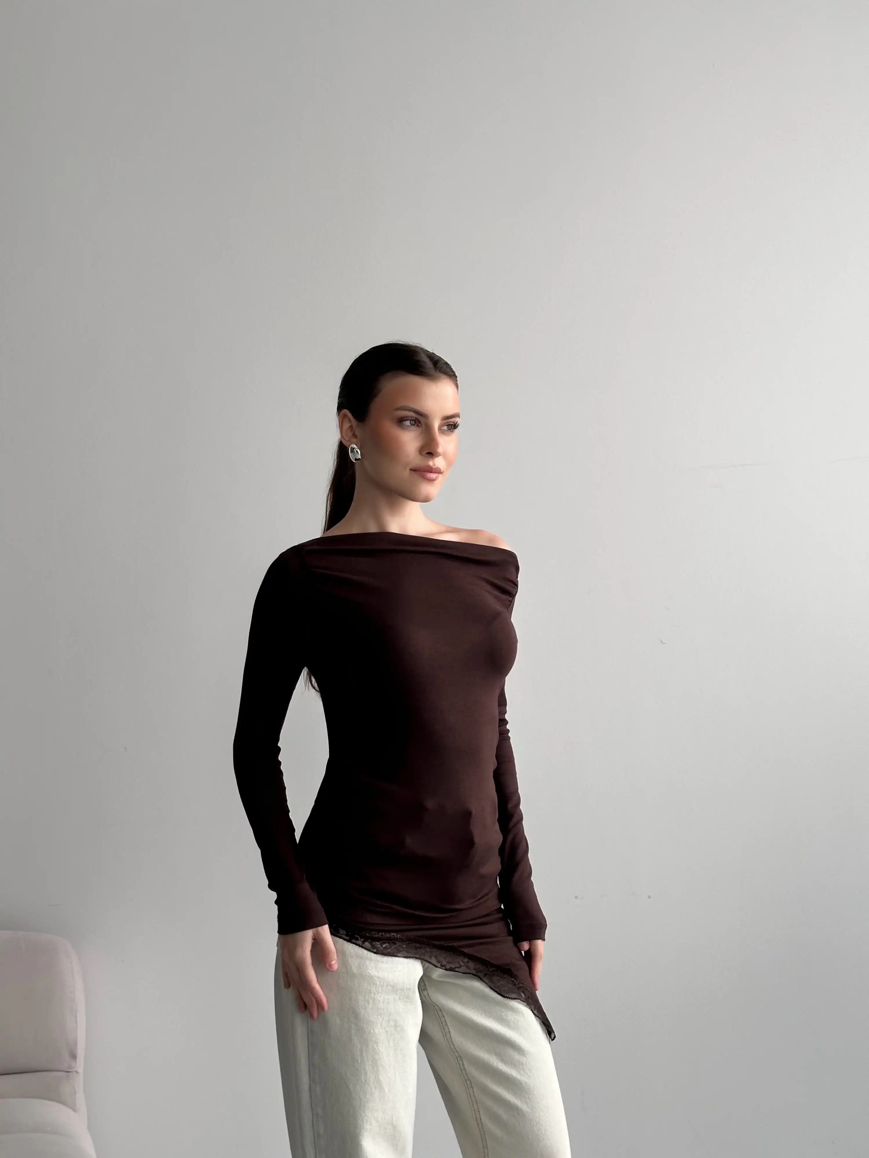 DANTEL GEÇİŞLİ KAYIK YAKA BLUZ-KAHVE
