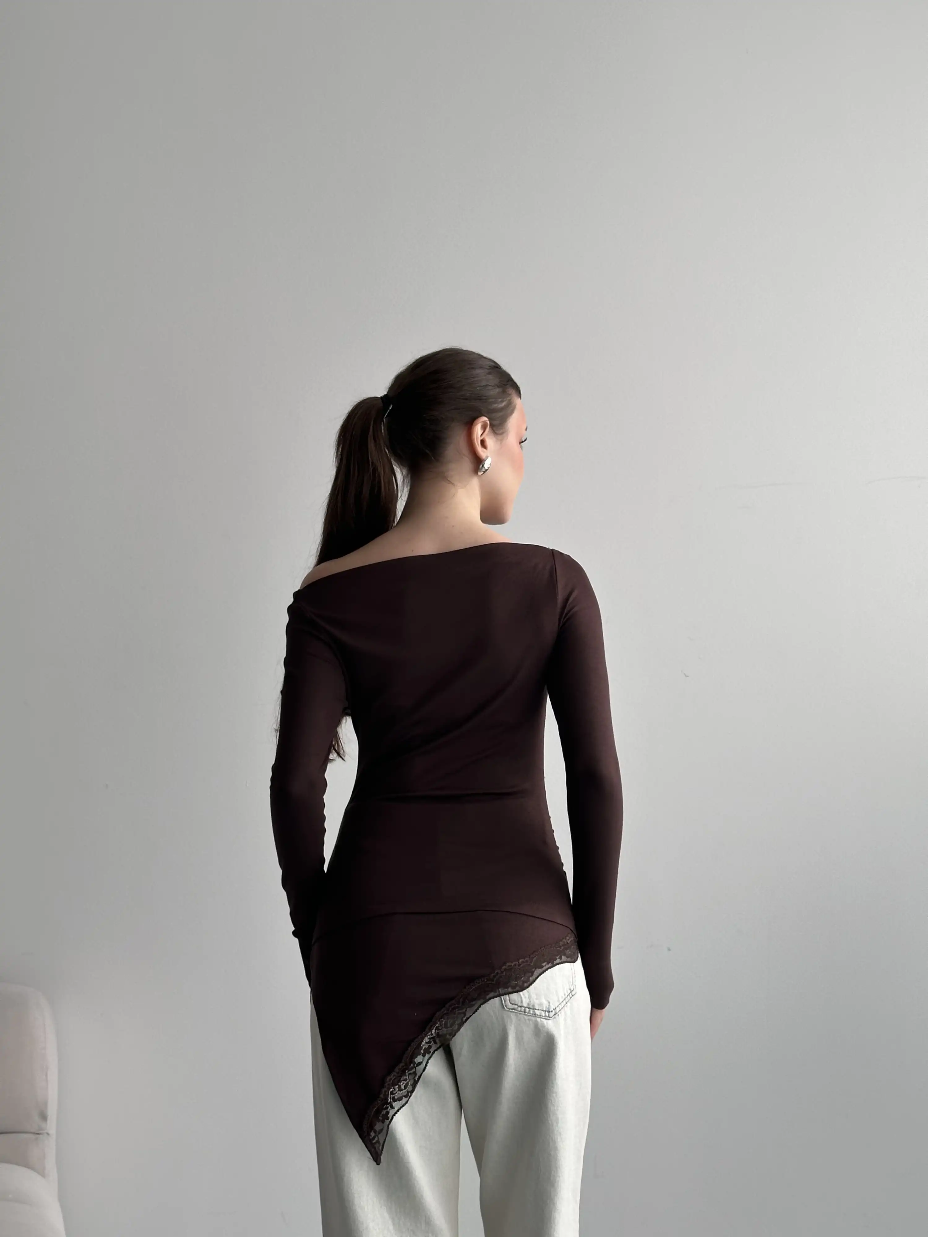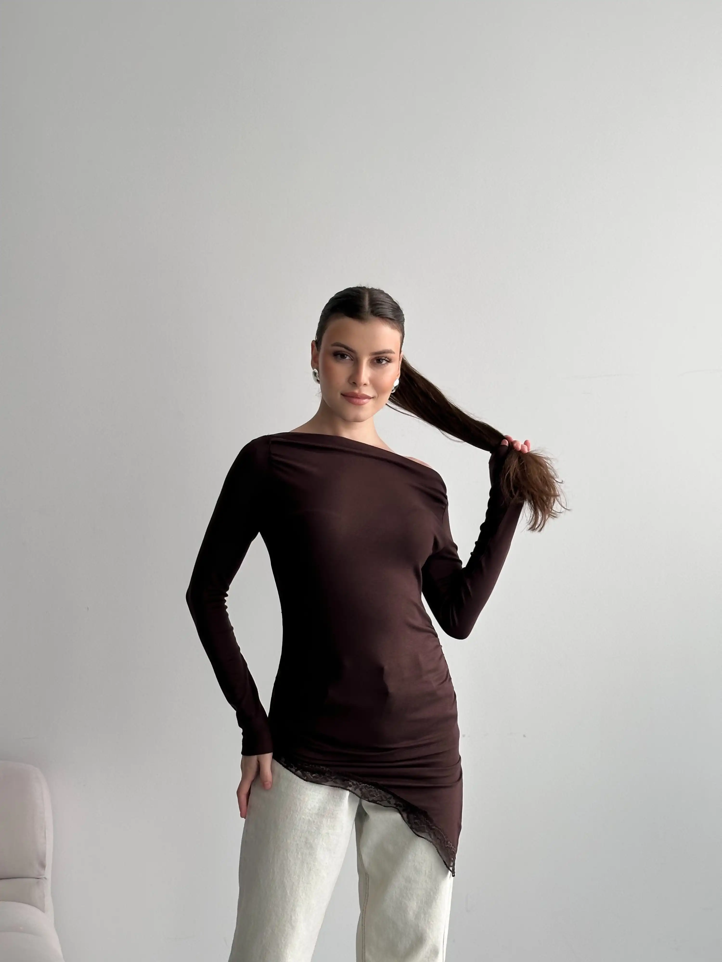 DANTEL DETAYLI OVERSIZE BLUZ-KAHVE