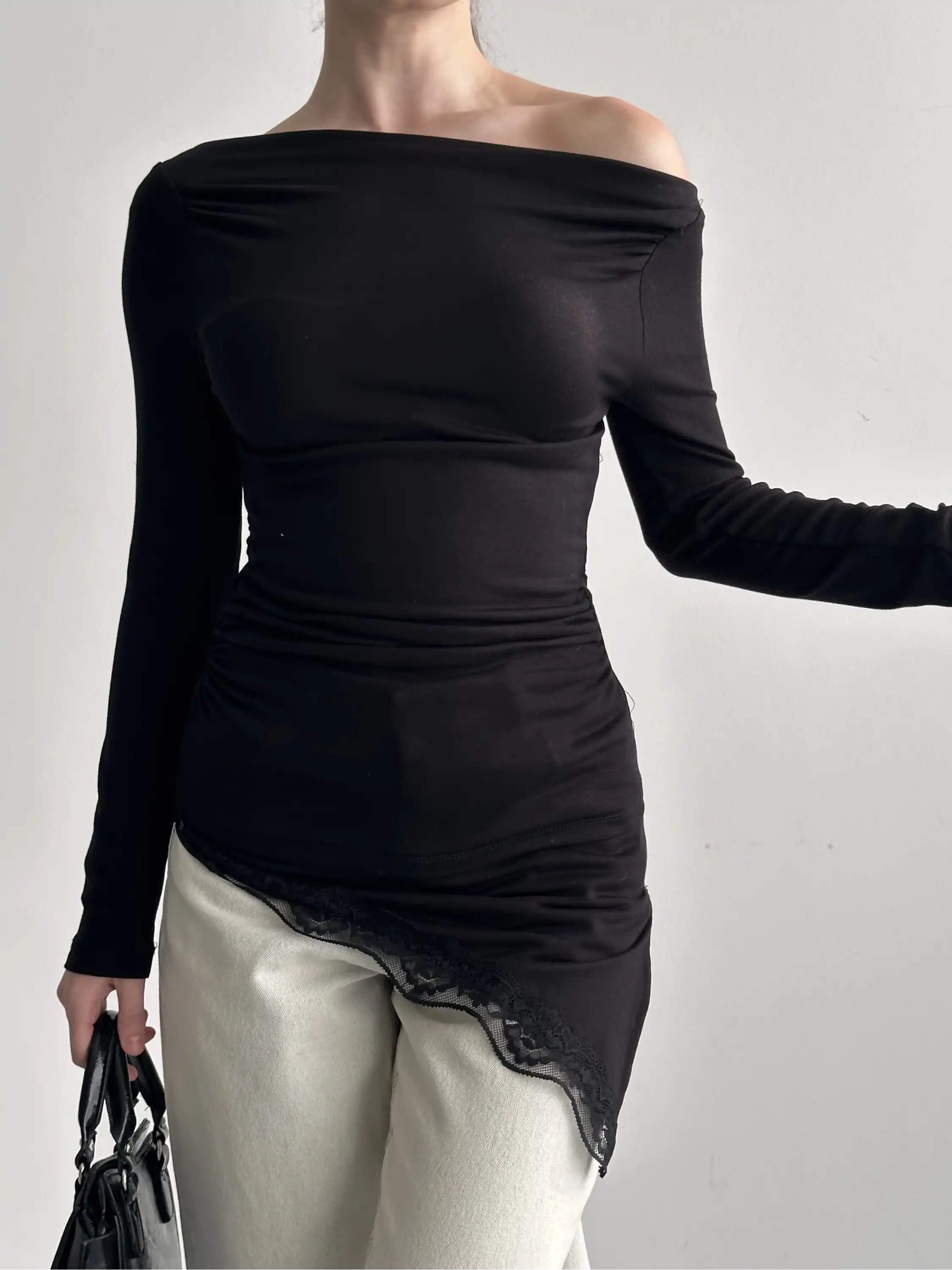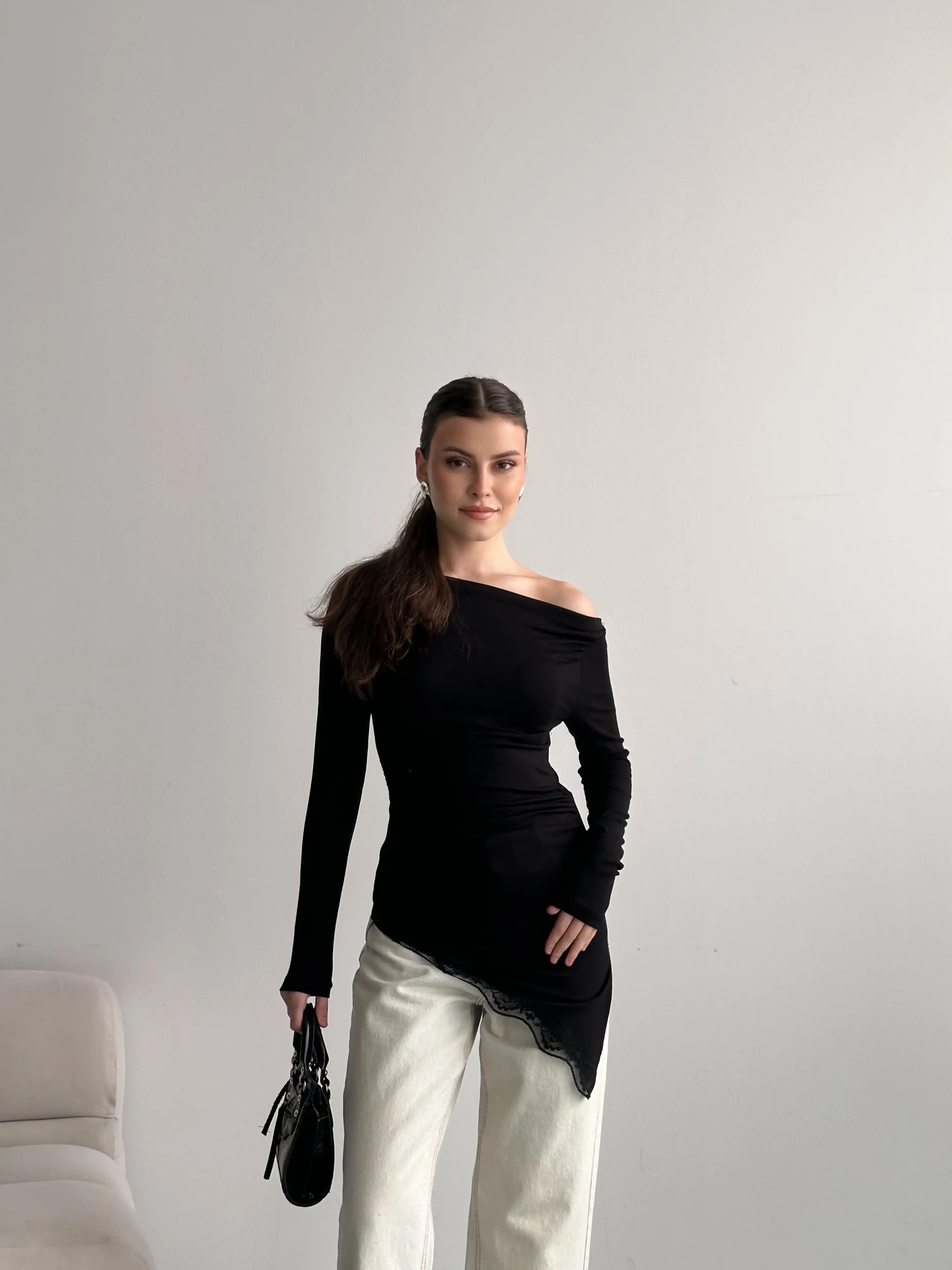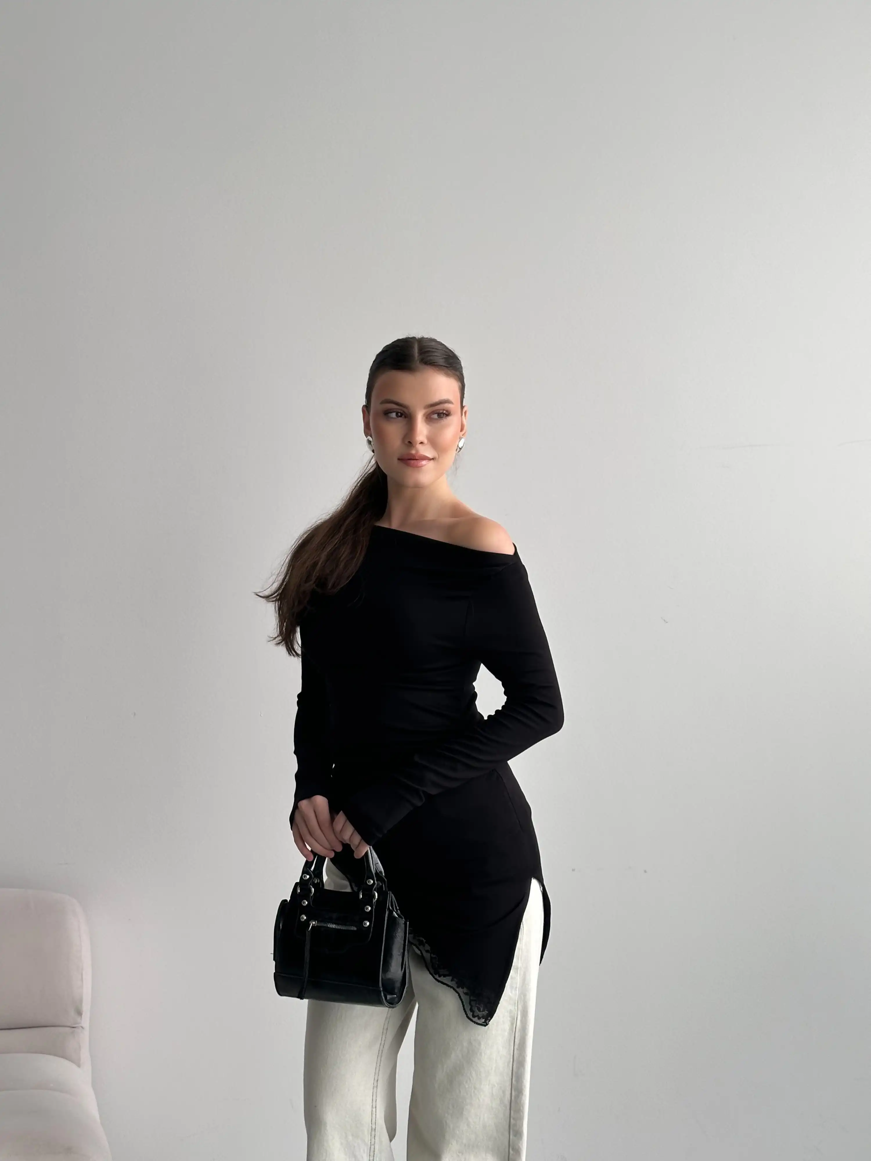 DANTEL GEÇİŞLİ KAYIK YAKA BLUZ-SİYAH