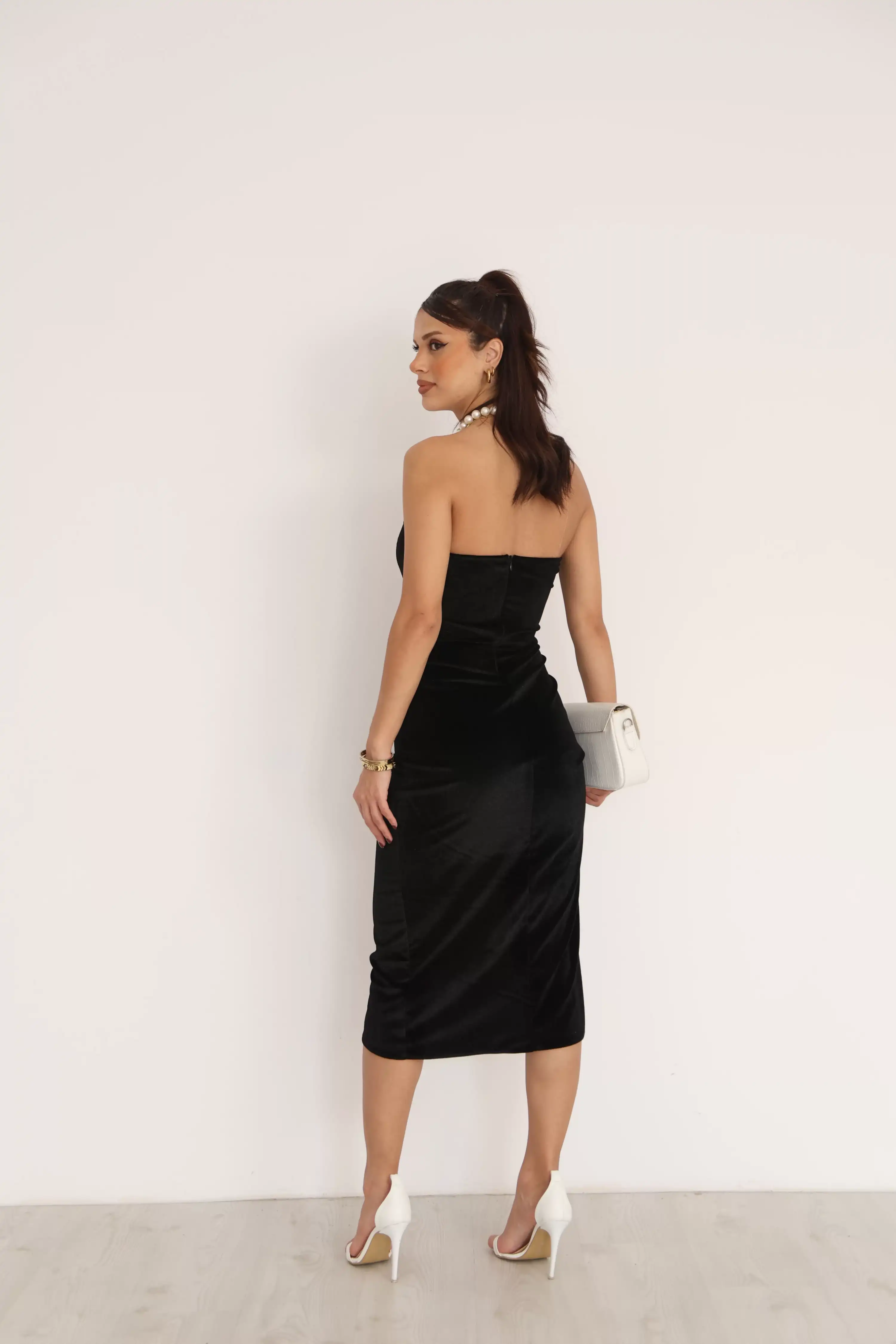 DEKOLTELİ STRAPLEZ PARLAK KADİFE ELBİSE-SİYAH