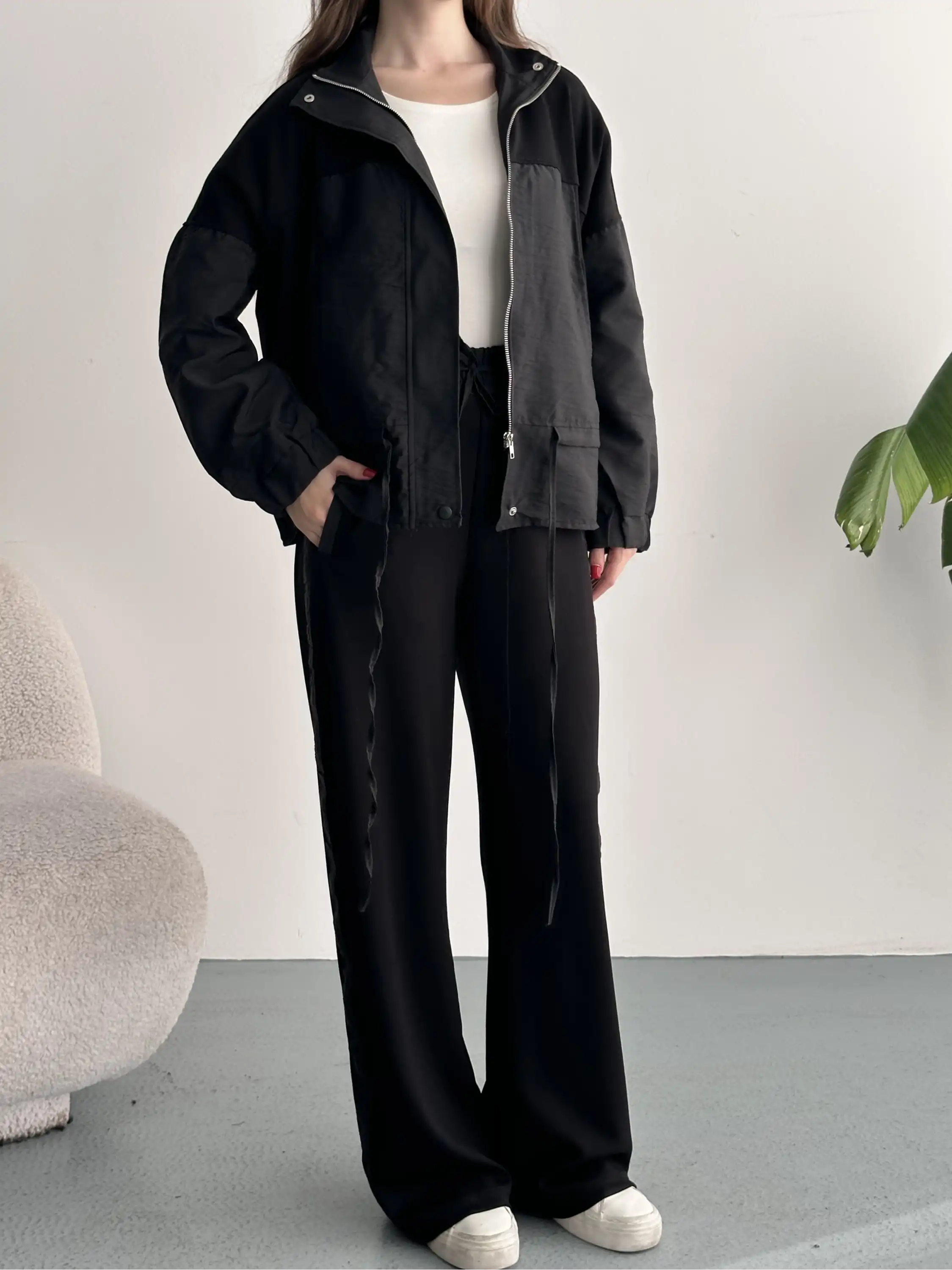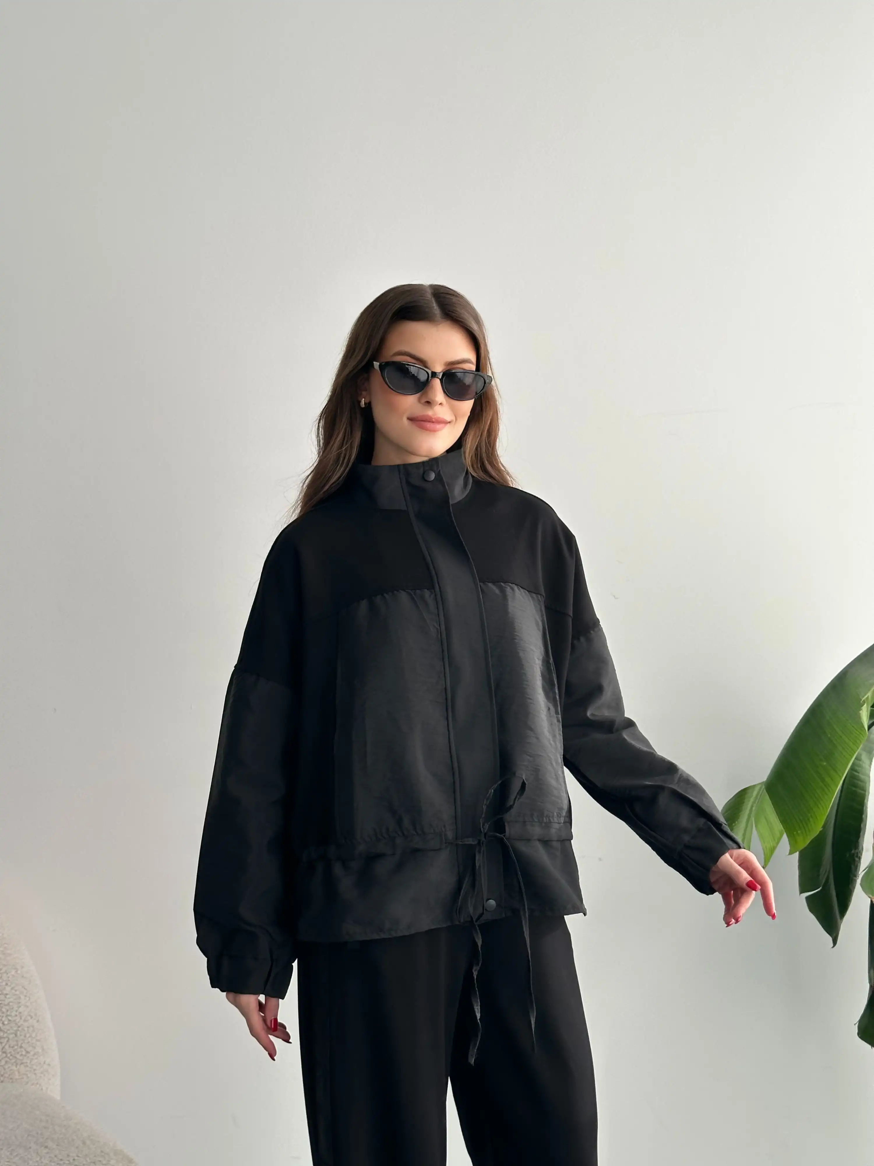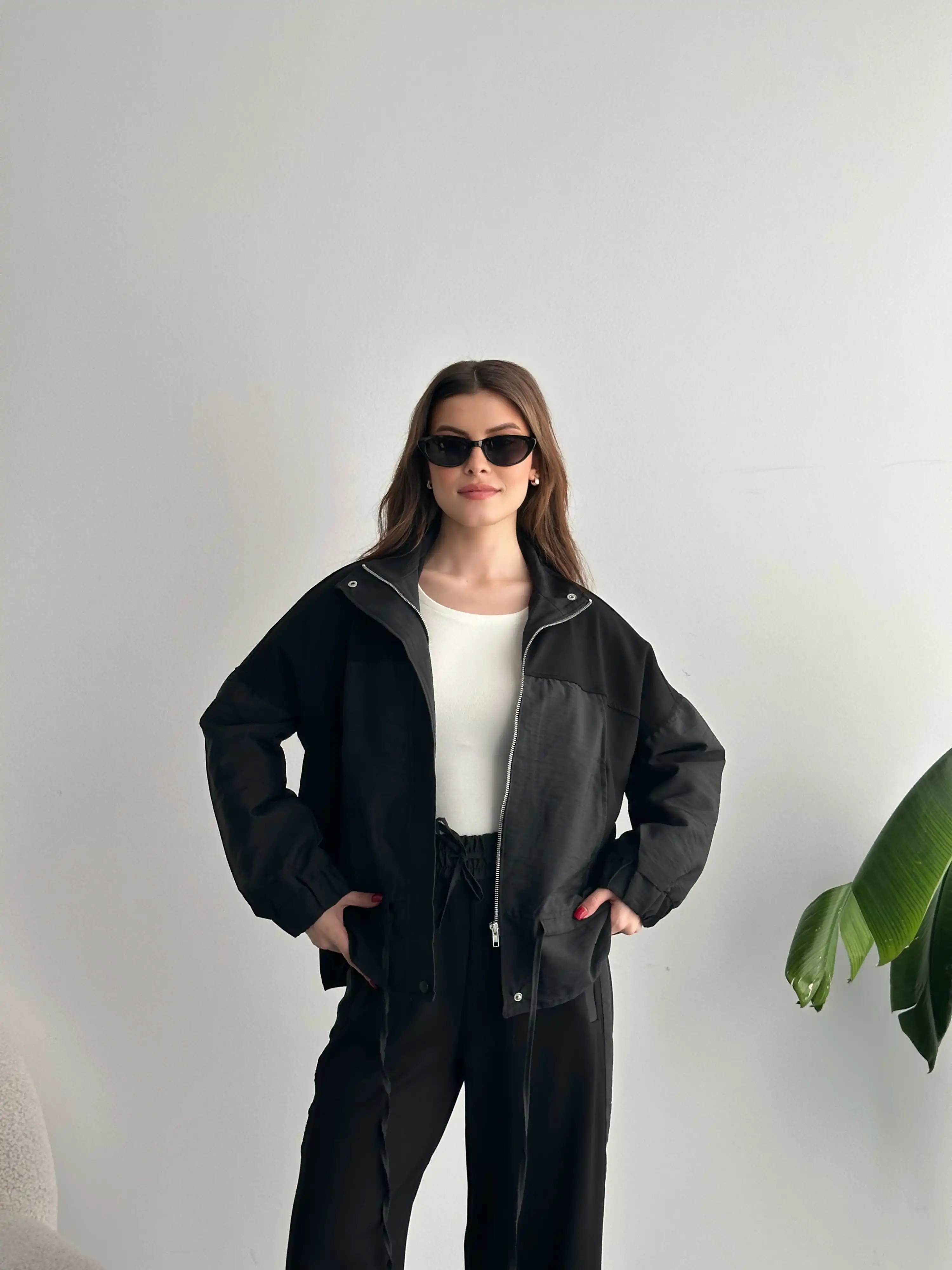 DİK YAKA FERMUARLI PARAŞÜT MODAL TAKIM-SİYAH