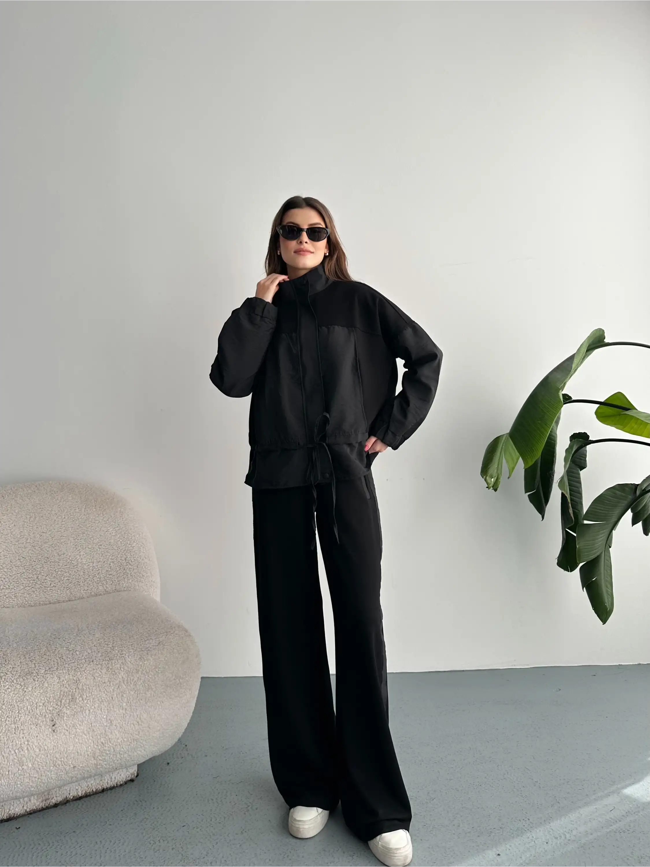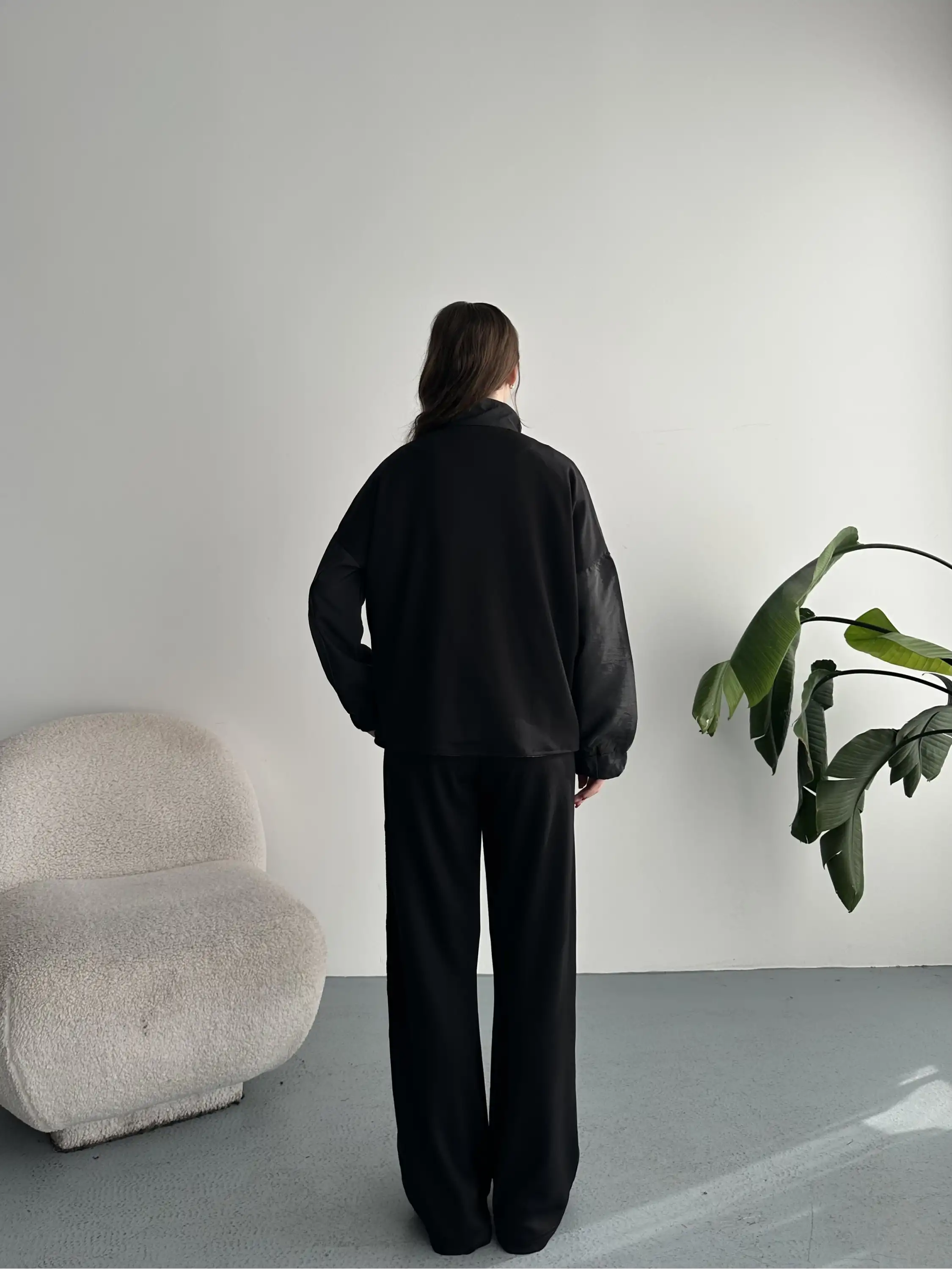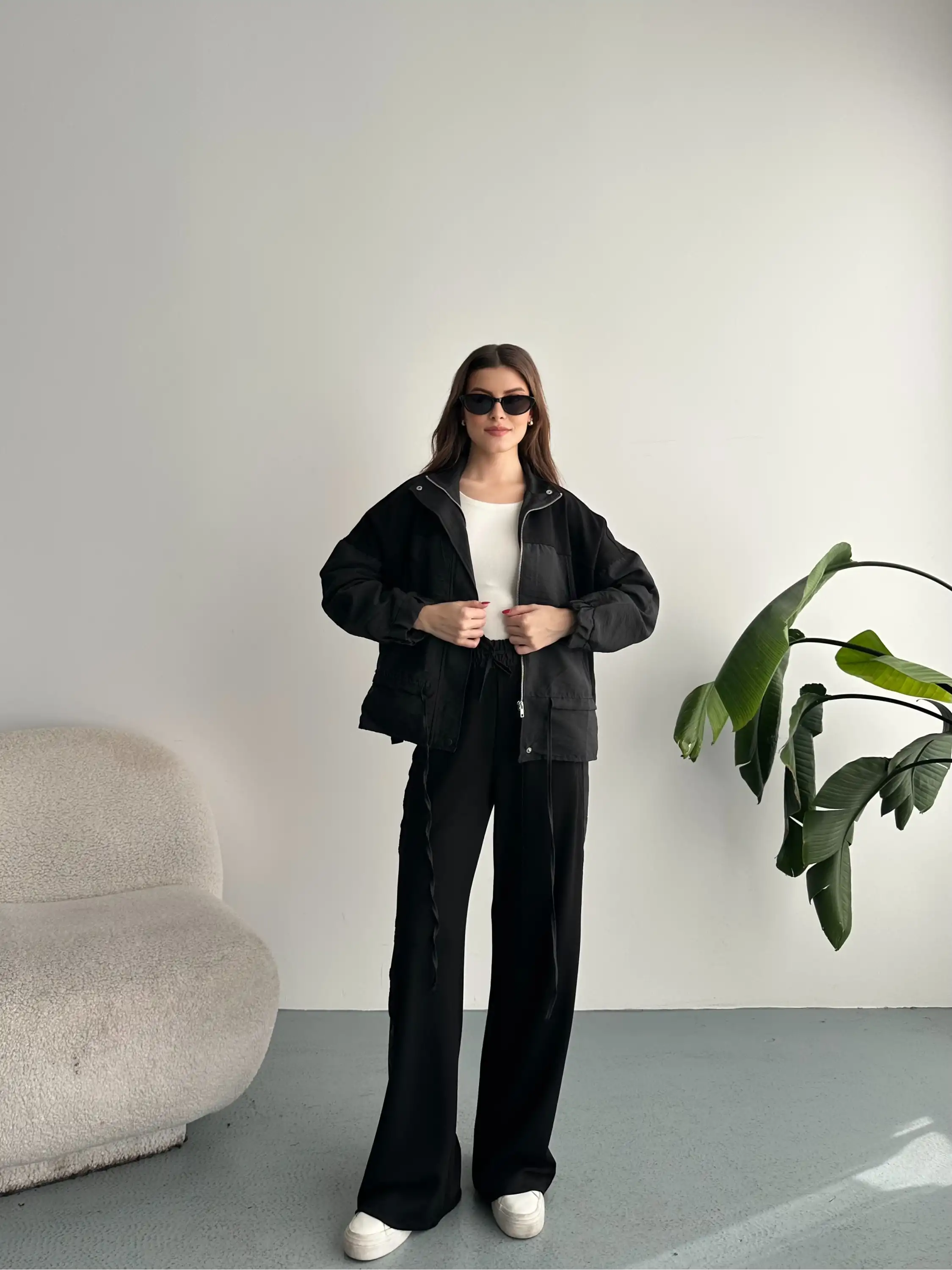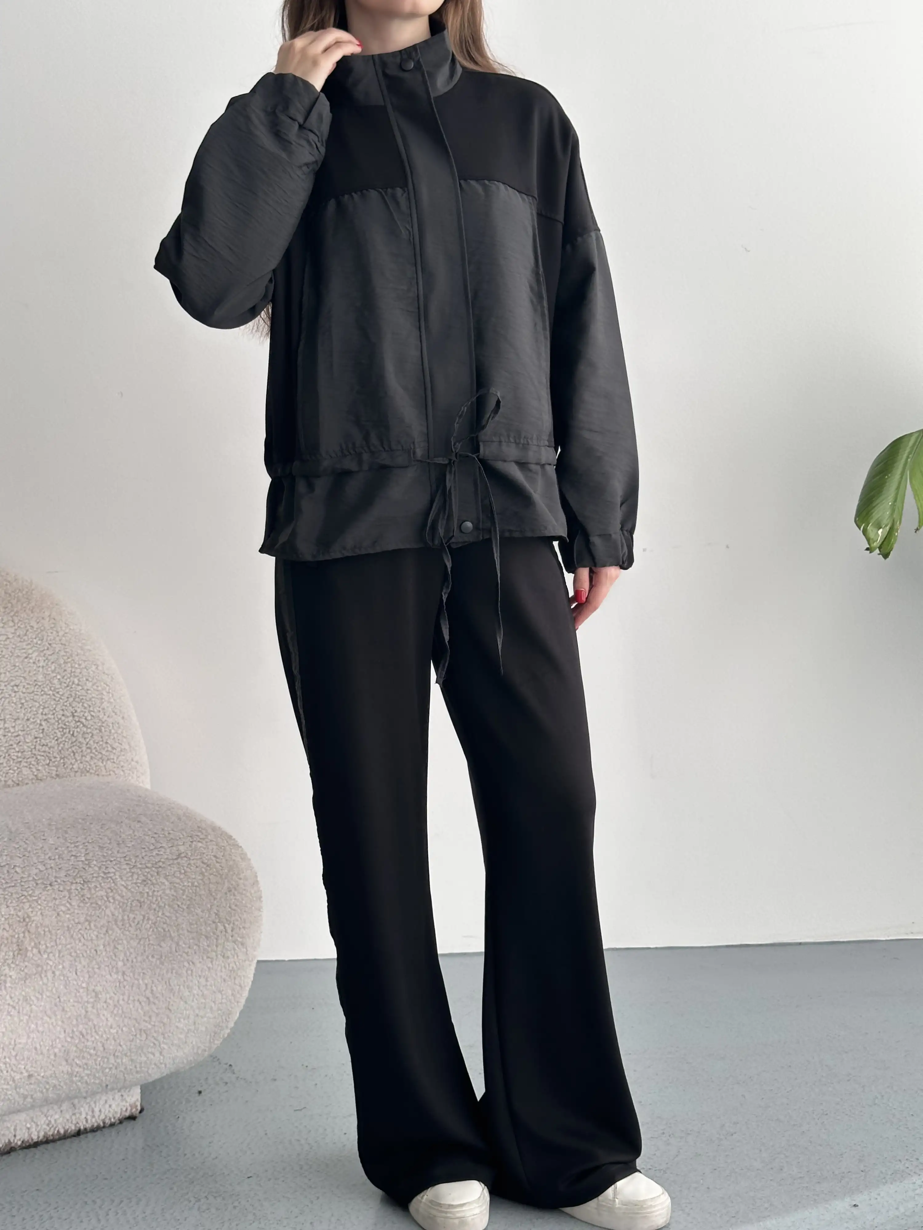 DİK YAKA FERMUARLI PARAŞÜT MODAL TAKIM-SİYAH