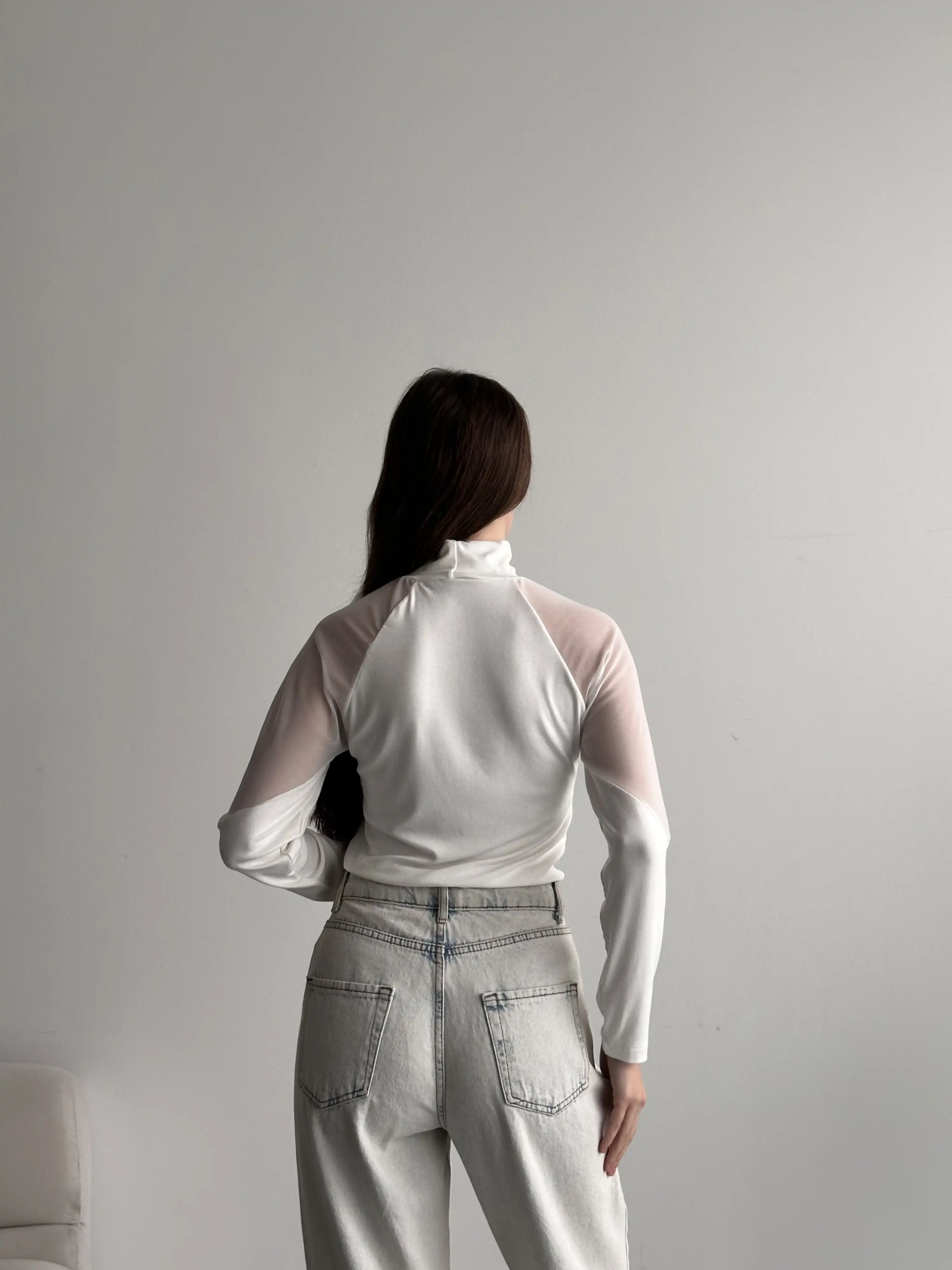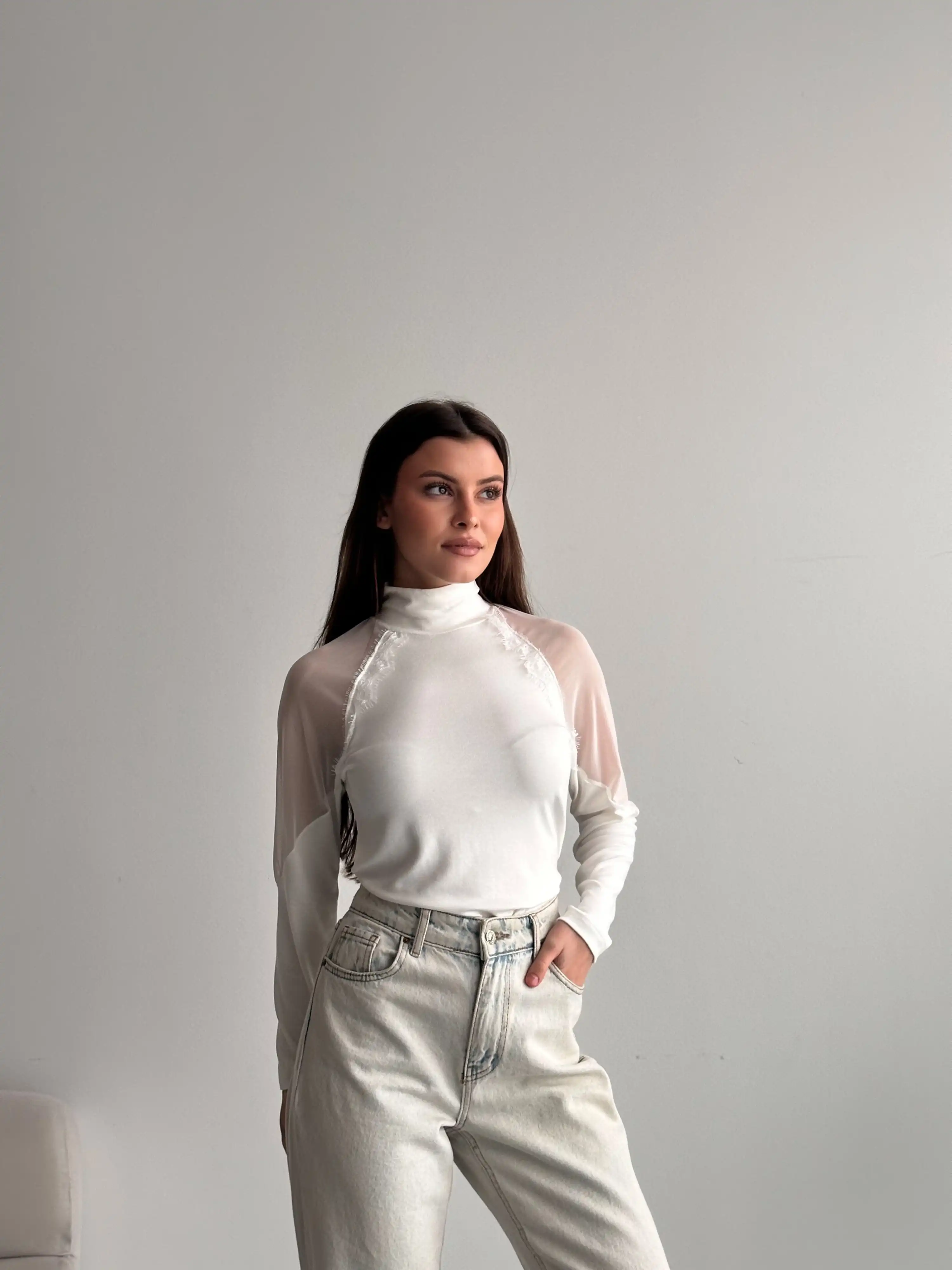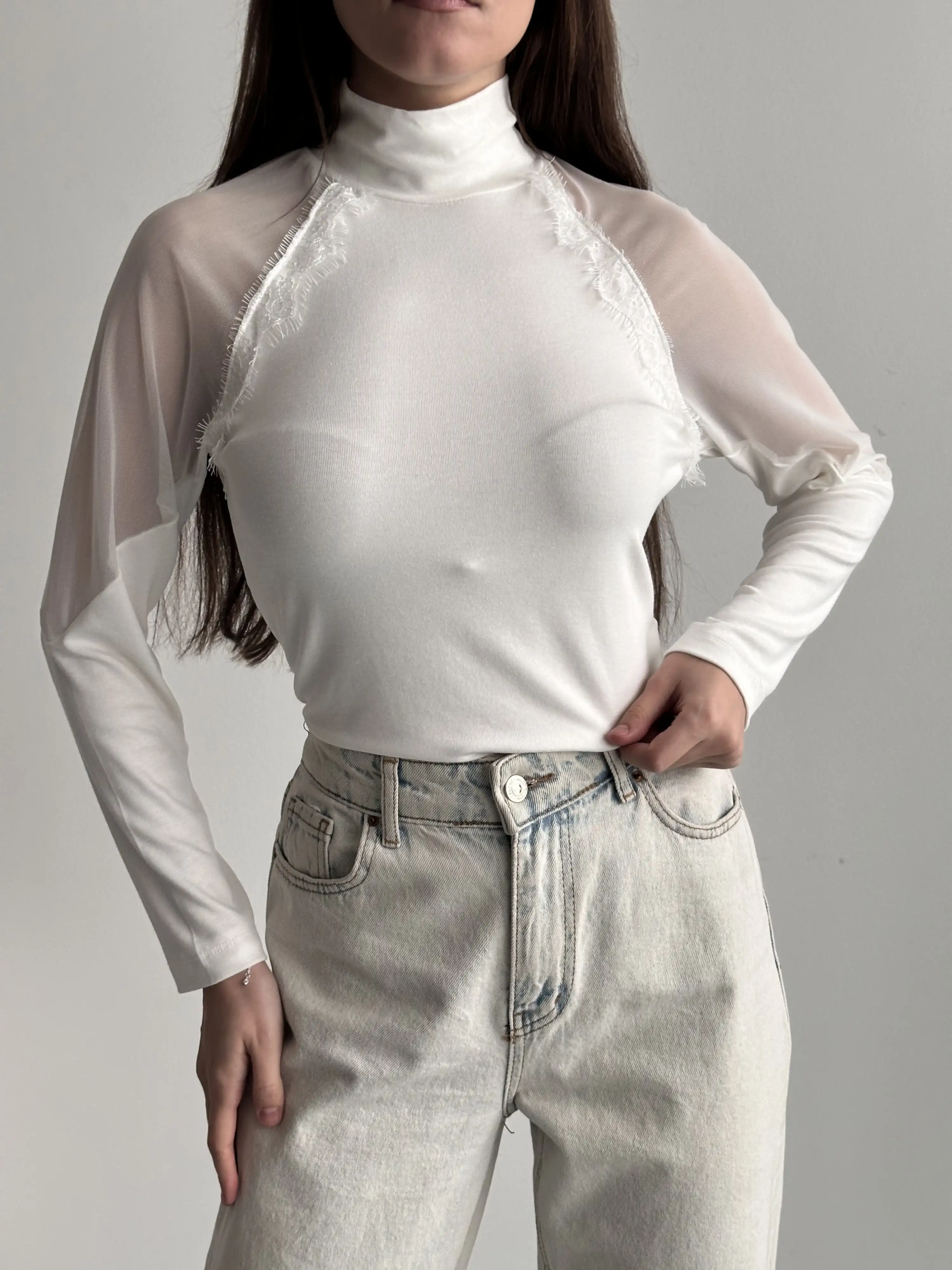 DİK YAKA TÜL DETAYLI BLUZ-BEYAZ
