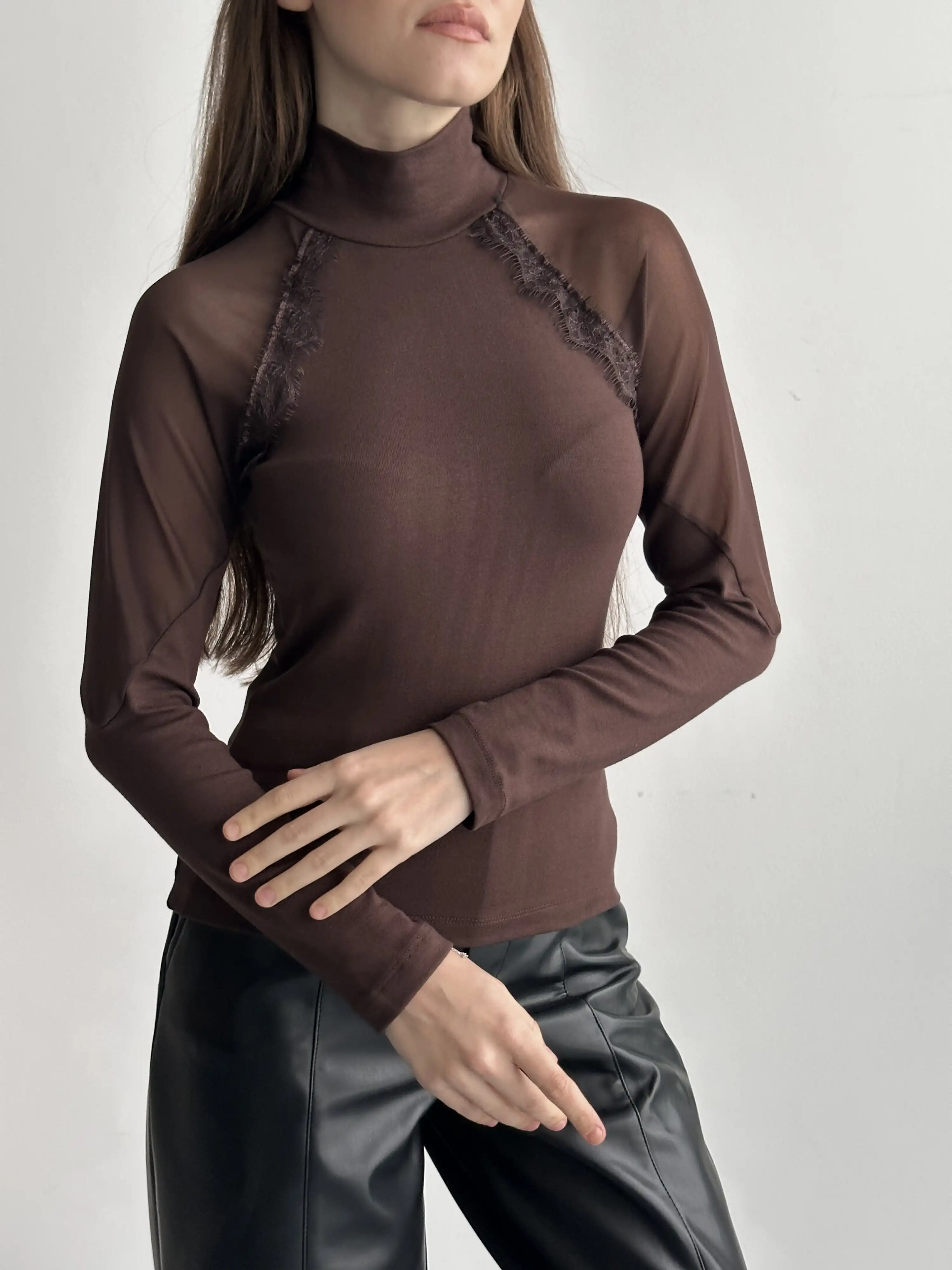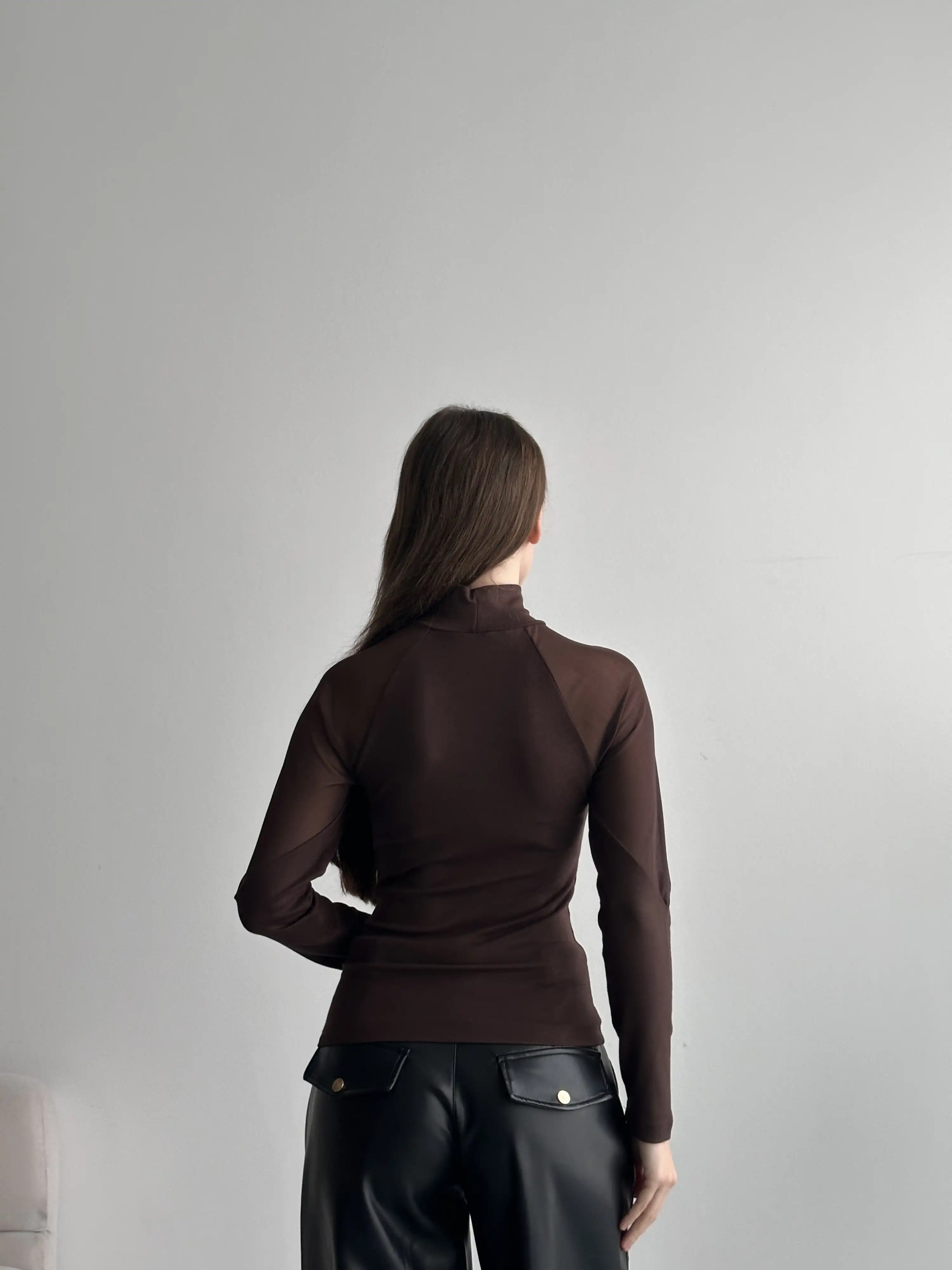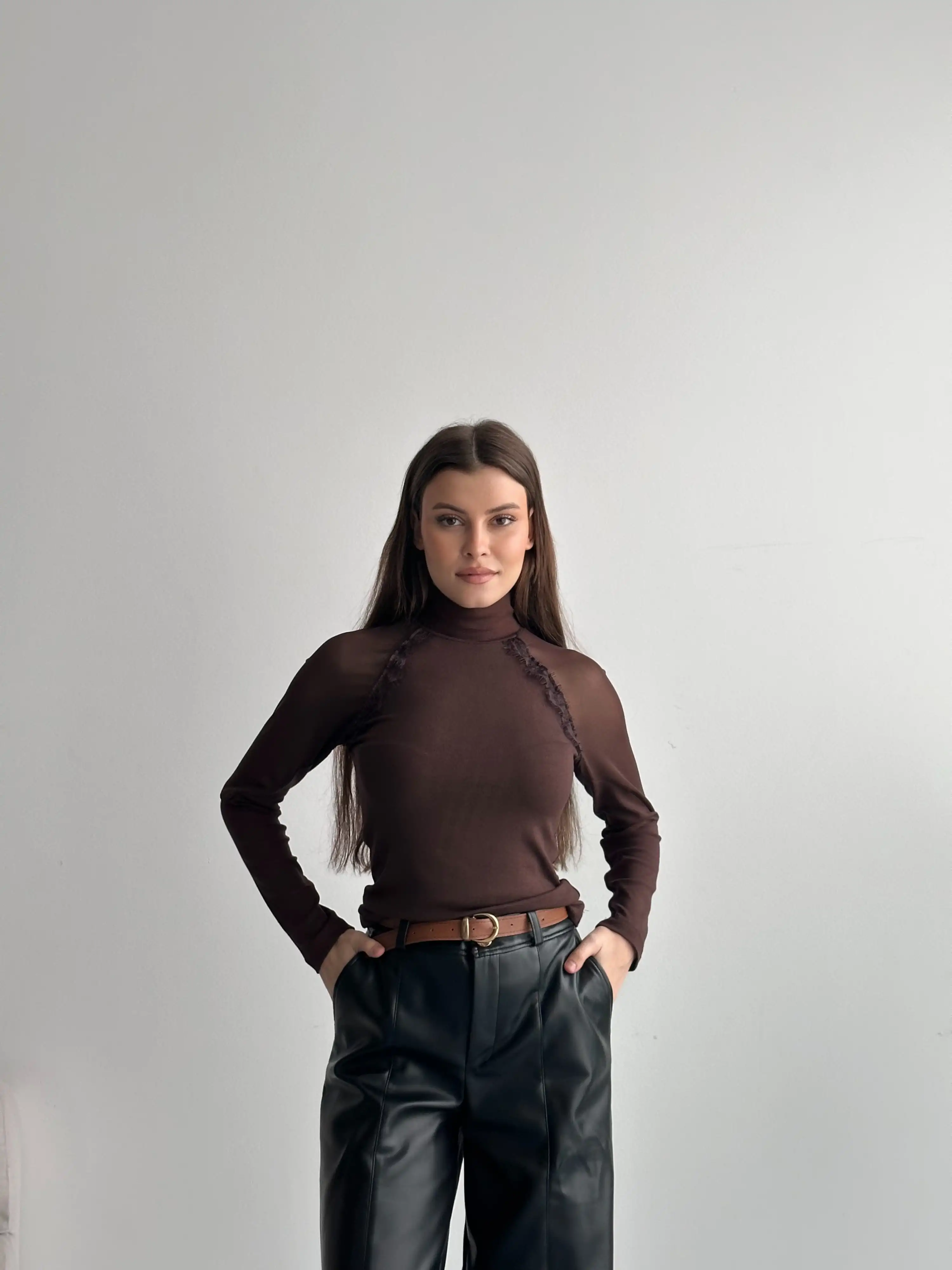 DİK YAKA TÜL DETAYLI BLUZ-KAHVE