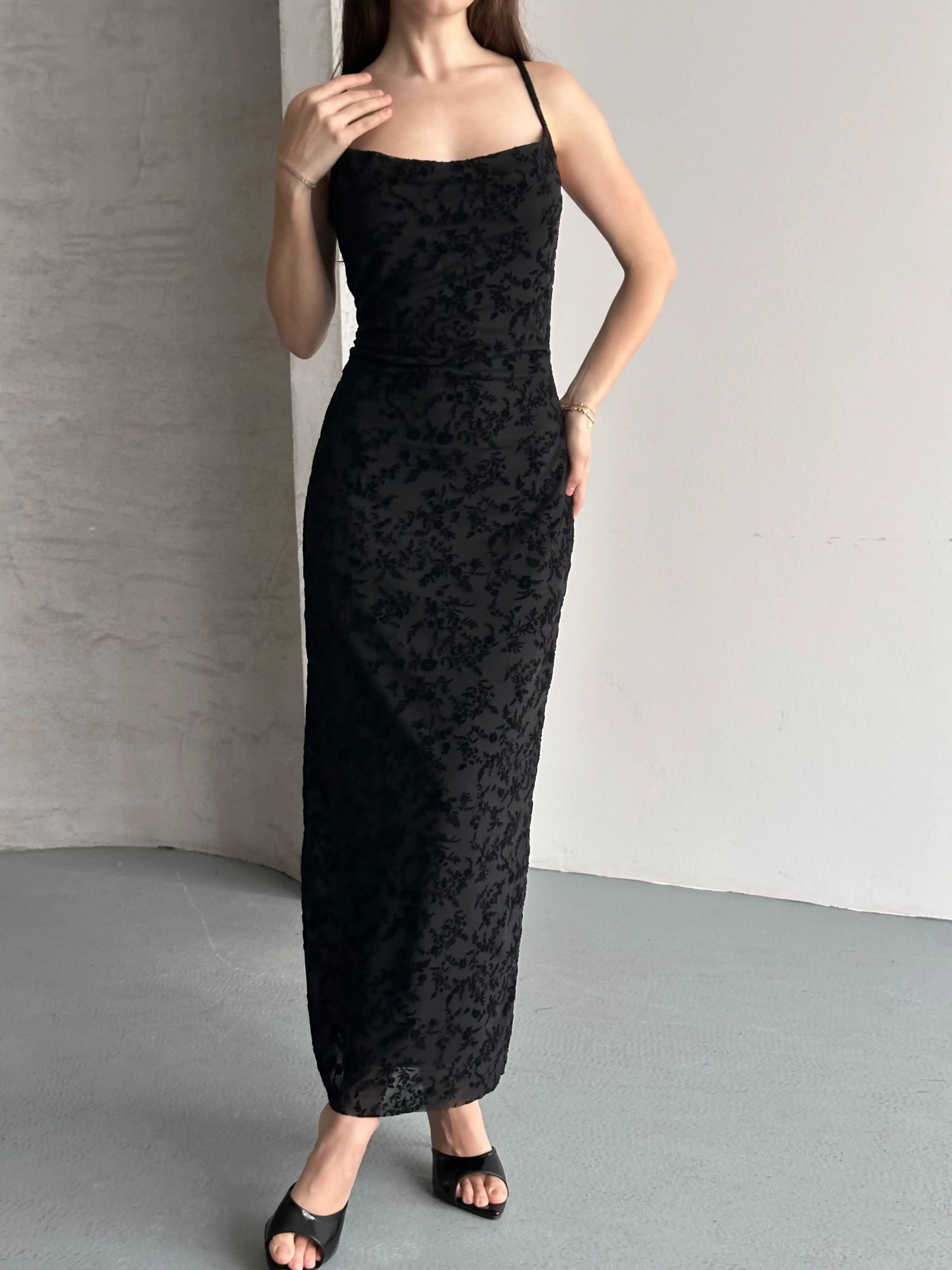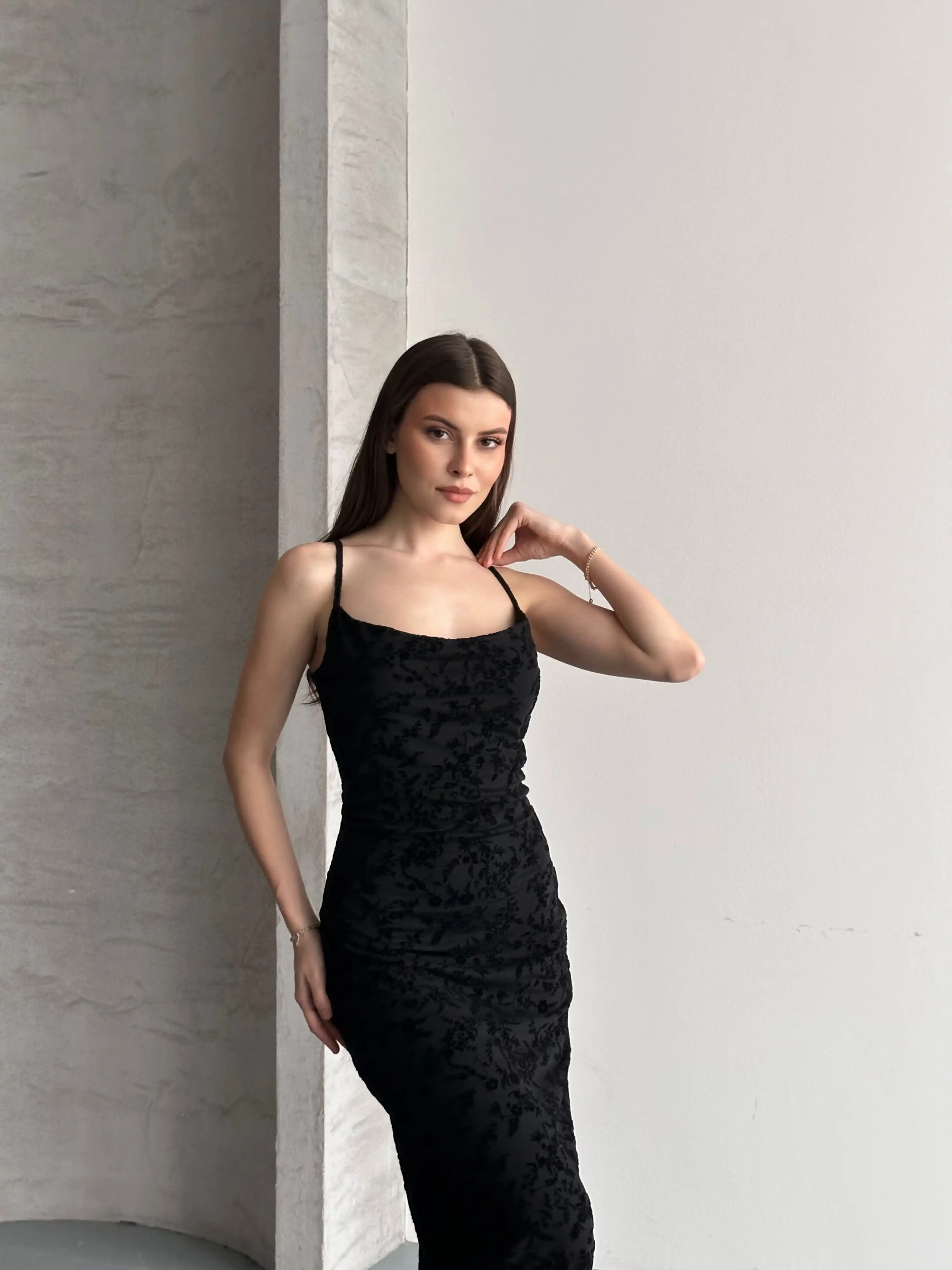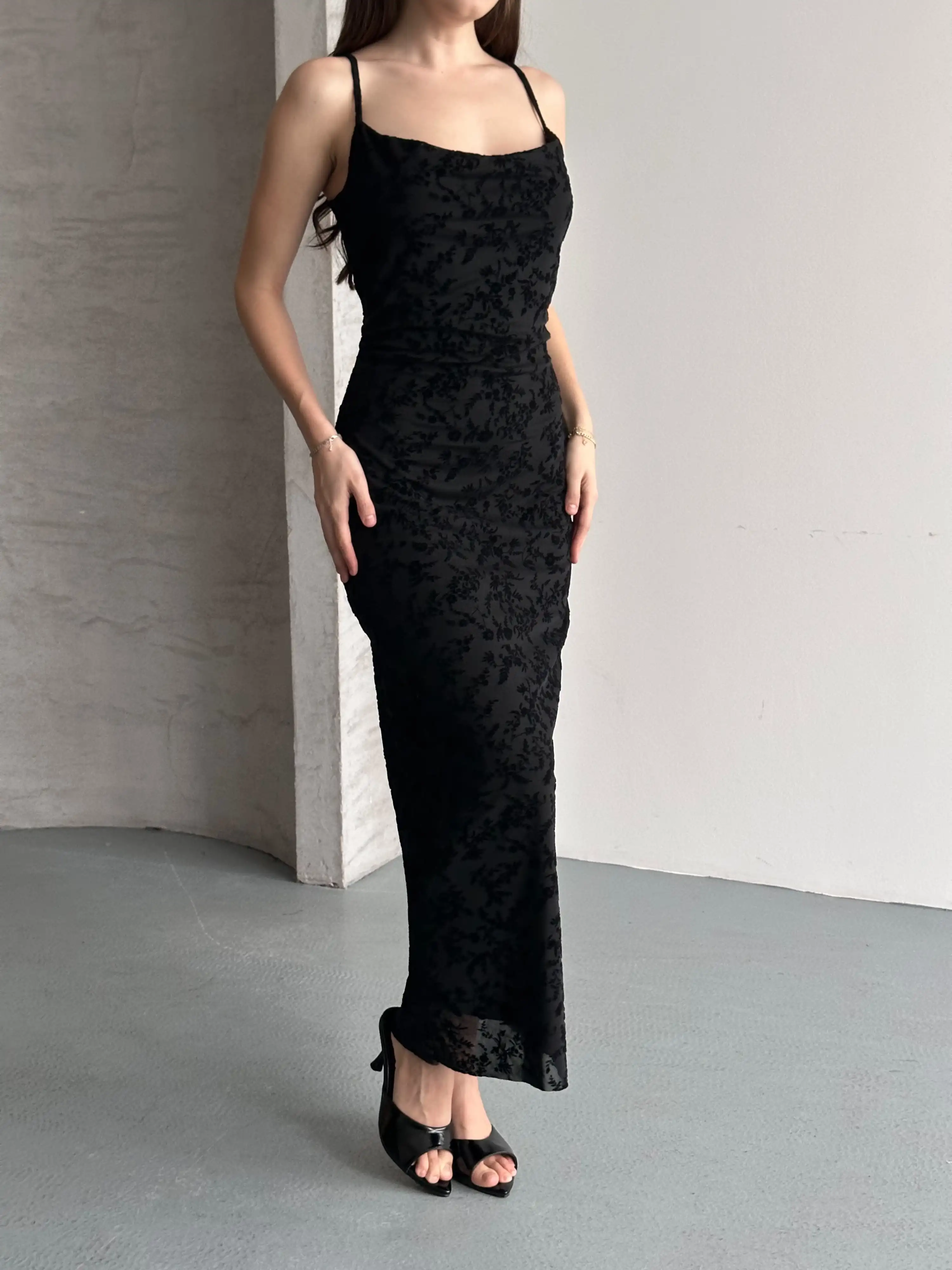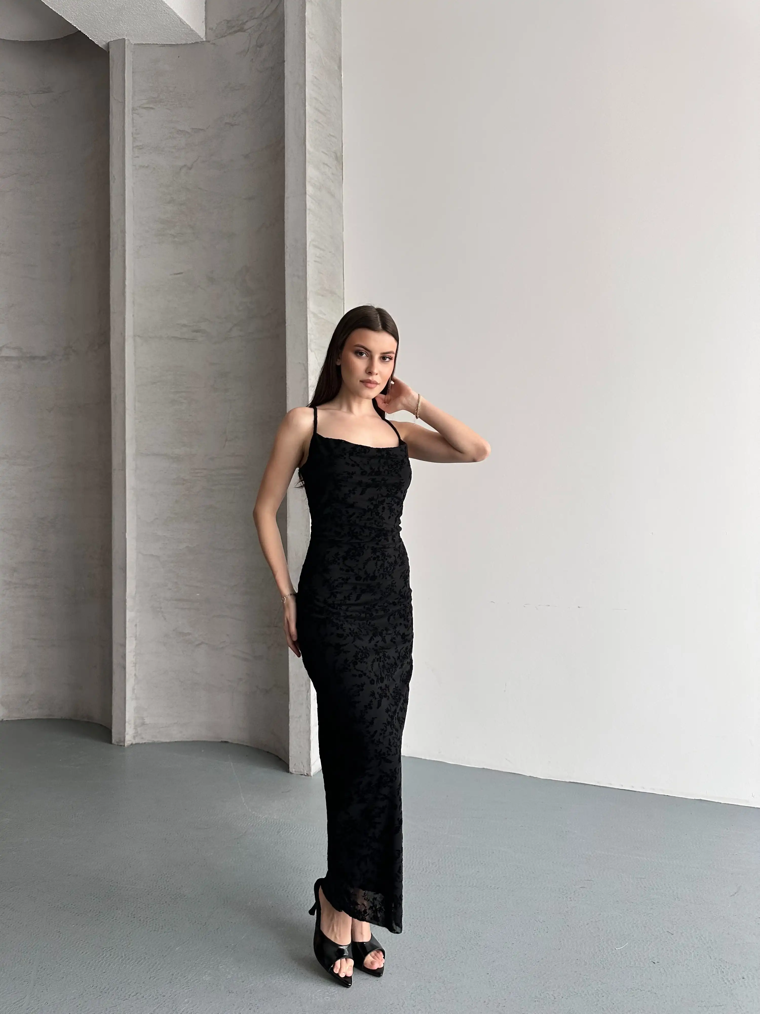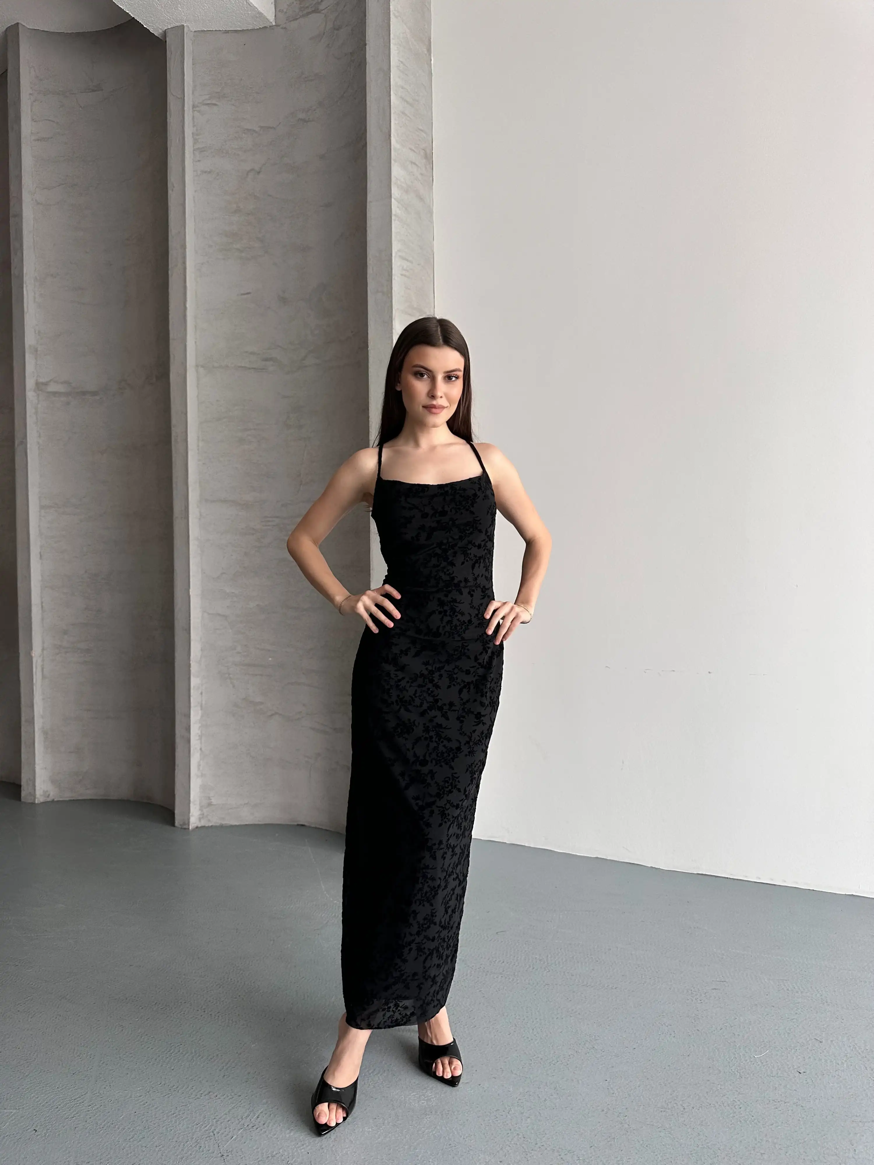 FLOR DESENLİ ASKILI TÜL ELBİSE-SİYAH