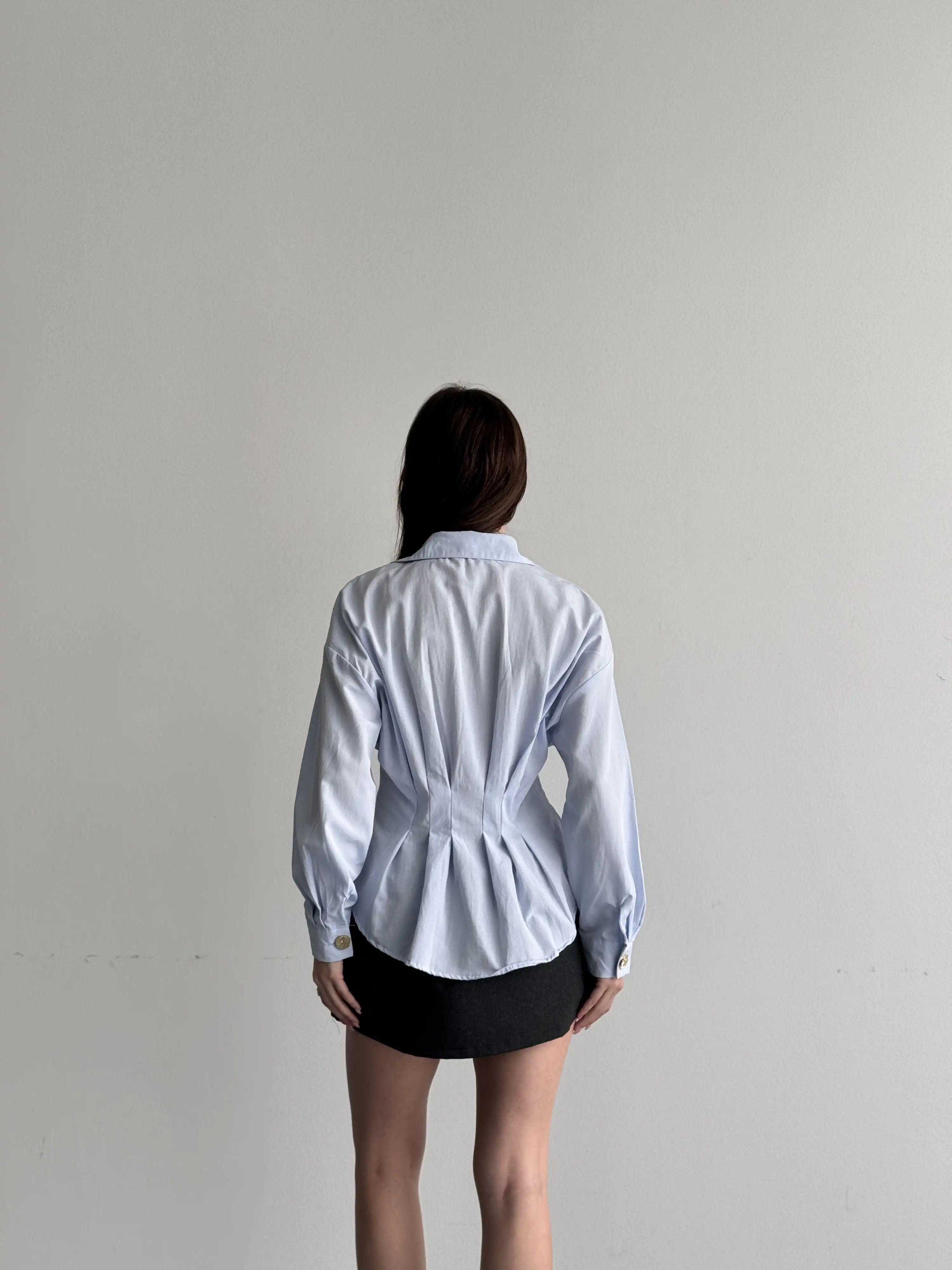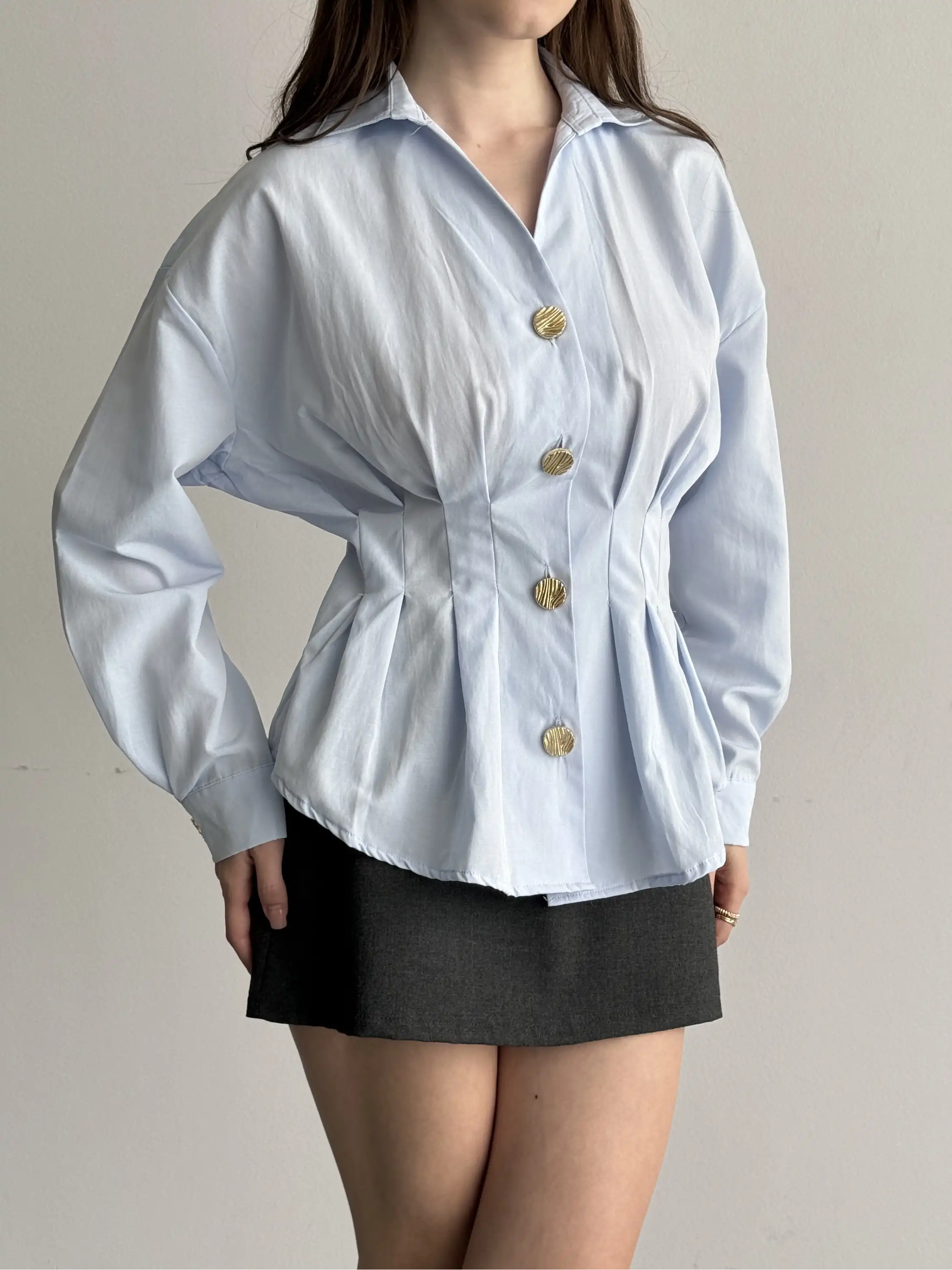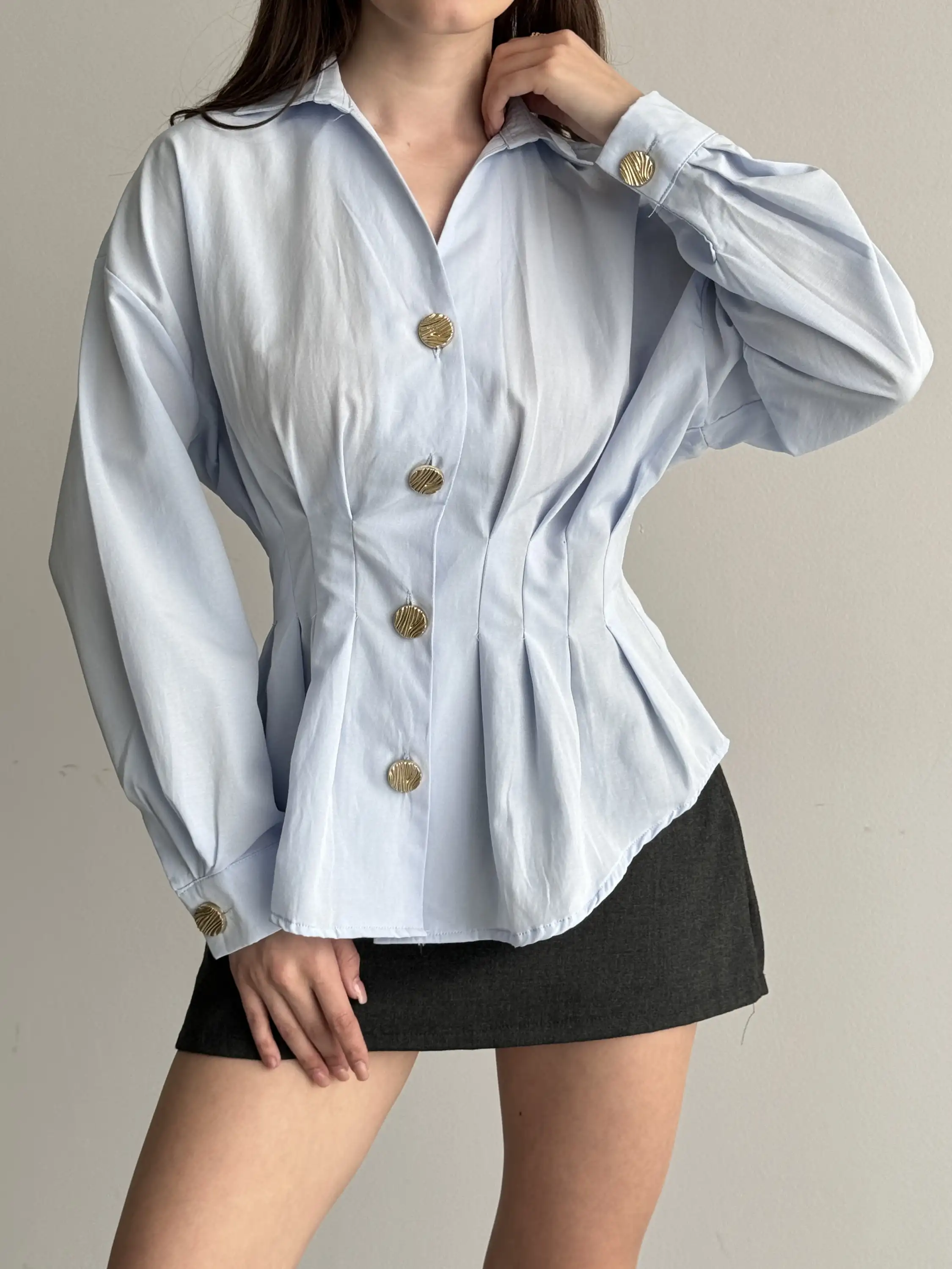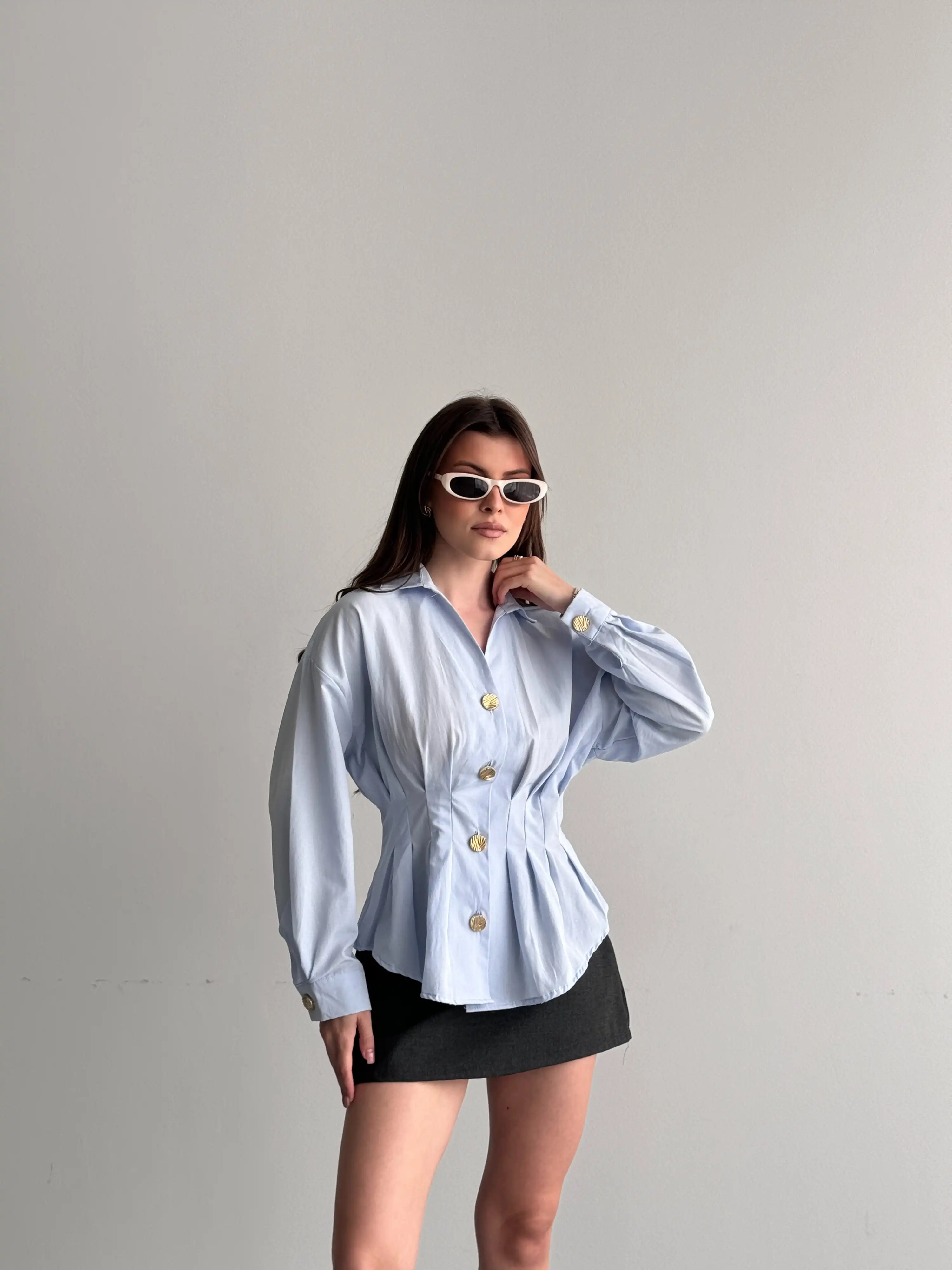 GOLD DÜĞME DETAYLI BELDEN OTURTMALI GÖMLEK-MAVİ