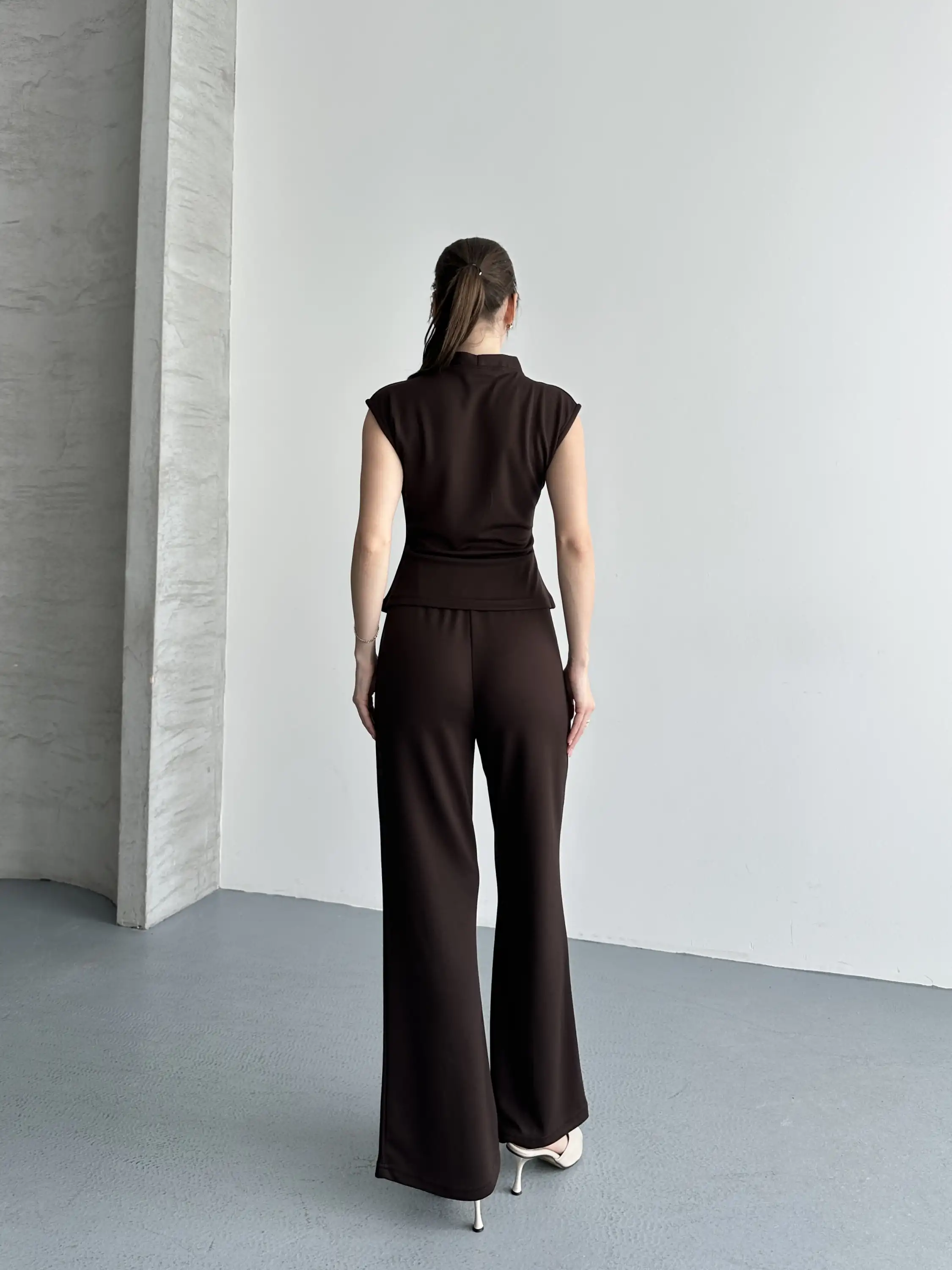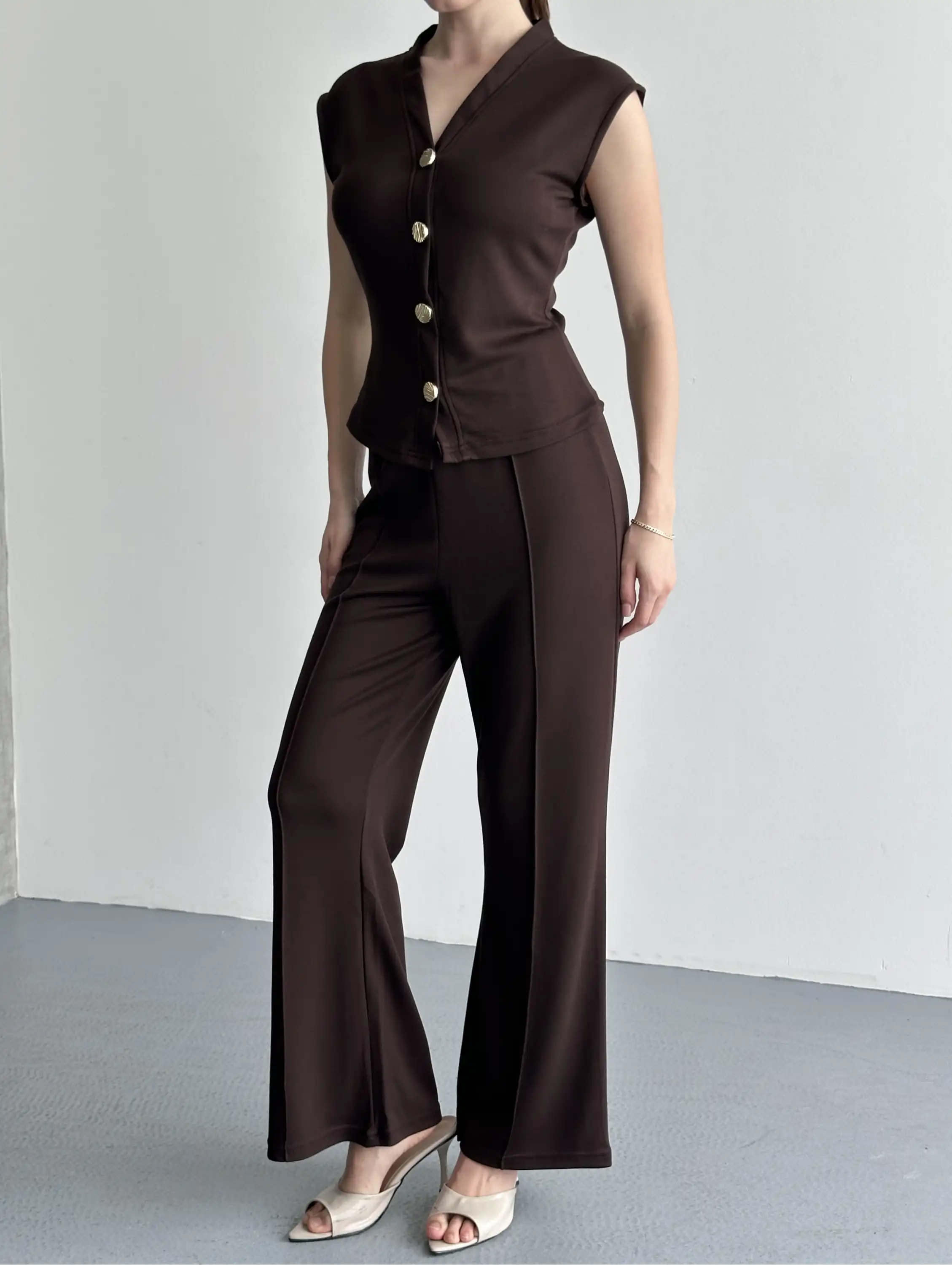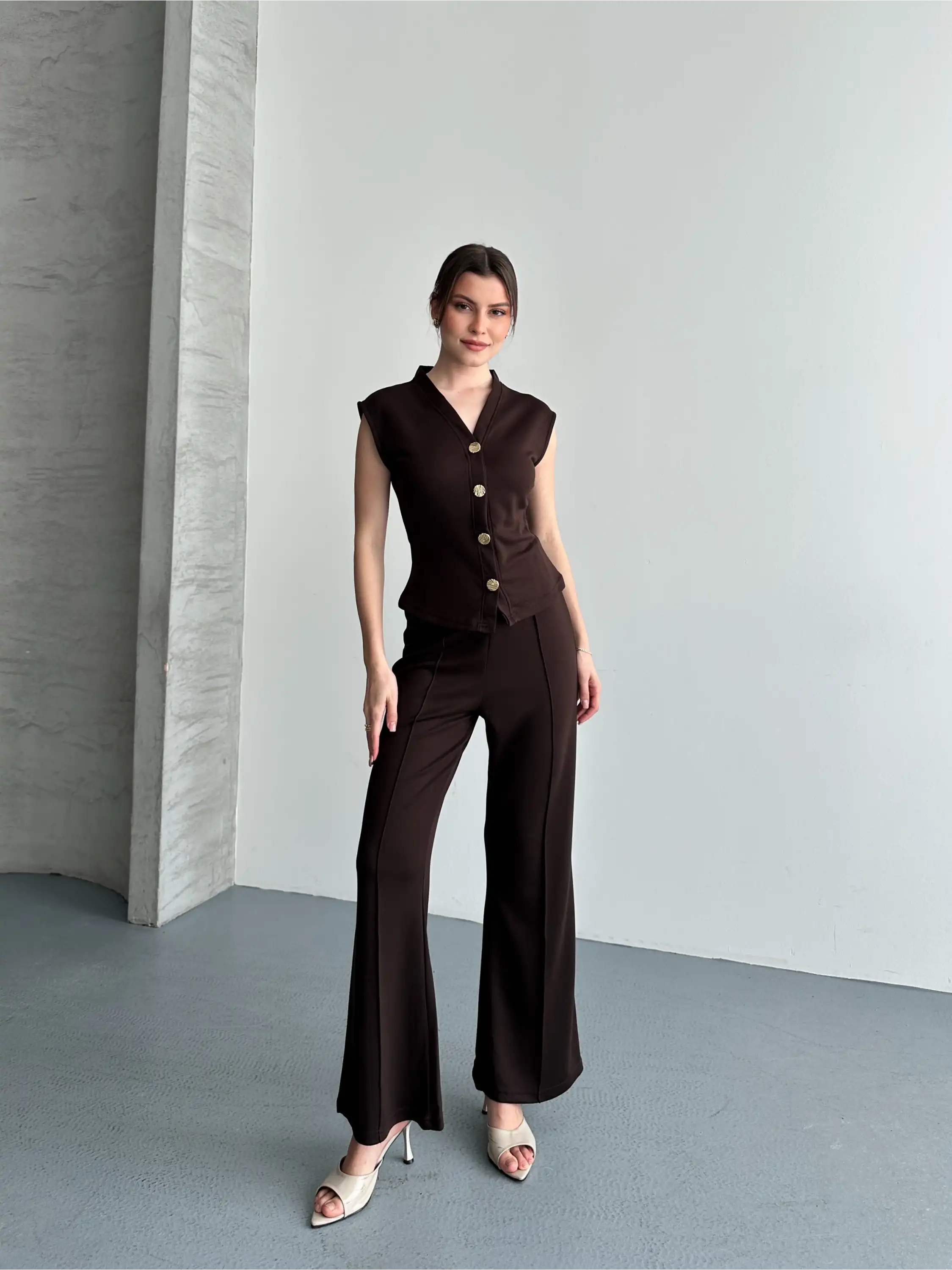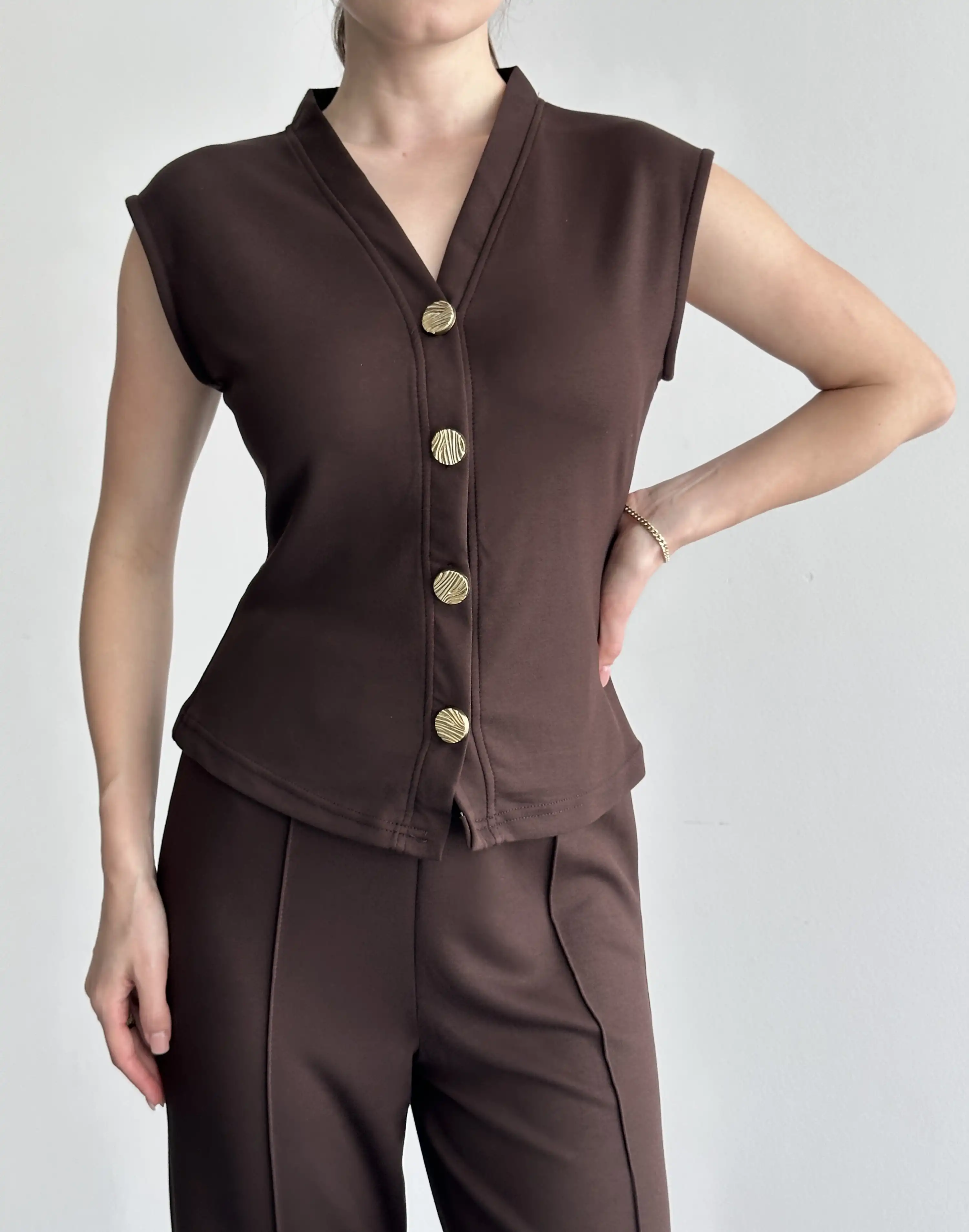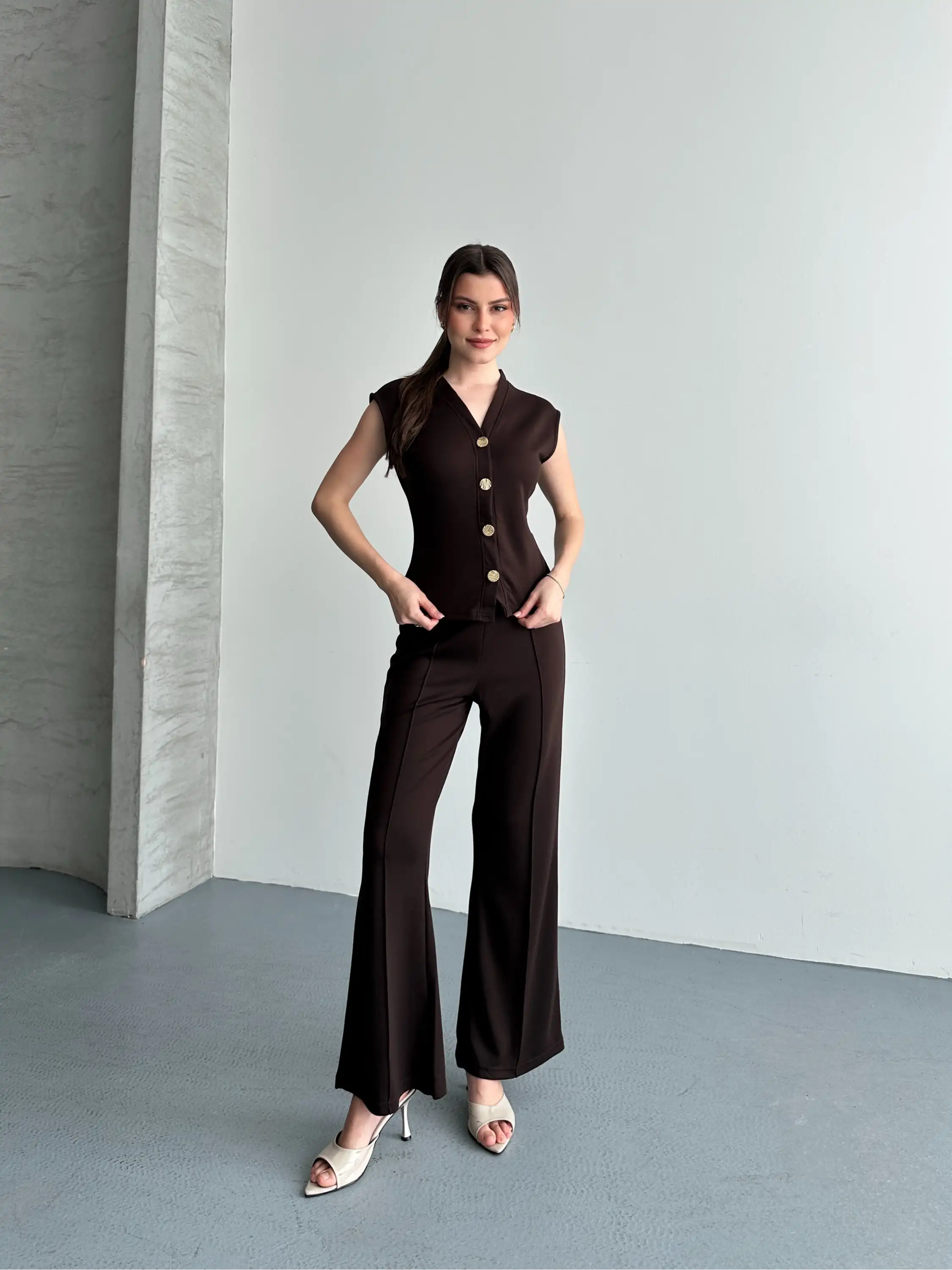 GOLD DÜĞME DETAYLI YELEKLİ TAKIM-KAHVE