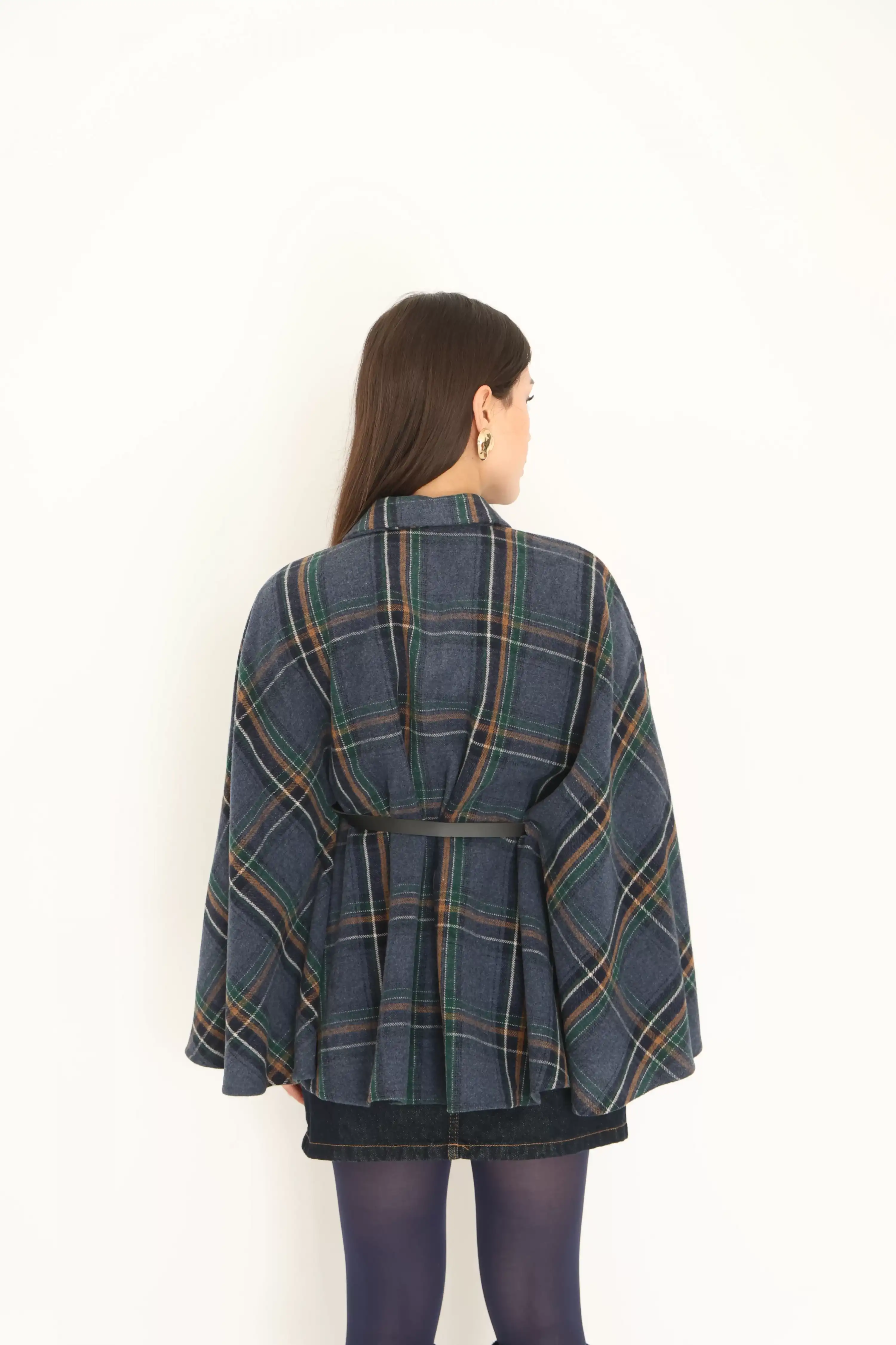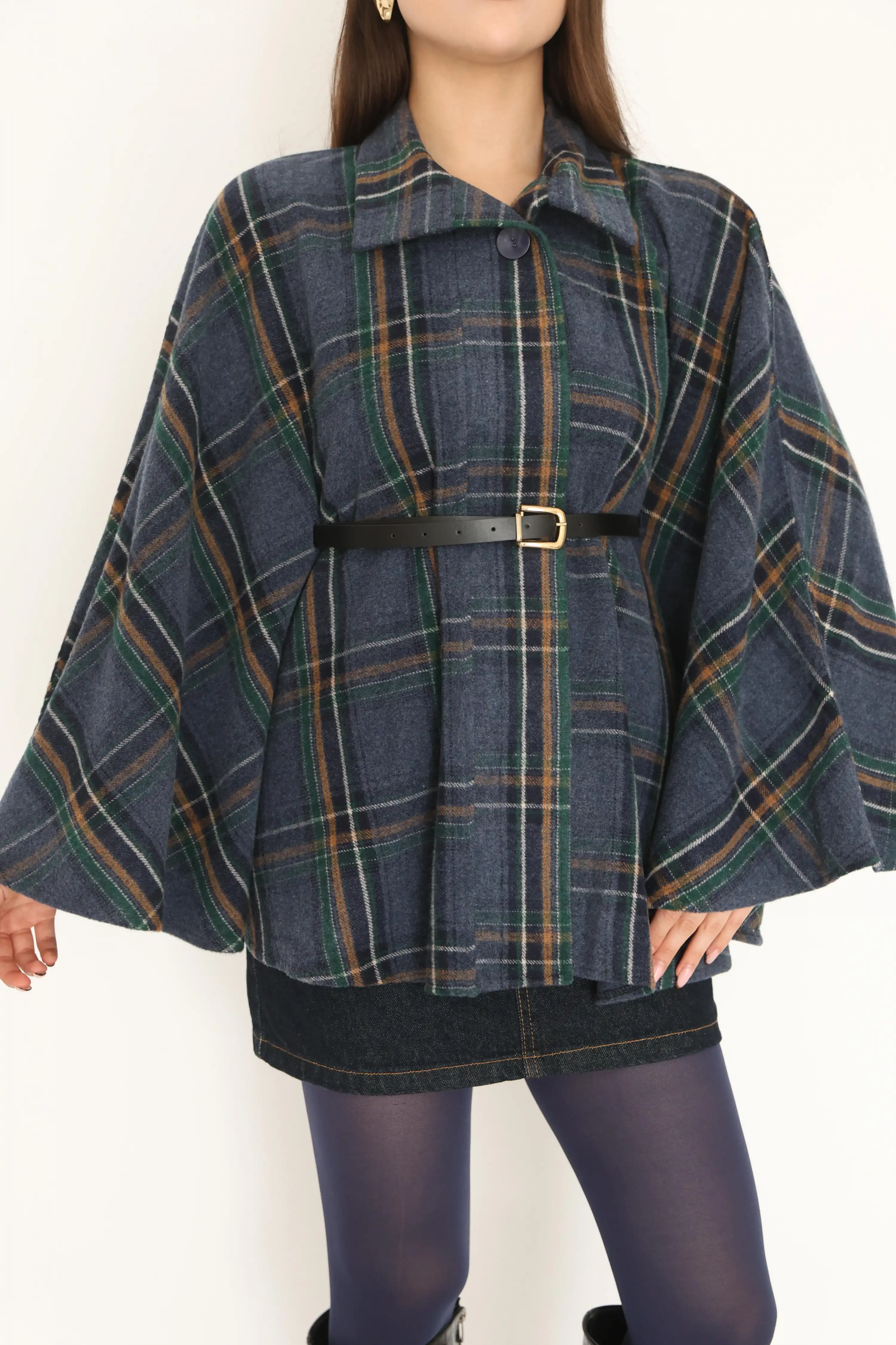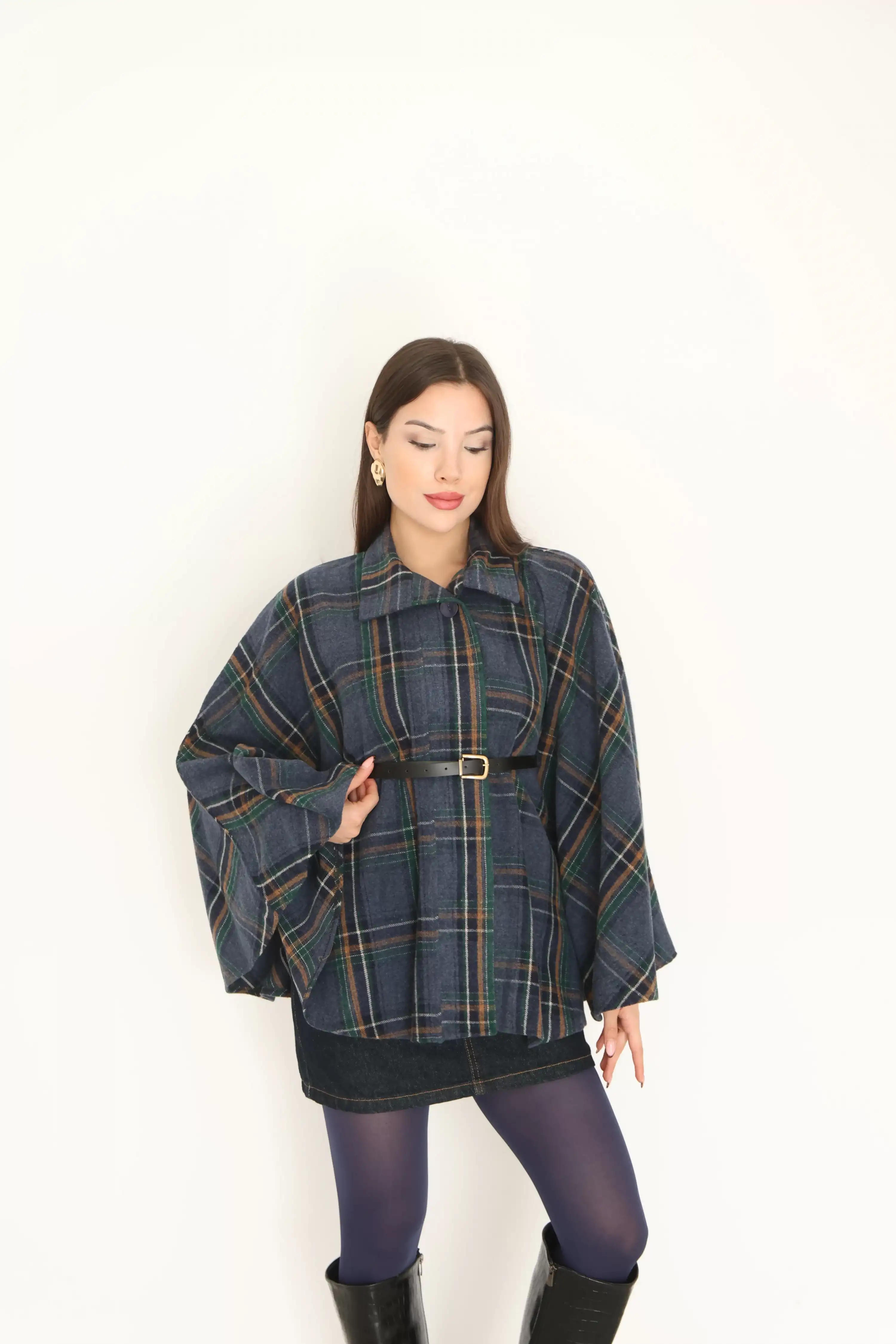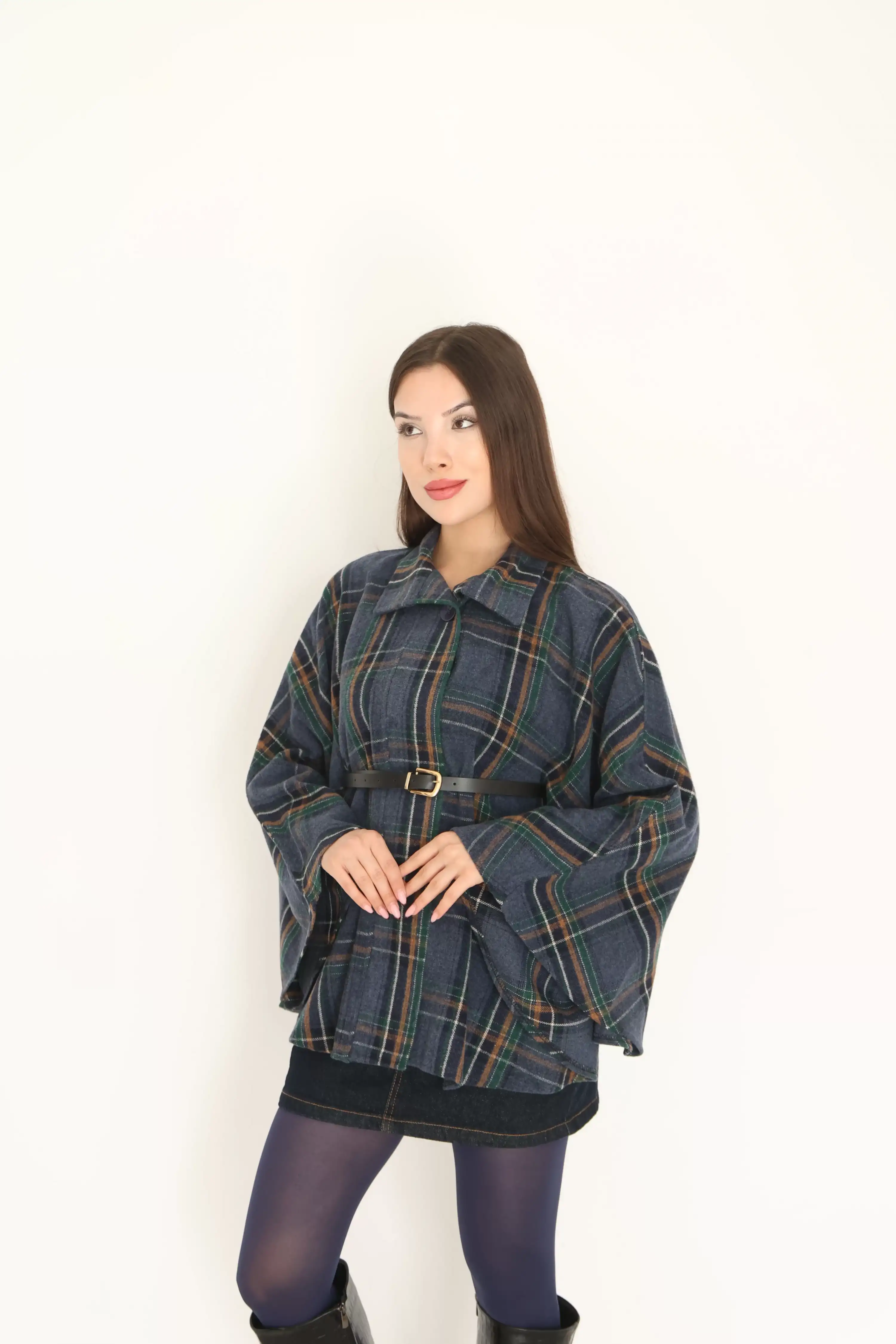 HAKİM YAKA KEMER DETAYLI KAŞE PANÇO-LACİVERT