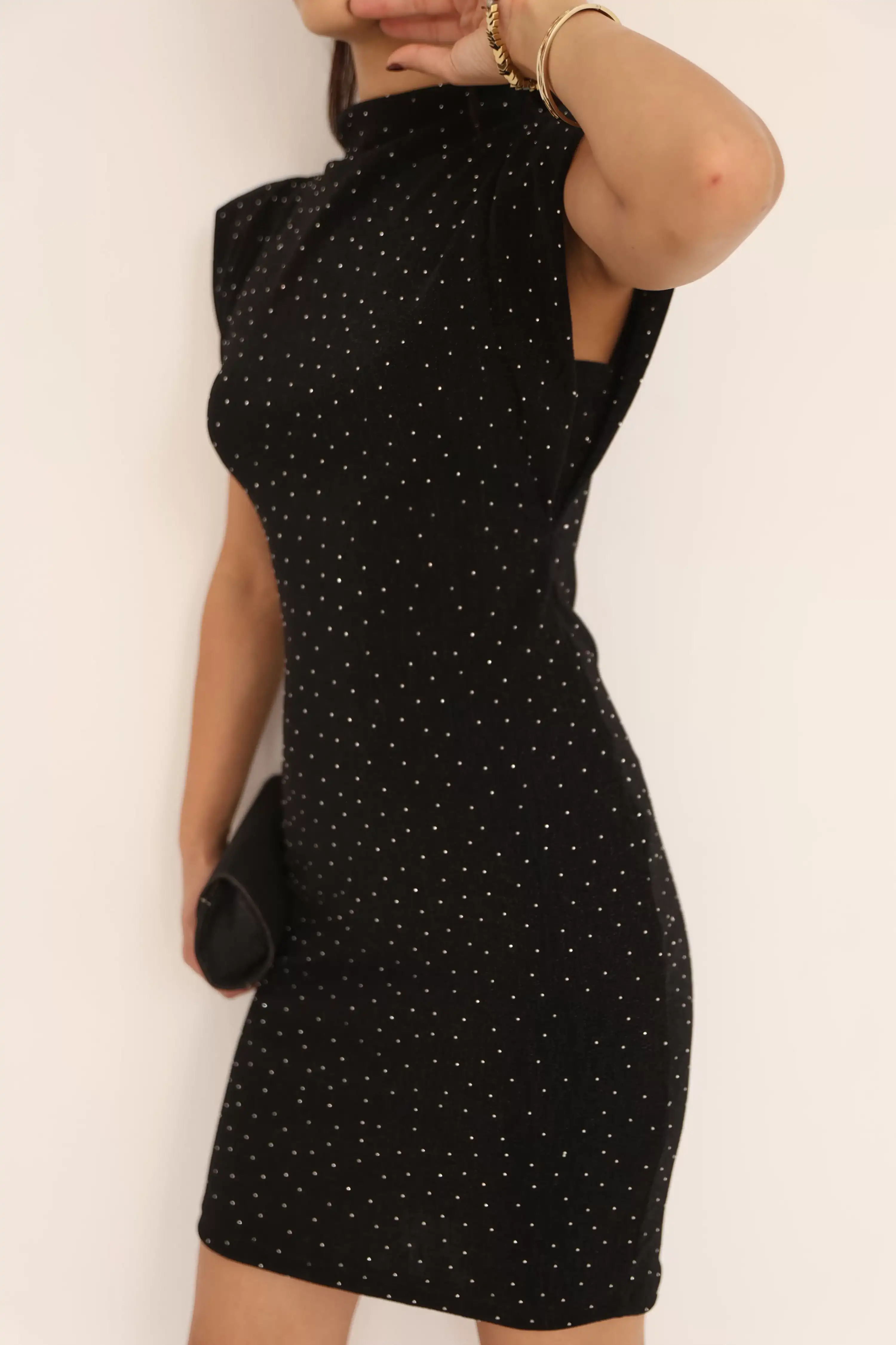 IŞILTI DETAYLI DİK YAKA ELBİSE
