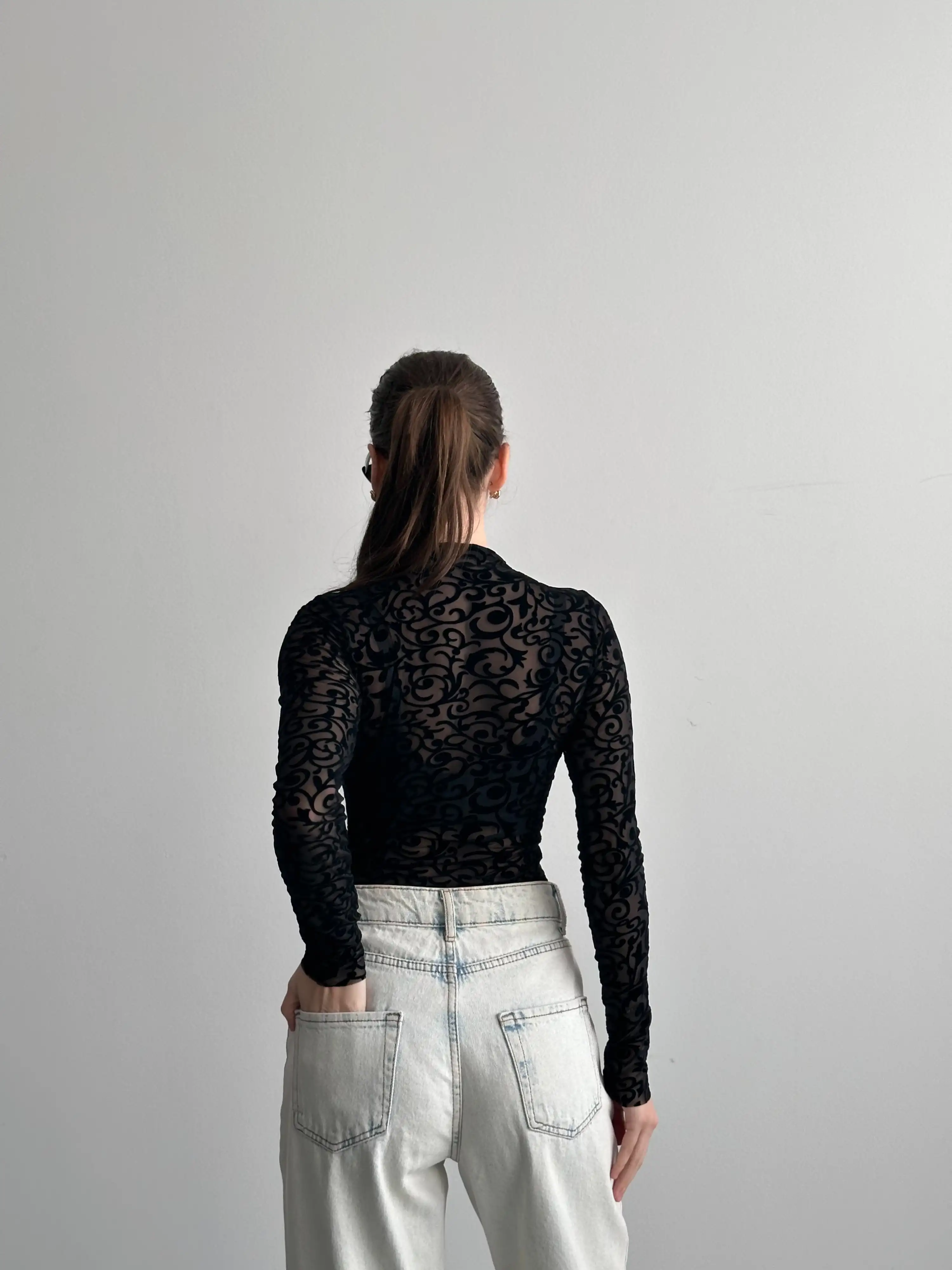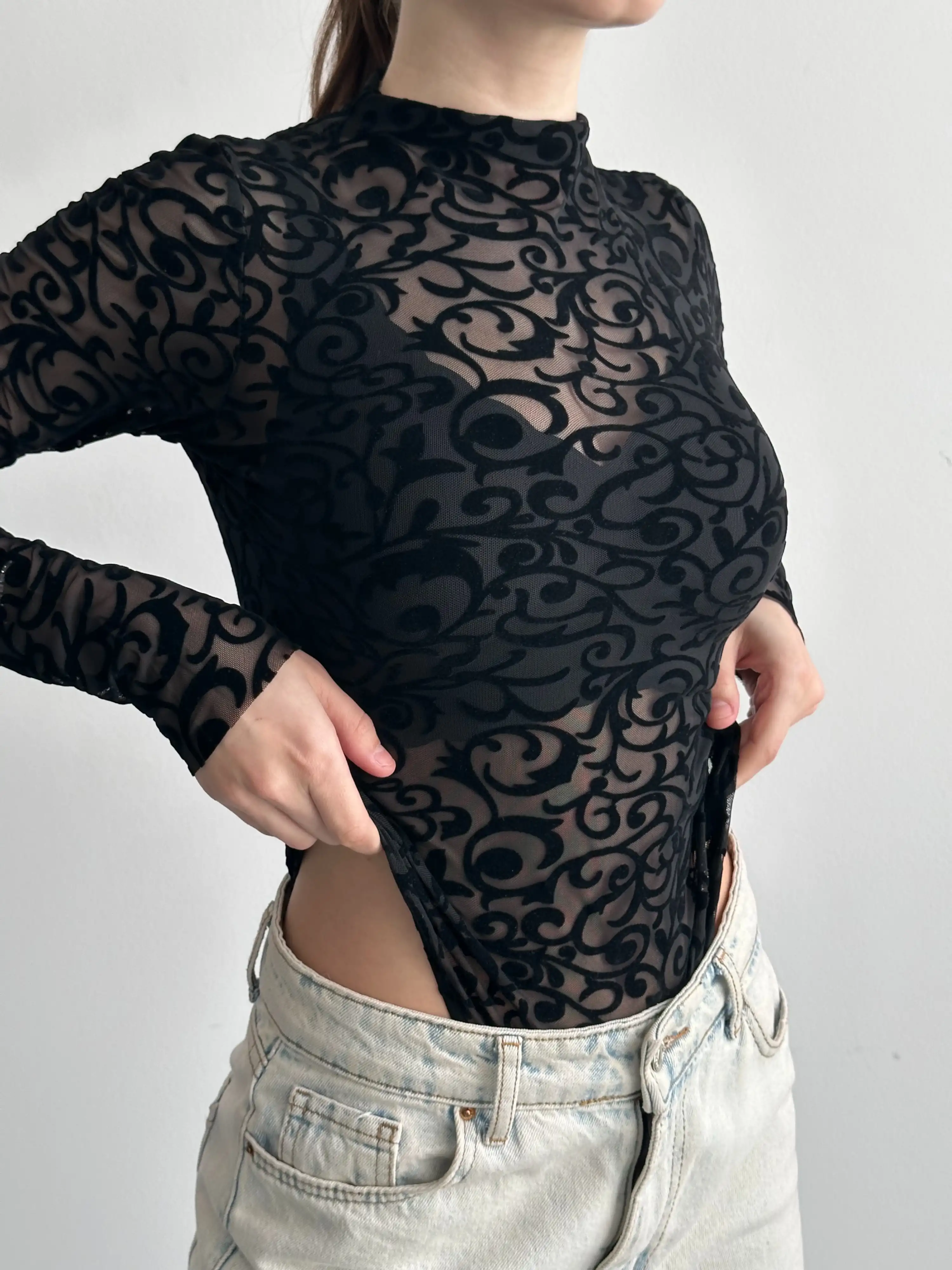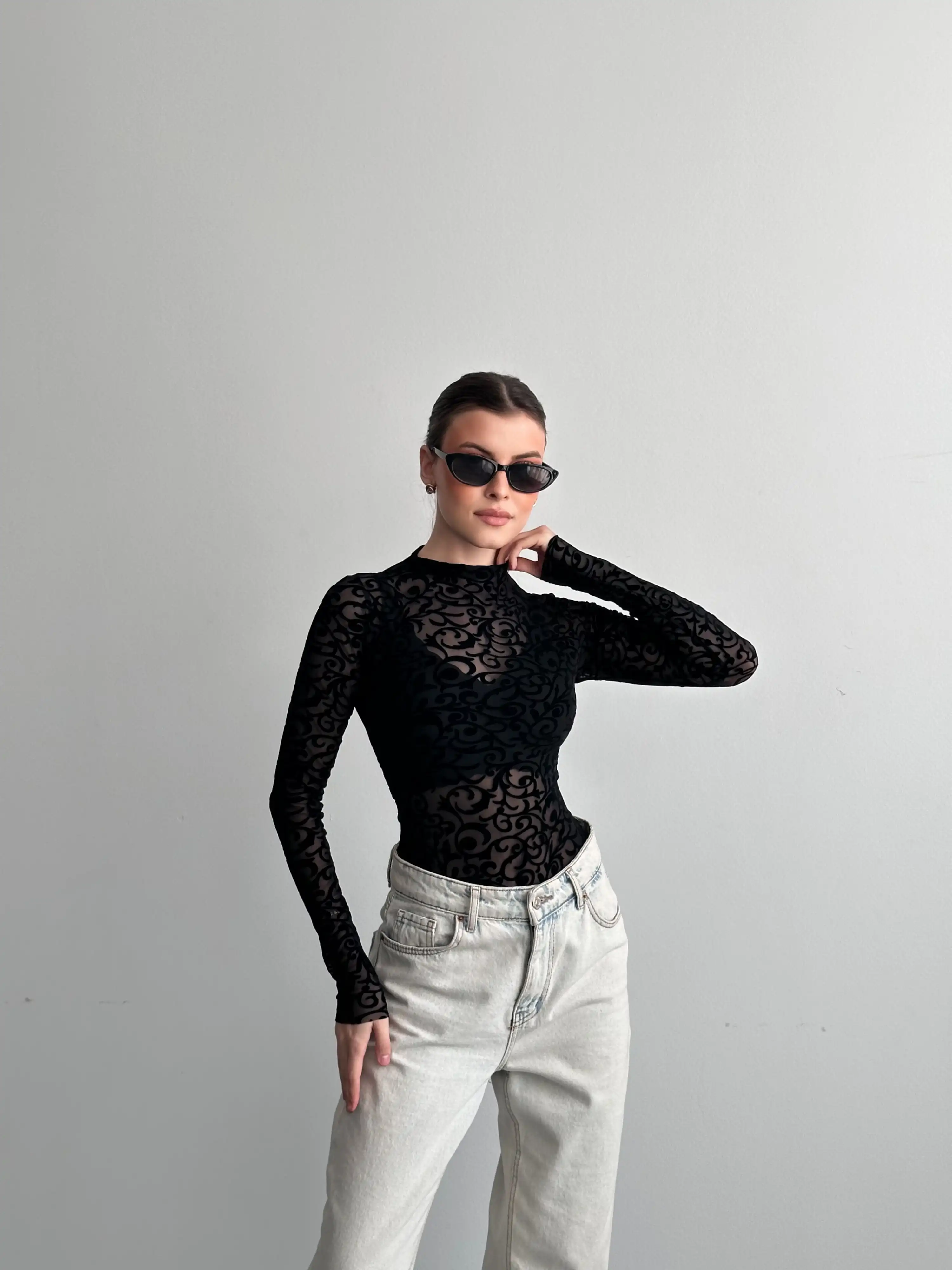 KABARTMA DESENLİ BODYSUIT-SİYAH