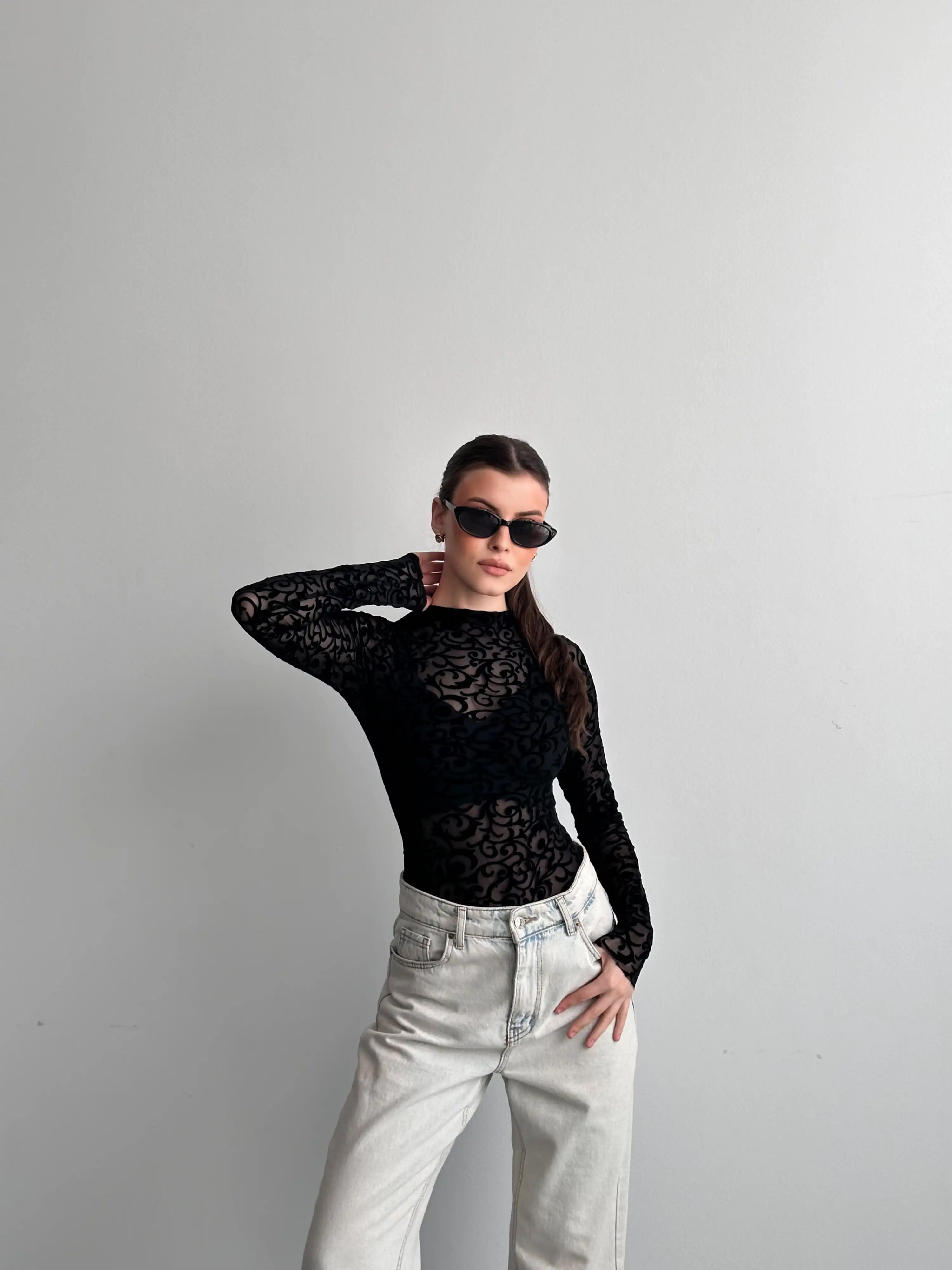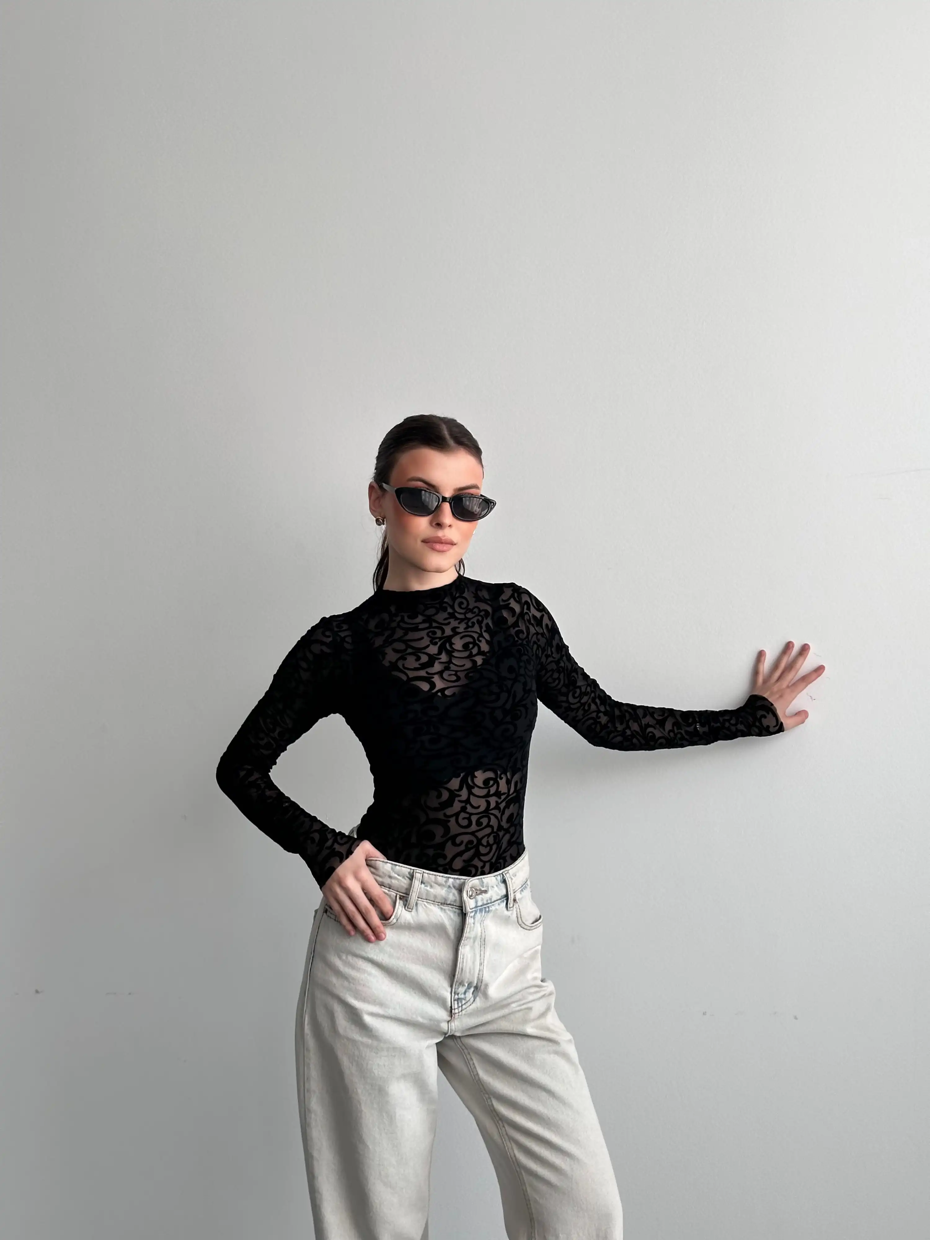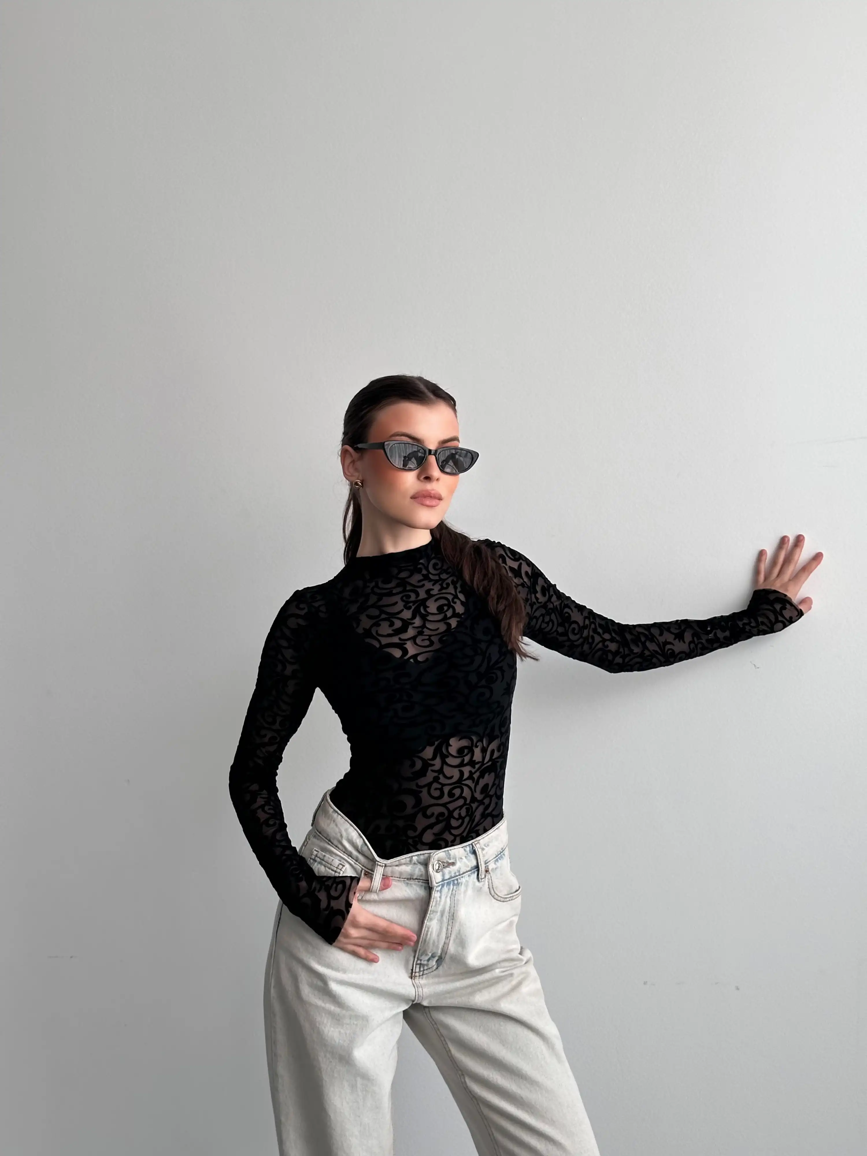 KABARTMA DESENLİ BODYSUIT-SİYAH