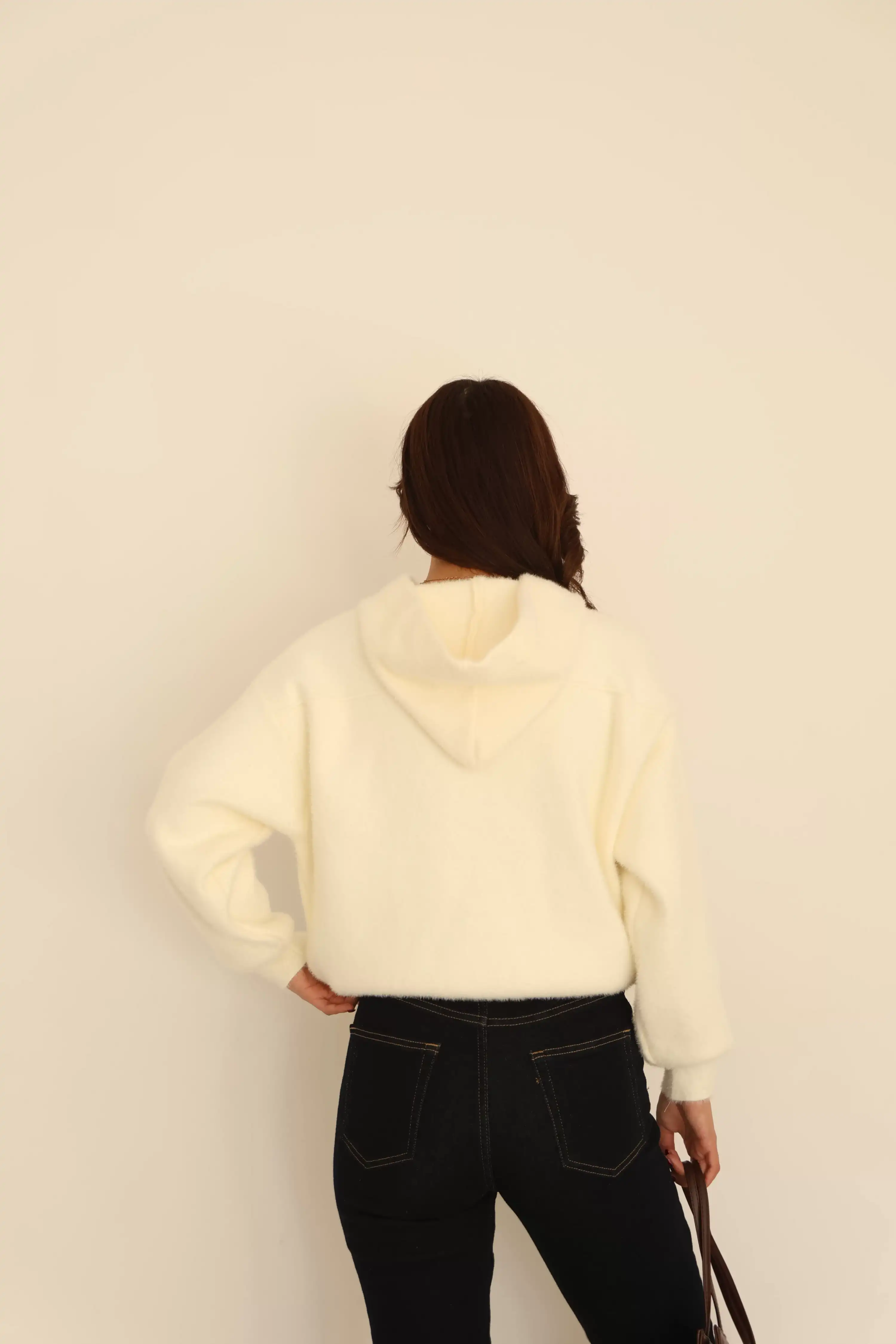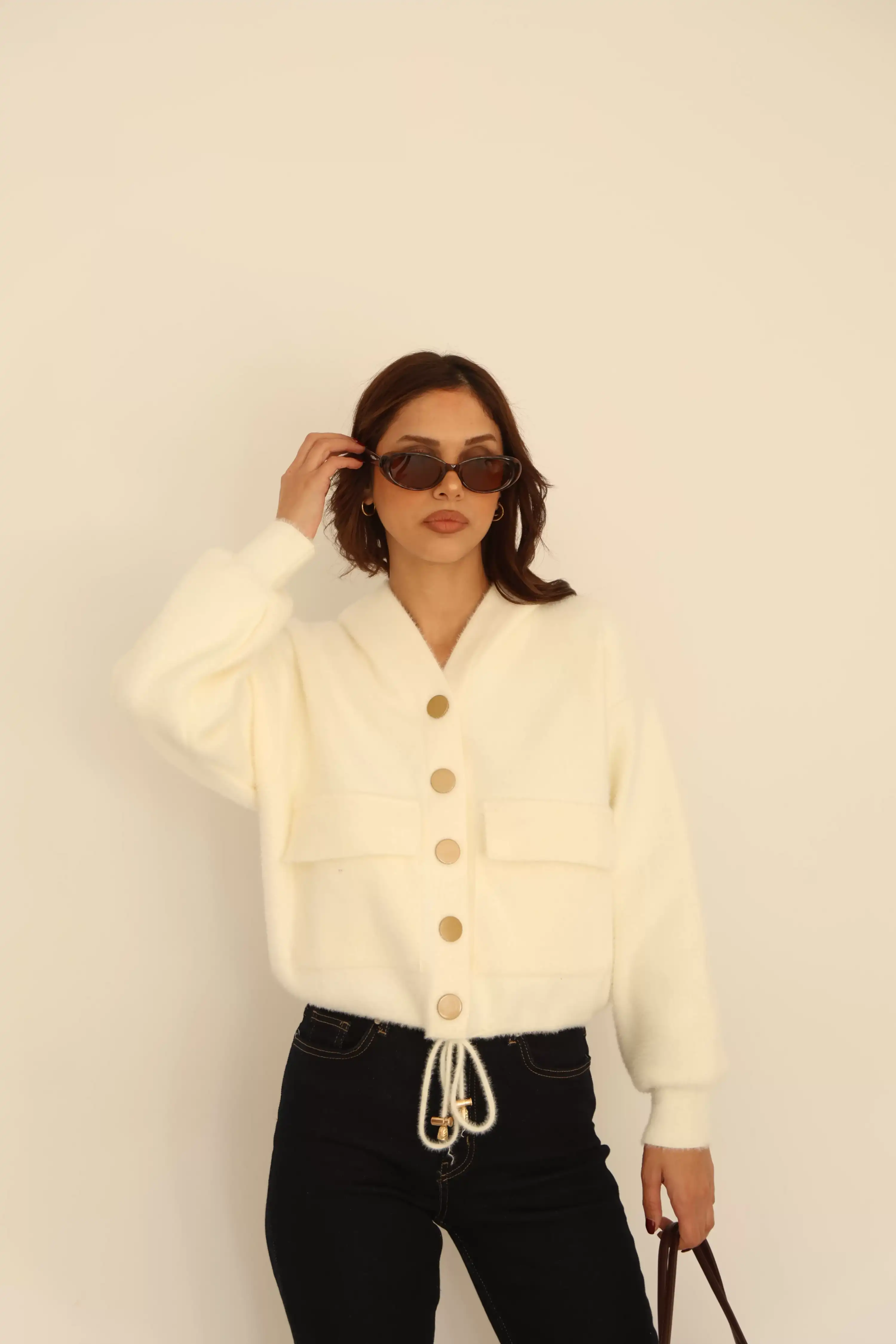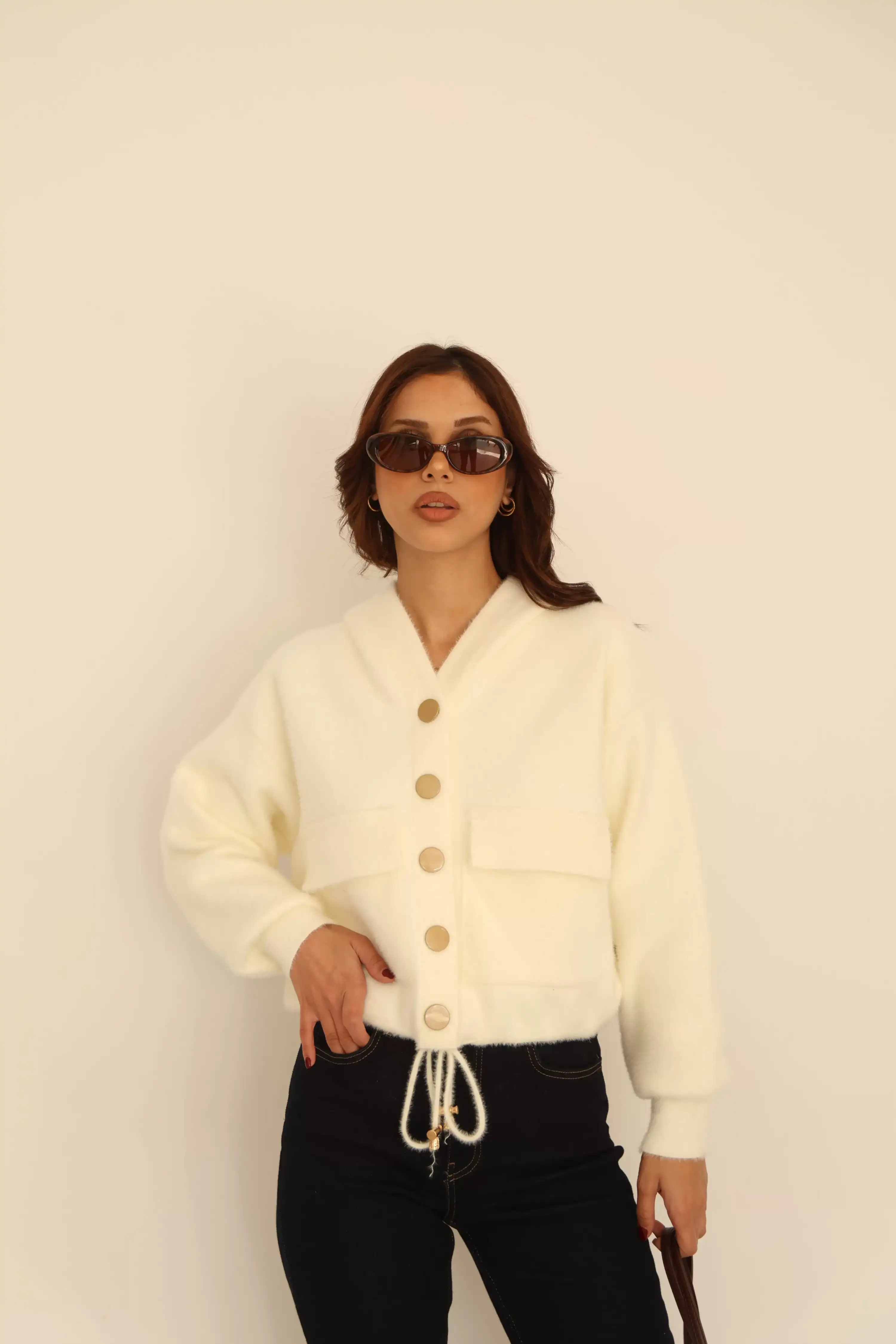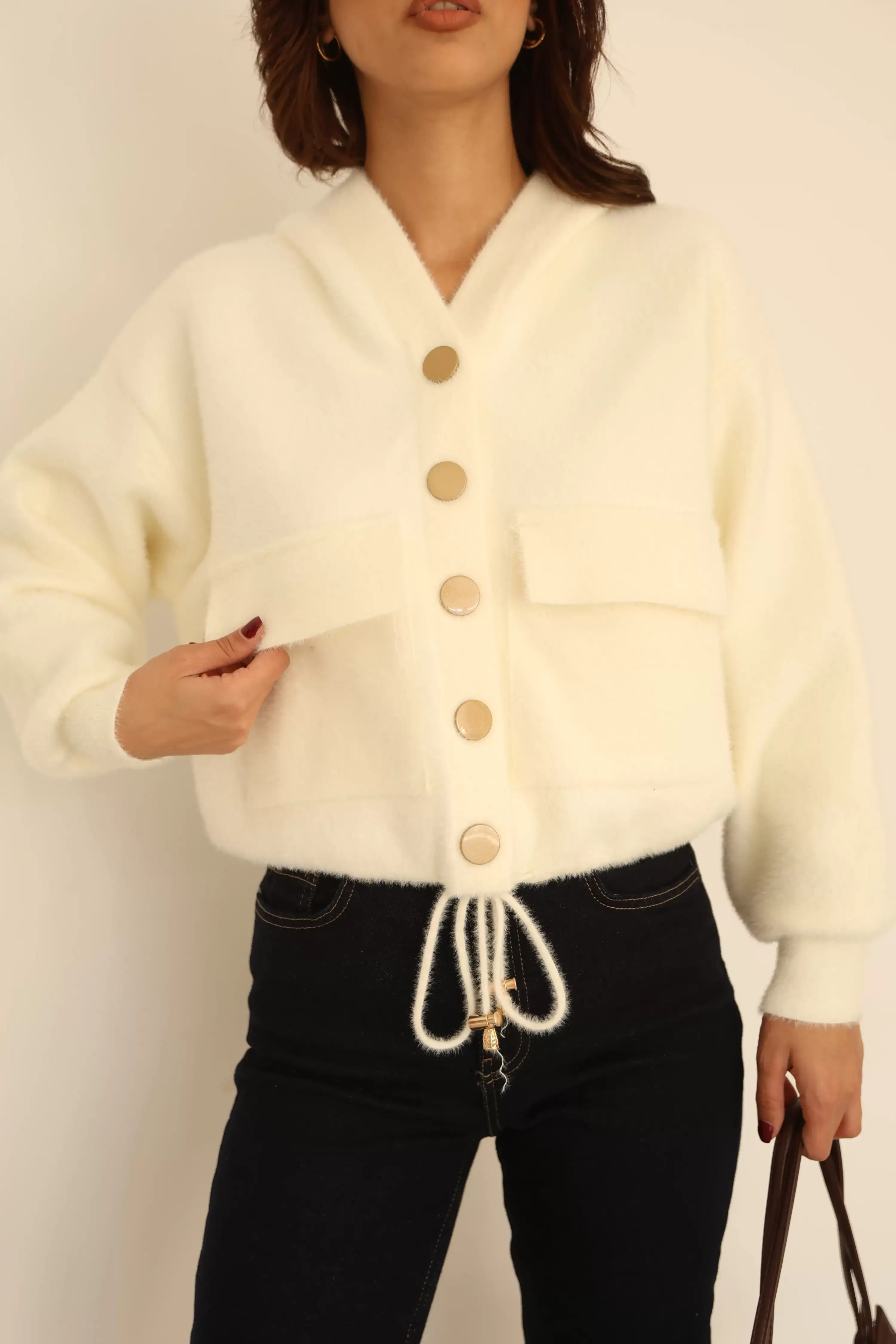 KAPŞONLU ÇITÇITLI CEPLİ HIRKA-BEYAZ