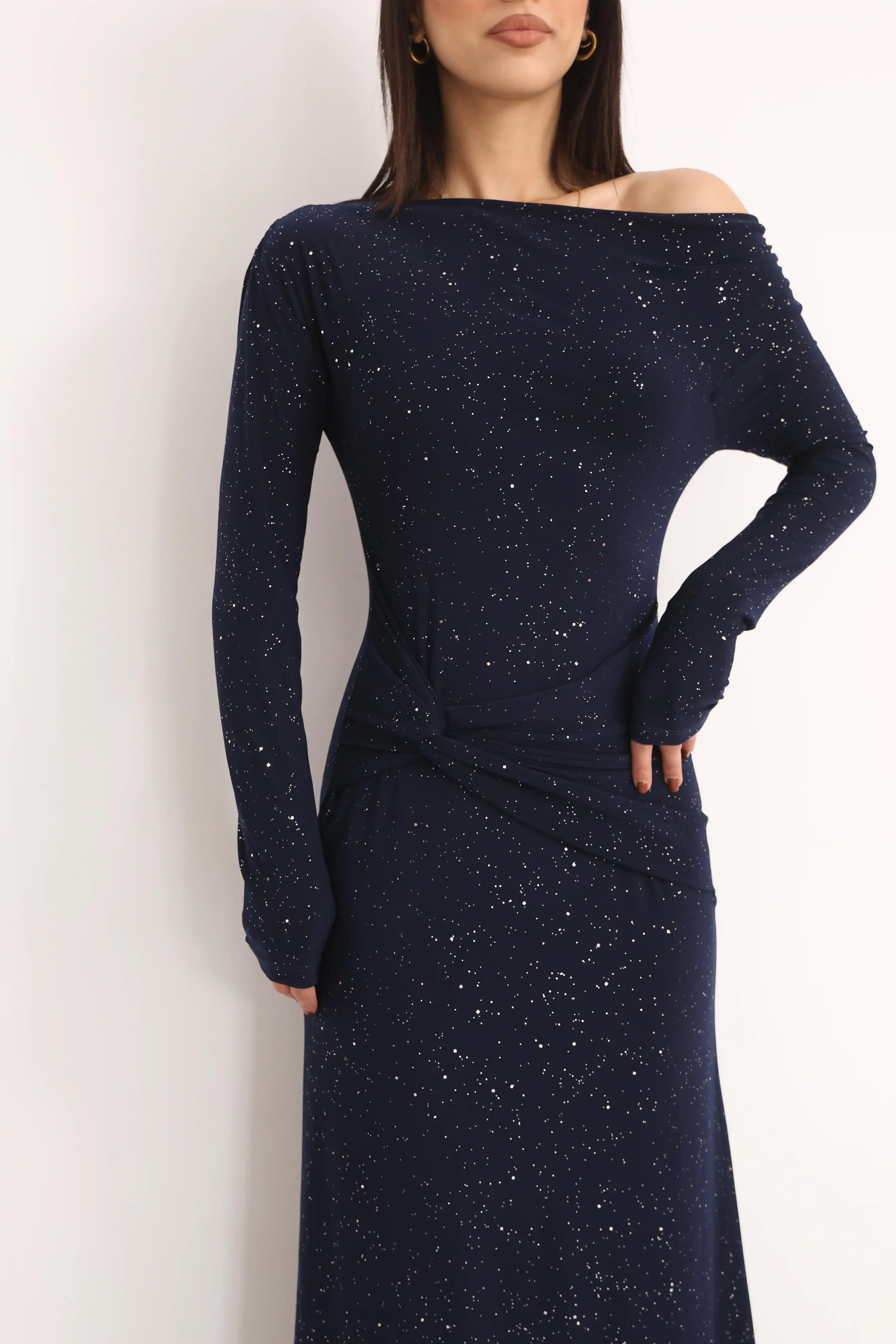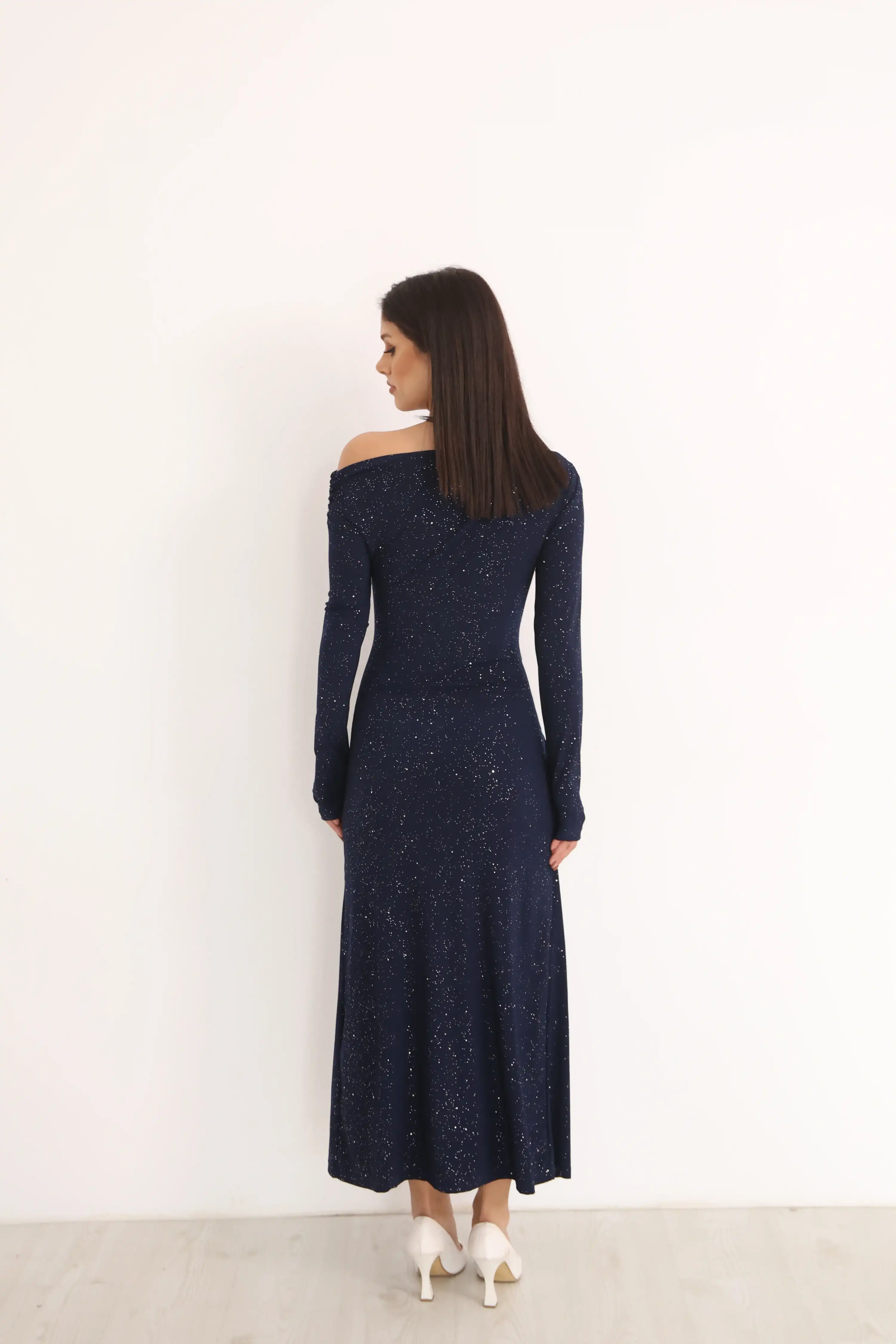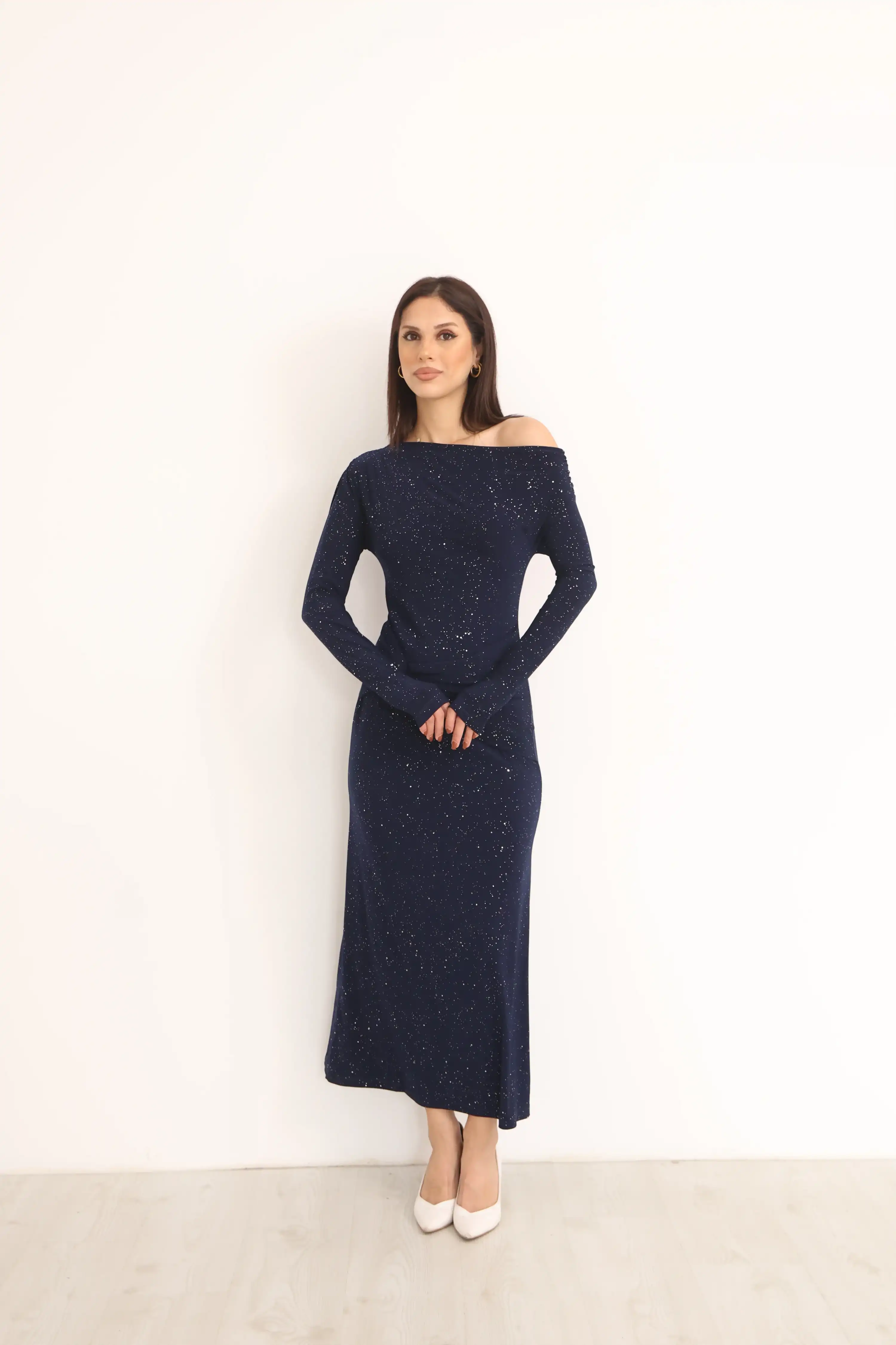 KAYIK YAKA BEL DETAYLI SİMLİ ELBİSE-LACİVERT