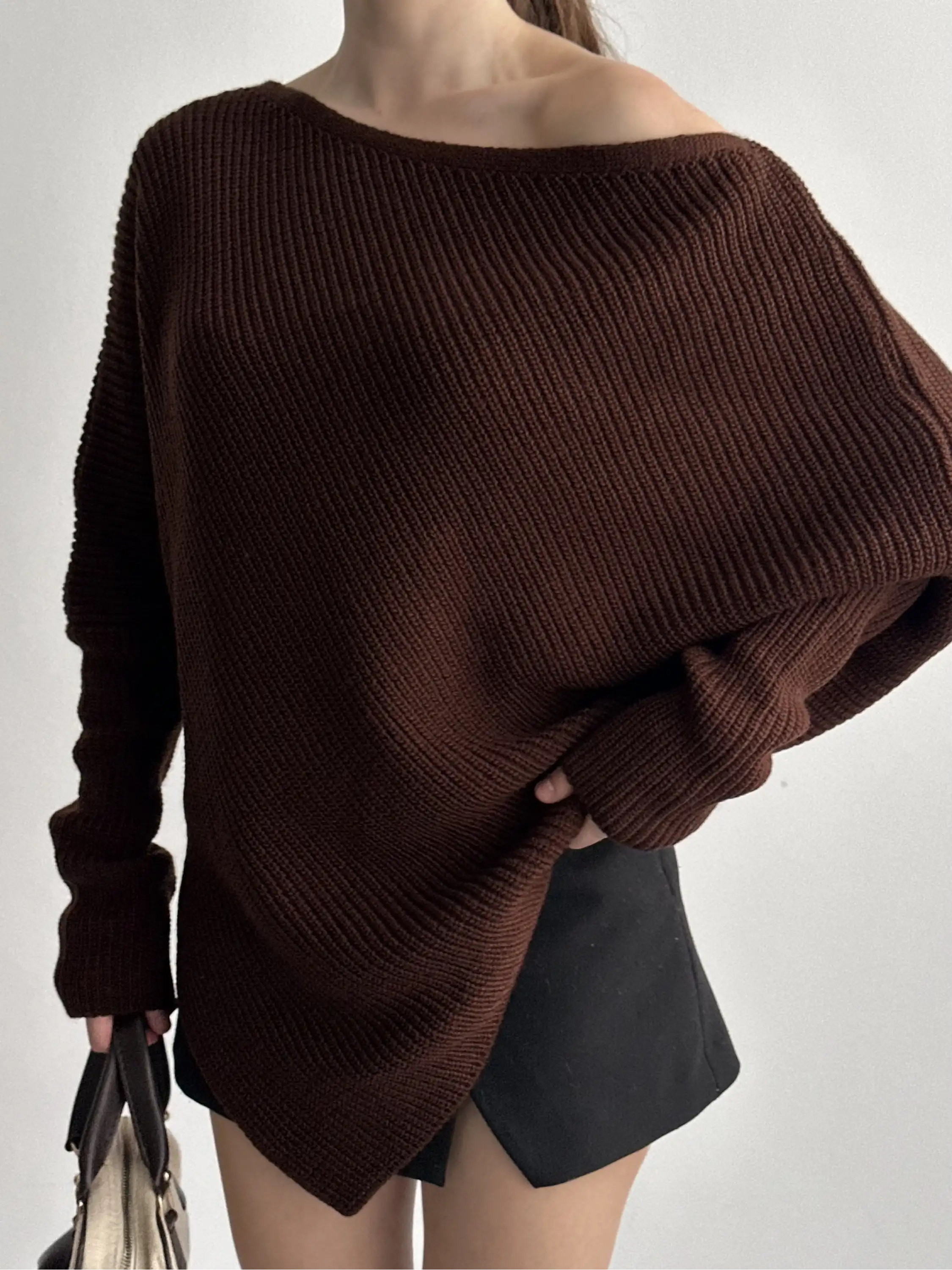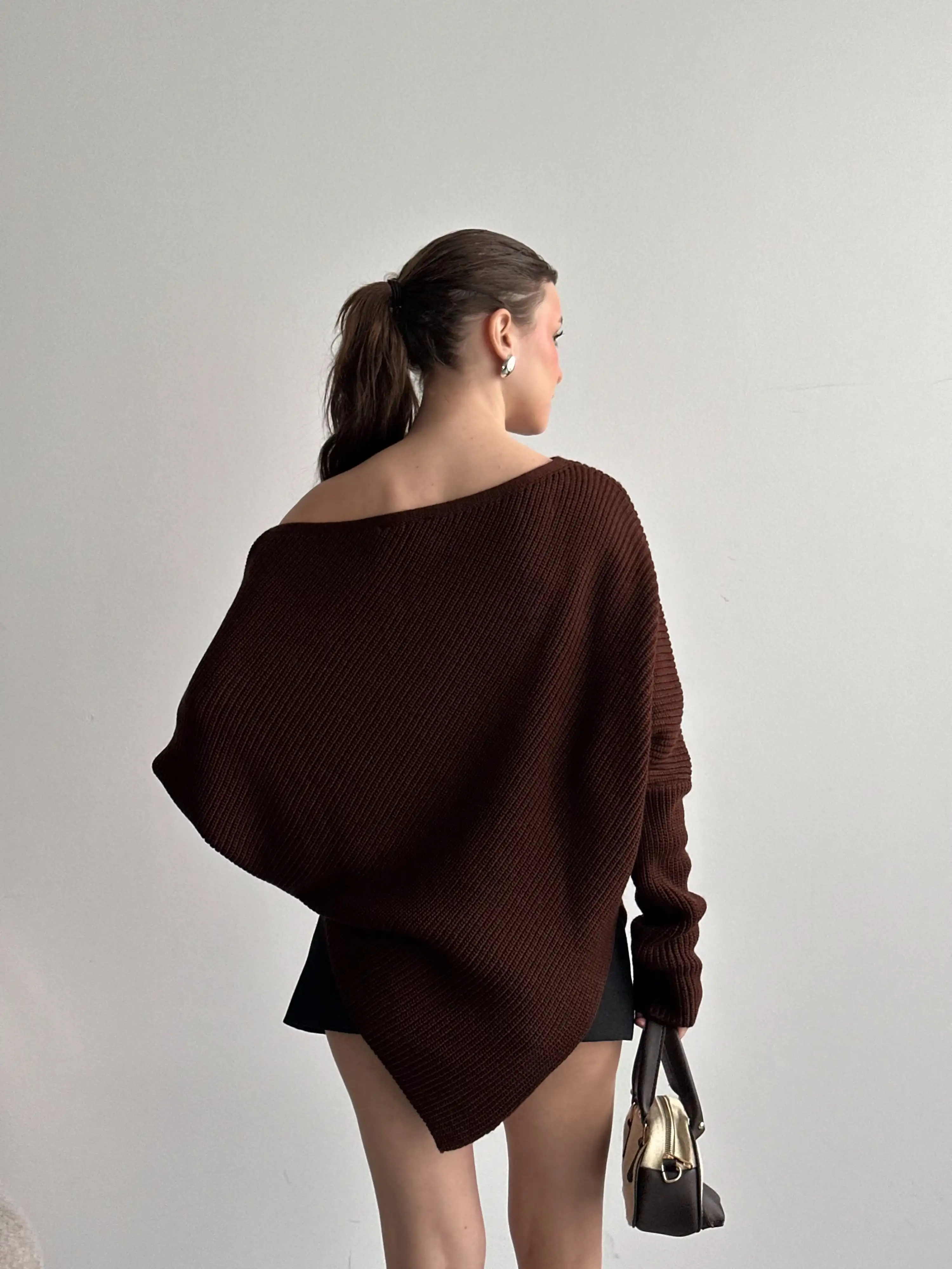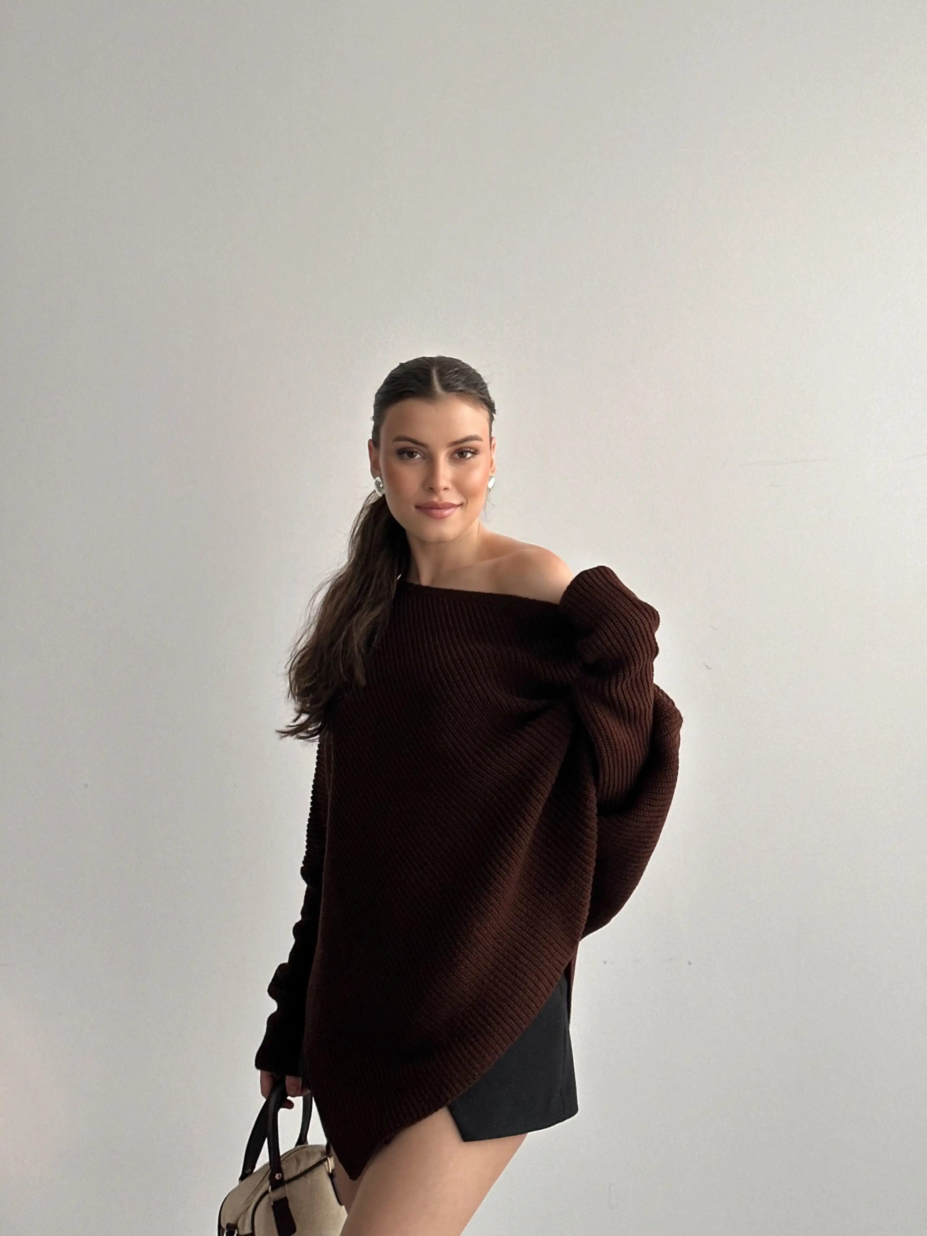 KAYIK YAKA ÜÇGEN DETAYLI SALAŞ TRİKO KAZAK-KAHVE