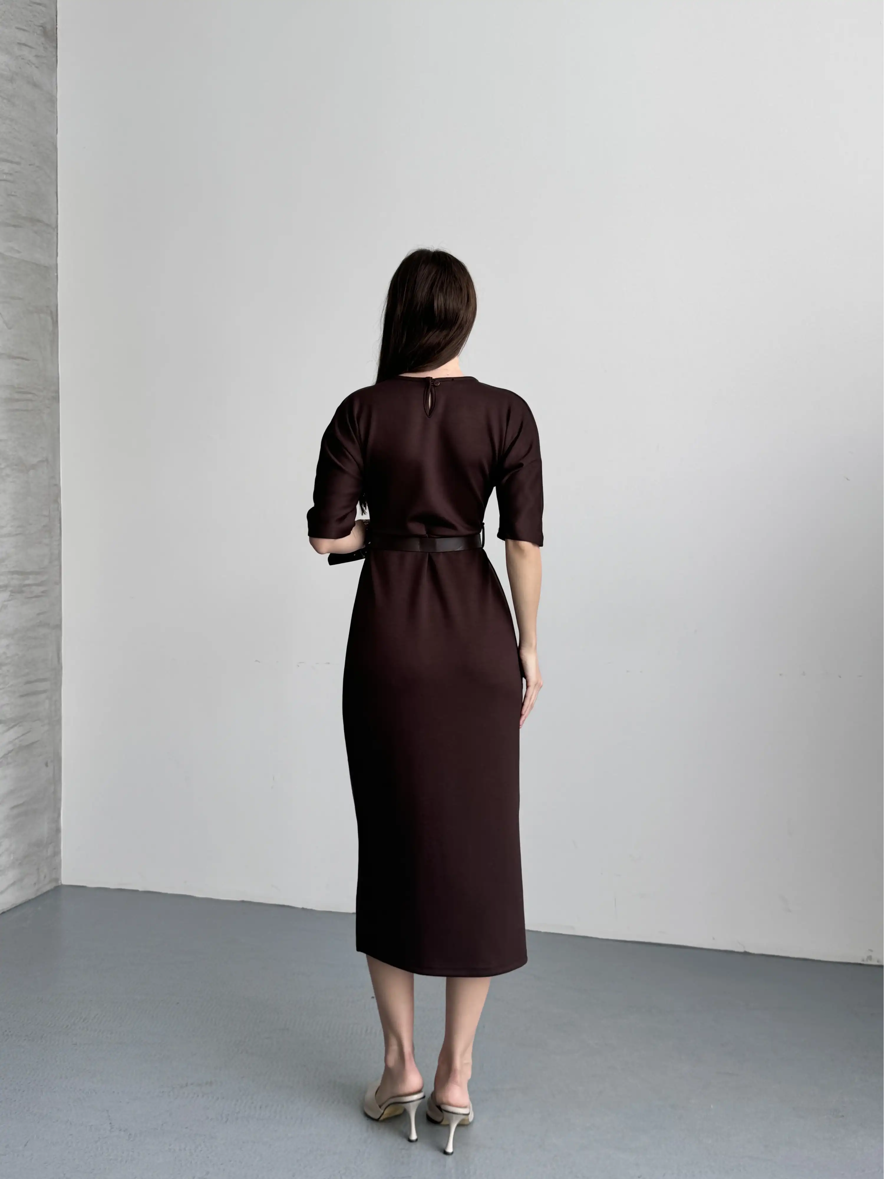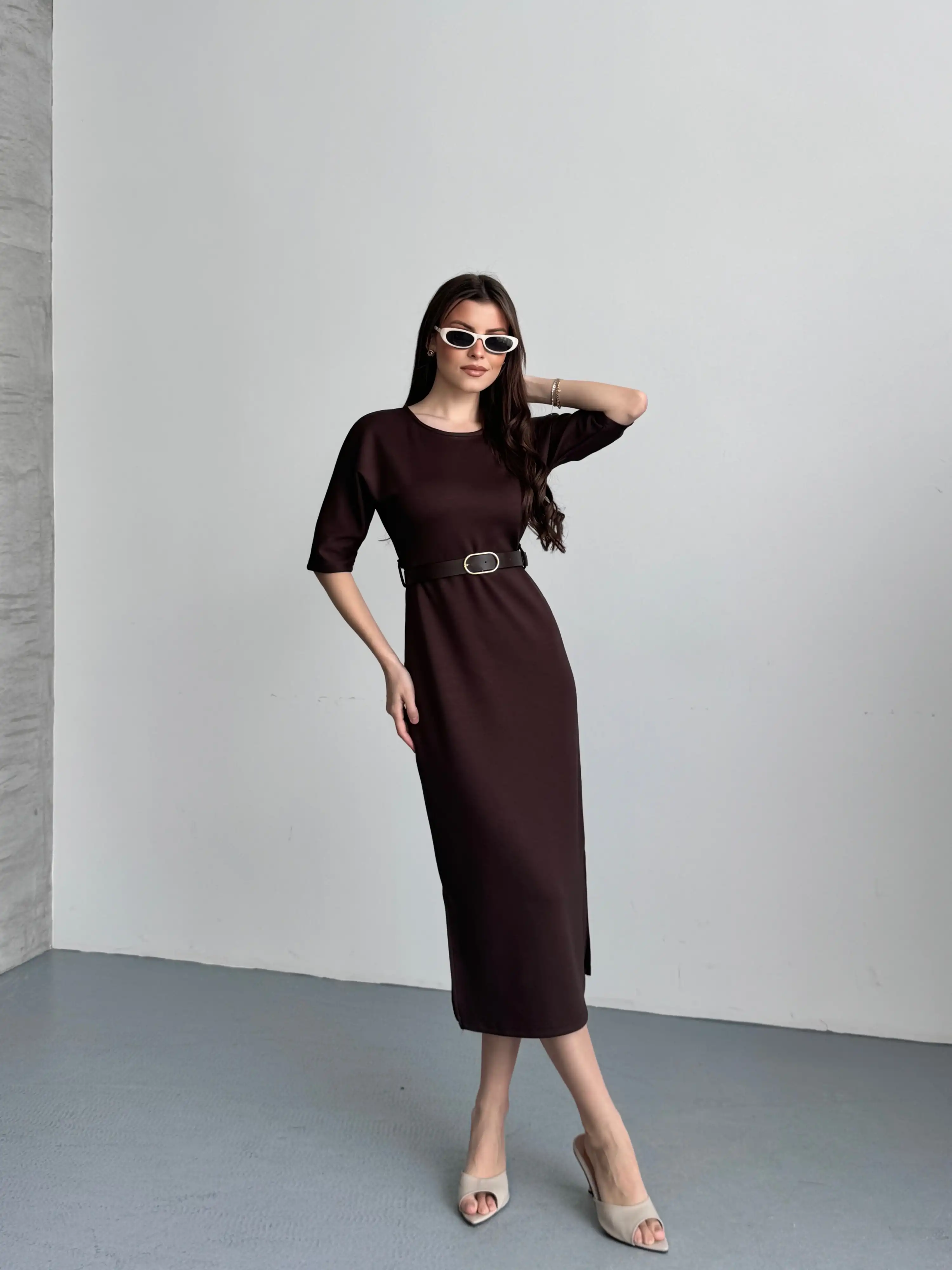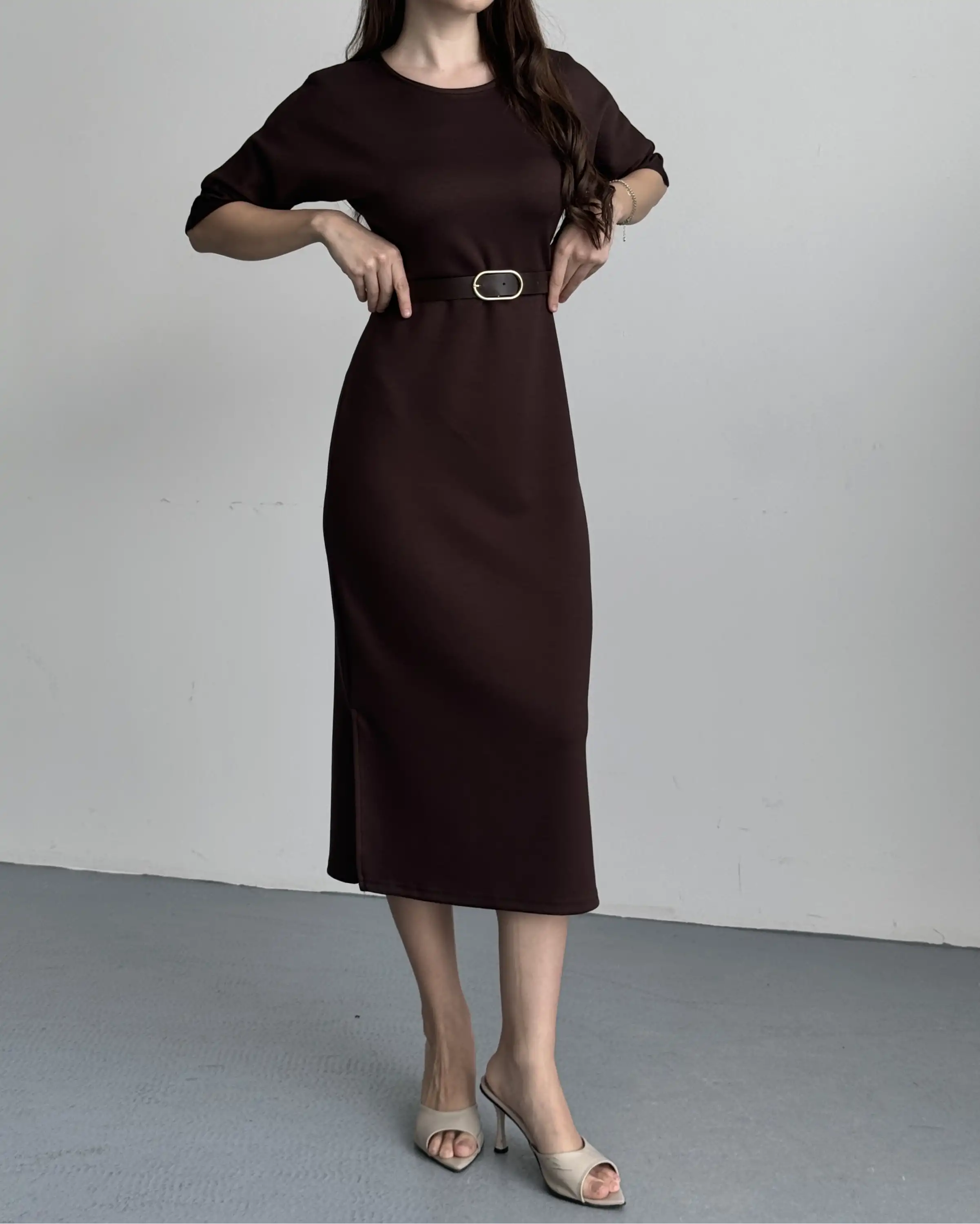 KEMER DETAYLI MİDİ ELBİSE-KAHVE
