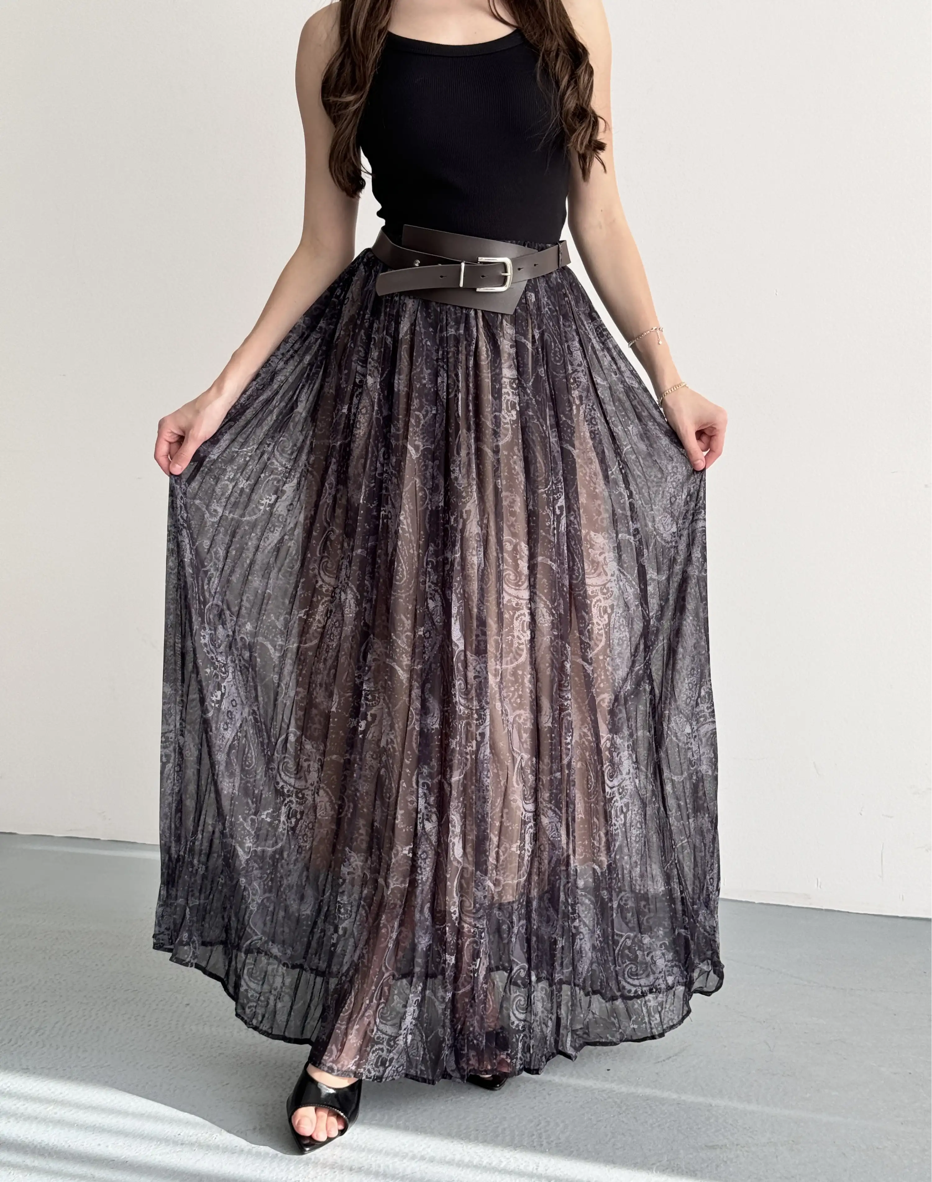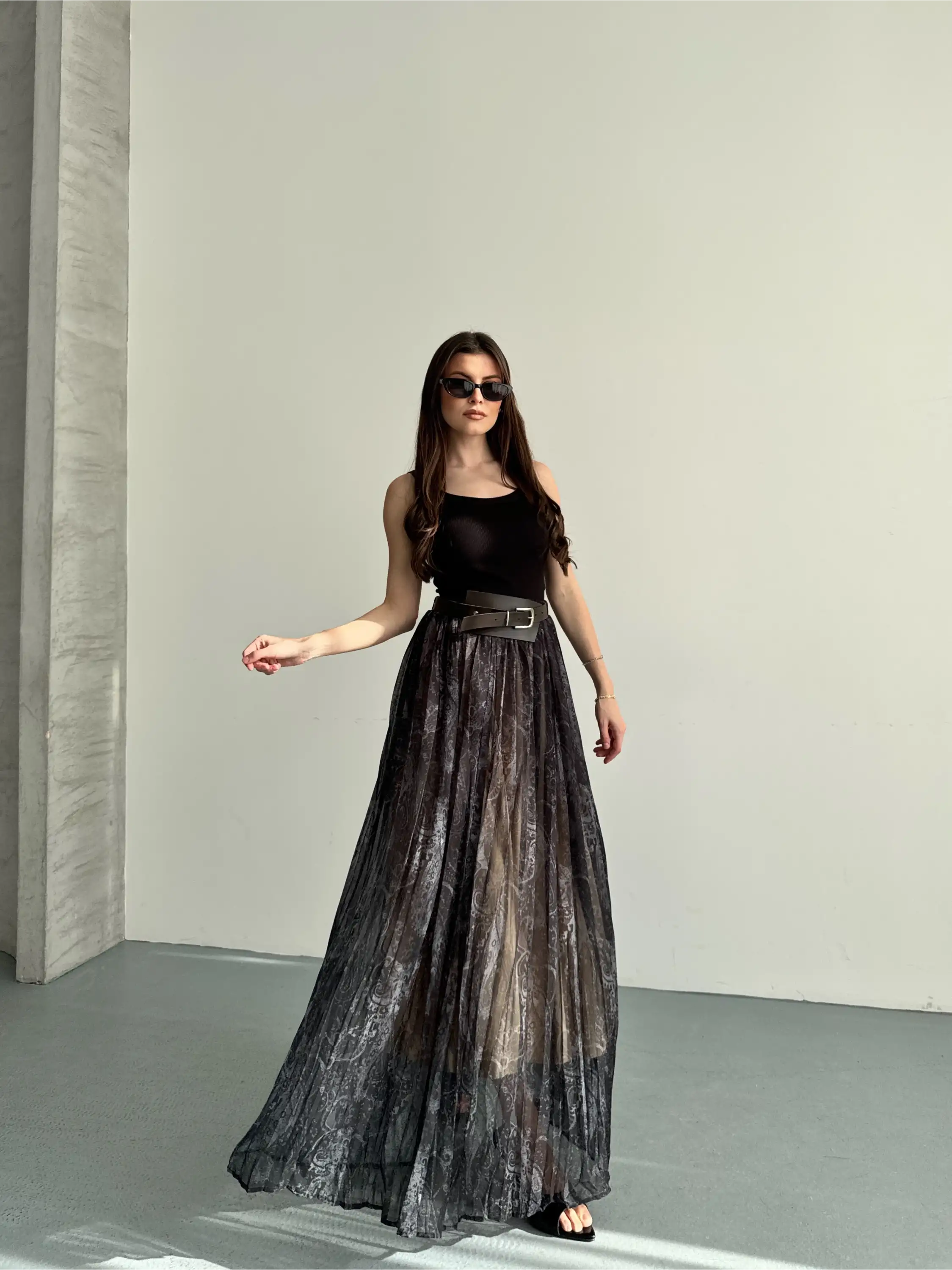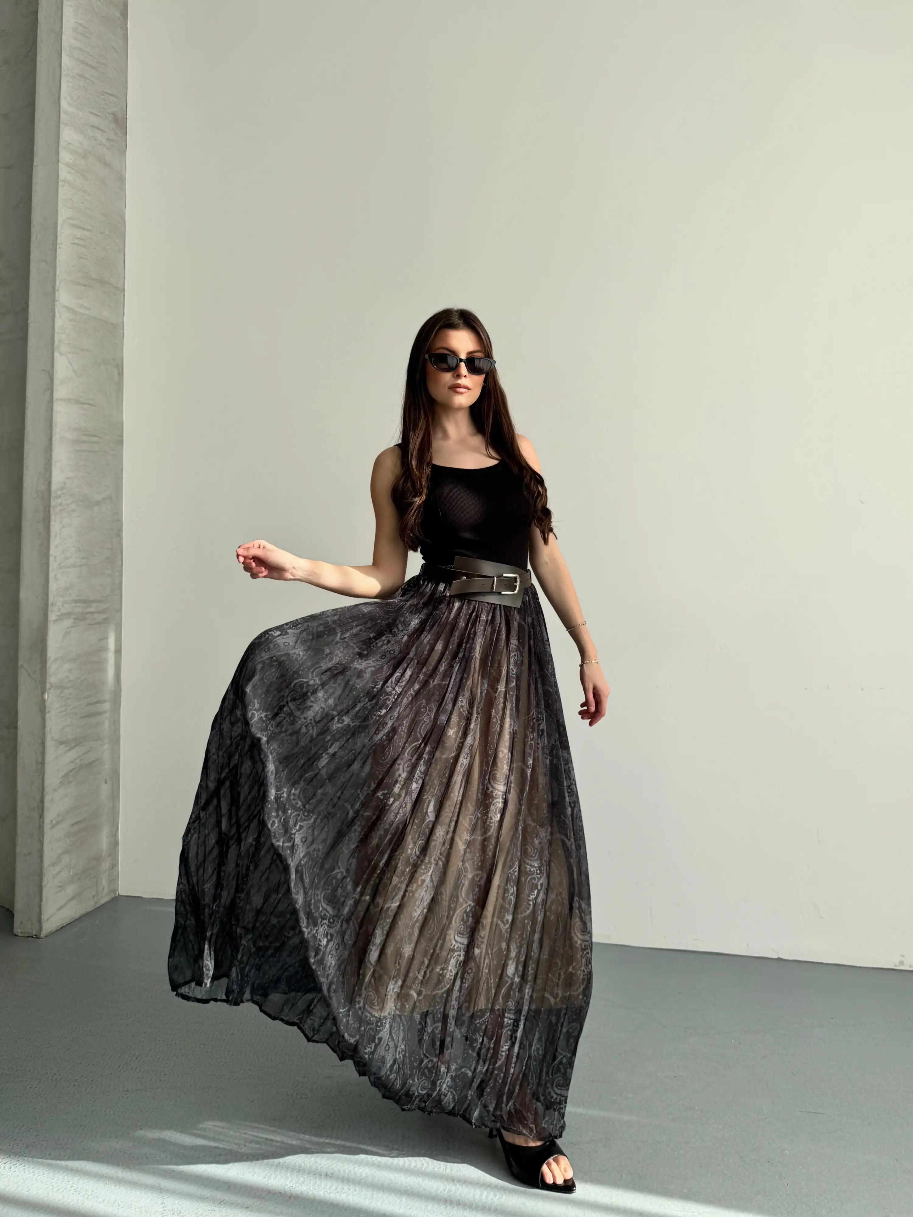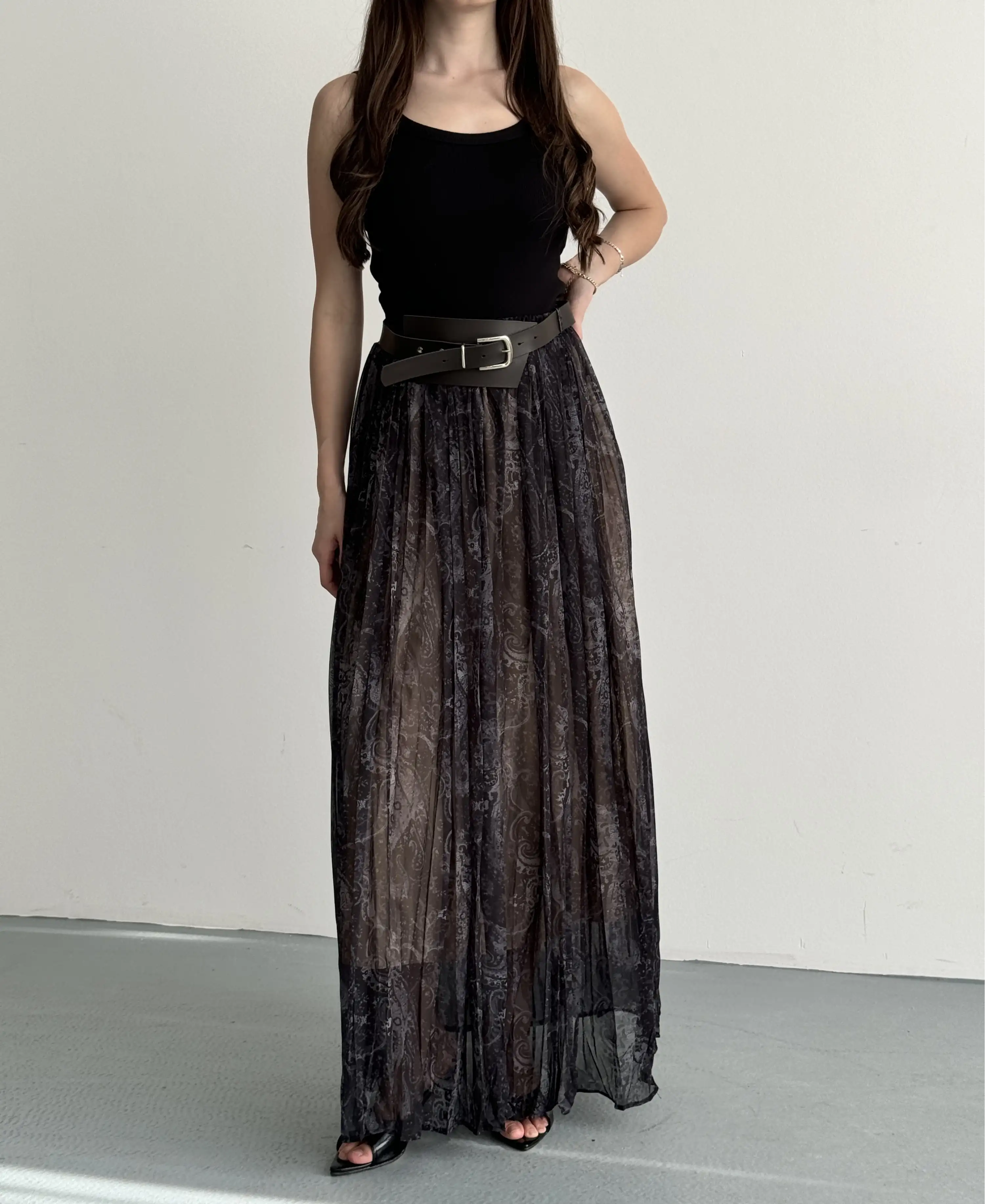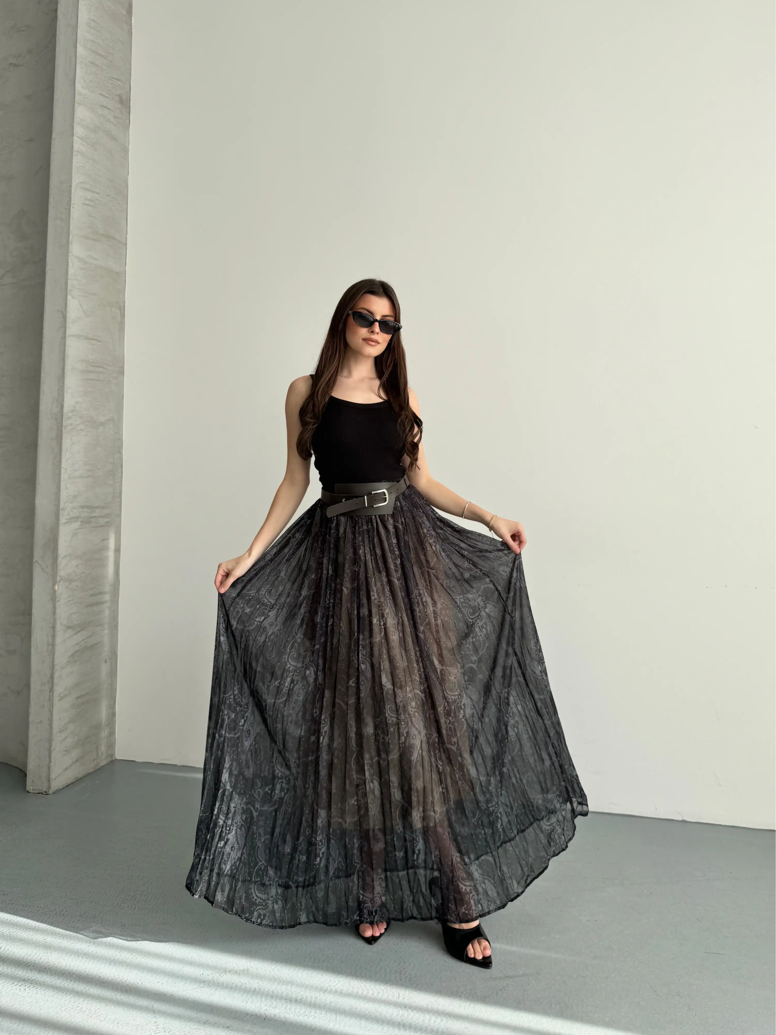 KEMER DETAYLI PİLİSELİ UZUN ETEK-SİYAH