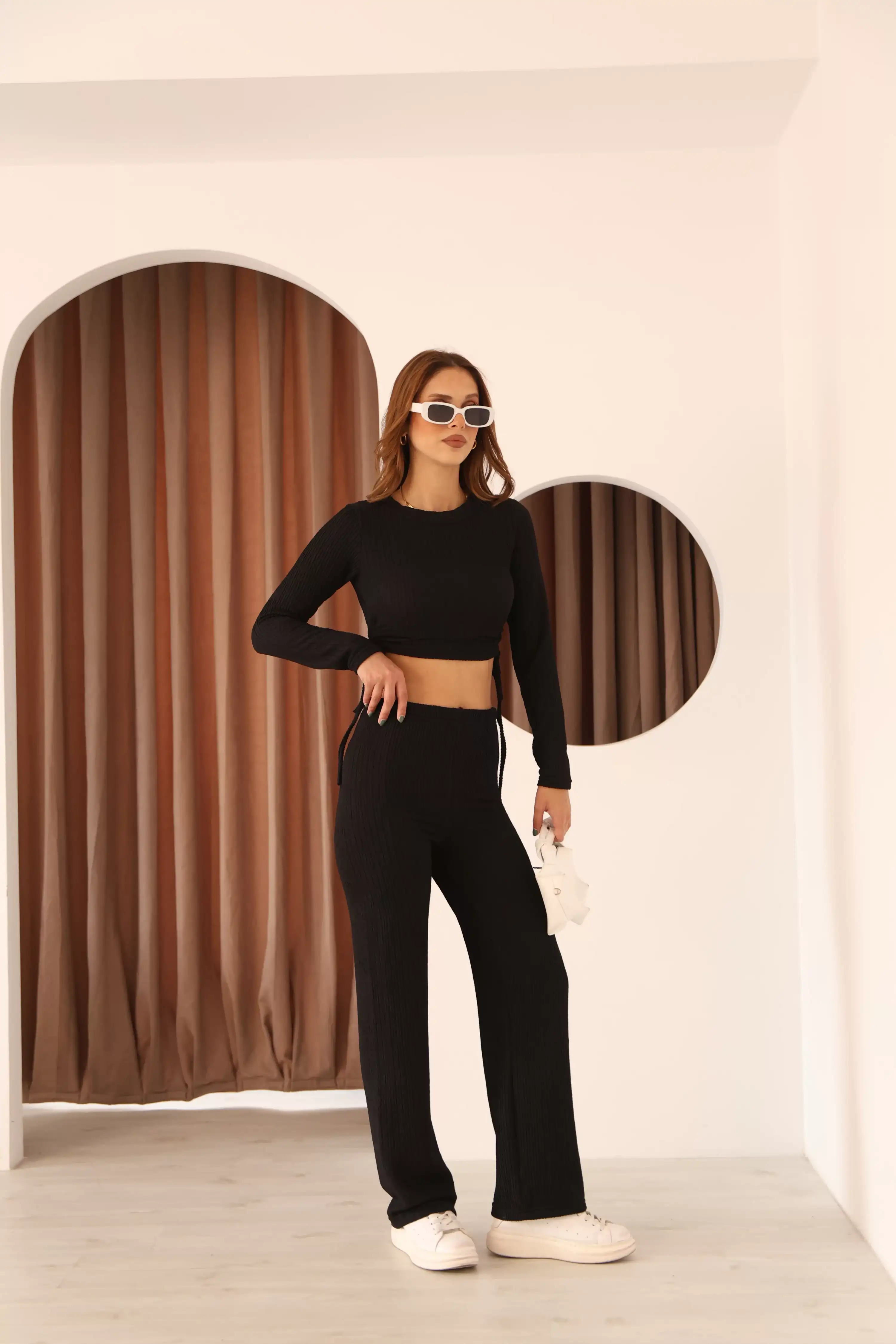 KENDİNDEN DESENLİ YANDAN BÜZMELİ TAKIM-SİYAH