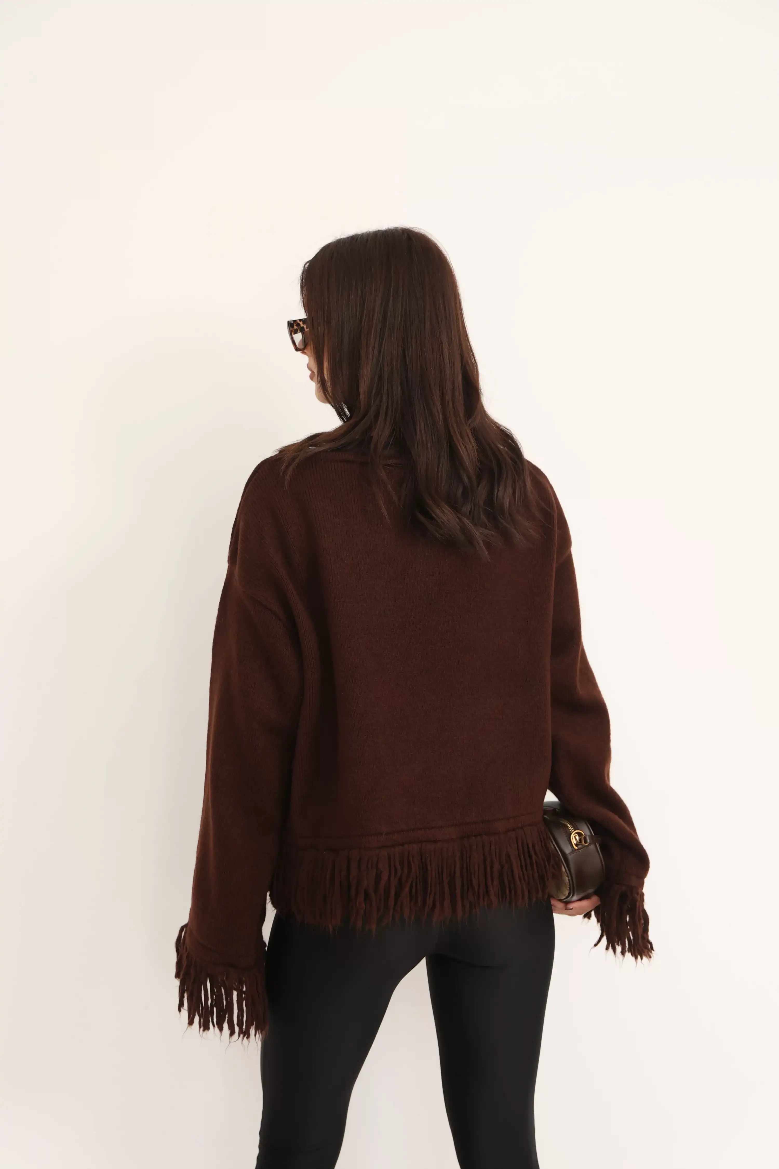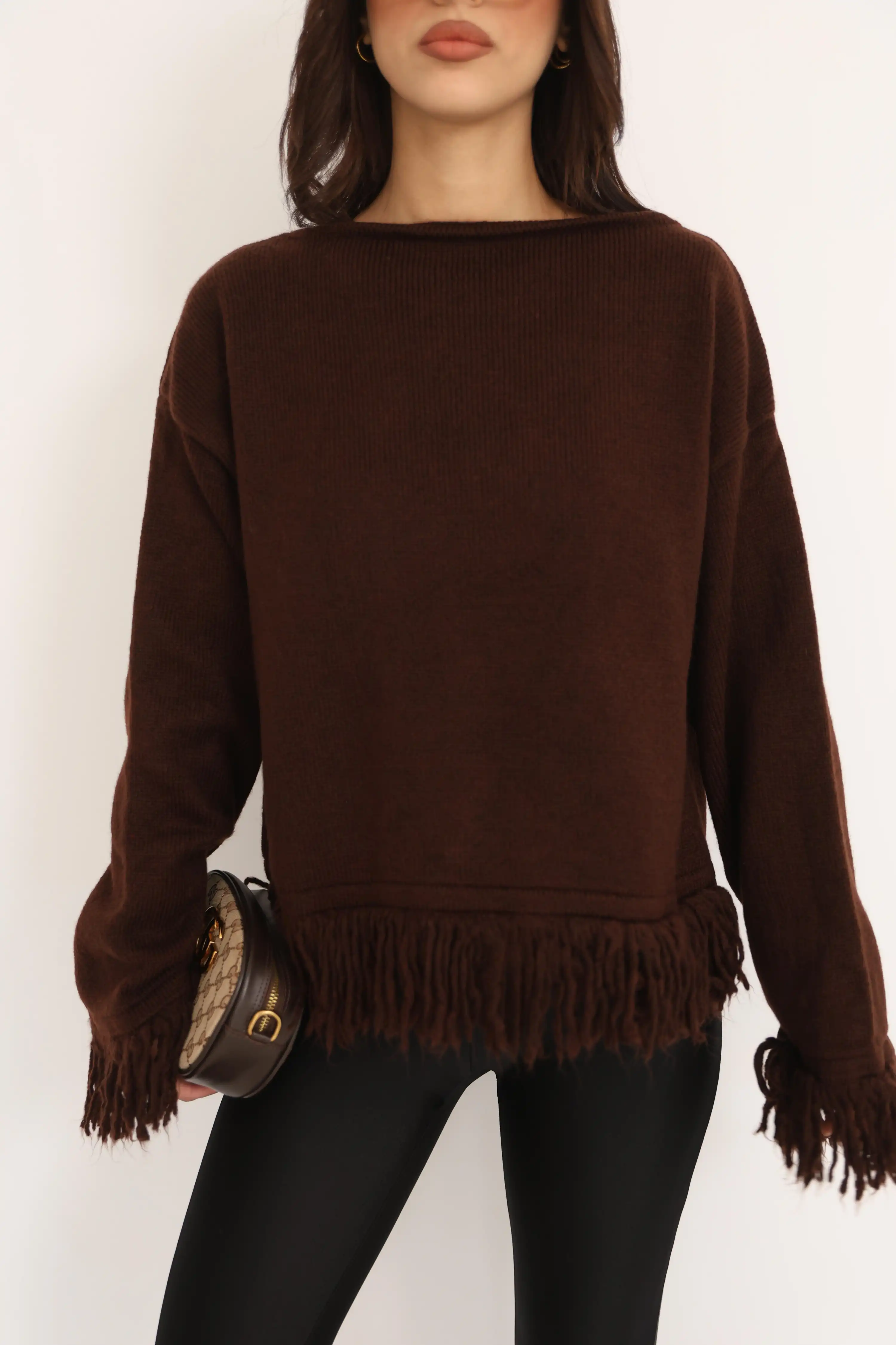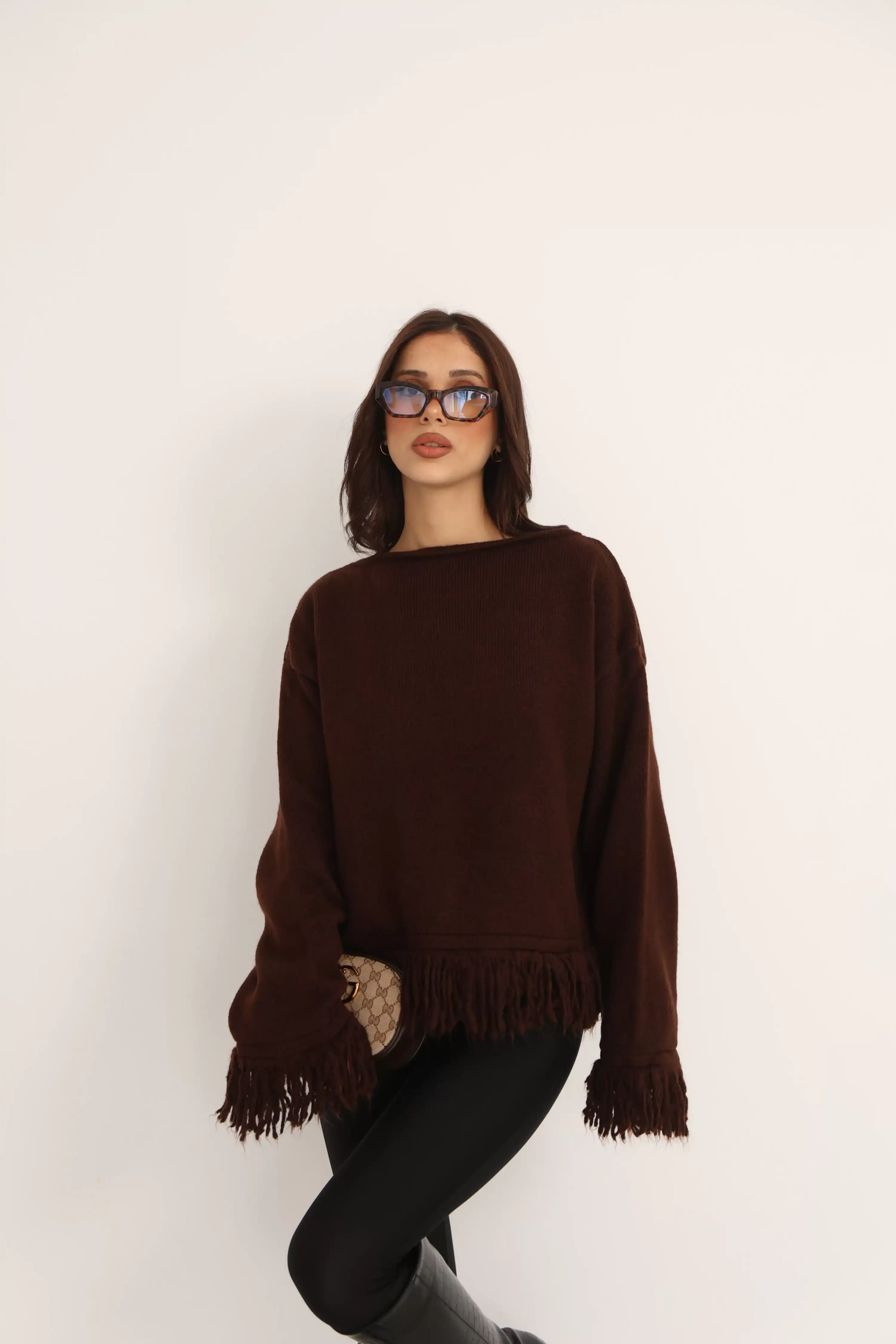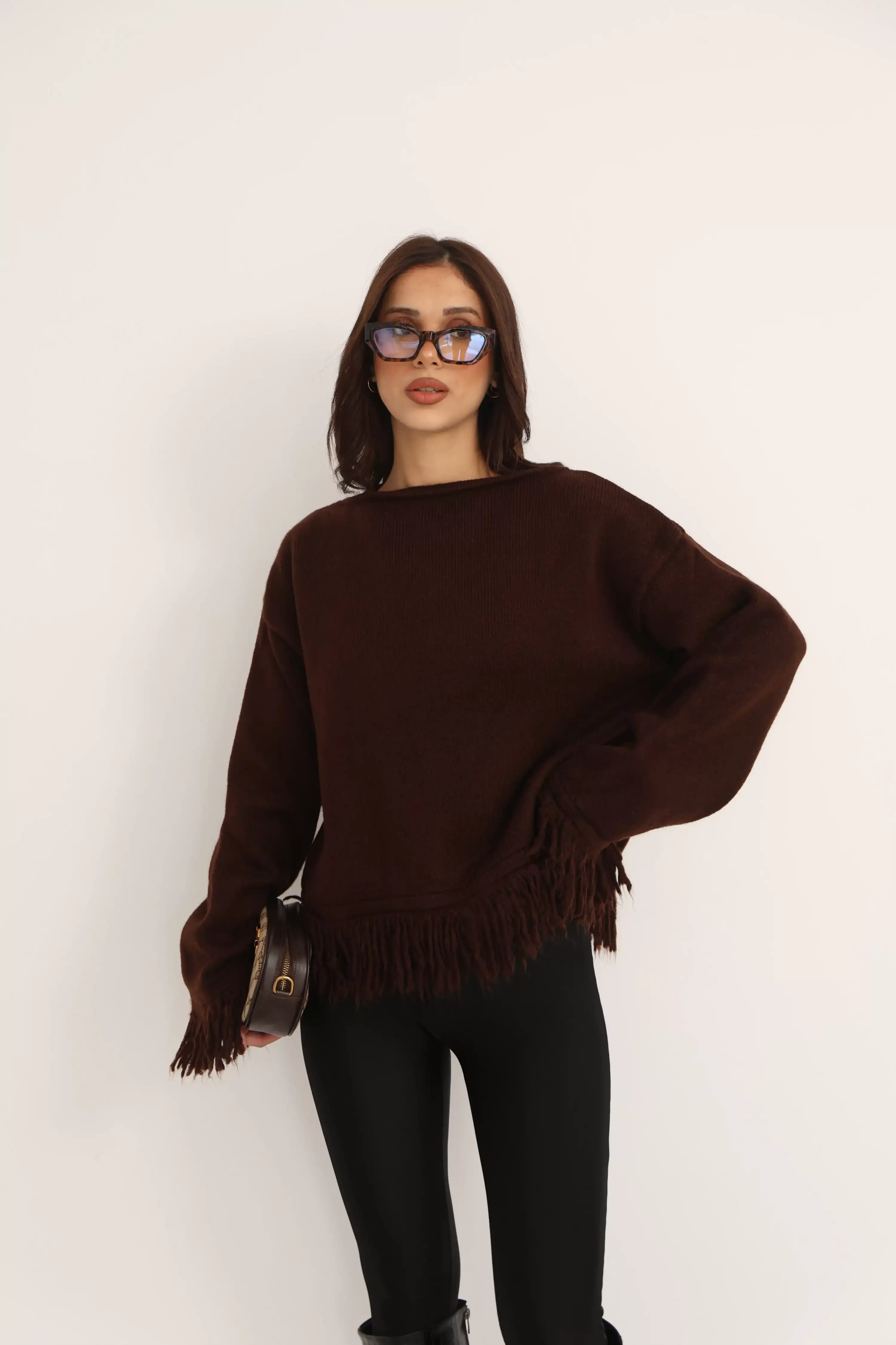 KOL VE ETEĞİ SAÇAKLI KAZAK-KAHVE