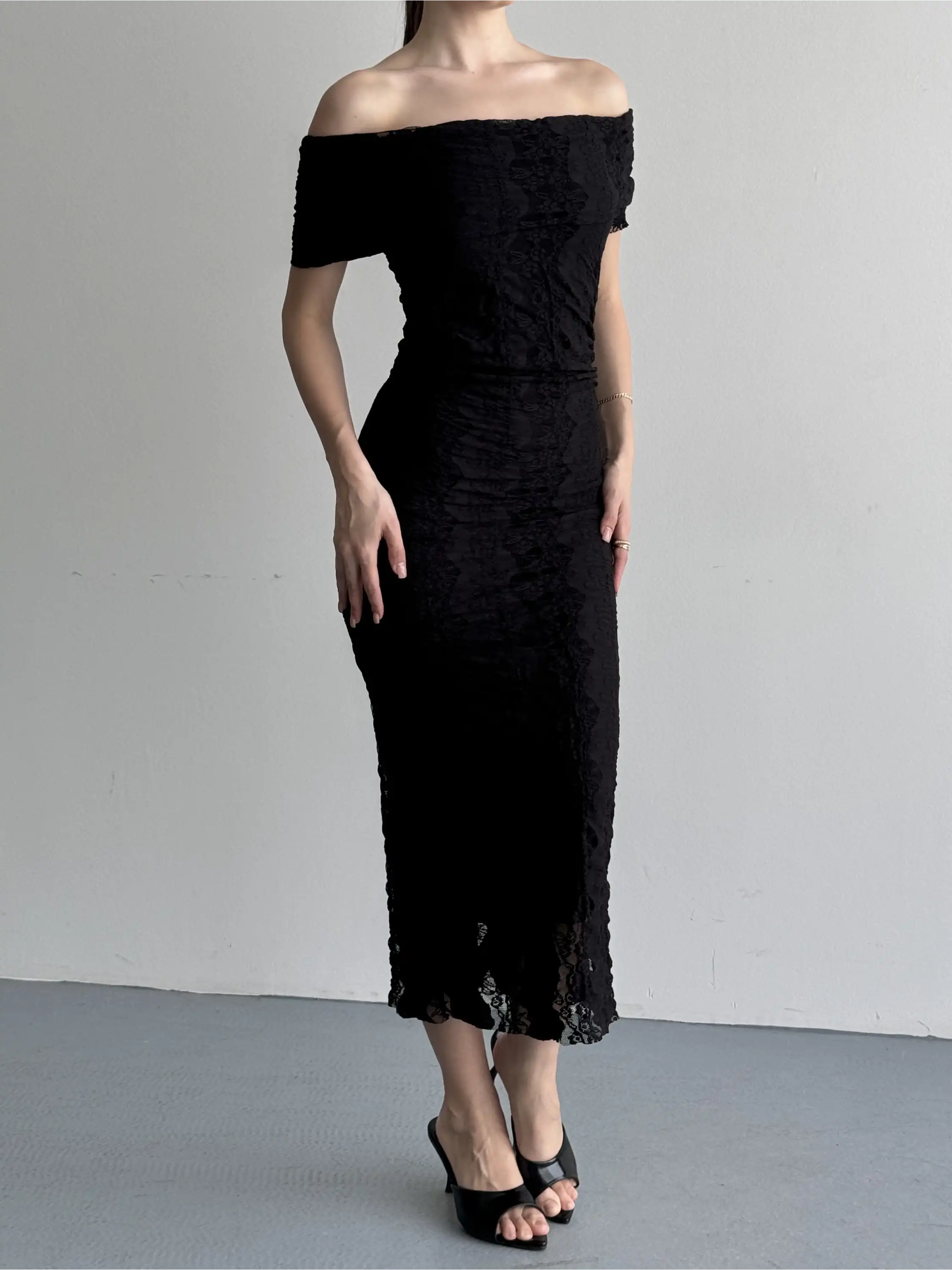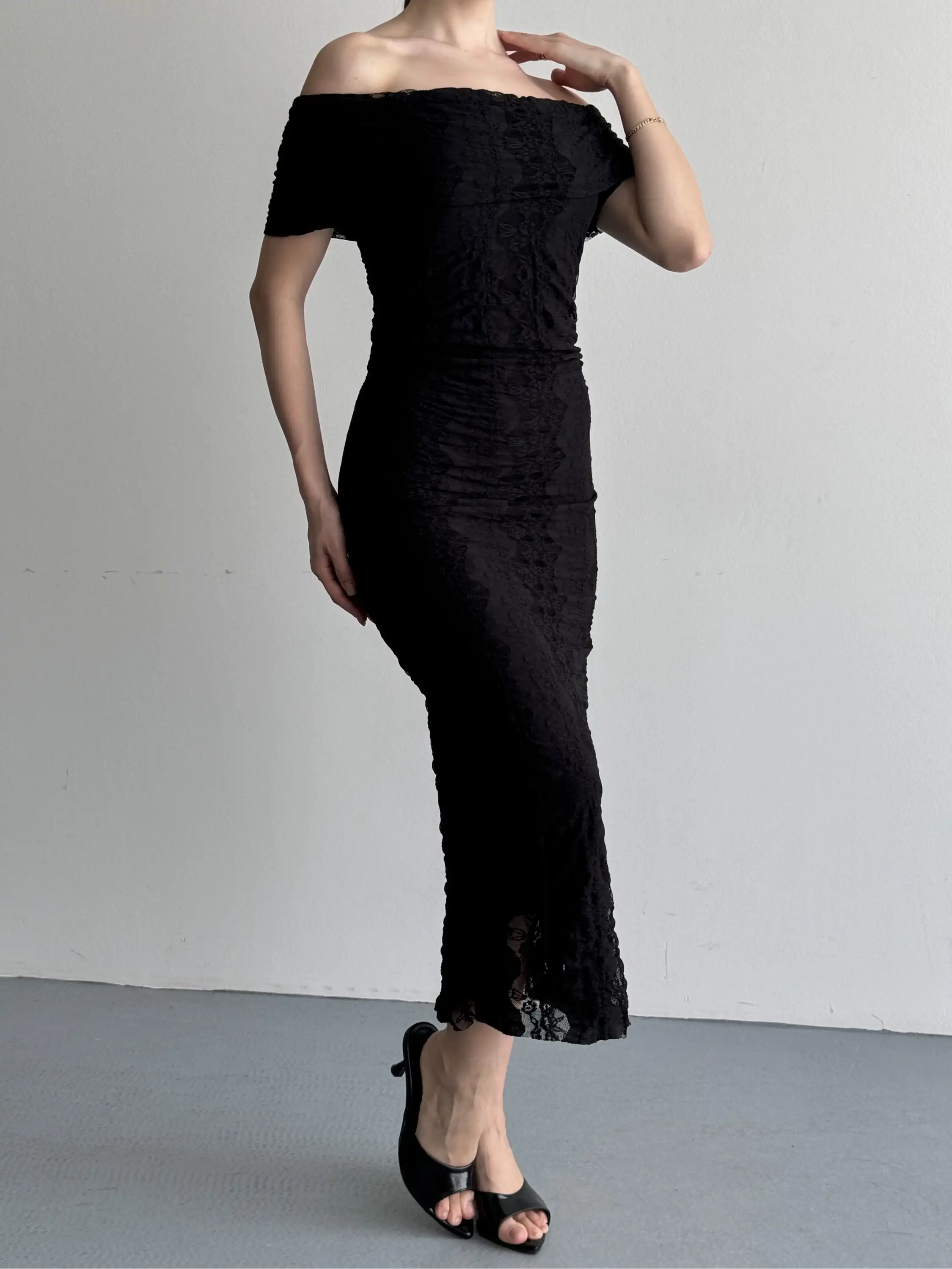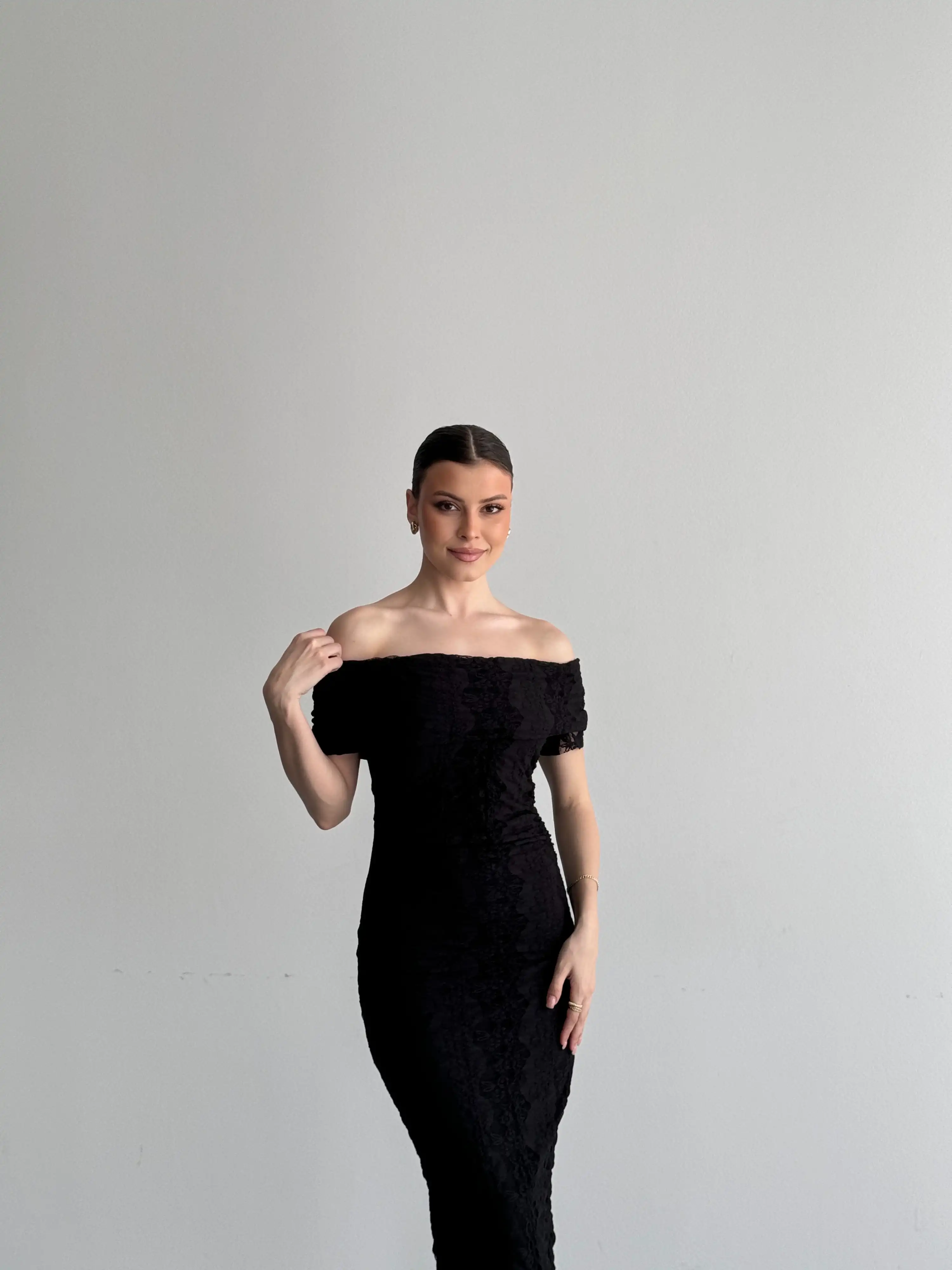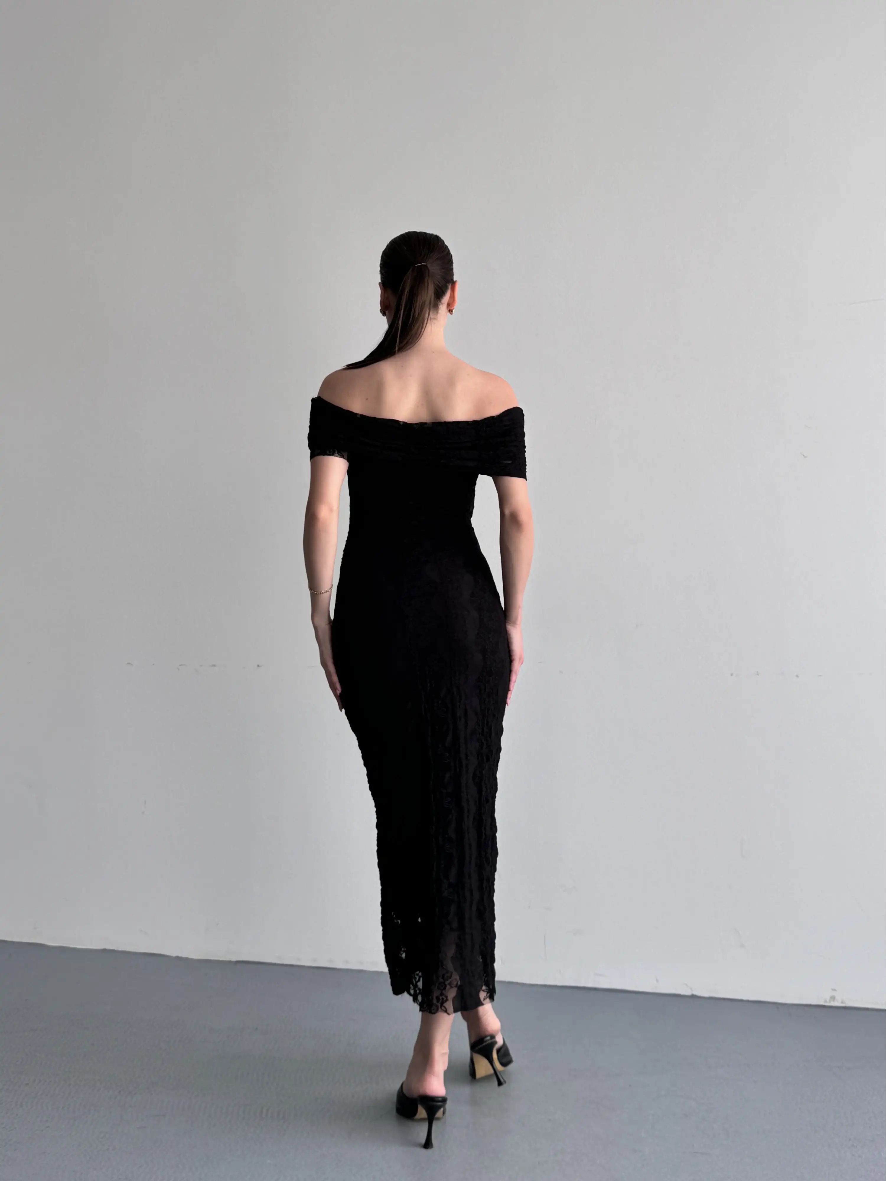 MADONNA YAKA GÜPÜRLÜ UZUN ELBİSE-SİYAH