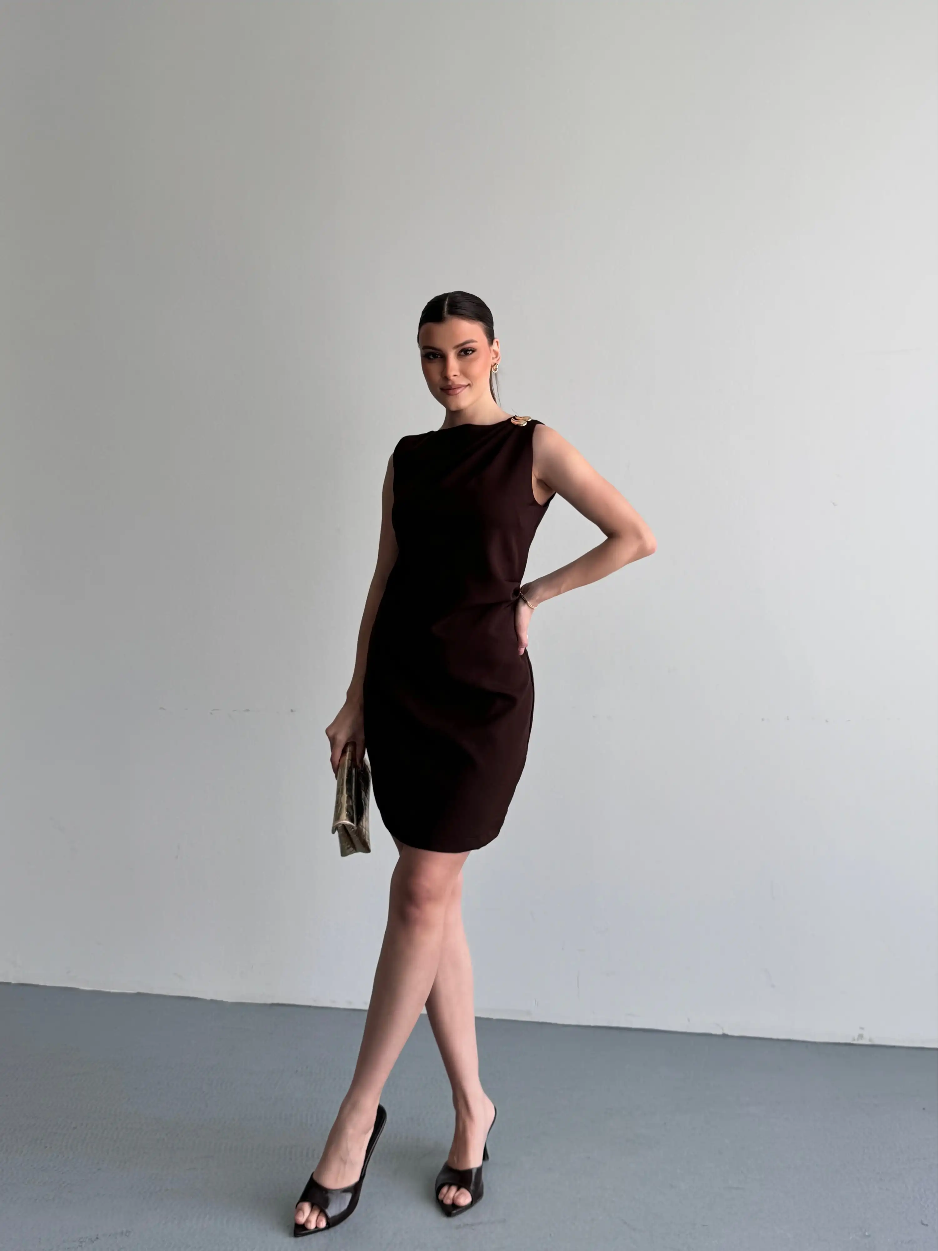 OMUZ TOKALI YANDAN DRAPELİ ELBİSE-KAHVE