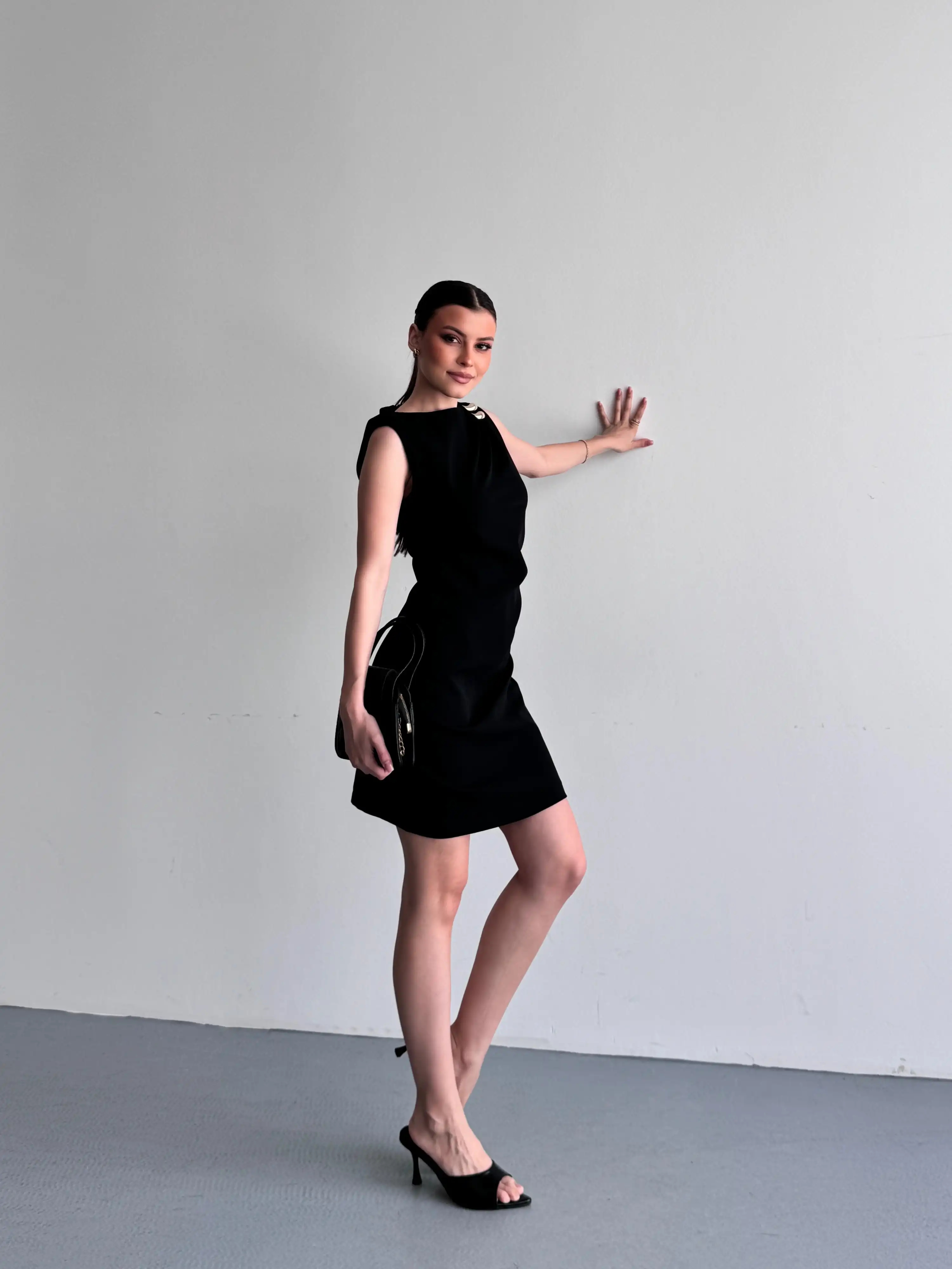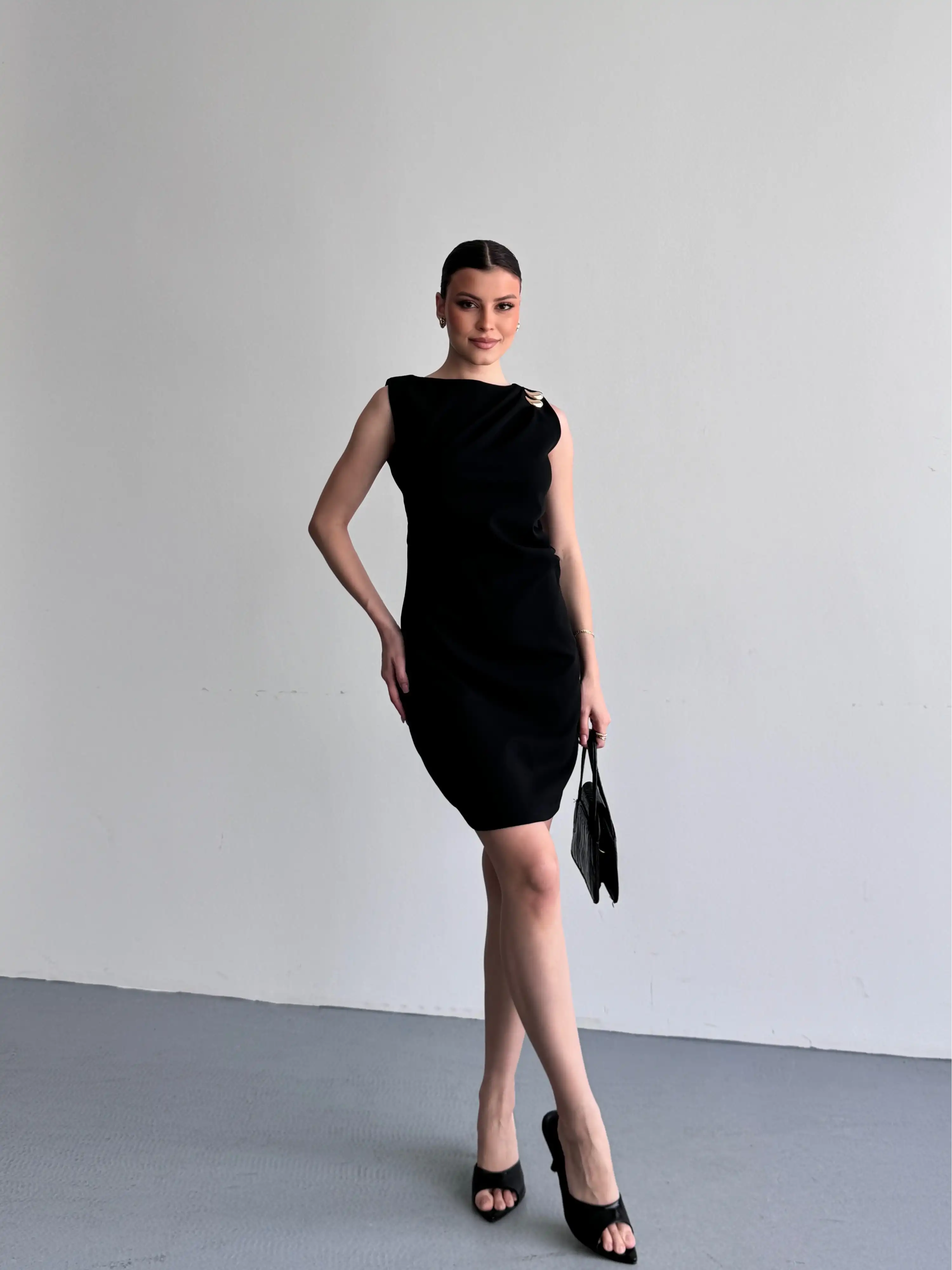 OMUZ TOKALI YANDAN DRAPELİ ELBİSE-SİYAH