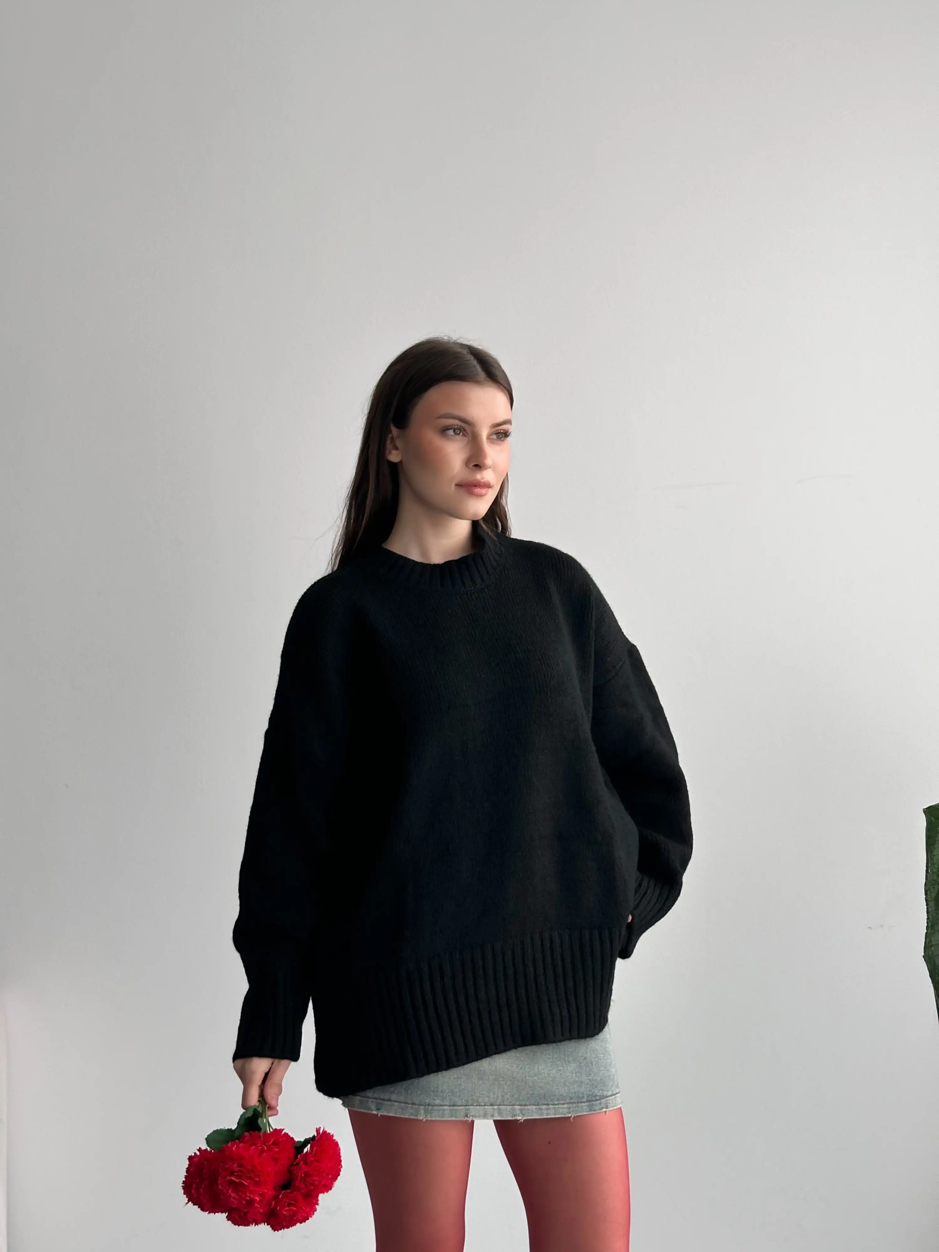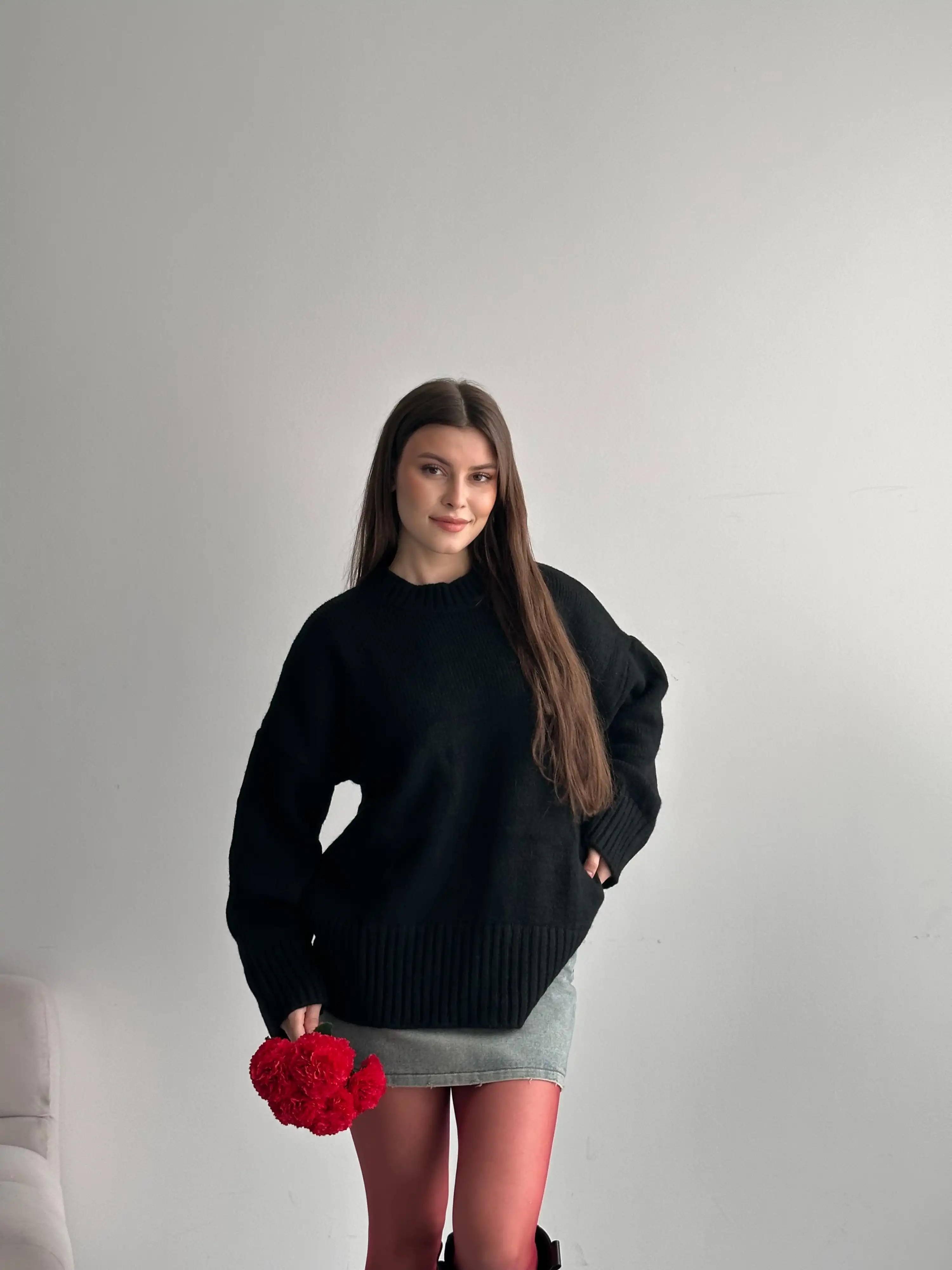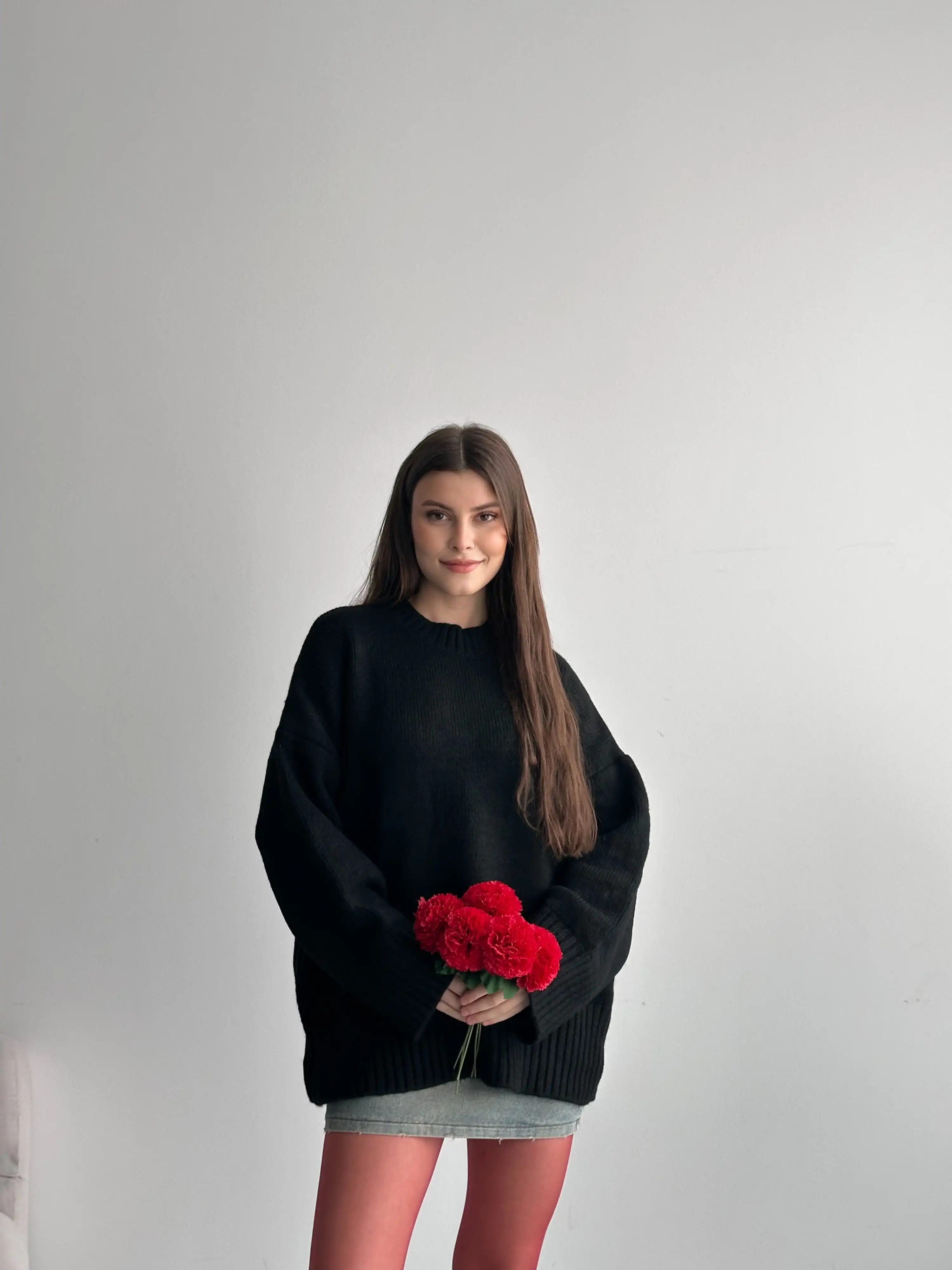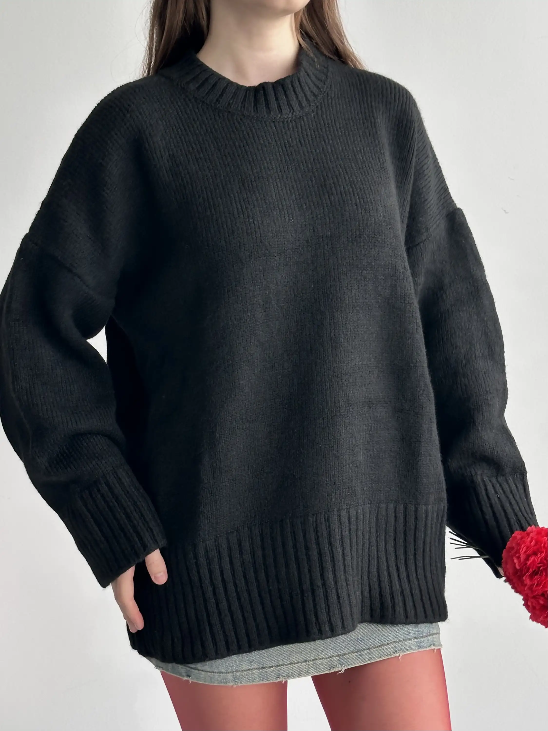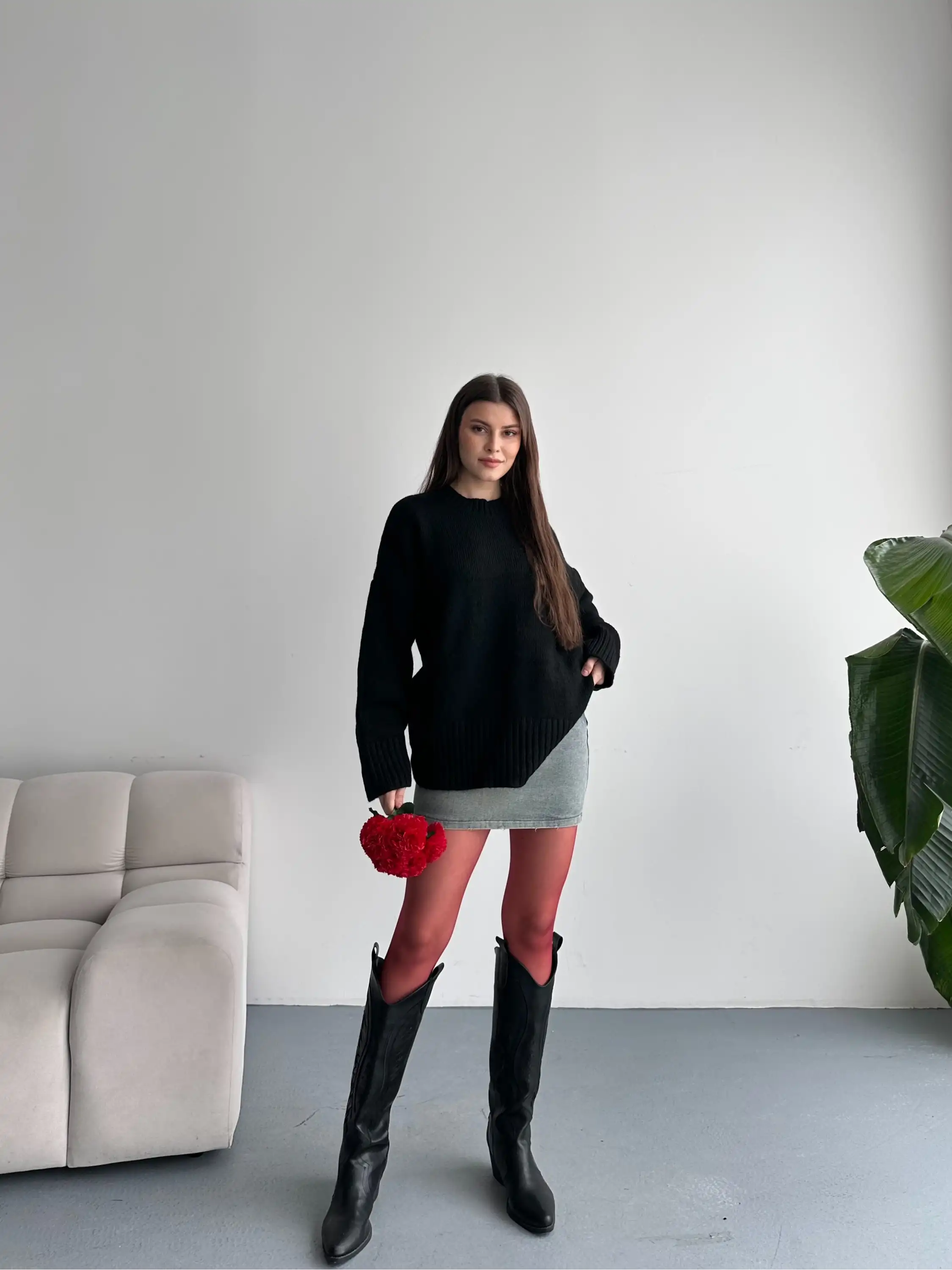 OVERSİZE BİSİKLET YAKA KAZAK-SİYAH