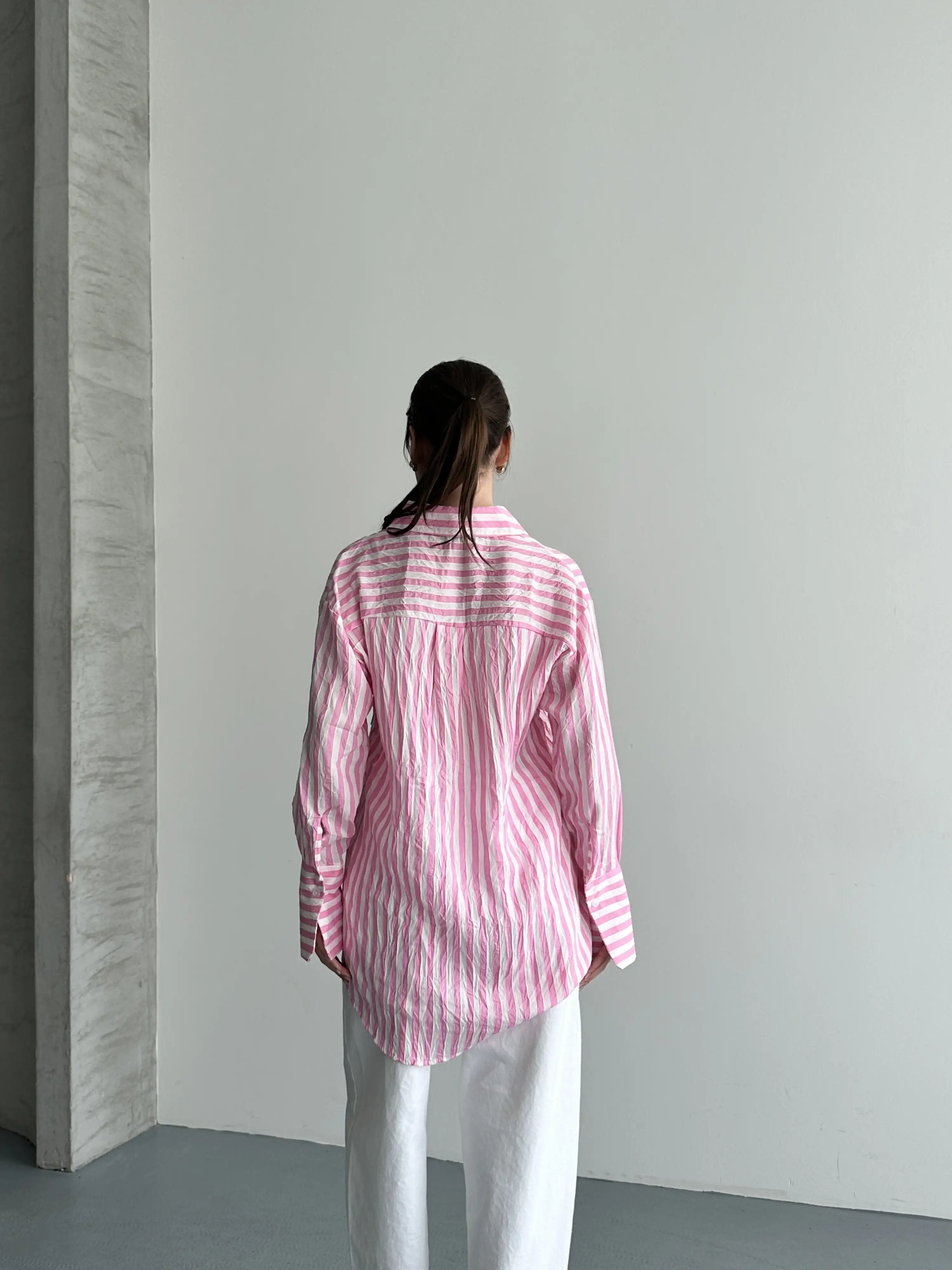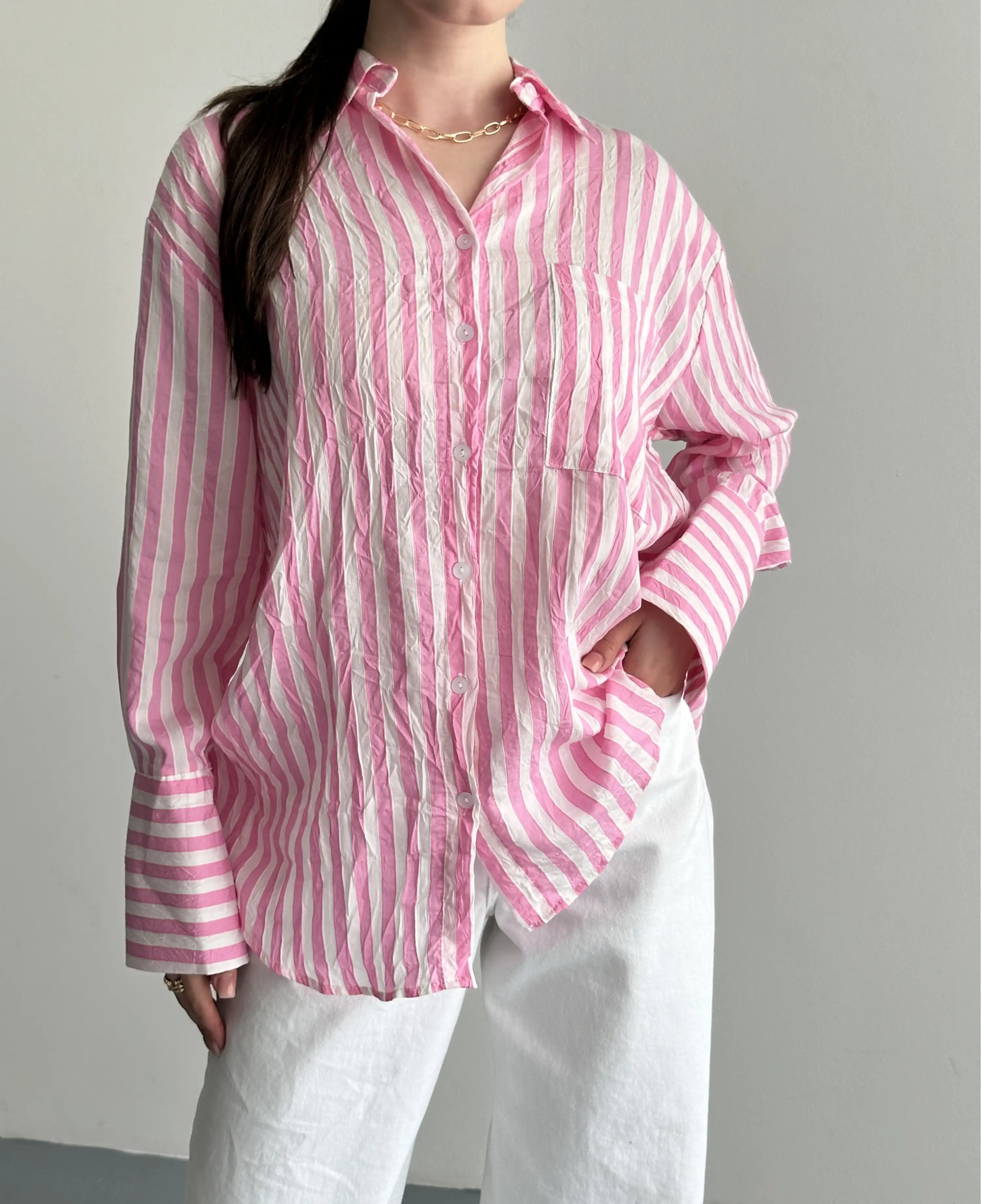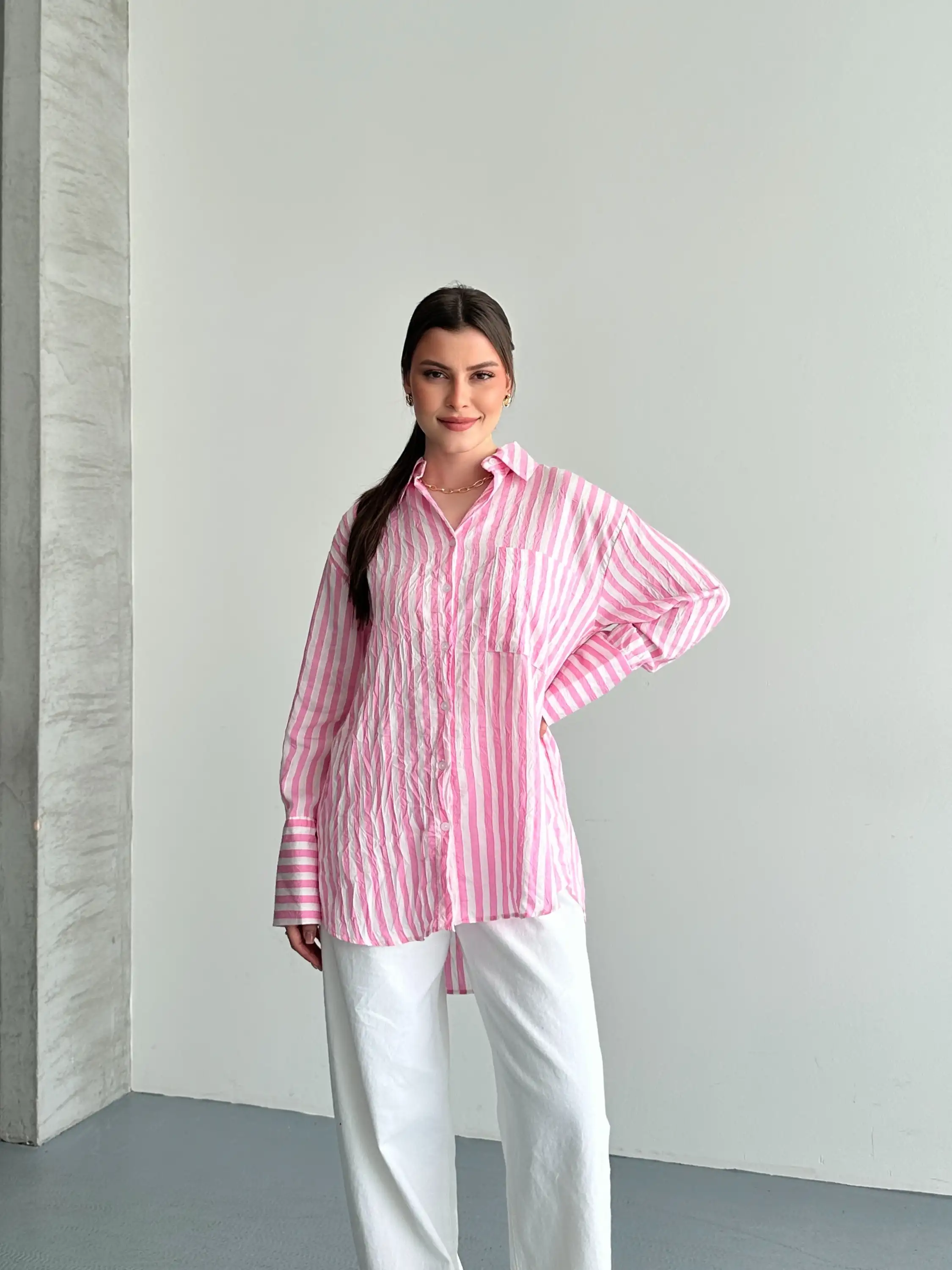 OVERSIZE ÇİZGİLİ CEPLİ GÖMLEK-PEMBE