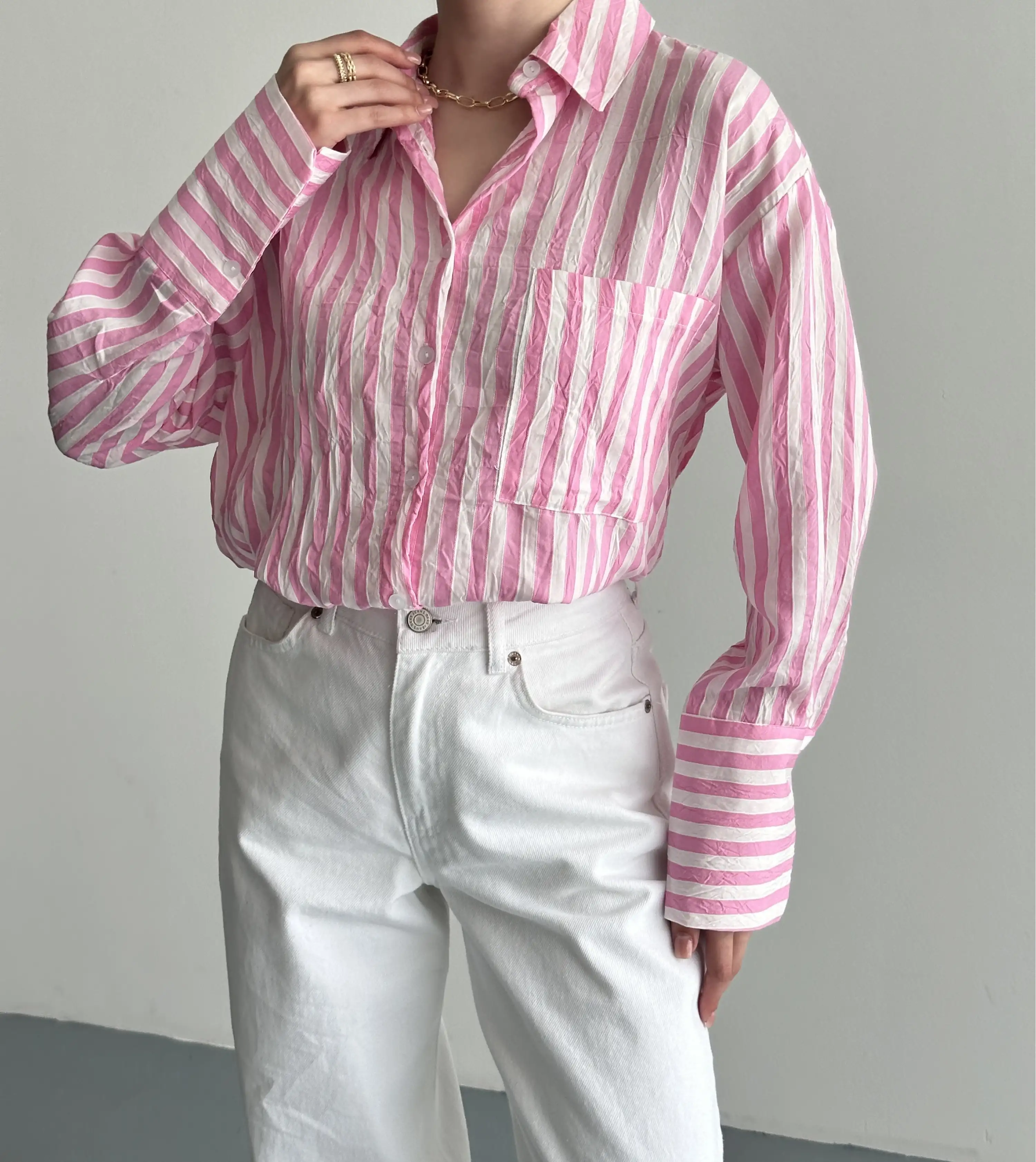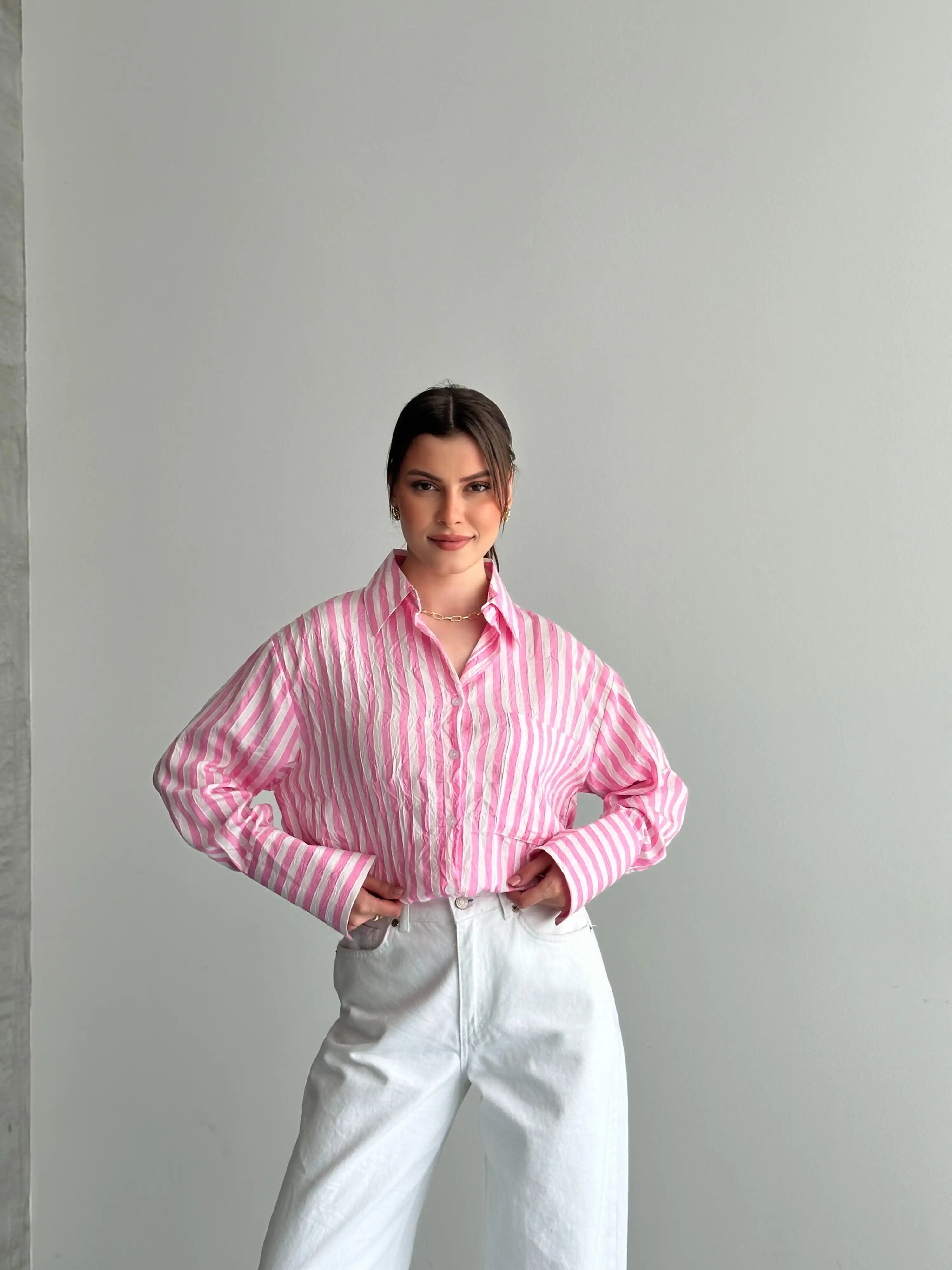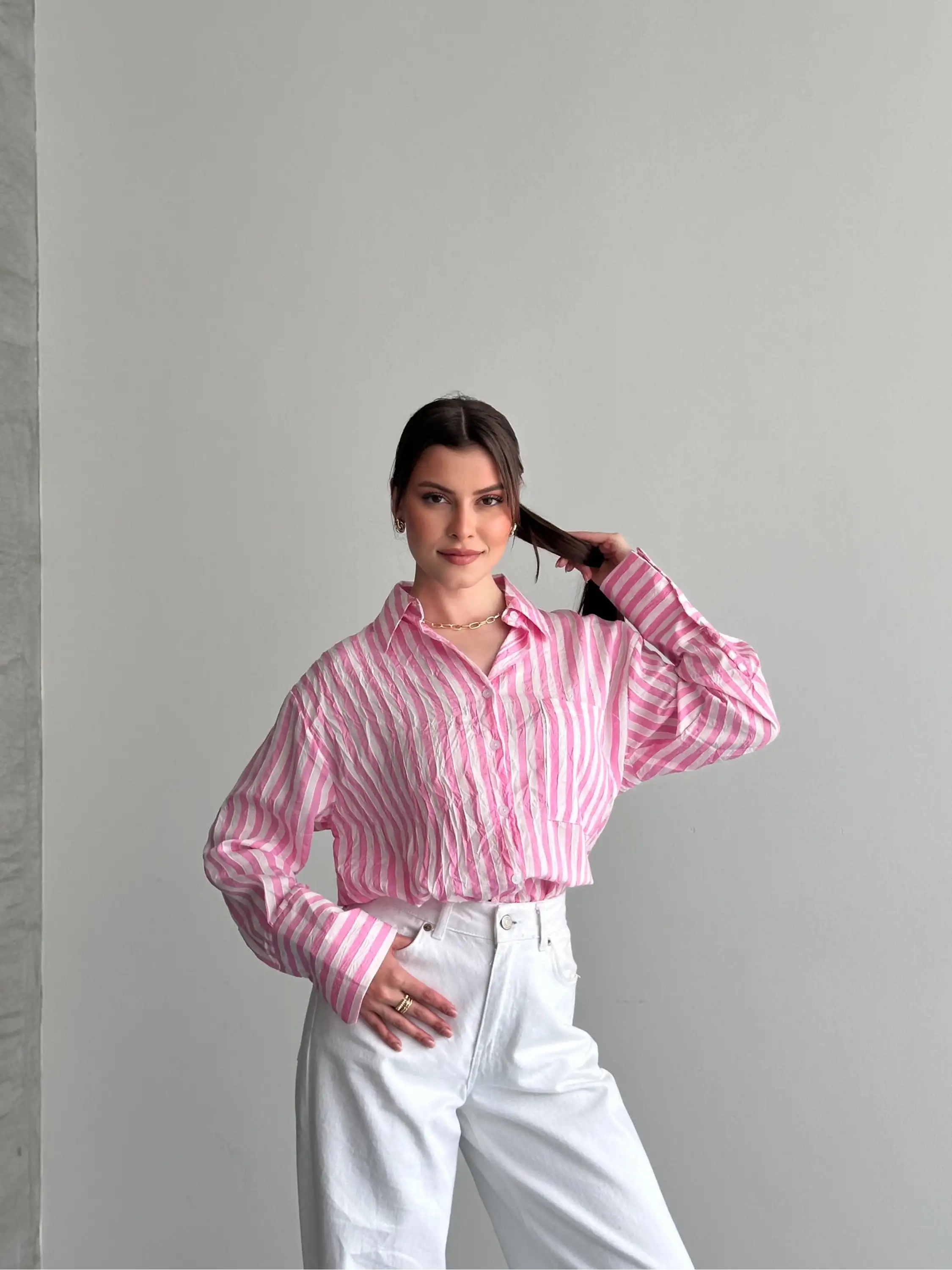 OVERSIZE ÇİZGİLİ CEPLİ GÖMLEK-PEMBE