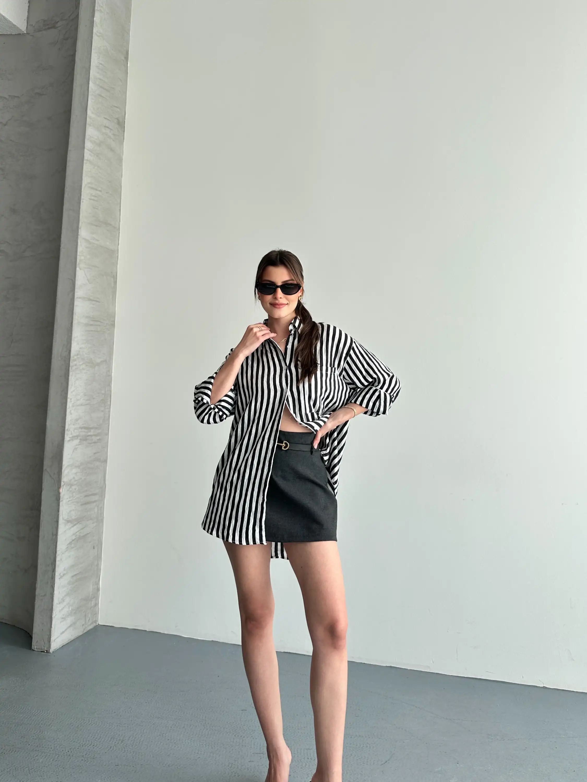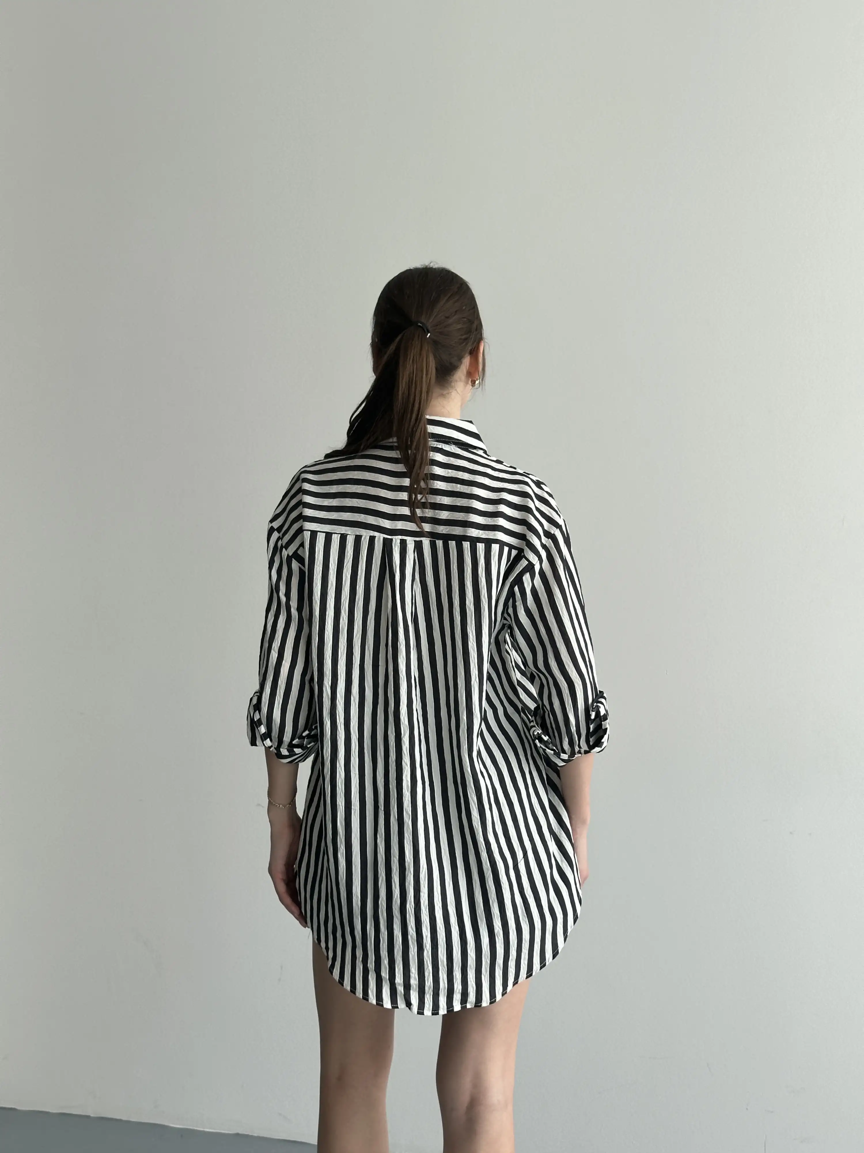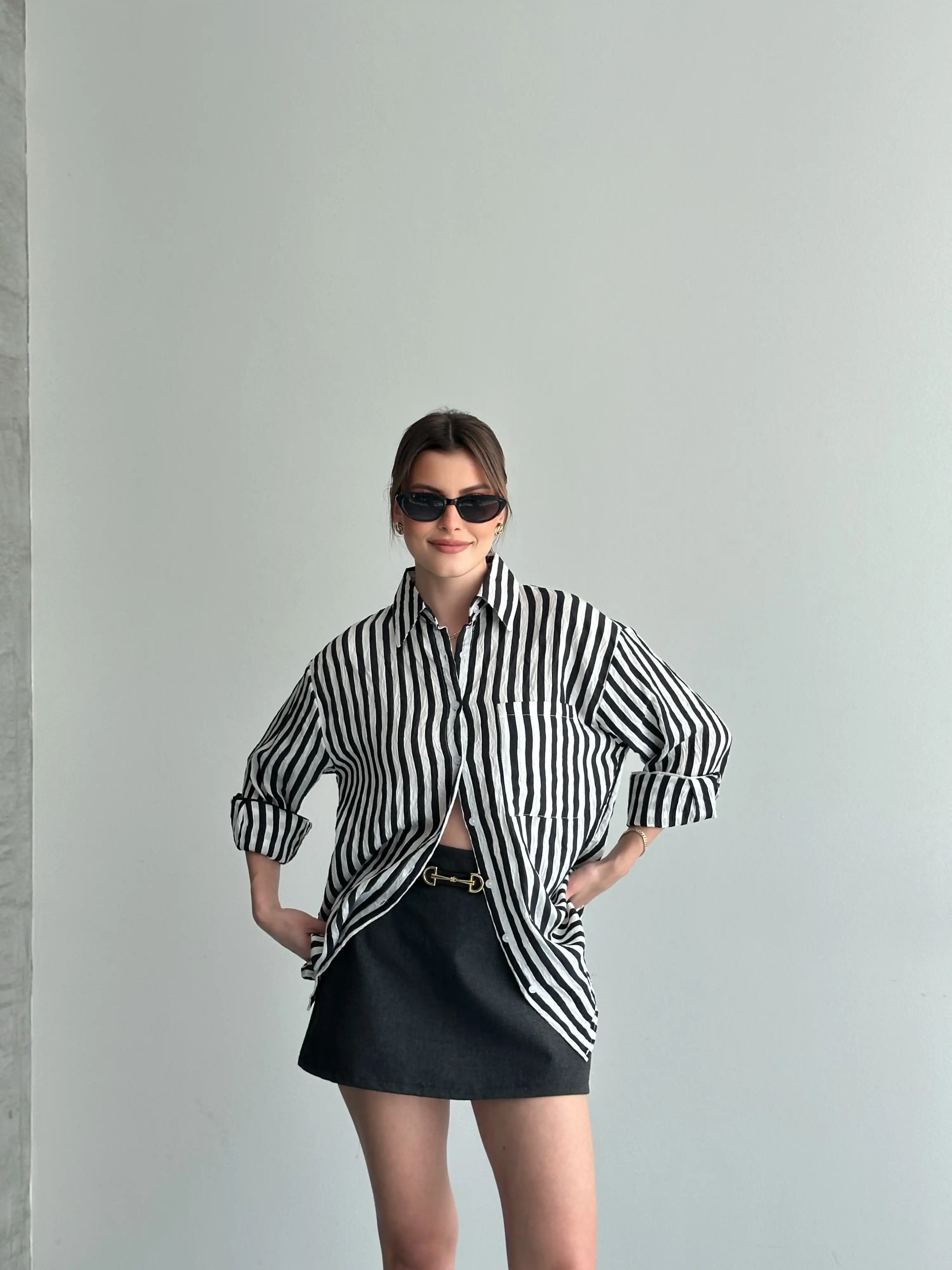 OVERSIZE ÇİZGİLİ CEPLİ GÖMLEK-SİYAH