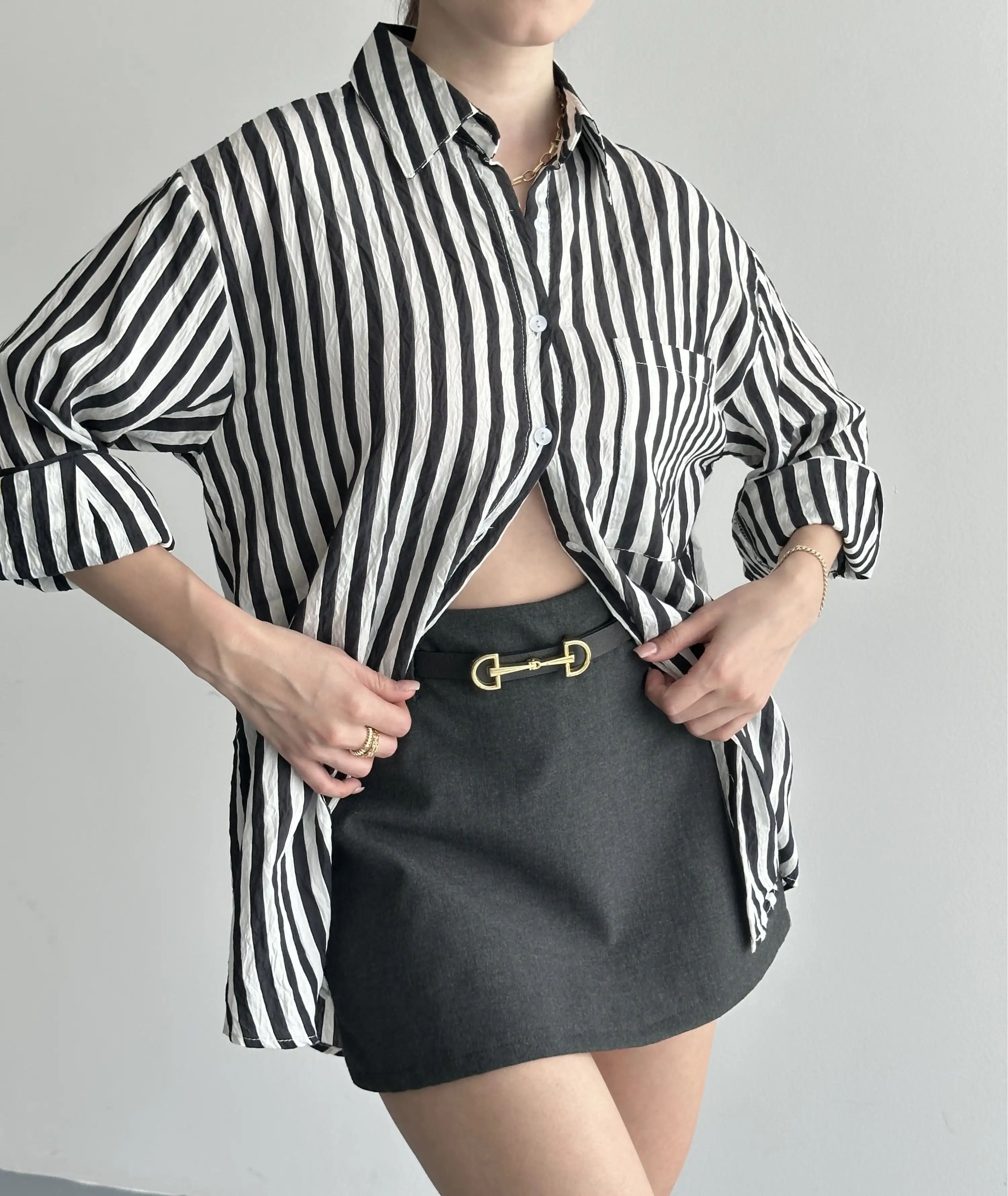 OVERSIZE ÇİZGİLİ KEMER DETAYLI GÖMLEK-KAHVE