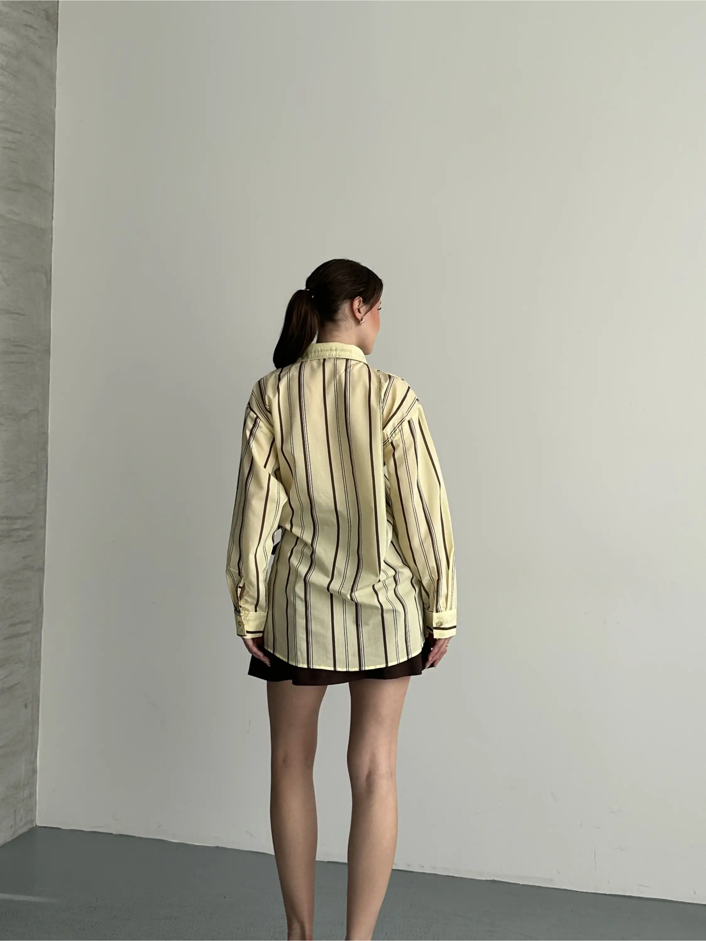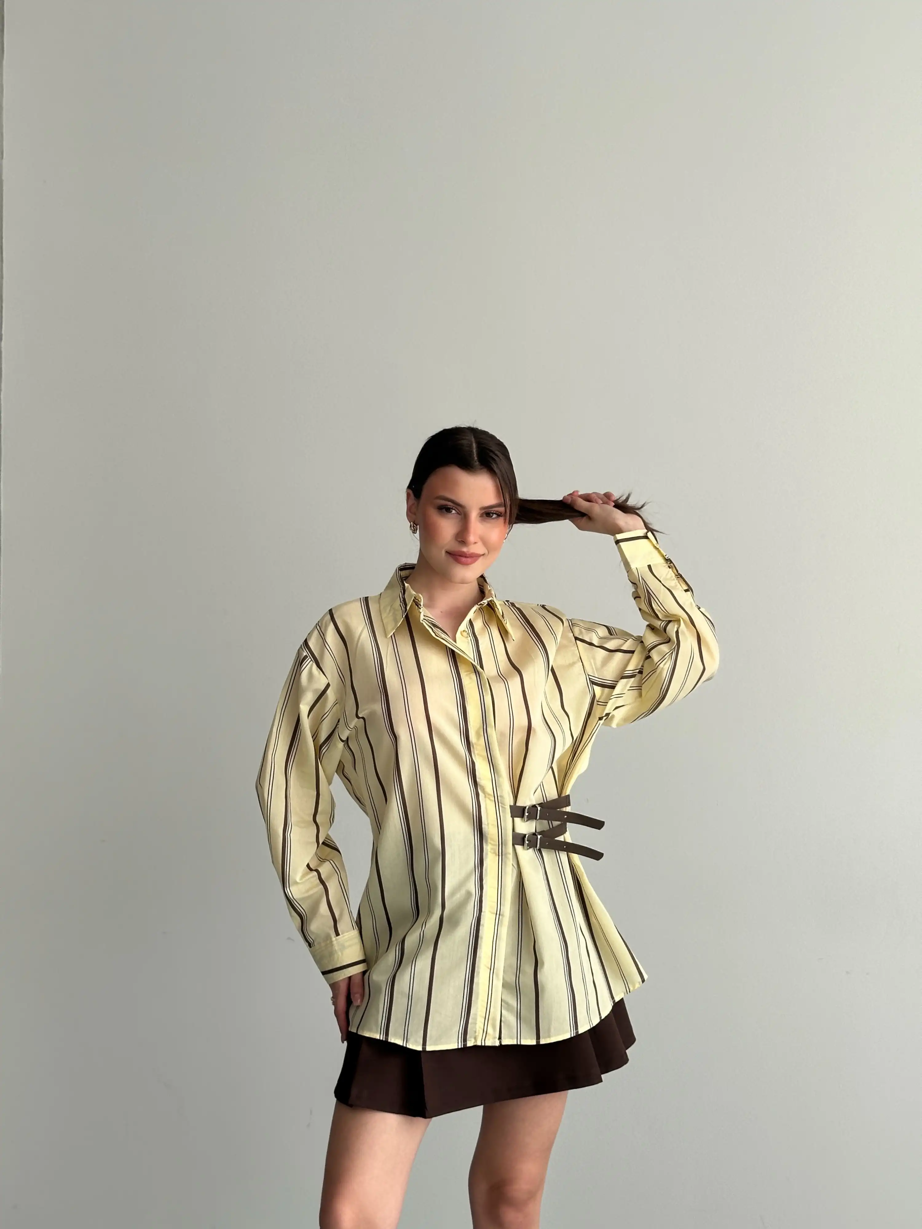 OVERSIZE ÇİZGİLİ KEMER DETAYLI GÖMLEK-SARI