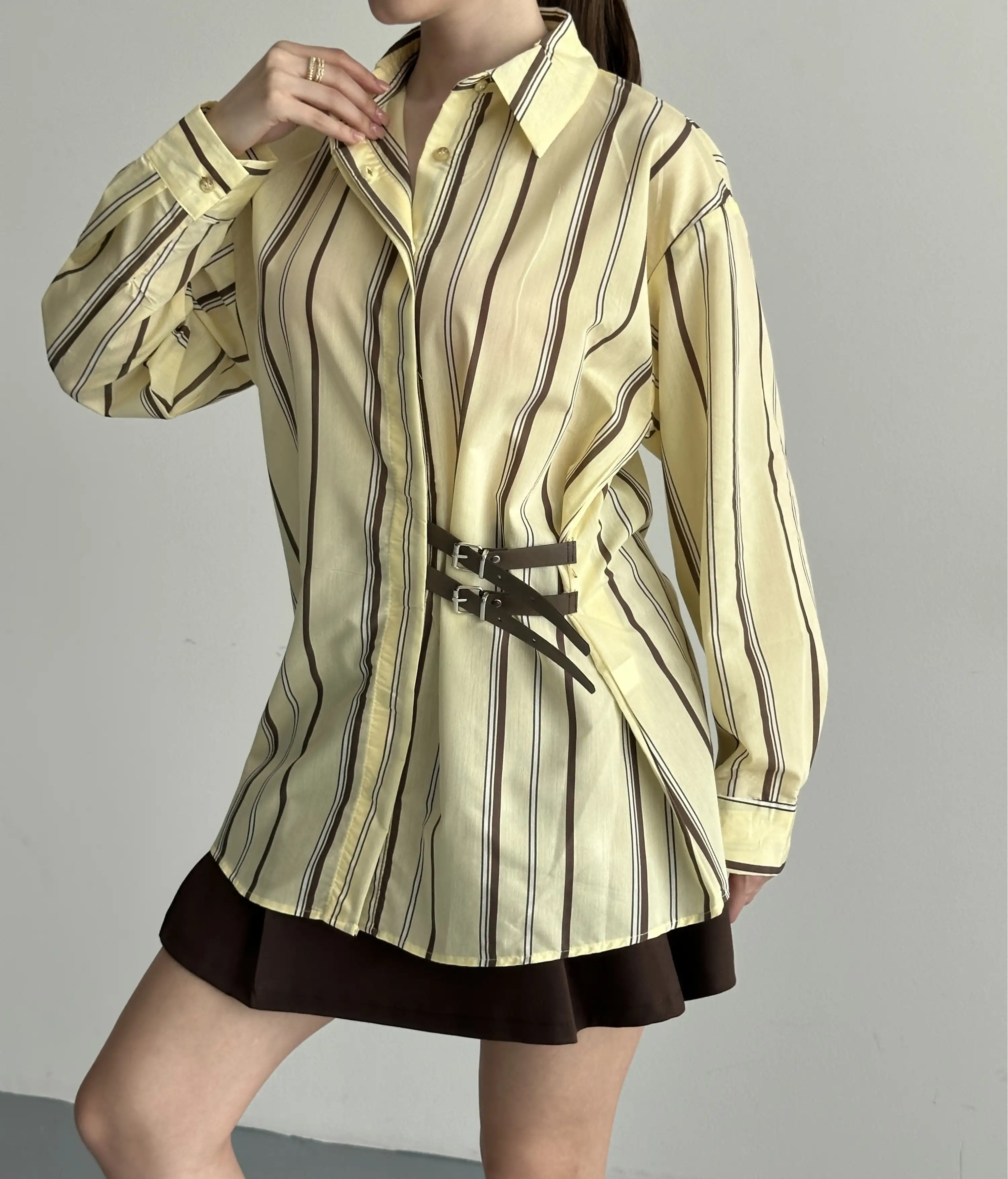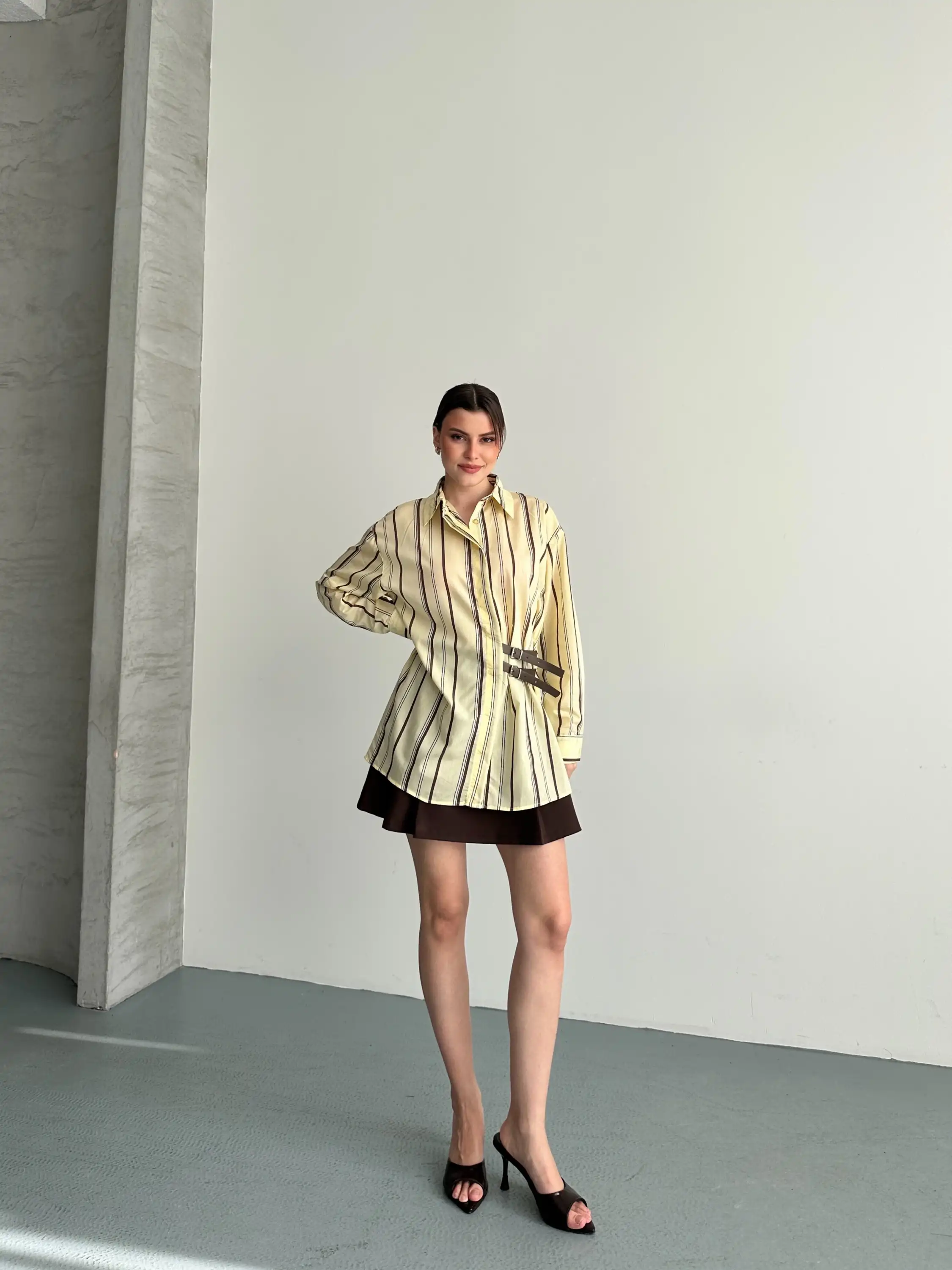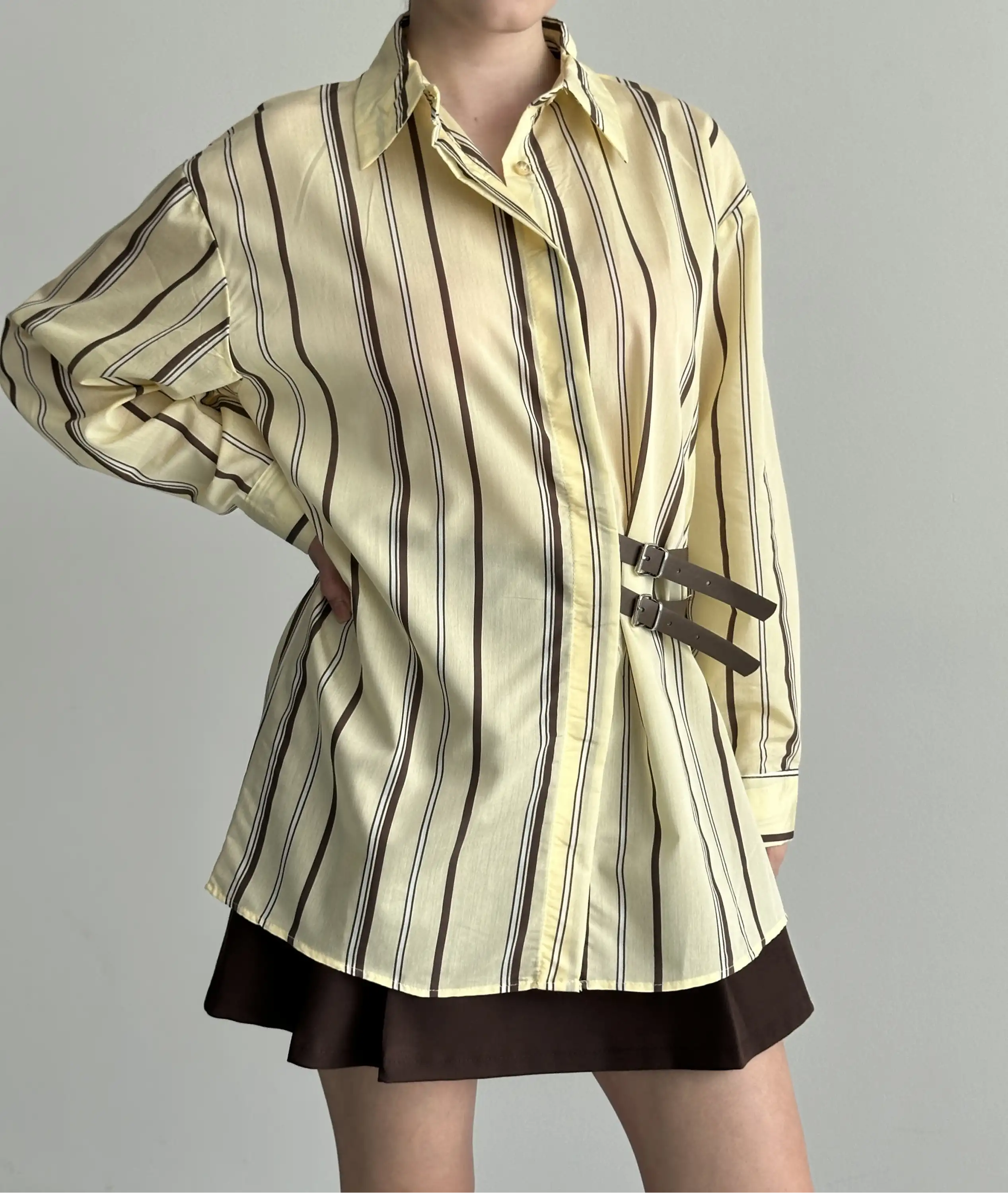 OVERSIZE ÇİZGİLİ KEMER DETAYLI GÖMLEK-KAHVE