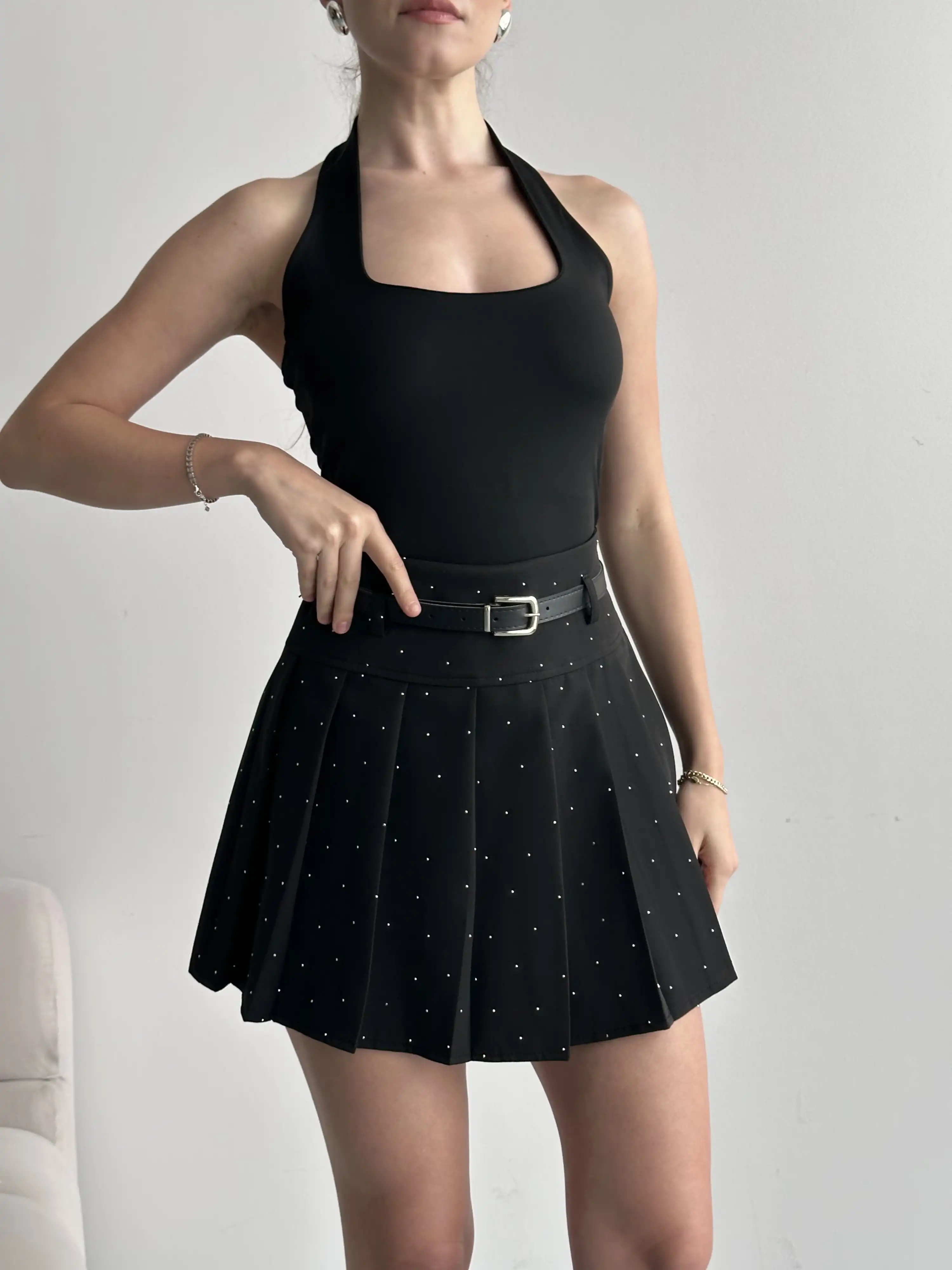 PİLİSELİ TAŞ BASKILI ŞORT ETEK-SİYAH